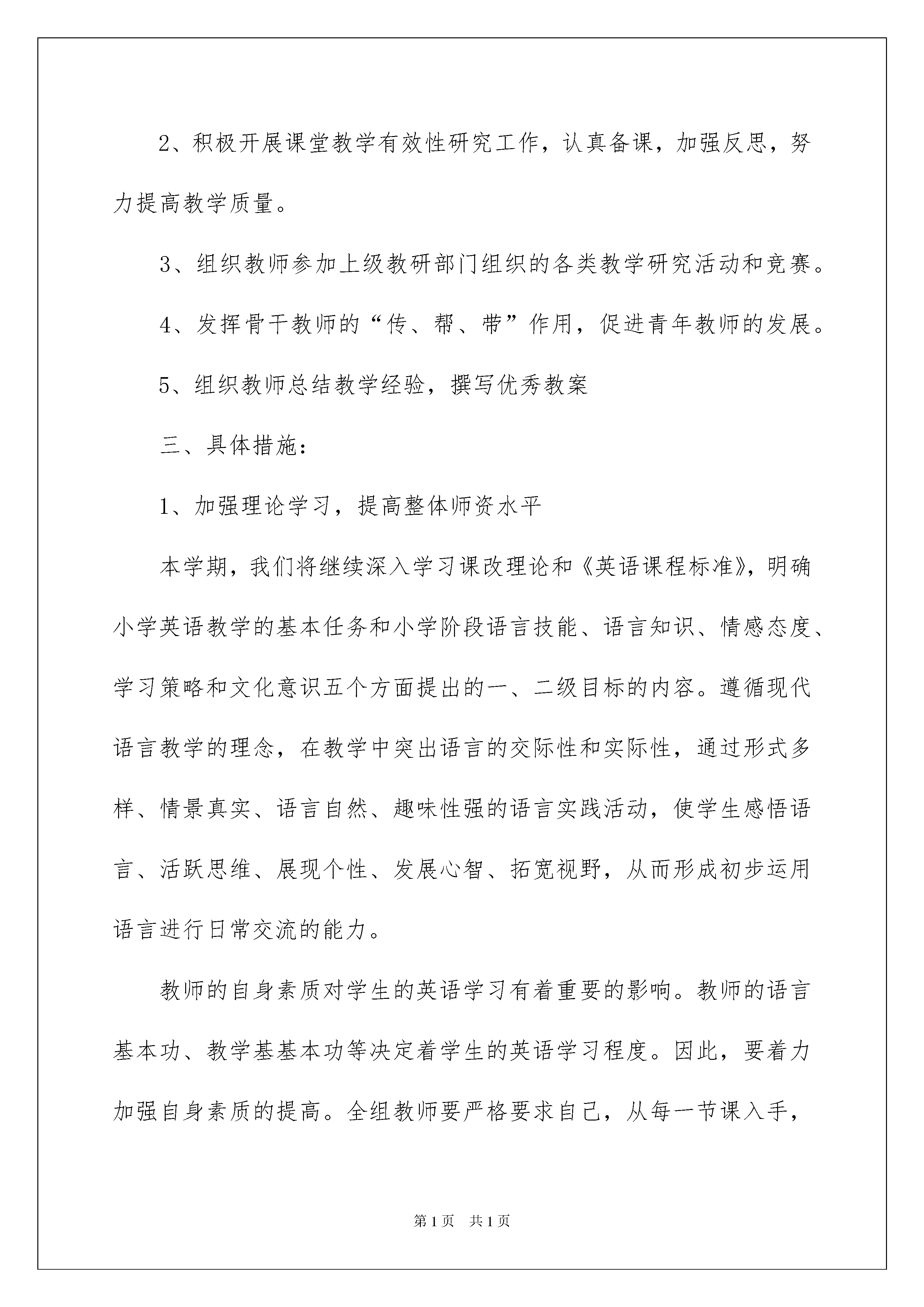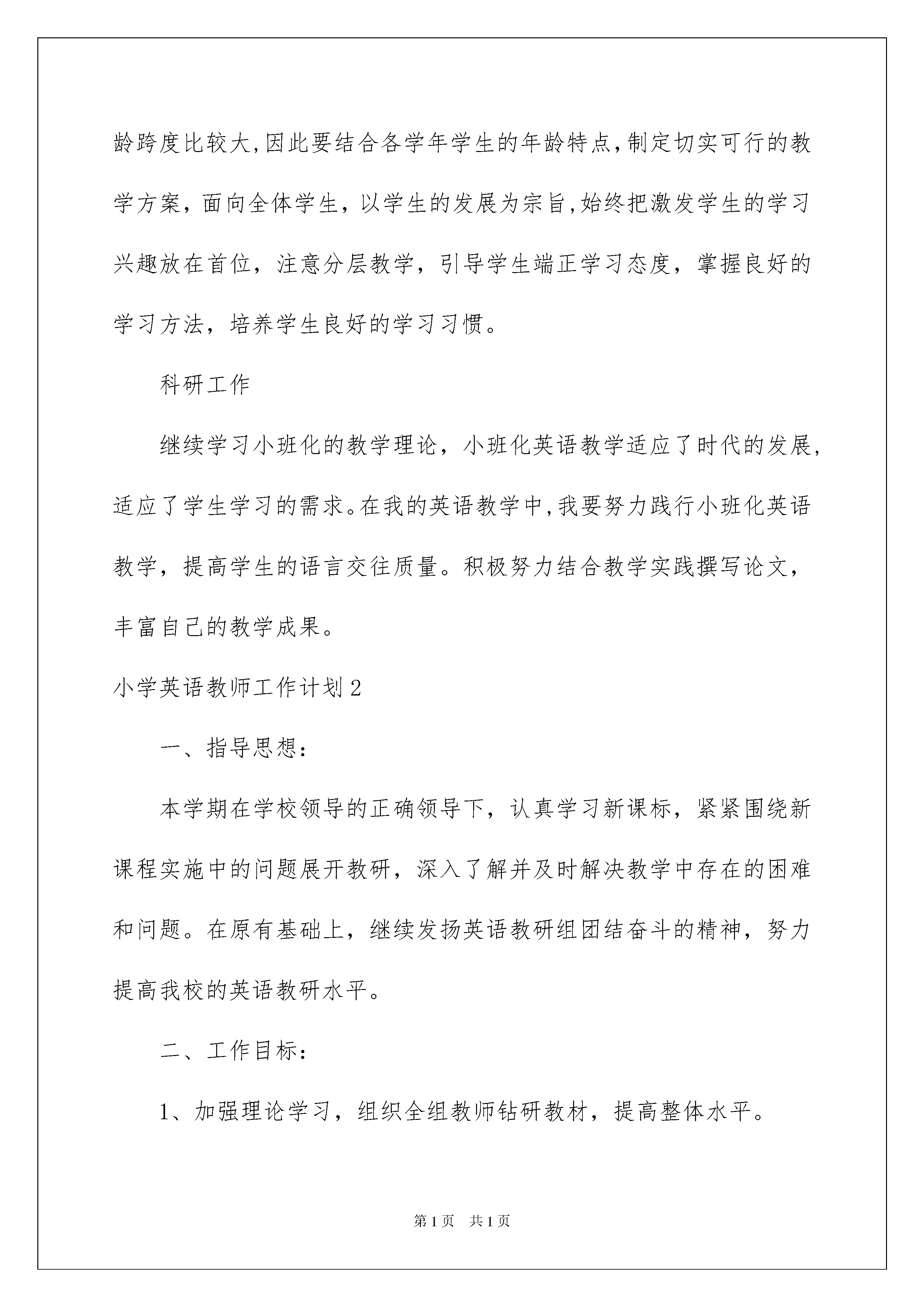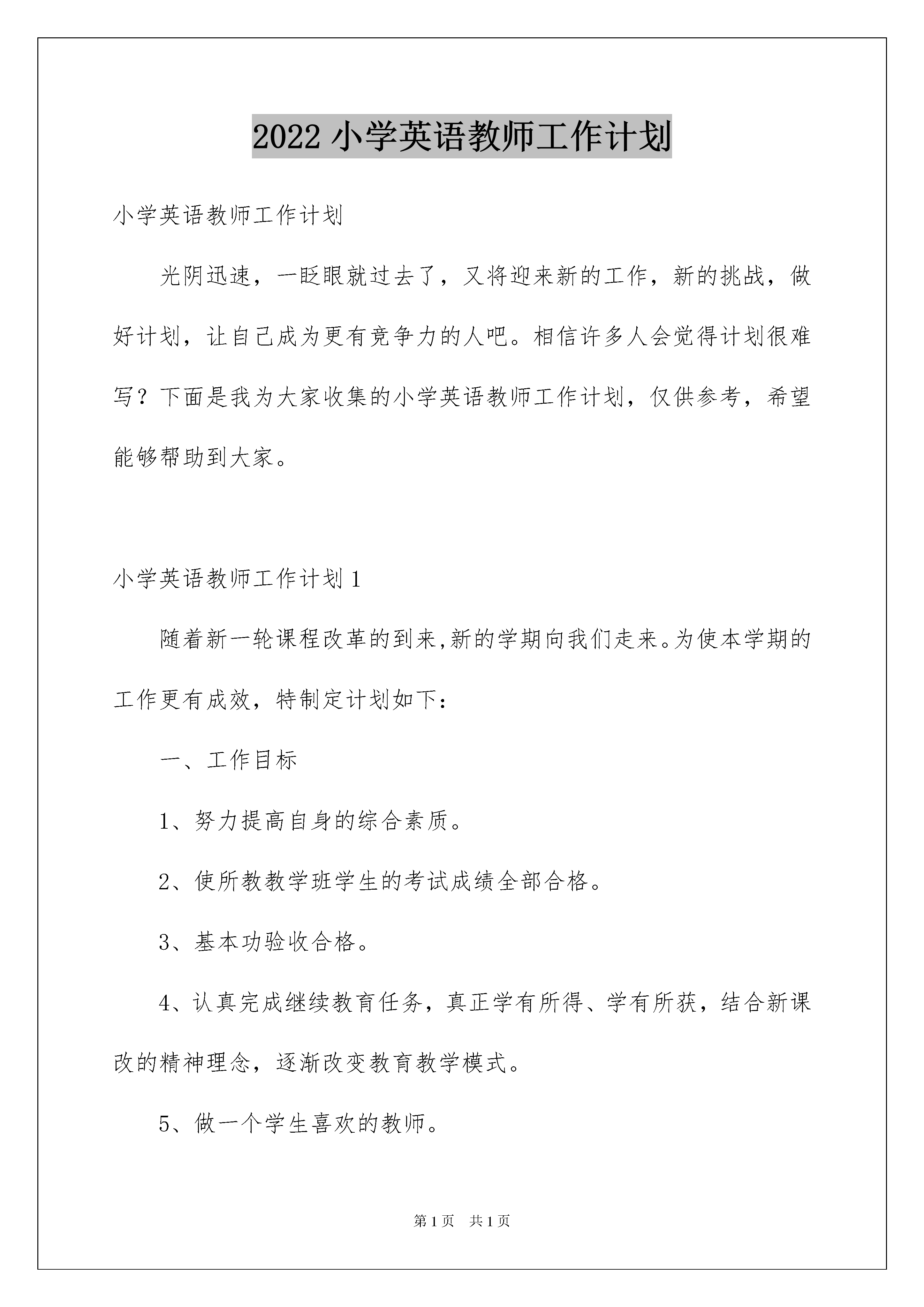2022小学英语教师工作计划小学英语教师工作计划光阴迅速,一眨眼就过去了,又将迎来新的工作,新的挑战,做好计划,让自己成为更有竞争力的人吧。相信许多人会觉得计划很难写?下面是我为大家收集的小学英语教师工作计划,仅供参考,希望能够帮助到大家。小学英语教师工作计划1随着新一轮课程改革的到来,新的学期向我们走来。为使本学期的工作更有成效,特制定计划如下:一、工作目标1、努力提高自身的综合素质。2、使所教教学班学生的考试成绩全部合格。3、基本功验收合格。4、认真完成继续教育任务,真正学有所得、学有所获,结合新课改的精神理念,逐渐改变教育教学模式。5、做一个学生喜欢的教师。二、具体措施1、利用业务学习等时机,深入学习《规范》,经常向师德先进的教师,对照先进个人找差距,从而不断提高自身的师德水平。2、处处严格要求自己,以身作则,为人师表,时时做学生的表率。3、课前认真钻研教材、学生,深刻领会教材内涵,准确把握教材的深浅度。4、在课堂教学中,大胆创新,努力创设宽松、民主和谐的气氛,充分发挥学生的主体作用,把课上40分钟还给学生。5、参加学习时认真记录,认真完成随感,案例等书面材料。6、改进教育教学方法,从心灵上与学生沟通,既做他们的良师、又做他们的益友。三、主要工作师德工作教师的师德修养是没有终点的,现代外语教师的职业发展也是没有终点的,良好的师德修养既是小学教师自身发展的需要,也是社会赋予的使命,我要把师德修养乃至职业发展看作是一辈子的事业,才能享受作为小学英语教师的自信和乐趣,拥有不间断的成就感,更重要的是教师将拥有更大的发展空间去提高生存的质量。德育工作在小学英语教材中,学生可以接触到本国和所学语言国家的文化、历史、地理、科技、政治、文化礼仪、习俗风貌。要学习包括表达思维活动(同意、帮助、邀请)、情感态度(喜欢、感激、同情、愿望)、道德态度(抱歉、宽恕、感谢、赞成、关心)、社会文化(介绍、问候、告别、就餐、看病、庆贺)等三十多个语言功能项目,内容丰富。我要整合这些语言材料,为课堂的德育实施提供丰富的素材。自培工作积极学习新课程的教学理念,重视校本研修的培训和研究,为自己的业务提高创造有利的条件。根据实际制定出具体的目标和主要措施。积极听课,从备课、上课、作业设计等方面进行改进,通过观摩课、外出学习培训等方式,使自己能在教学实践和课题研究中不断得到锻炼与提高。教学工作在本学期我担任一、二、四、五、六年级的英语教学。学生的年龄跨度比较大,因此要结合各学年学生的年龄特点,制定切实可行的教学方案,面向全体学生,以学生的发展为宗旨,始终把激发学生的学习兴趣放在首位,注意分层教学,引导学生端正学习态度,掌握良好的学习方法,培养学生良好的学习习惯。科研工作继续学习小班化的教学理论,小班化英语教学适应了时代的发展,适应了学生学习的需求。在我的英语教学中,我要努力践行小班化英语教学,提高学生的语言交往质量。积极努力结合教学实践撰写论文,丰富自己的教学成果。小学英语教师工作计划2一、指导思想:本学期在学校领导的正确领导下,认真学习新课标,紧紧围绕新课程实施中的问题展开教研,深入了解并及时解决教学中存在的困难和问题。在原有基础上,继续发扬英语教研组团结奋斗的精神,努力提高我校的英语教研水平。二、工作目标:1、加强理论学习,组织全组教师钻研教材,提高整体水平。2、积极开展课堂教学有效性研究工作,认真备课,加强反思,努力提高教学质量。3、组织教师参加上级教研部门组织的各类教学研究活动和竞赛。4、发挥骨干教师的“传、帮、带”作用,促进青年教师的发展。5、组织教师总结教学经验,撰写优秀教案三、具体措施:1、加强理论学习,提高整体师资水平本学期,我们将继续深入学习课改理论和《英语课程标准》,明确小学英语教学的基本任务和小学阶段语言技能、语言知识、情感态度、学习策略和文化意识五个方面提出的一、二级目标的内容。遵循现代语言教学的理念,在教学中突出语言的交际性和实际性,通过形式多样、情景真实、语言自然、趣味性强的语言实践活动,使学生感悟语言、活跃思维、展现个性、发展心智、拓宽视野,从而形成初步运用语言进行日常交流的能力。教师的自身素质对学生的英语学习有着重要的影响。教师的语言基本功、教学基基本功等决定着学生的英语学习程度。因此,要着力加强自身素质的提高。全组教师要严格要求自己,从每一节课入手,多学习,多思考,多切磋,保持源头的清流活水,为学生的学习打下坚实的基础。2、开展课堂教学有效性研究,提高教学质量认真学习教材内容,提高备课质量。认真钻研教材,分析教材,明确教学目标,了解教学内容。考虑学生的实际水平和理解能力,从