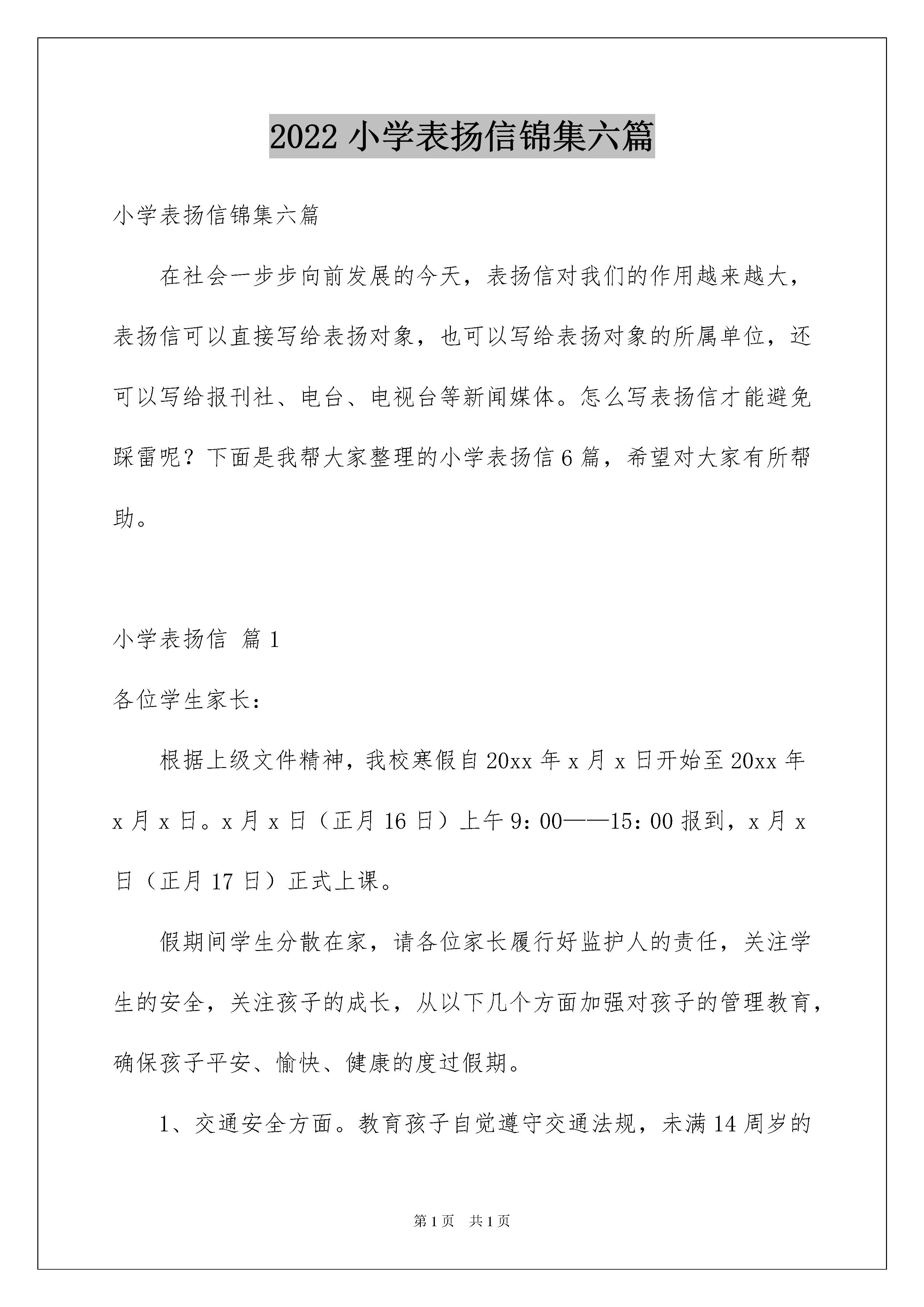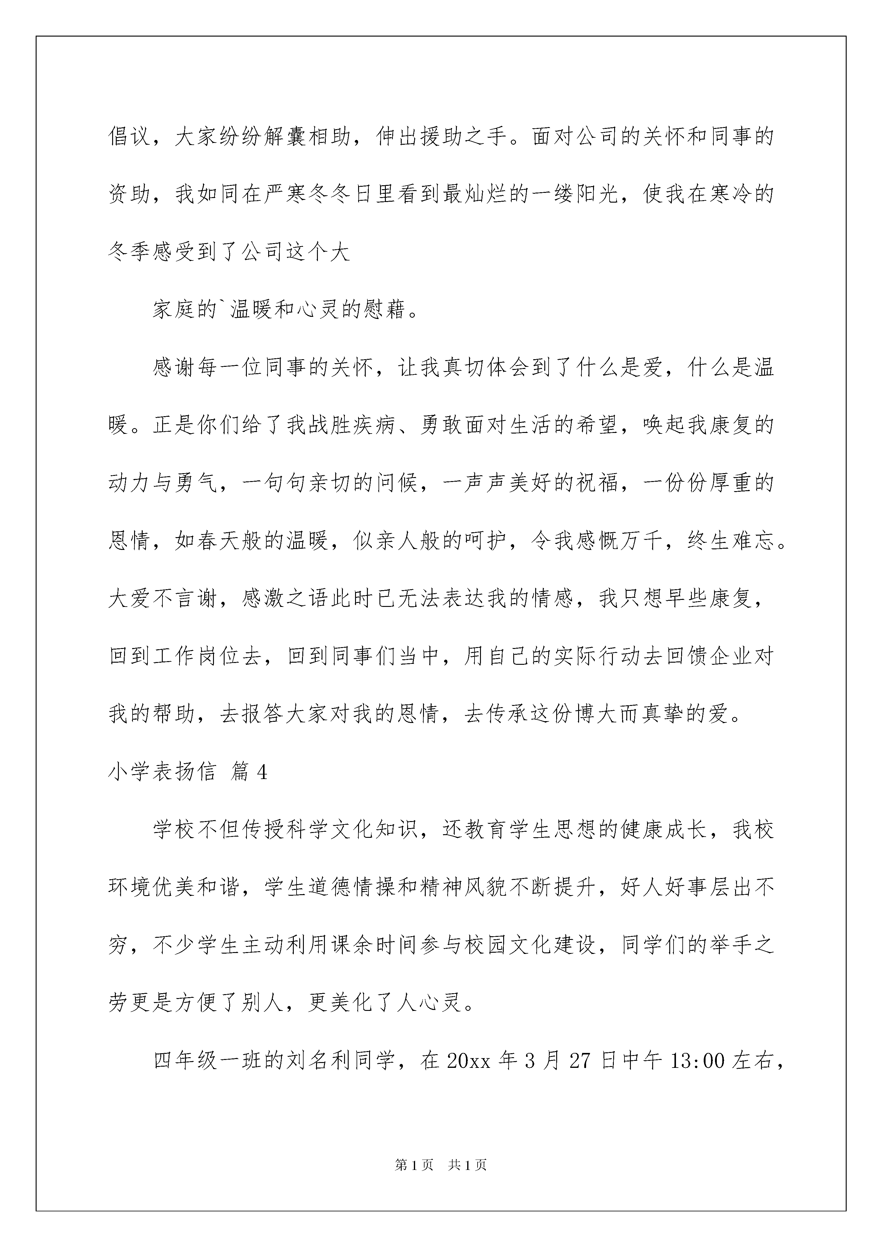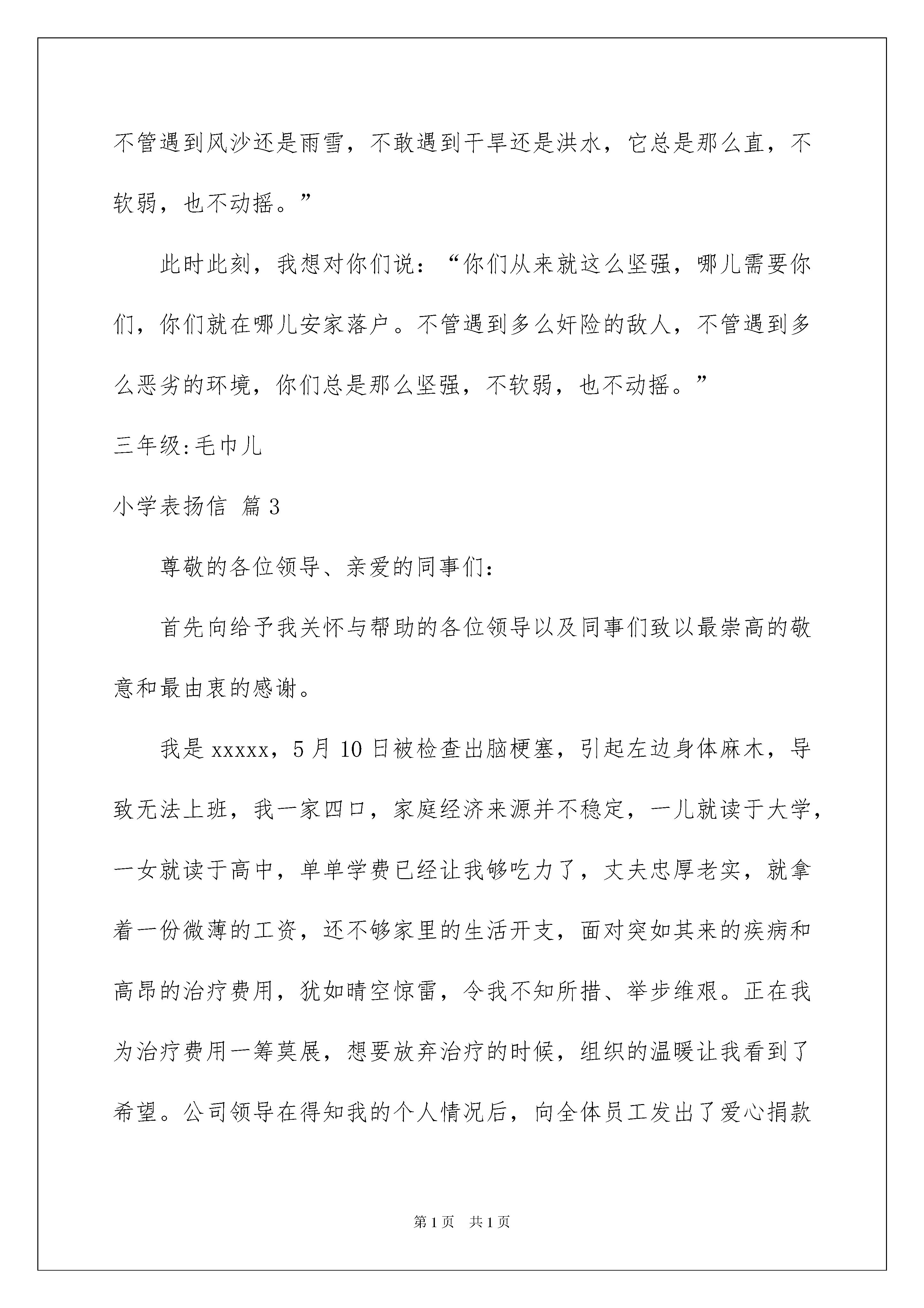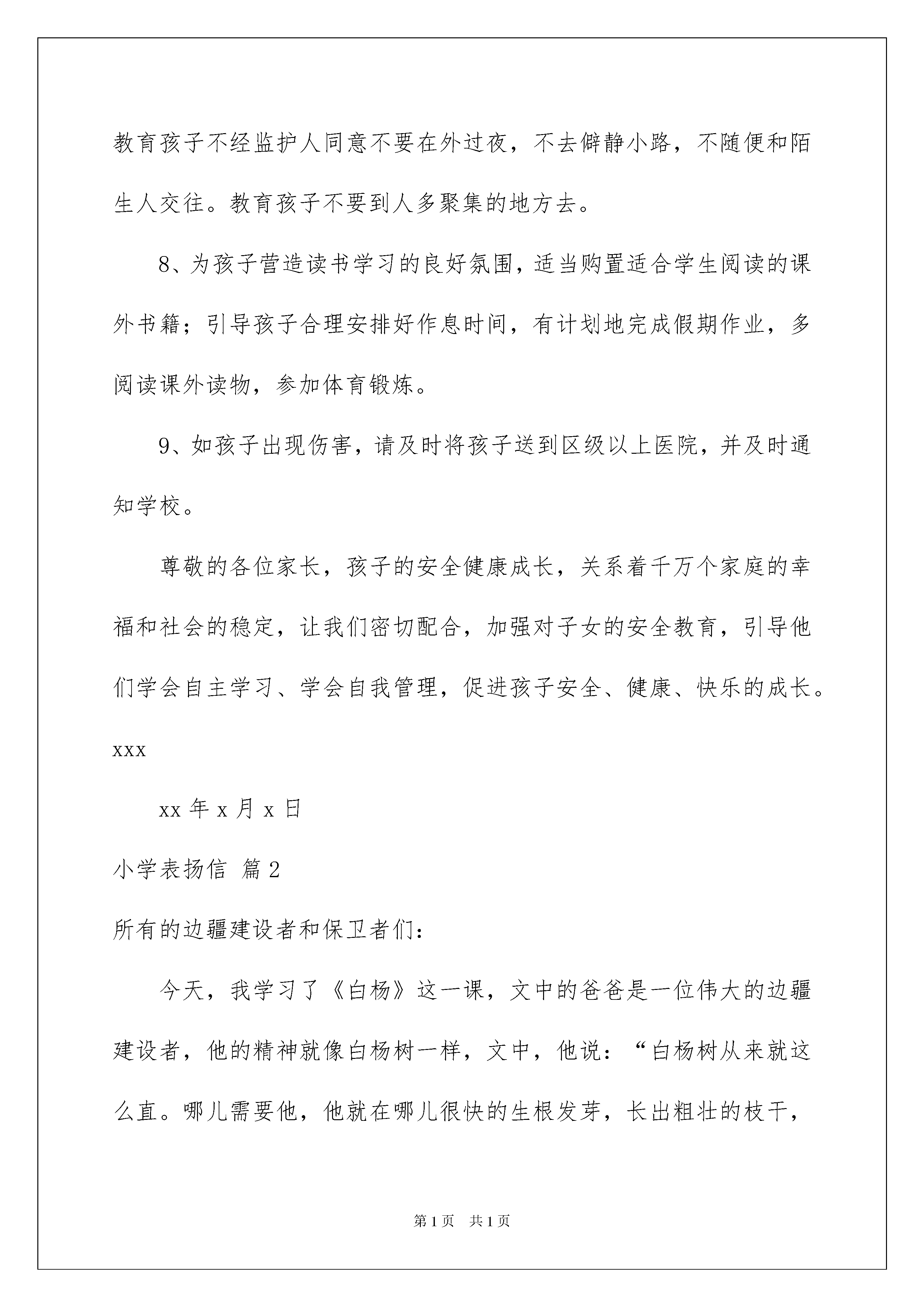 2022小学表扬信锦集六篇小学表扬信锦集六篇在社会一步步向前发展的今天,表扬信对我们的作用越来越大,表扬信可以直接写给表扬对象,也可以写给表扬对象的所属单位,还可以写给报刊社、电台、电视台等新闻媒体。怎么写表扬信才能避免踩雷呢?下面是我帮大家整理的小学表扬信6篇,希望对大家有所帮助。小学表扬信篇1各位学生家长:根据上级文件精神,我校寒假自20xx年x月x日开始至20xx年x月x日。x月x日(正月16日)上午9:00——15:00报到,x月x日(正月17日)正式上课。假期间学生分散在家,请各位家长履行好监护人的责任,关注学生的安全,关注孩子的成长,从以下几个方面加强对孩子的管理教育,确保孩子平安、愉快、健康的度过假期。1、交通安全方面。教育孩子自觉遵守交通法规,未满14周岁的孩子不要骑自行车上路;在公路上靠右行走,不乱穿马路;不在公路上打闹玩耍做游戏,有车来要及早避让;不搭乘超载车辆,不搭乘农用车、三轮车等非载客车辆,不搭乘无牌无证的摩托车。2、建议您的孩子在放假期间减少不必要的聚会、旅游;注意个人卫生习惯,勤洗手,保持室内良好的通风。如果孩子出现发烧等类似感冒的症状,要立刻送孩子到医院就医。3、饮食方面的安全。家长要教育子女不购买无安全保证的食品;不吃变质的饭菜,不吃不干净的水果;少吃生冷食品,不喝生水;不吃野果,严防食物中毒。4、要教育监管孩子不私自或擅自结伴到灞河等有水域的地方进行玩耍,防止溺水事故发生。春节期间教育孩子不要燃放鞭炮确保安全。5、教会孩子正确使用电器、煤气等设施,安全使用、规范操作,做好防火灾、防触电、防煤气中毒的教育。6、教育孩子安全上网、文明上网,坚决不进营业性网吧、游戏厅、舞厅等场所,不看不健康的书籍、杂志等。7、教育孩子学习自救自护的常识,牢记并学会使用110、119、120等求助电话。重视提高孩子防拐骗、防绑架、防敲诈、防盗窃的意识,教育孩子不经监护人同意不要在外过夜,不去僻静小路,不随便和陌生人交往。教育孩子不要到人多聚集的地方去。8、为孩子营造读书学习的良好氛围,适当购置适合学生阅读的课外书籍;引导孩子合理安排好作息时间,有计划地完成假期作业,多阅读课外读物,参加体育锻炼。9、如孩子出现伤害,请及时将孩子送到区级以上医院,并及时通知学校。尊敬的各位家长,孩子的安全健康成长,关系着千万个家庭的幸福和社会的稳定,让我们密切配合,加强对子女的安全教育,引导他们学会自主学习、学会自我管理,促进孩子安全、健康、快乐的成长。xxxxx年x月x日小学表扬信篇2所有的边疆建设者和保卫者们:今天,我学习了《白杨》这一课,文中的爸爸是一位伟大的边疆建设者,他的精神就像白杨树一样,文中,他说:“白杨树从来就这么直。哪儿需要他,他就在哪儿很快的生根发芽,长出粗壮的枝干,不管遇到风沙还是雨雪,不敢遇到干旱还是洪水,它总是那么直,不软弱,也不动摇。”此时此刻,我想对你们说:“你们从来就这么坚强,哪儿需要你们,你们就在哪儿安家落户。不管遇到多么奸险的敌人,不管遇到多么恶劣的环境,你们总是那么坚强,不软弱,也不动摇。”三年级:毛巾儿小学表扬信篇3尊敬的各位领导、亲爱的同事们:首先向给予我关怀与帮助的各位领导以及同事们致以最崇高的敬意和最由衷的感谢。我是xxxxx,5月10日被检查出脑梗塞,引起左边身体麻木,导致无法上班,我一家四口,家庭经济来源并不稳定,一儿就读于大学,一女就读于高中,单单学费已经让我够吃力了,丈夫忠厚老实,就拿着一份微薄的工资,还不够家里的生活开支,面对突如其来的疾病和高昂的治疗费用,犹如晴空惊雷,令我不知所措、举步维艰。正在我为治疗费用一筹莫展,想要放弃治疗的时候,组织的温暖让我看到了希望。公司领导在得知我的个人情况后,向全体员工发出了爱心捐款倡议,大家纷纷解囊相助,伸出援助之手。面对公司的关怀和同事的资助,我如同在严寒冬冬日里看到最灿烂的一缕阳光,使我在寒冷的冬季感受到了公司这个大家庭的`温暖和心灵的慰藉。感谢每一位同事的关怀,让我真切体会到了什么是爱,什么是温暖。正是你们给了我战胜疾病、勇敢面对生活的希望,唤起我康复的动力与勇气,一句句亲切的问候,一声声美好的祝福,一份份厚重的恩情,如春天般的温暖,似亲人般的呵护,令我感慨万千,终生难忘。大爱不言谢,感激之语此时已无法表达我的情感,我只想早些康复,回到工作岗位去,回到同事们当中,用自己的实际行动去回馈企业对我的帮助,去报答大家对我的恩情,去传承这份博大而真挚的爱。小学表扬信篇4学校不但传授科学文化知识,还教育学生思想的健康成长,我校环境优美和谐,学生道德情操和精神风貌不断提升,好人好事层出不穷,不