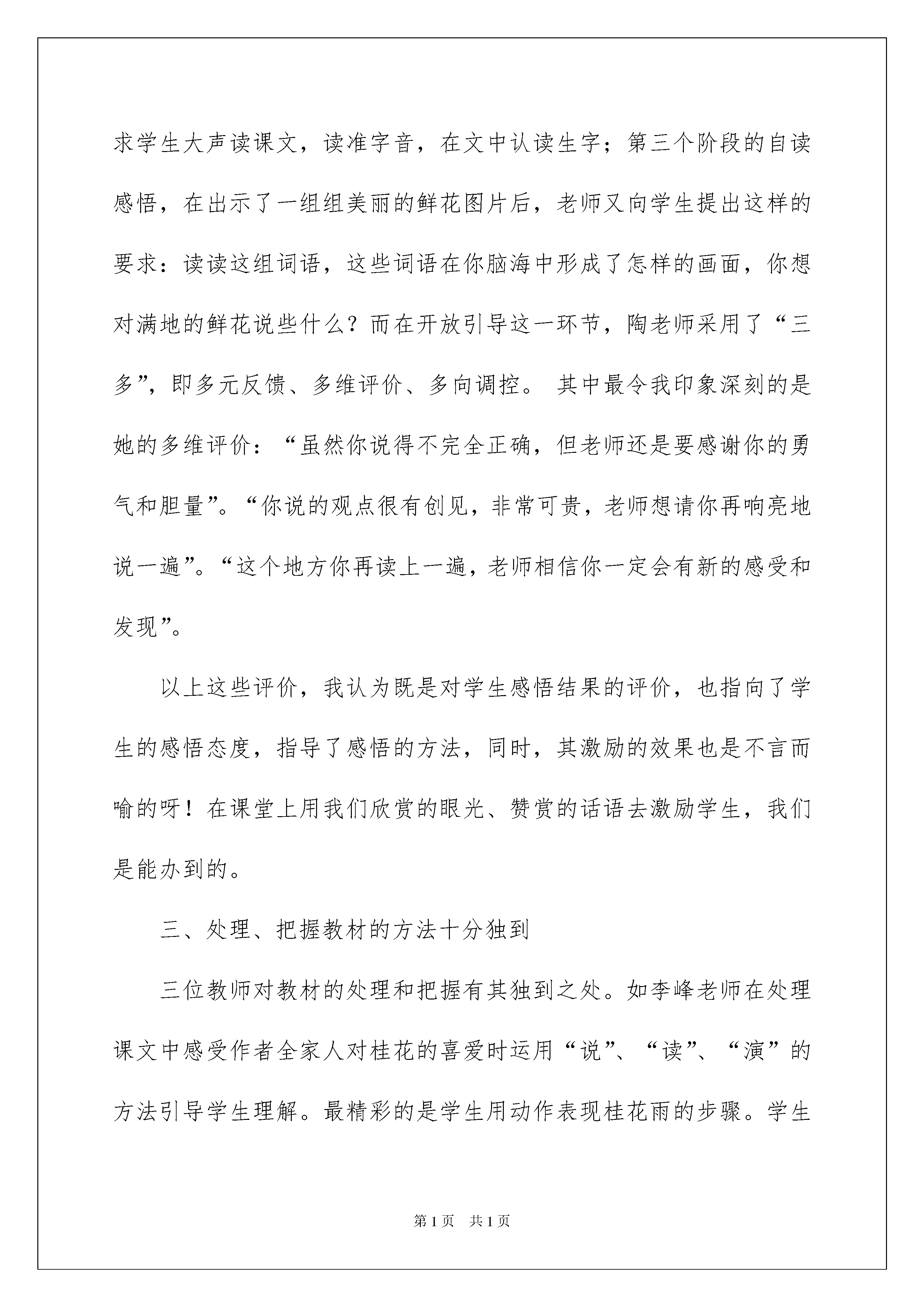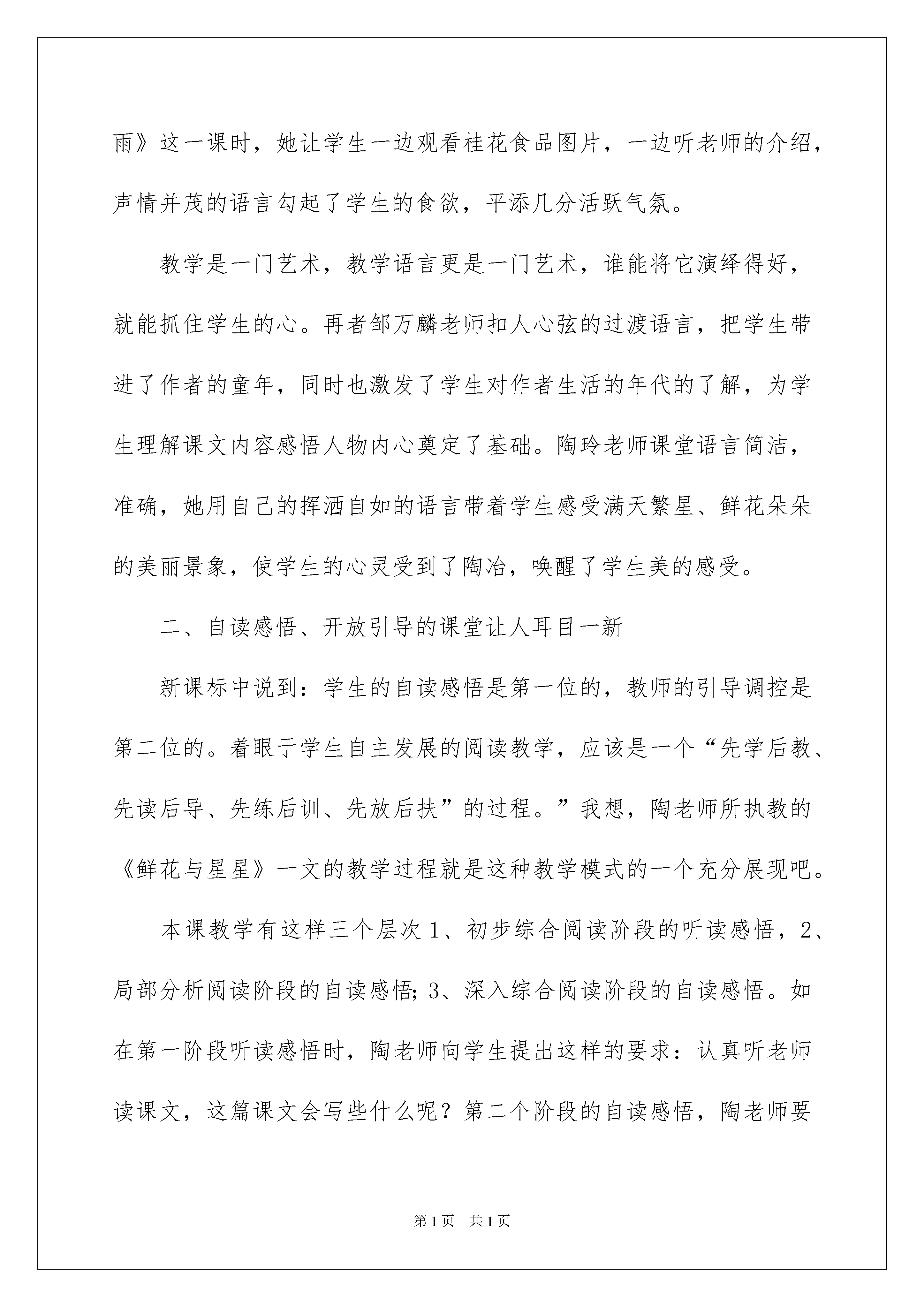 2022小学语文优质课听课的心得体会小学语文优质课听课的心得体会有了一些收获以后,通常就可以写一篇心得体会将其记下来,这样能够培养人思考的习惯。那么心得体会怎么写才能感染读者呢?下面是我帮大家整理的小学语文优质课听课的心得体会,仅供参考,大家一起来看看吧。小学语文优质课听课的心得体会1近期,我参加“区优质课”小学语文教学赛课观摩活动,聆听了邹万麟老师、李峰老师和陶玲老师的课,收获良多。之前,曾在骨干班学习时了解到,关注课堂教学的有效性是今年教研重点,邹万粼老师、李峰老师和陶玲老师上的三堂课,以自己精心设计和课堂智慧,保证了教学的有效性,给我留下了深刻的印象。下面就谈谈我个人的一些心得体会吧。一、教师语言具有艺术的魅力当我听着这两位教师的课时,我想教师的语言竟有如此之魅力,它能引出狭小的课堂,深入人的心灵深处……李峰老师在教学《桂花雨》这一课时,她让学生一边观看桂花食品图片,一边听老师的介绍,声情并茂的语言勾起了学生的食欲,平添几分活跃气氛。教学是一门艺术,教学语言更是一门艺术,谁能将它演绎得好,就能抓住学生的心。再者邹万麟老师扣人心弦的过渡语言,把学生带进了作者的童年,同时也激发了学生对作者生活的年代的了解,为学生理解课文内容感悟人物内心奠定了基础。陶玲老师课堂语言简洁,准确,她用自己的挥洒自如的语言带着学生感受满天繁星、鲜花朵朵的美丽景象,使学生的心灵受到了陶冶,唤醒了学生美的感受。二、自读感悟、开放引导的课堂让人耳目一新新课标中说到:学生的自读感悟是第一位的,教师的引导调控是第二位的。着眼于学生自主发展的阅读教学,应该是一个“先学后教、先读后导、先练后训、先放后扶”的过程。”我想,陶老师所执教的《鲜花与星星》一文的教学过程就是这种教学模式的一个充分展现吧。本课教学有这样三个层次1、初步综合阅读阶段的听读感悟,2、局部分析阅读阶段的自读感悟;3、深入综合阅读阶段的自读感悟。如在第一阶段听读感悟时,陶老师向学生提出这样的要求:认真听老师读课文,这篇课文会写些什么呢?第二个阶段的自读感悟,陶老师要求学生大声读课文,读准字音,在文中认读生字;第三个阶段的自读感悟,在出示了一组组美丽的鲜花图片后,老师又向学生提出这样的要求:读读这组词语,这些词语在你脑海中形成了怎样的画面,你想对满地的鲜花说些什么?而在开放引导这一环节,陶老师采用了“三多”,即多元反馈、多维评价、多向调控。其中最令我印象深刻的是她的多维评价:“虽然你说得不完全正确,但老师还是要感谢你的勇气和胆量”。“你说的观点很有创见,非常可贵,老师想请你再响亮地说一遍”。“这个地方你再读上一遍,老师相信你一定会有新的感受和发现”。以上这些评价,我认为既是对学生感悟结果的评价,也指向了学生的感悟态度,指导了感悟的方法,同时,其激励的效果也是不言而喻的呀!在课堂上用我们欣赏的眼光、赞赏的话语去激励学生,我们是能办到的。三、处理、把握教材的方法十分独到三位教师对教材的处理和把握有其独到之处。如李峰老师在处理课文中感受作者全家人对桂花的喜爱时运用“说”、“读”、“演”的方法引导学生理解。最精彩的是学生用动作表现桂花雨的步骤。学生在音乐背景下边有感情的朗读,边做出身临桂花树下,感受桂花雨落下的动作,此时的学生仿佛就是童年的作者,享受桂花雨带来的快乐。邹老师则找准了切入点,引导学生展开讨论:“在孩子们的眼中这是一位怎样的老师?”从而给了学生个性化阅读的极大空间,学生的讨论有理有据、精彩纷呈;在辩论的过程中,学生对“笑面人生”感受得很深?我想通过本课学习,这位身体残缺但性格完美的老师一定在学生心中留下深深印记。一句教育名言说得好:“什么是教育,那就是学生把在学校所学的东西都忘记以后剩下的东西。”我想,我们每一位教师在上完一堂课后,该问问自己:当学生把这堂课所学的知识点忘记以后,还剩下些什么?十年,几十年以后,当学生把所学的知识全忘掉以后,我们给他们留下些什么?我们的教育,能否给孩子们留下正确的思维方式,留下解决问题的能力,留下他们真正需要的种种?我想这些也就是我们追求的“高效”吧!一日听课所得又岂止以上几点,但我想,光是这几点,是我要用很多的时间才能深刻领悟的。府西街小学杨莉20xx-3-16小学语文优质课听课的心得体会2近期,我参加了小学语文优质课的活动,收获很多。置身于教学中,看到各位气定神闲,信手拈来,不时激起一个个教学的浪花,他们或浅唱低呤,或手舞足蹈,或激昂文字,不仅令陶醉、痴迷,更让我连声赞叹,这样的功底岂是一日可为?。赞叹之余,更多是深深的沉思,为什么会有如此的魅力?为什么在课堂上学生乐此不疲?从中我更深刻地体会到了学习的重