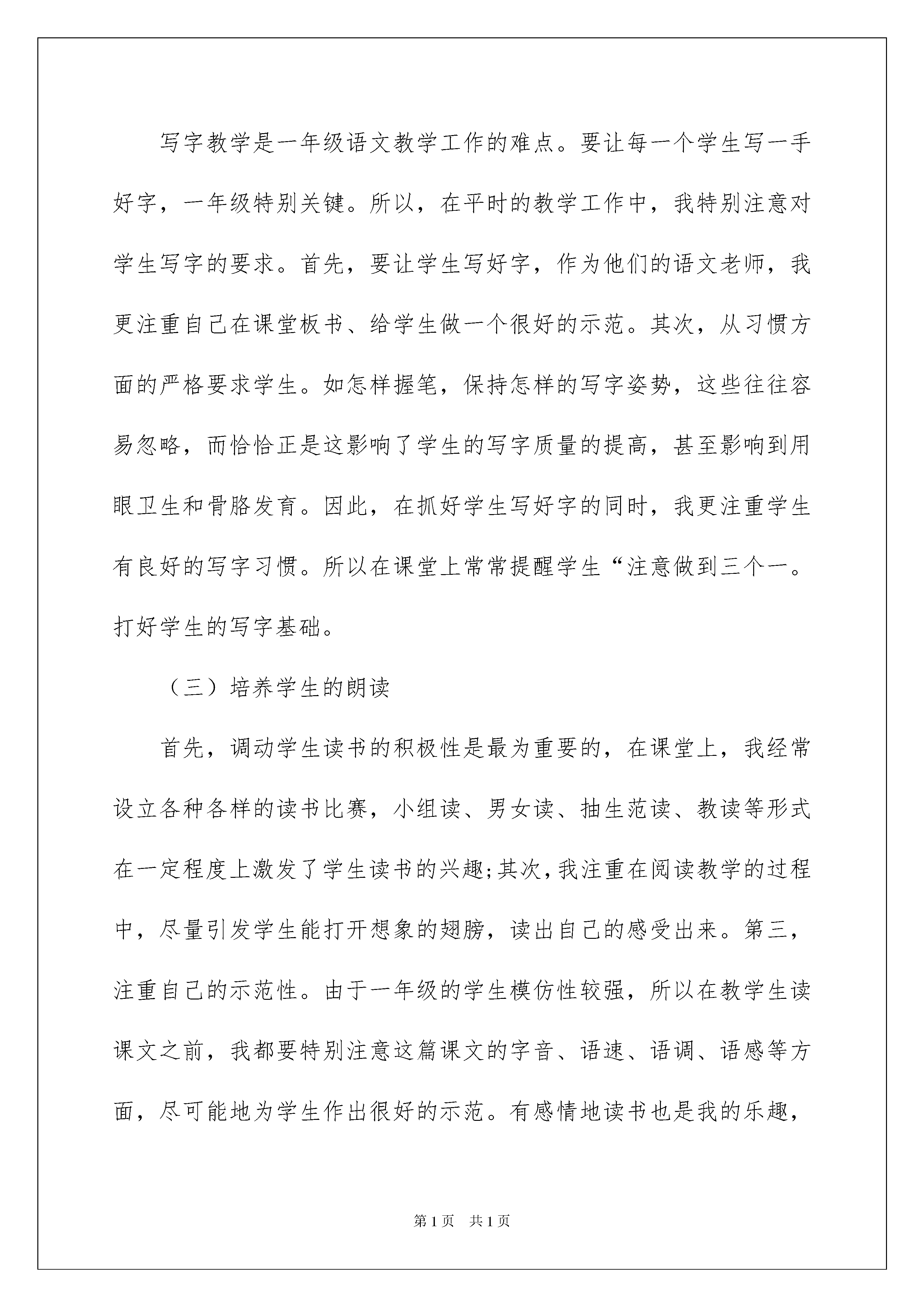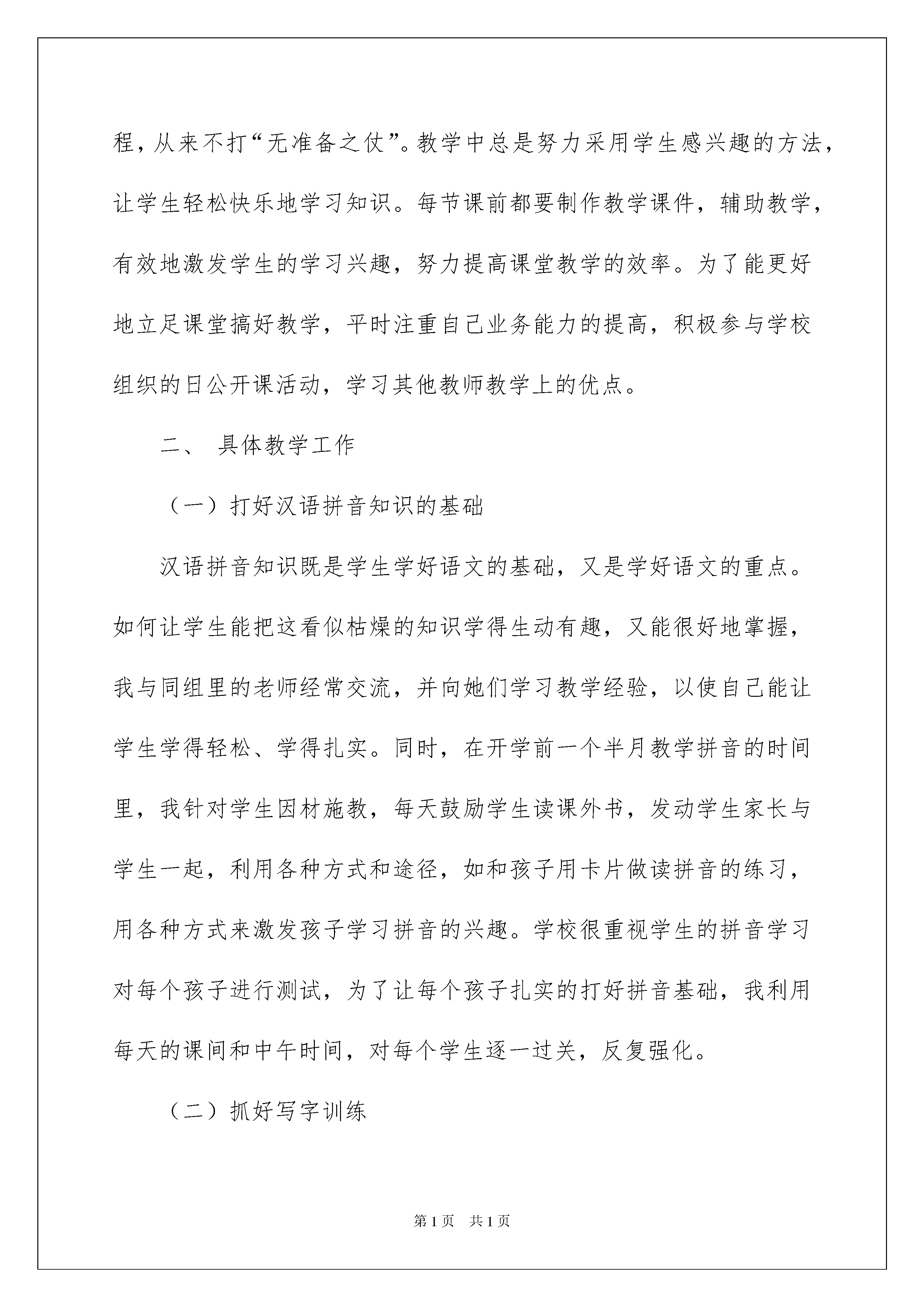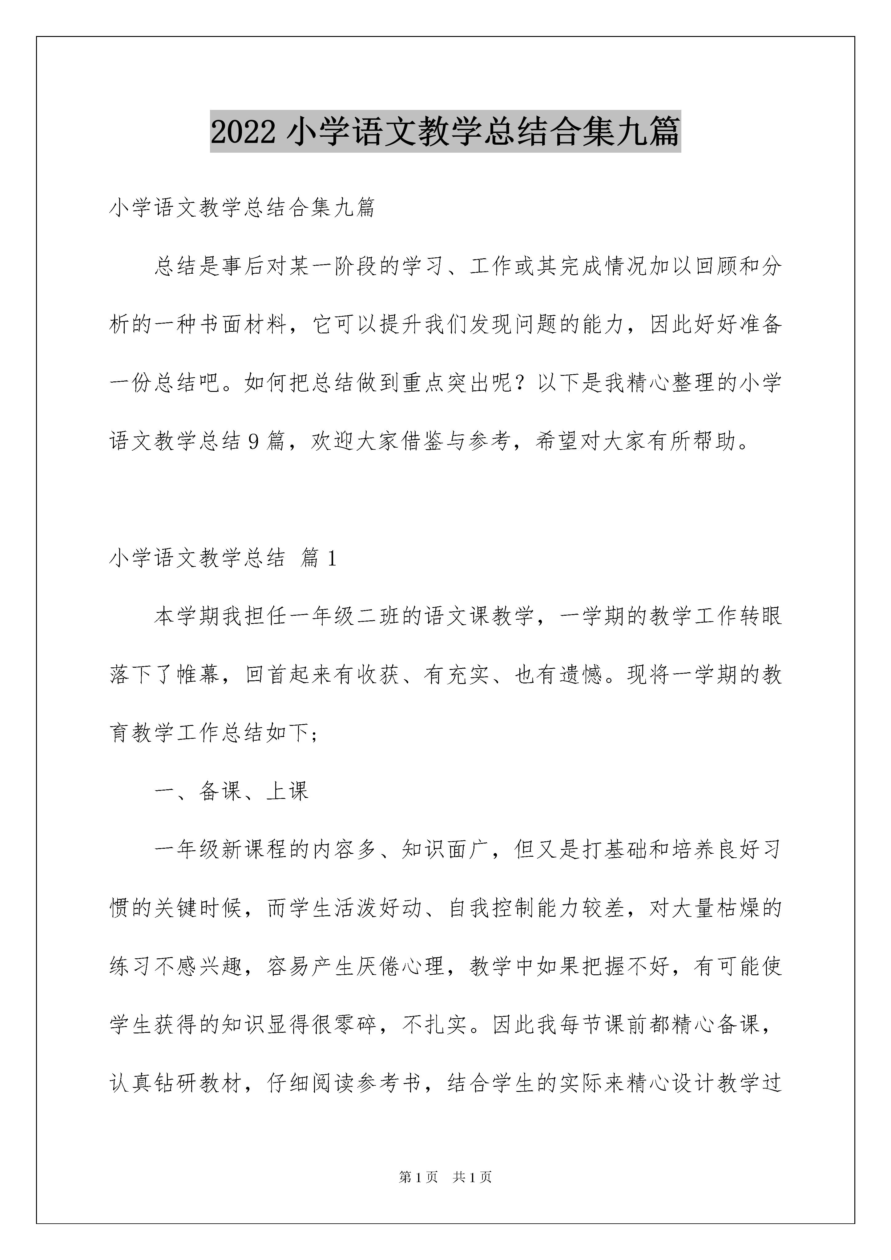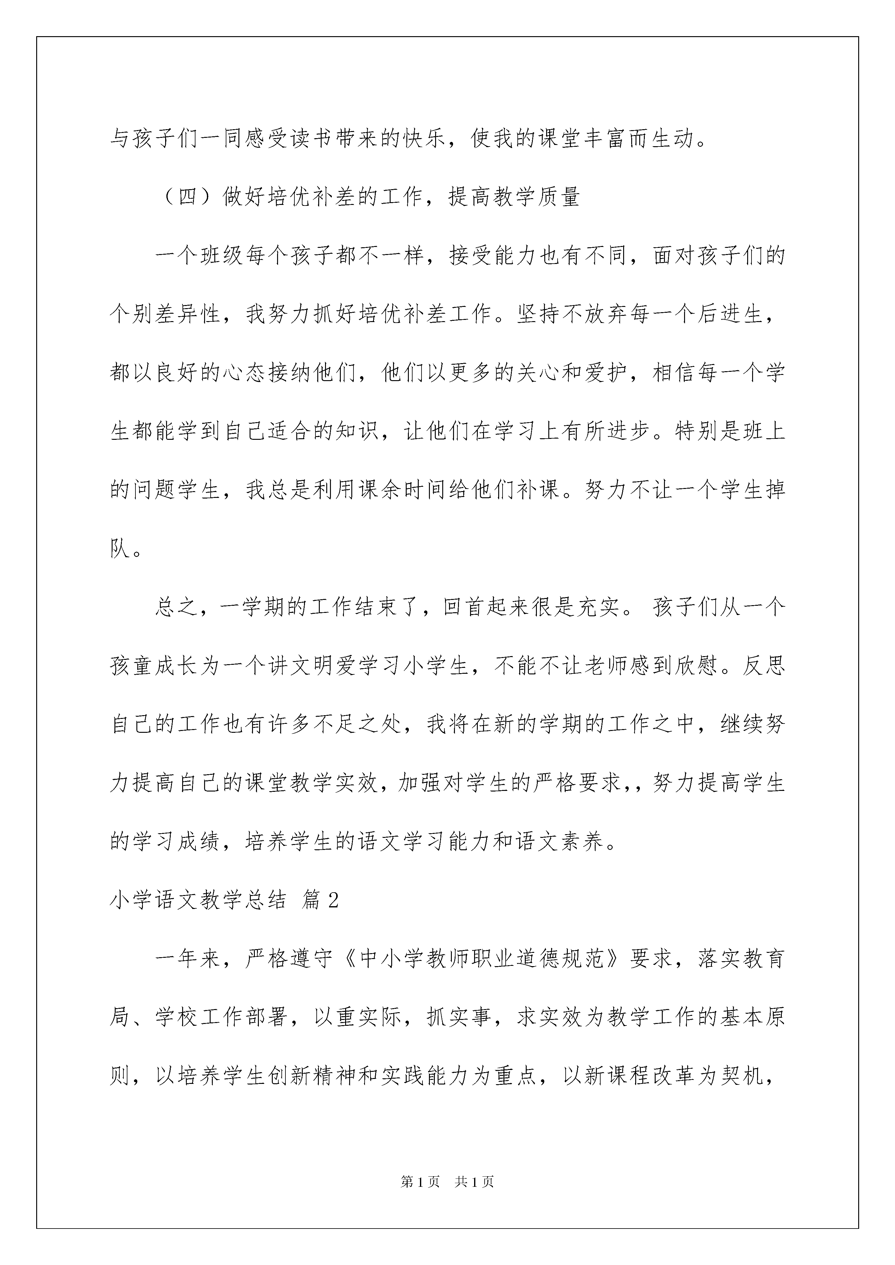 2022小学语文教学总结合集九篇小学语文教学总结合集九篇总结是事后对某一阶段的学习、工作或其完成情况加以回顾和分析的一种书面材料,它可以提升我们发现问题的能力,因此好好准备一份总结吧。如何把总结做到重点突出呢?以下是我精心整理的小学语文教学总结9篇,欢迎大家借鉴与参考,希望对大家有所帮助。小学语文教学总结篇1本学期我担任一年级二班的语文课教学,一学期的教学工作转眼落下了帷幕,回首起来有收获、有充实、也有遗憾。现将一学期的教育教学工作总结如下;一、备课、上课一年级新课程的内容多、知识面广,但又是打基础和培养良好习惯的关键时候,而学生活泼好动、自我控制能力较差,对大量枯燥的练习不感兴趣,容易产生厌倦心理,教学中如果把握不好,有可能使学生获得的知识显得很零碎,不扎实。因此我每节课前都精心备课,认真钻研教材,仔细阅读参考书,结合学生的实际来精心设计教学过程,从来不打“无准备之仗”。教学中总是努力采用学生感兴趣的方法,让学生轻松快乐地学习知识。每节课前都要制作教学课件,辅助教学,有效地激发学生的学习兴趣,努力提高课堂教学的效率。为了能更好地立足课堂搞好教学,平时注重自己业务能力的提高,积极参与学校组织的日公开课活动,学习其他教师教学上的优点。二、具体教学工作(一)打好汉语拼音知识的基础汉语拼音知识既是学生学好语文的基础,又是学好语文的重点。如何让学生能把这看似枯燥的知识学得生动有趣,又能很好地掌握,我与同组里的老师经常交流,并向她们学习教学经验,以使自己能让学生学得轻松、学得扎实。同时,在开学前一个半月教学拼音的时间里,我针对学生因材施教,每天鼓励学生读课外书,发动学生家长与学生一起,利用各种方式和途径,如和孩子用卡片做读拼音的练习,用各种方式来激发孩子学习拼音的兴趣。学校很重视学生的拼音学习对每个孩子进行测试,为了让每个孩子扎实的打好拼音基础,我利用每天的课间和中午时间,对每个学生逐一过关,反复强化。(二)抓好写字训练写字教学是一年级语文教学工作的难点。要让每一个学生写一手好字,一年级特别关键。所以,在平时的教学工作中,我特别注意对学生写字的要求。首先,要让学生写好字,作为他们的语文老师,我更注重自己在课堂板书、给学生做一个很好的示范。其次,从习惯方面的严格要求学生。如怎样握笔,保持怎样的写字姿势,这些往往容易忽略,而恰恰正是这影响了学生的写字质量的提高,甚至影响到用眼卫生和骨胳发育。因此,在抓好学生写好字的同时,我更注重学生有良好的写字习惯。所以在课堂上常常提醒学生“注意做到三个一。打好学生的写字基础。(三)培养学生的朗读首先,调动学生读书的积极性是最为重要的,在课堂上,我经常设立各种各样的读书比赛,小组读、男女读、抽生范读、教读等形式在一定程度上激发了学生读书的兴趣;其次,我注重在阅读教学的过程中,尽量引发学生能打开想象的翅膀,读出自己的感受出来。第三,注重自己的示范性。由于一年级的学生模仿性较强,所以在教学生读课文之前,我都要特别注意这篇课文的字音、语速、语调、语感等方面,尽可能地为学生作出很好的示范。有感情地读书也是我的乐趣,与孩子们一同感受读书带来的快乐,使我的课堂丰富而生动。(四)做好培优补差的工作,提高教学质量一个班级每个孩子都不一样,接受能力也有不同,面对孩子们的个别差异性,我努力抓好培优补差工作。坚持不放弃每一个后进生,都以良好的心态接纳他们,他们以更多的关心和爱护,相信每一个学生都能学到自己适合的知识,让他们在学习上有所进步。特别是班上的问题学生,我总是利用课余时间给他们补课。努力不让一个学生掉队。总之,一学期的工作结束了,回首起来很是充实。孩子们从一个孩童成长为一个讲文明爱学习小学生,不能不让老师感到欣慰。反思自己的工作也有许多不足之处,我将在新的学期的工作之中,继续努力提高自己的课堂教学实效,加强对学生的严格要求,,努力提高学生的学习成绩,培养学生的语文学习能力和语文素养。小学语文教学总结篇2一年来,严格遵守《中小学教师职业道德规范》要求,落实教育局、学校工作部署,以重实际,抓实事,求实效为教学工作的基本原则,以培养学生创新精神和实践能力为重点,以新课程改革为契机,深化课堂教学改革,认真落实课程计划,落实教学常规,落实教学改革措施,大力推进素质教育,使所任班级教学质量有了大面积提高,现就将一年以来工作情况总结如下:一、认真学习,提高思想认识,树立新的理念1、坚持每周的政治学习和业务学习,紧紧围绕学习新课程,构建新课程,尝试新教法的目标,不断更新教学观念。注重把学习新课程标准与构建新理念有机的结合起来。通过学习新的《课程标准》,认识到新课程改革既是挑战,又是