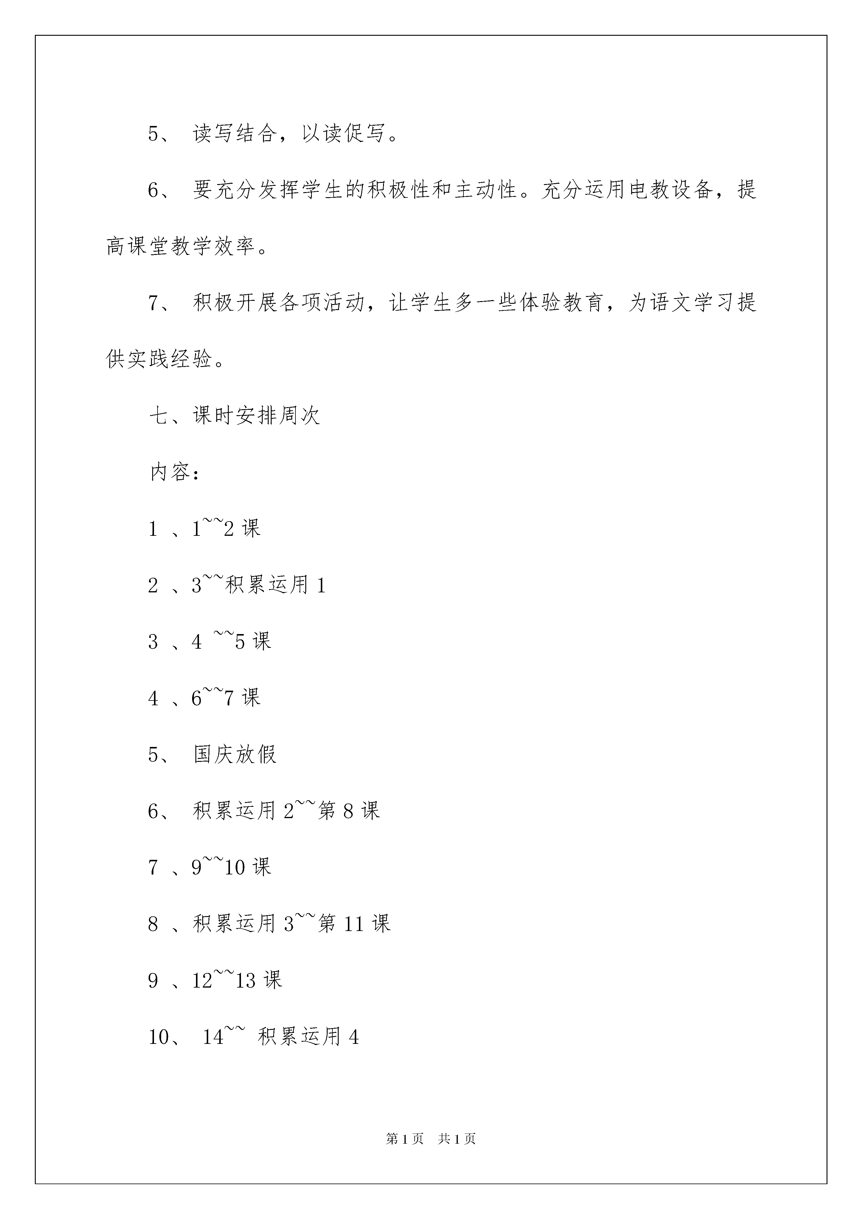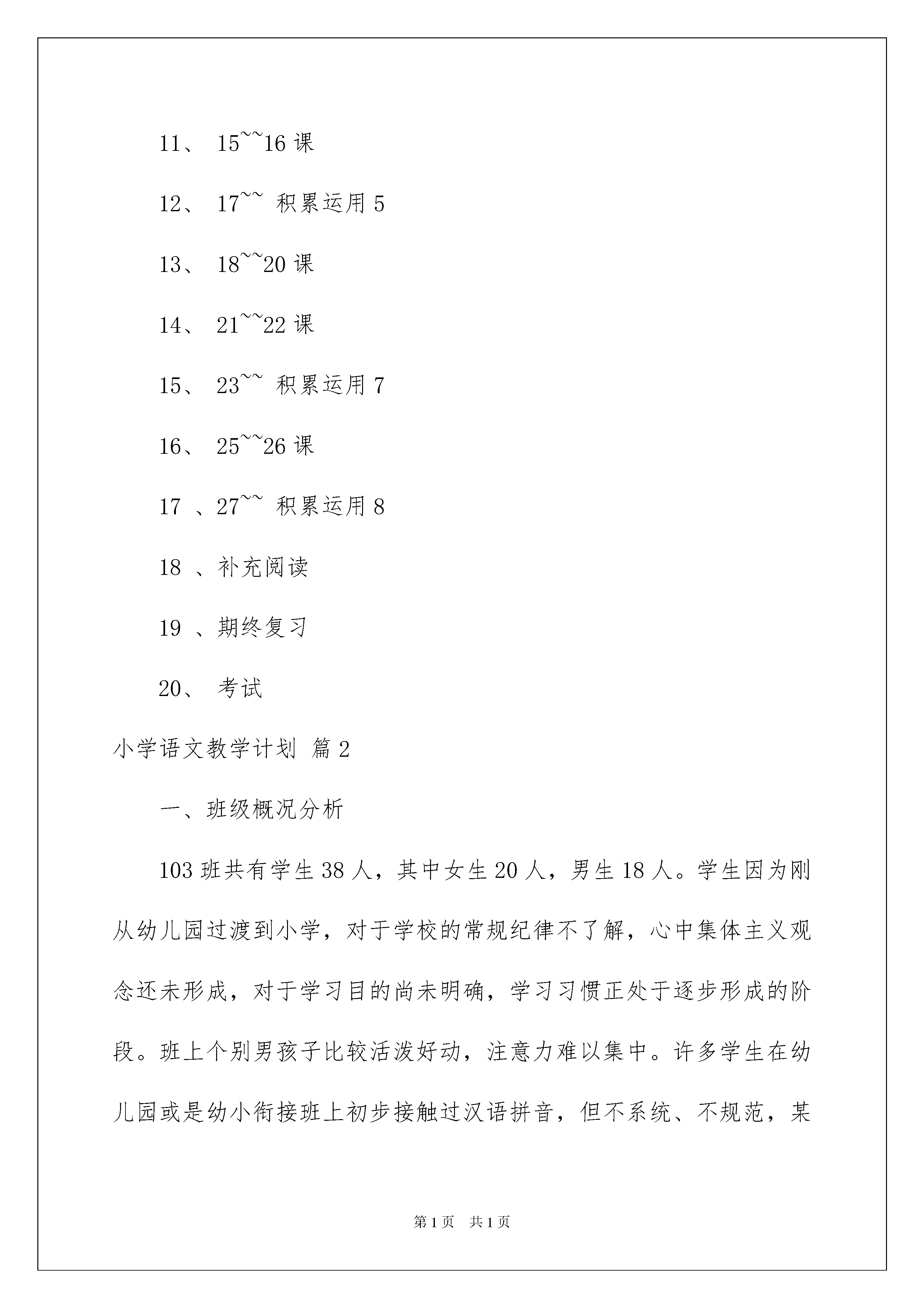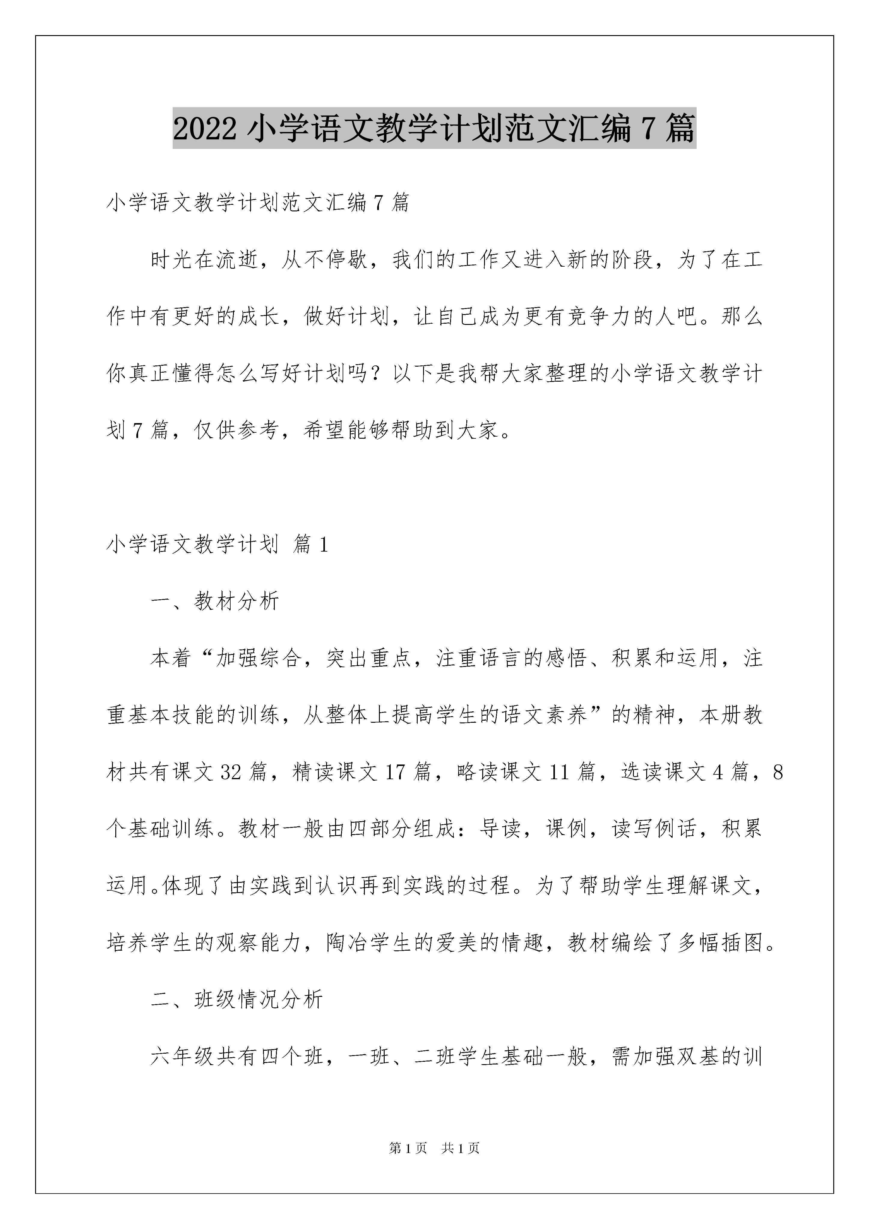 2022小学语文教学计划范文汇编7篇小学语文教学计划范文汇编7篇时光在流逝,从不停歇,我们的工作又进入新的阶段,为了在工作中有更好的成长,做好计划,让自己成为更有竞争力的人吧。那么你真正懂得怎么写好计划吗?以下是我帮大家整理的小学语文教学计划7篇,仅供参考,希望能够帮助到大家。小学语文教学计划篇1一、教材分析本着“加强综合,突出重点,注重语言的感悟、积累和运用,注重基本技能的训练,从整体上提高学生的语文素养”的精神,本册教材共有课文32篇,精读课文17篇,略读课文11篇,选读课文4篇,8个基础训练。教材一般由四部分组成:导读,课例,读写例话,积累运用。体现了由实践到认识再到实践的过程。为了帮助学生理解课文,培养学生的观察能力,陶冶学生的爱美的情趣,教材编绘了多幅插图。二、班级情况分析六年级共有四个班,一班、二班学生基础一般,需加强双基的训练,提高他们的阅读水平和理解能力。三班学生基础扎实,分析能力强,本学期将在训练的广度和深度上下功夫。四班由原来的敬文小学五年级直升单独成班,学生较好,今年将作进一步提高。三、教学要求1、通过本册课文的学习,要使学生受到热爱党、热爱人民的思想教育;受到孝敬父母、关心他人、助人为乐的教育;培养热爱科学、勇于实践和创新的精神,增强保护环境的意识和社会责任感,陶冶学生的爱美的情趣;还要使学生从一些写景状物的文章中学习观察问题和分析问题的正确思想方法。2、复习巩固汉语拼音,利用汉语拼音识字,学习普通话。3、培养独立识字的能力,学会140个生字,复习查字典的方法,养成自觉运用字典的习惯。4、进一步提高联系上下文和联系生活实际理解句子的能力。注意积累词语,初步养成积累语言的习惯。5、继续练习正确、流利、有感情地朗读课文。能背诵指定的课文。默读课文有一定的速度。进一步训练体会课文的思想感情,初步领悟作者的表达方式。6、阅读适合程度的课外读物,了解主要内容,逐步养成课外阅读的习惯,本学期阅读不少于20万字。7、乐于参加讨论或辩论,稍作准备,能讲清楚自己的意思,表达有条理,语气、语调适当。8、能抓住重点进行观察事物,养成勤于思考和乐于动笔的习惯,能写简单的记实作文和想像作文,内容具体,事情真实,有一定的条理。四、双基教学要求继续凭借字、词、句、段、篇进行听、说、读、写的训练,提高学生的语文综合能力和综合素养。五、思想品德教育结合点要使学生受到热爱党、热爱人民的思想教育;受到孝敬父母、关心他人、助人为乐的教育;培养热爱科学、勇于实践和创新的精神,增强保护环境的意识和社会责任感。六、教学措施1、看图学文教学时要将事物的形象和文字描述紧密结合起来。2、讲读课文教学时要突出重点训练项目的训练,3、重视词、句、段的训练,重视朗读的训练和指导,加强课外阅读的指导,拓宽学生的视野,丰富学生的知识。4、加强信息反馈,注意师生沟通。5、读写结合,以读促写。6、要充分发挥学生的积极性和主动性。充分运用电教设备,提高课堂教学效率。7、积极开展各项活动,让学生多一些体验教育,为语文学习提供实践经验。七、课时安排周次内容:1、1~~2课2、3~~积累运用13、4~~5课4、6~~7课5、国庆放假6、积累运用2~~第8课7、9~~10课8、积累运用3~~第11课9、12~~13课10、14~~积累运用411、15~~16课12、17~~积累运用513、18~~20课14、21~~22课15、23~~积累运用716、25~~26课17、27~~积累运用818、补充阅读19、期终复习20、考试小学语文教学计划篇2一、班级概况分析103班共有学生38人,其中女生20人,男生18人。学生因为刚从幼儿园过渡到小学,对于学校的常规纪律不了解,心中集体主义观念还未形成,对于学习目的尚未明确,学习习惯正处于逐步形成的阶段。班上个别男孩子比较活泼好动,注意力难以集中。许多学生在幼儿园或是幼小衔接班上初步接触过汉语拼音,但不系统、不规范,某些发音也不够准确。由于家庭教育、幼儿园等一些客观因素的影响,学生的知识经验、认知水平和语言表达能力都有比较大的差异。个别学生在幼儿时期已认识一些汉字,具有主动识字的愿望,但也有部分学生还未认识汉字。一部分学生能就感兴趣的内容提出自己的见解或问题,具有一定的表达自信心,而部分学生则较为胆怯,不愿发言。本班大部分学生都可以用普通话进行基本语言交流,声音清楚,。因此,在教学过程中,要因材施教,尽量从他们的实际出发,结合新课程的要求,促进学生的个性发展和语文素质的提高。二、本册教材分析本册教材包括“入学教育、汉语拼音、识字与写字、课文、语文园地、口语交际”六个部分。“入学教育”