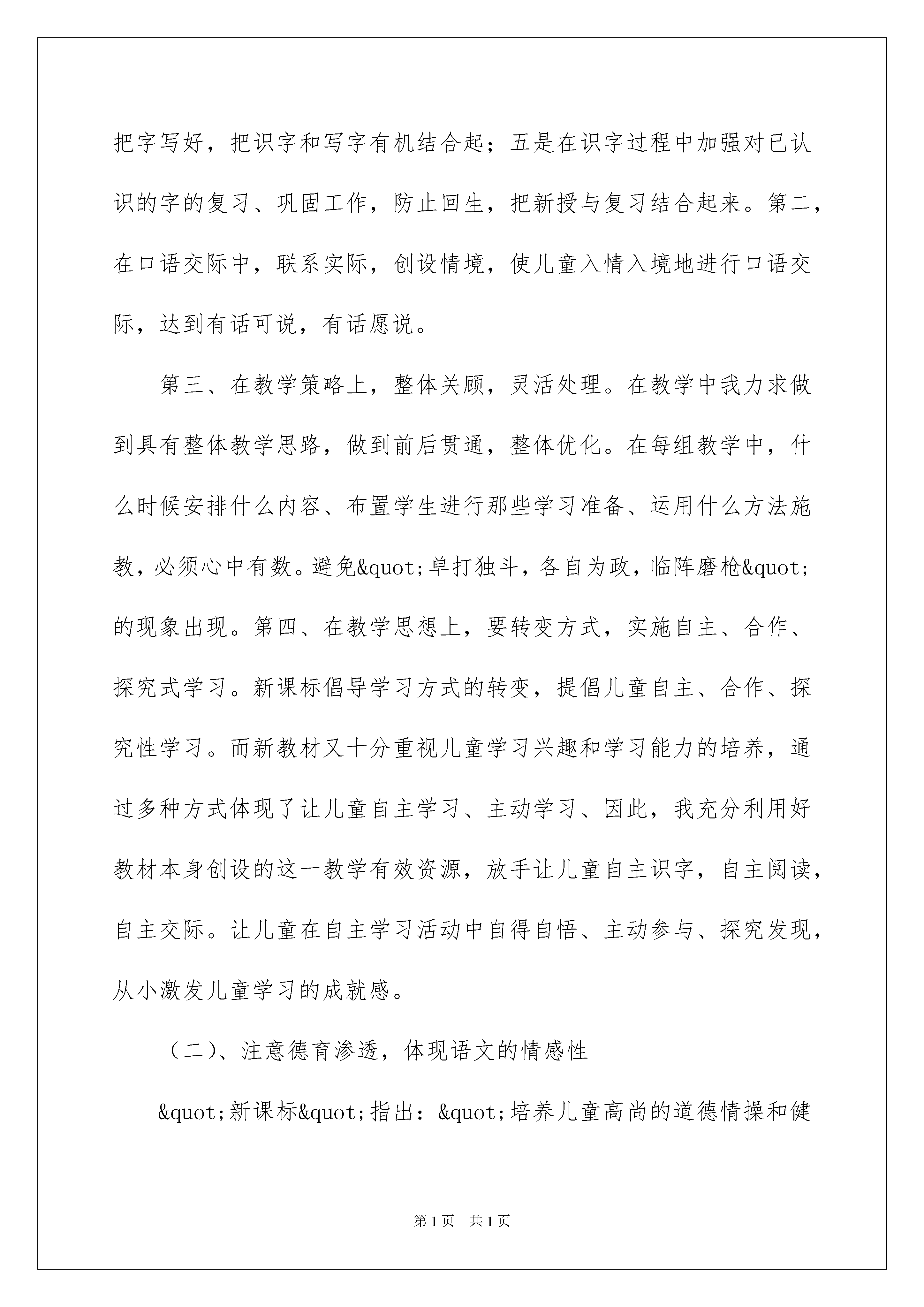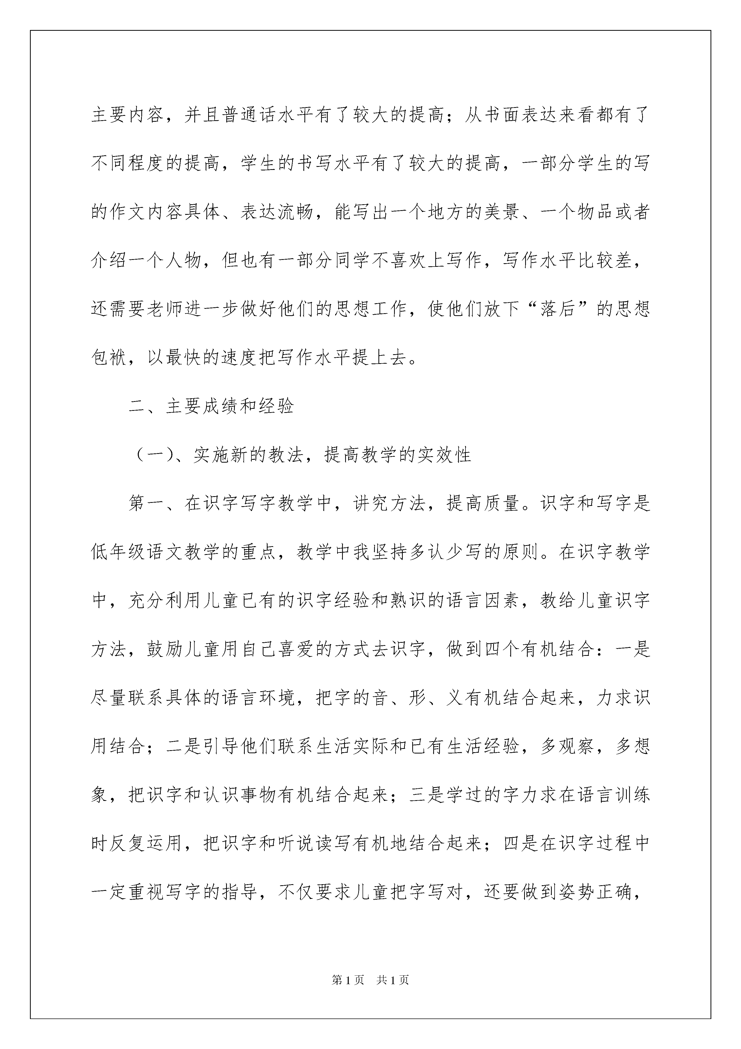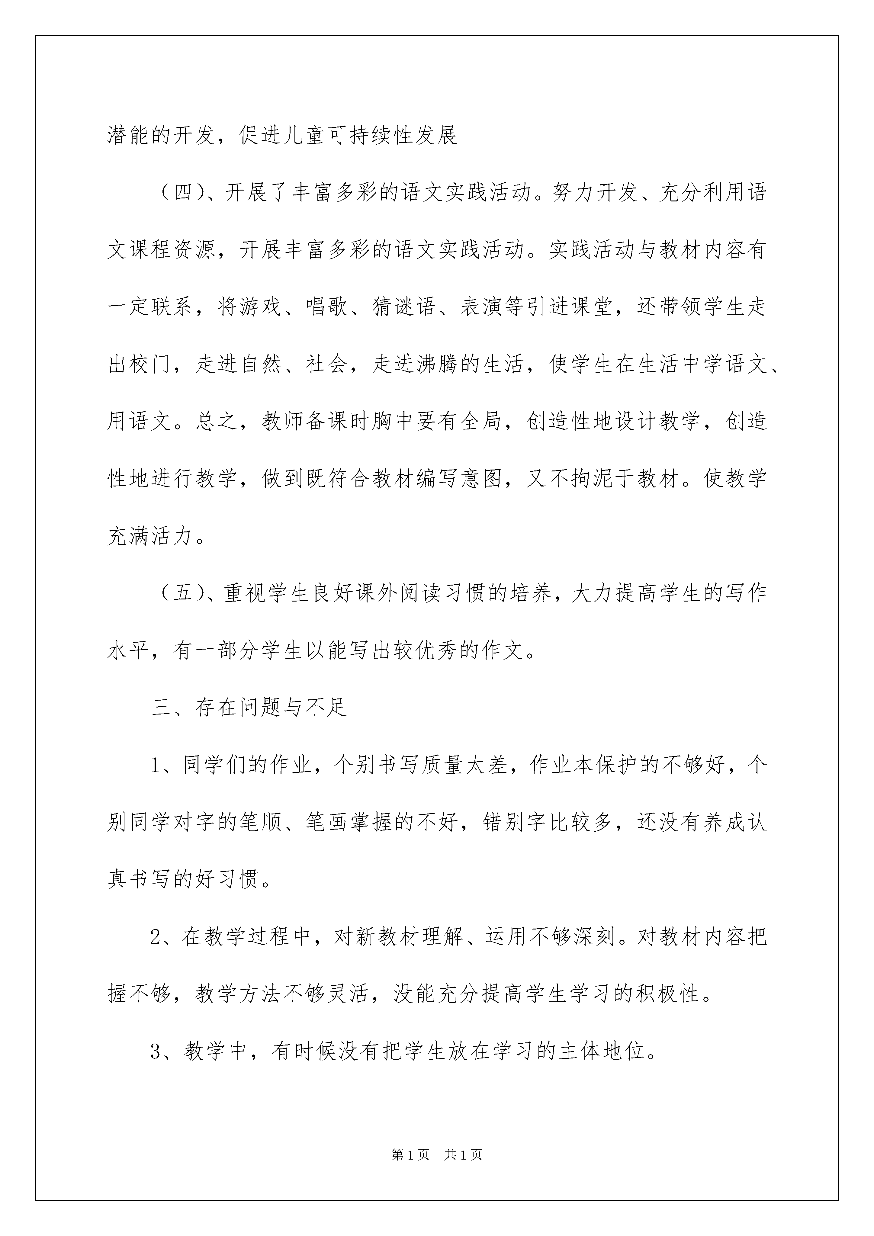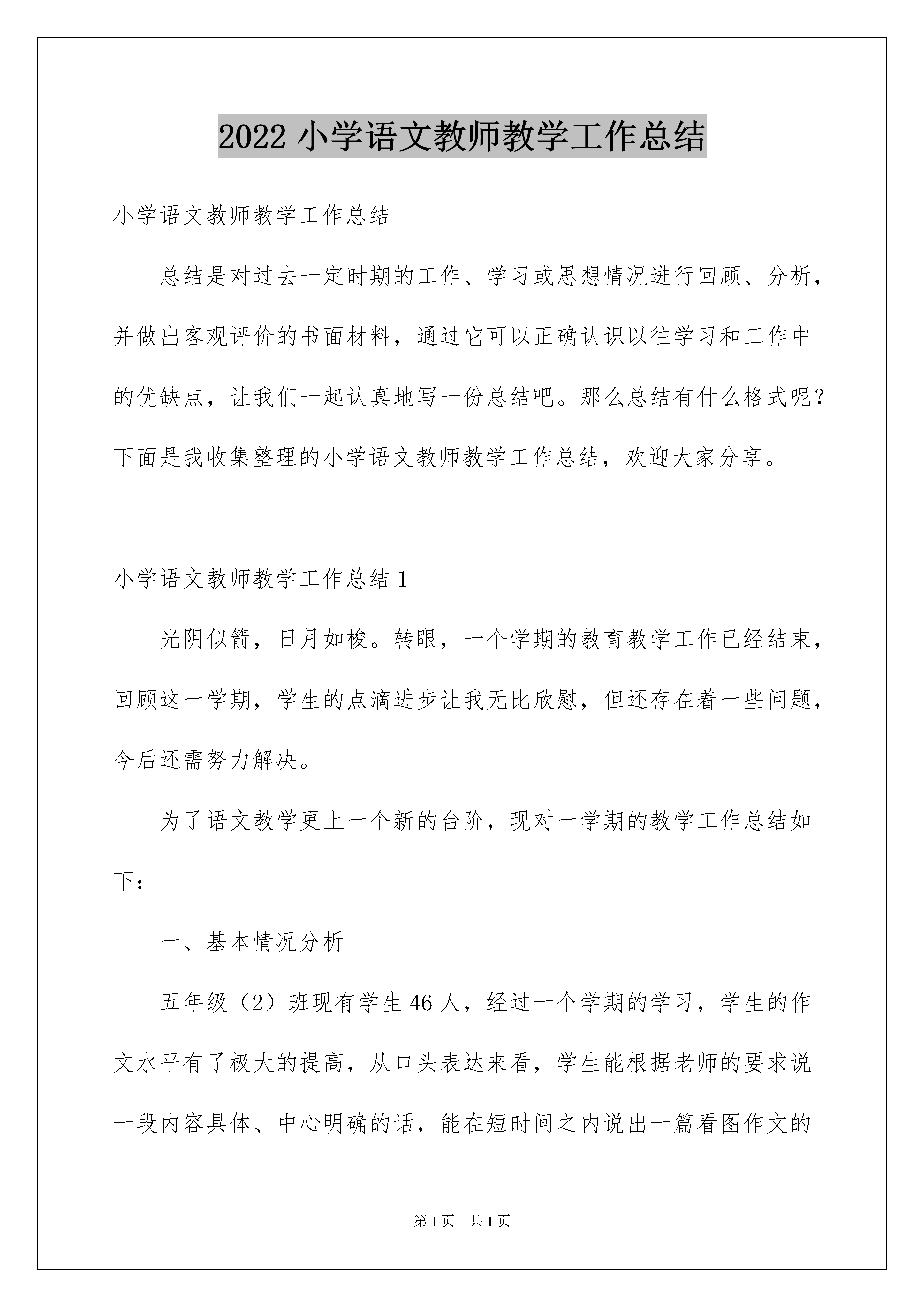 2022小学语文教师教学工作总结小学语文教师教学工作总结总结是对过去一定时期的工作、学习或思想情况进行回顾、分析,并做出客观评价的书面材料,通过它可以正确认识以往学习和工作中的优缺点,让我们一起认真地写一份总结吧。那么总结有什么格式呢?下面是我收集整理的小学语文教师教学工作总结,欢迎大家分享。小学语文教师教学工作总结1光阴似箭,日月如梭。转眼,一个学期的教育教学工作已经结束,回顾这一学期,学生的点滴进步让我无比欣慰,但还存在着一些问题,今后还需努力解决。为了语文教学更上一个新的台阶,现对一学期的教学工作总结如下:一、基本情况分析五年级(2)班现有学生46人,经过一个学期的学习,学生的作文水平有了极大的提高,从口头表达来看,学生能根据老师的要求说一段内容具体、中心明确的话,能在短时间之内说出一篇看图作文的主要内容,并且普通话水平有了较大的提高;从书面表达来看都有了不同程度的提高,学生的书写水平有了较大的提高,一部分学生的写的作文内容具体、表达流畅,能写出一个地方的美景、一个物品或者介绍一个人物,但也有一部分同学不喜欢上写作,写作水平比较差,还需要老师进一步做好他们的思想工作,使他们放下“落后”的思想包袱,以最快的速度把写作水平提上去。二、主要成绩和经验(一)、实施新的教法,提高教学的实效性第一、在识字写字教学中,讲究方法,提高质量。识字和写字是低年级语文教学的重点,教学中我坚持多认少写的原则。在识字教学中,充分利用儿童已有的识字经验和熟识的语言因素,教给儿童识字方法,鼓励儿童用自己喜爱的方式去识字,做到四个有机结合:一是尽量联系具体的语言环境,把字的音、形、义有机结合起来,力求识用结合;二是引导他们联系生活实际和已有生活经验,多观察,多想象,把识字和认识事物有机结合起来;三是学过的字力求在语言训练时反复运用,把识字和听说读写有机地结合起来;四是在识字过程中一定重视写字的指导,不仅要求儿童把字写对,还要做到姿势正确,把字写好,把识字和写字有机结合起;五是在识字过程中加强对已认识的字的复习、巩固工作,防止回生,把新授与复习结合起来。第二,在口语交际中,联系实际,创设情境,使儿童入情入境地进行口语交际,达到有话可说,有话愿说。第三、在教学策略上,整体关顾,灵活处理。在教学中我力求做到具有整体教学思路,做到前后贯通,整体优化。在每组教学中,什么时候安排什么内容、布置学生进行那些学习准备、运用什么方法施教,必须心中有数。避免"单打独斗,各自为政,临阵磨枪"的现象出现。第四、在教学思想上,要转变方式,实施自主、合作、探究式学习。新课标倡导学习方式的转变,提倡儿童自主、合作、探究性学习。而新教材又十分重视儿童学习兴趣和学习能力的培养,通过多种方式体现了让儿童自主学习、主动学习、因此,我充分利用好教材本身创设的这一教学有效资源,放手让儿童自主识字,自主阅读,自主交际。让儿童在自主学习活动中自得自悟、主动参与、探究发现,从小激发儿童学习的成就感。(二)、注意德育渗透,体现语文的情感性"新课标"指出:"培养儿童高尚的道德情操和健康的审美情趣,形成正确的价值观和积极的人生态度,是语文学习的重要内容,不应该把它们当作外在的、附加的任务,而应该因势利导,贯穿于日常的教学过程之中,通过熏陶感染,收到潜移默化的功效。"我在教学中积极贯彻了这一思想。我在教学中,一方面要充分利用教材蕴藏的德育因素,适时、适度地进行德育渗透,达到"润物细无声"的效果。另一方面,充分挖掘教材中的情感因素,强化人文素质教育,做到"披文入情,以情悟文,情文结合"。(三)、培养语文素养,体现语文的学科性新教材特别重视对儿童语文素养的培养。因此,教师在教学中要充分利用教材优势,注重儿童语言的积累、感悟和运用,注重对儿童进行语文基本技能的训练,给儿童打下扎实的语文基础;要努力体现语文的实践性和综合性,努力开发语文课程资源,充分利用当时、当地的学习资源和教育资源,开展一些具有实效的丰富多彩的语文综合性活动和语文实践活动,拓宽儿童的语文学习空间,增加儿童语文实践的机会;努力改进课堂教学,整体考虑知识与能力、情感与态度、过程与方法的综合,实施了启发式、讨论式教学;注重儿童语文创造潜能的开发,促进儿童可持续性发展(四)、开展了丰富多彩的语文实践活动。努力开发、充分利用语文课程资源,开展丰富多彩的语文实践活动。实践活动与教材内容有一定联系,将游戏、唱歌、猜谜语、表演等引进课堂,还带领学生走出校门,走进自然、社会,走进沸腾的生活,使学生在生活中学语文