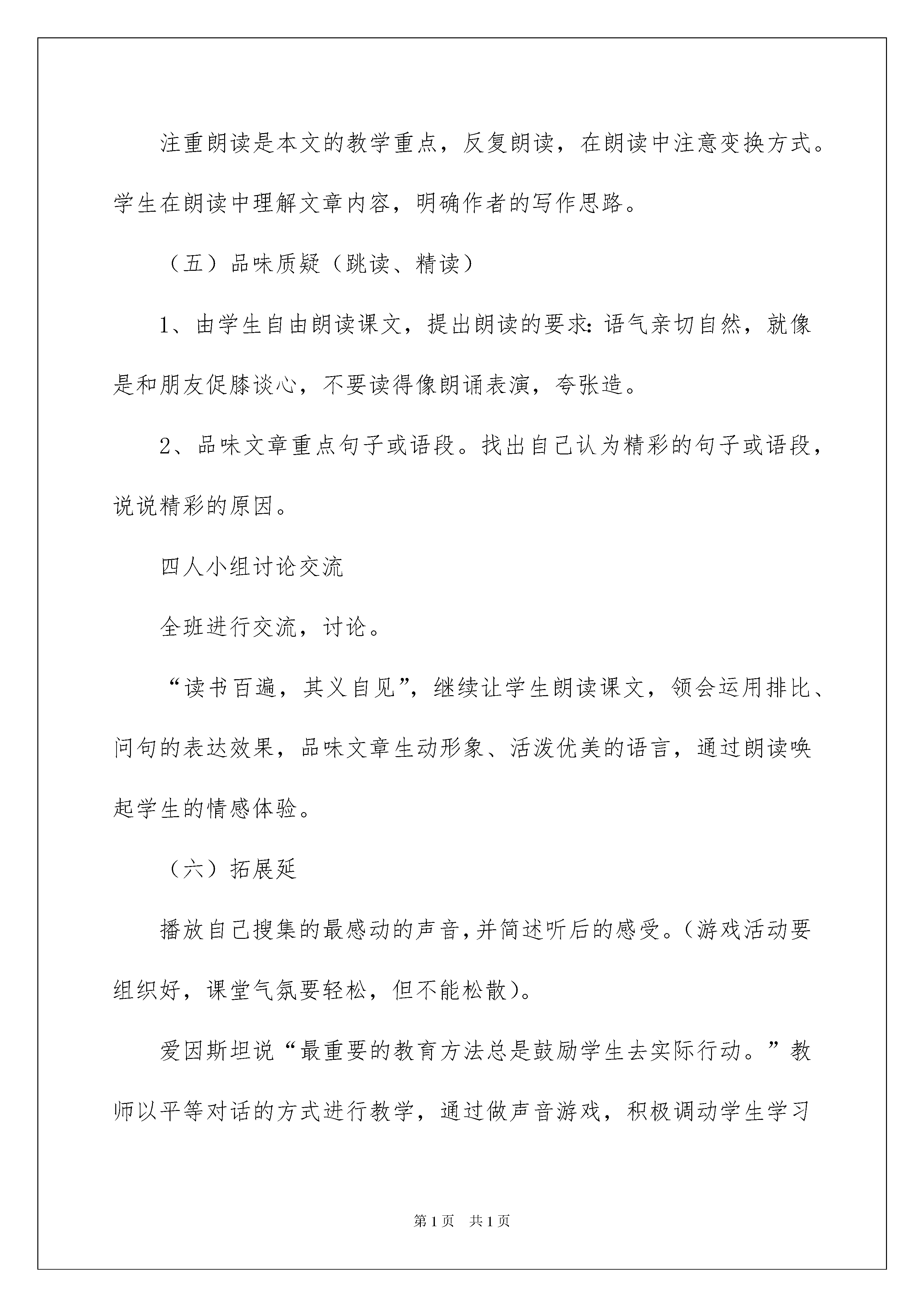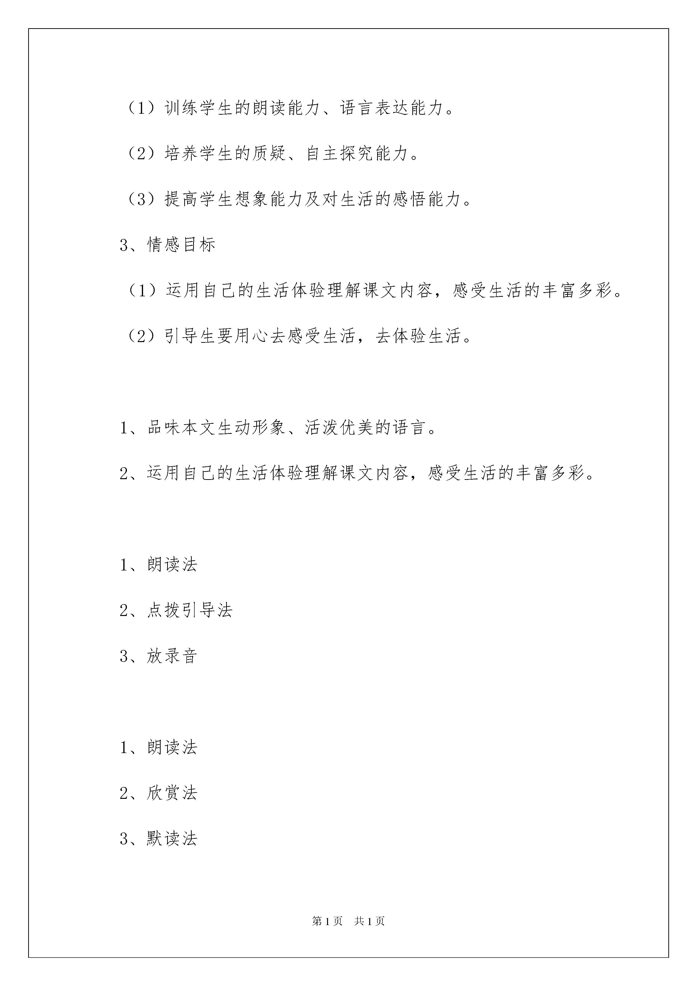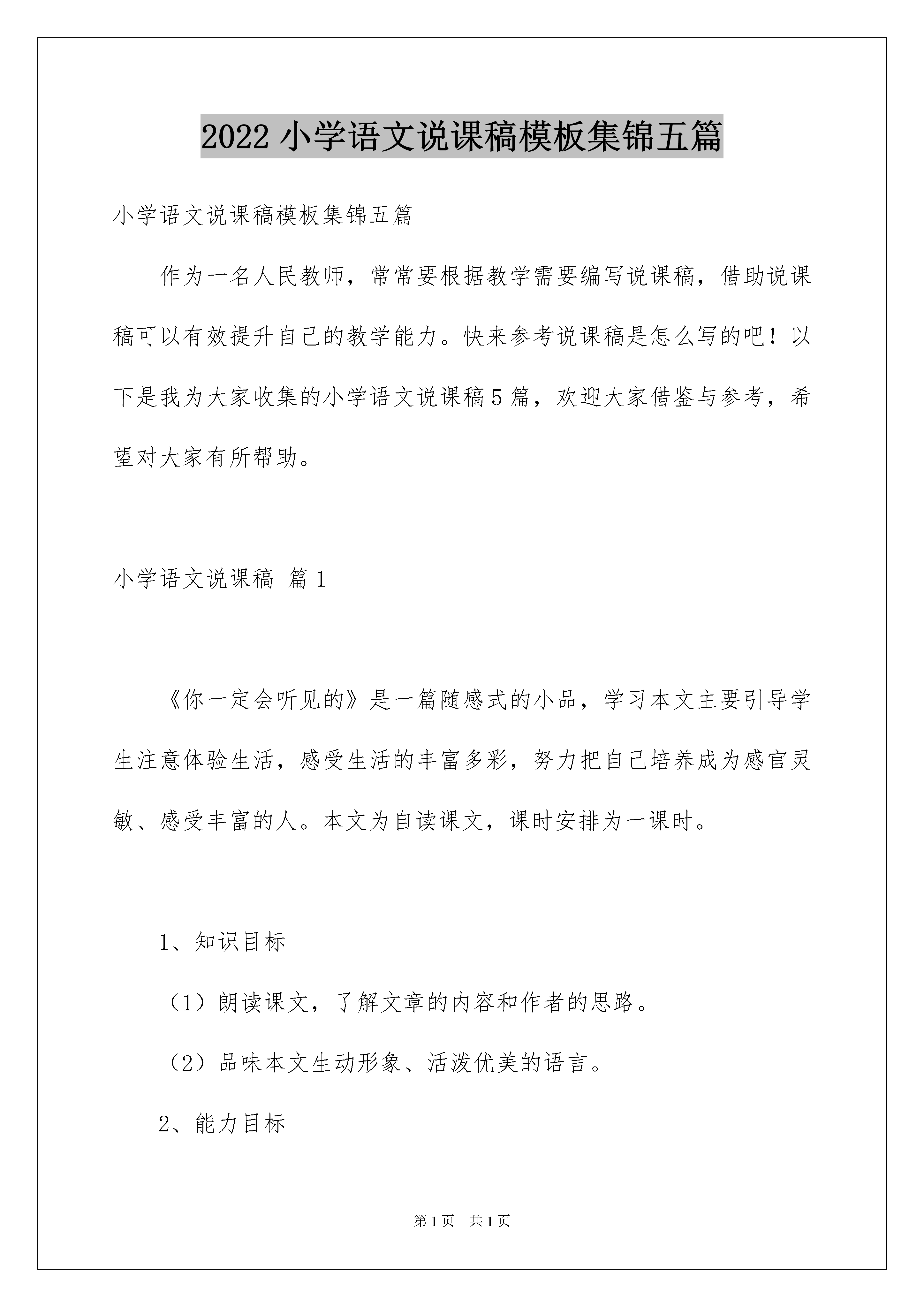 2022小学语文说课稿模板集锦五篇小学语文说课稿模板集锦五篇作为一名人民教师,常常要根据教学需要编写说课稿,借助说课稿可以有效提升自己的教学能力。快来参考说课稿是怎么写的吧!以下是我为大家收集的小学语文说课稿5篇,欢迎大家借鉴与参考,希望对大家有所帮助。小学语文说课稿篇1《你一定会听见的》是一篇随感式的小品,学习本文主要引导学生注意体验生活,感受生活的丰富多彩,努力把自己培养成为感官灵敏、感受丰富的人。本文为自读课文,课时安排为一课时。1、知识目标(1)朗读课文,了解文章的内容和作者的思路。(2)品味本文生动形象、活泼优美的语言。2、能力目标(1)训练学生的朗读能力、语言表达能力。(2)培养学生的质疑、自主探究能力。(3)提高学生想象能力及对生活的感悟能力。3、情感目标(1)运用自己的生活体验理解课文内容,感受生活的丰富多彩。(2)引导生要用心去感受生活,去体验生活。1、品味本文生动形象、活泼优美的语言。2、运用自己的生活体验理解课文内容,感受生活的丰富多彩。1、朗读法2、点拨引导法3、放录音1、朗读法2、欣赏法3、默读法4、讨论法5、质疑法(一)导入新课人们常说“眼睛是心灵的窗户”,可见视觉对于人类来讲是多么重要!还有一种感觉对人类同样重要——那就是听觉。是如泣如诉的二胡声,使瞎子阿炳的世界充满阳光;是琅琅的读书声,使冬天的校园也充满了生机;是妈妈的一句关心的话语,使你伤感的心不再失意……可是,有的同学由于在平时的生活中粗心大意,忽略了生活中的各种美妙的声音。从今天开始,只要你“用心”去听,你一定会听见的!导入新课时,通过列举学生熟悉的事例说明听觉的重要性,唤起学生对听觉的感情体验,切入课文主题,“不知不觉地他们的注意力吸引到主题上,引起新的学习兴趣”。(二)师放音乐磁带《动物狂欢节》。要求学生:ɑ、闭上眼睛,发挥想像,再现音乐中描绘的画面。b、听完后,用语言描绘出听到的音乐中的景象。让学生听音乐以激发阅读兴趣,训练学生的想像能力、语言表达能力,调动课堂的学习气氛。(三)初读课1、学生大声自由朗读课文。让学生自由朗读,学生自然会被文章生动活泼的语言所吸引,通过朗读熟悉课文。2、勾画出与自己在生活中有共同感受的语句或段落以备发言。训练学生的默读能力,能结合自己的生活体验找出相关的语。3、学生自由发言,谈谈读后的感受,教师注意点拨评价。《语文课程标准》强调“在语文教学中,学生是学习的主体,教学应激发学生的学习兴趣,注重培养学生自主学习的意识和习惯,为学生创设良好的自主学习情境,尊重学生的个体差异”。对于学生的发言只要言之有理就应给予表扬,对于不当之处适当给予点拨,训练学生的语言表达能力。(四)研读课1、学生齐声朗读课文,进一步熟悉课文内容。2、说一说这篇课文写了哪些内容可划分为几部分(各小组推一位代表在全班发言,教师总结归纳)。注重朗读是本文的教学重点,反复朗读,在朗读中注意变换方式。学生在朗读中理解文章内容,明确作者的写作思路。(五)品味质疑(跳读、精读)1、由学生自由朗读课文,提出朗读的要求:语气亲切自然,就像是和朋友促膝谈心,不要读得像朗诵表演,夸张造。2、品味文章重点句子或语段。找出自己认为精彩的句子或语段,说说精彩的原因。四人小组讨论交流全班进行交流,讨论。“读书百遍,其义自见”,继续让学生朗读课文,领会运用排比、问句的表达效果,品味文章生动形象、活泼优美的语言,通过朗读唤起学生的情感体验。(六)拓展延播放自己搜集的最感动的声音,并简述听后的感受。(游戏活动要组织好,课堂气氛要轻松,但不能松散)。爱因斯坦说“最重要的教育方法总是鼓励学生去实际行动。”教师以平等对话的方式进行教学,通过做声音游戏,积极调动学生学习的积极性,能营造出一种轻松活泼的教学氛围。(七)作业设写出对最让你感动的声音的感受。(300字左右)布置此项作业,让学生进一步巩固课堂教学内容,并将学生已调动起来的生活体验深化,通过写短文,锻炼学生的书面表达能力。(八)板书设计(略)小学语文说课稿篇2一、说教材《再见了,亲人》是人教版五年级下册第四组的一篇精读课文。这篇精读课文记叙了1958年最后一批志愿军离朝回国时,同朝鲜人民依依惜别的情景,赞扬了中朝人民用鲜血凝成的伟大友谊。本文是一篇浸透了中朝两国人民深厚感情的抒情文章,以情为线索贯穿全文。作者采用了直接抒情和间接抒情的表现手法,描写出了一个依依惜别的感人场面。二、说教学目标小学语文教学大纲对高年级学生阅读能力训练要求中明确提出:要"能理解主要内容,领会有一定内函的词句,体会作者表达的思想感情,并有自己的见解,能领悟作者的一些表达方法。"因此,在教学目