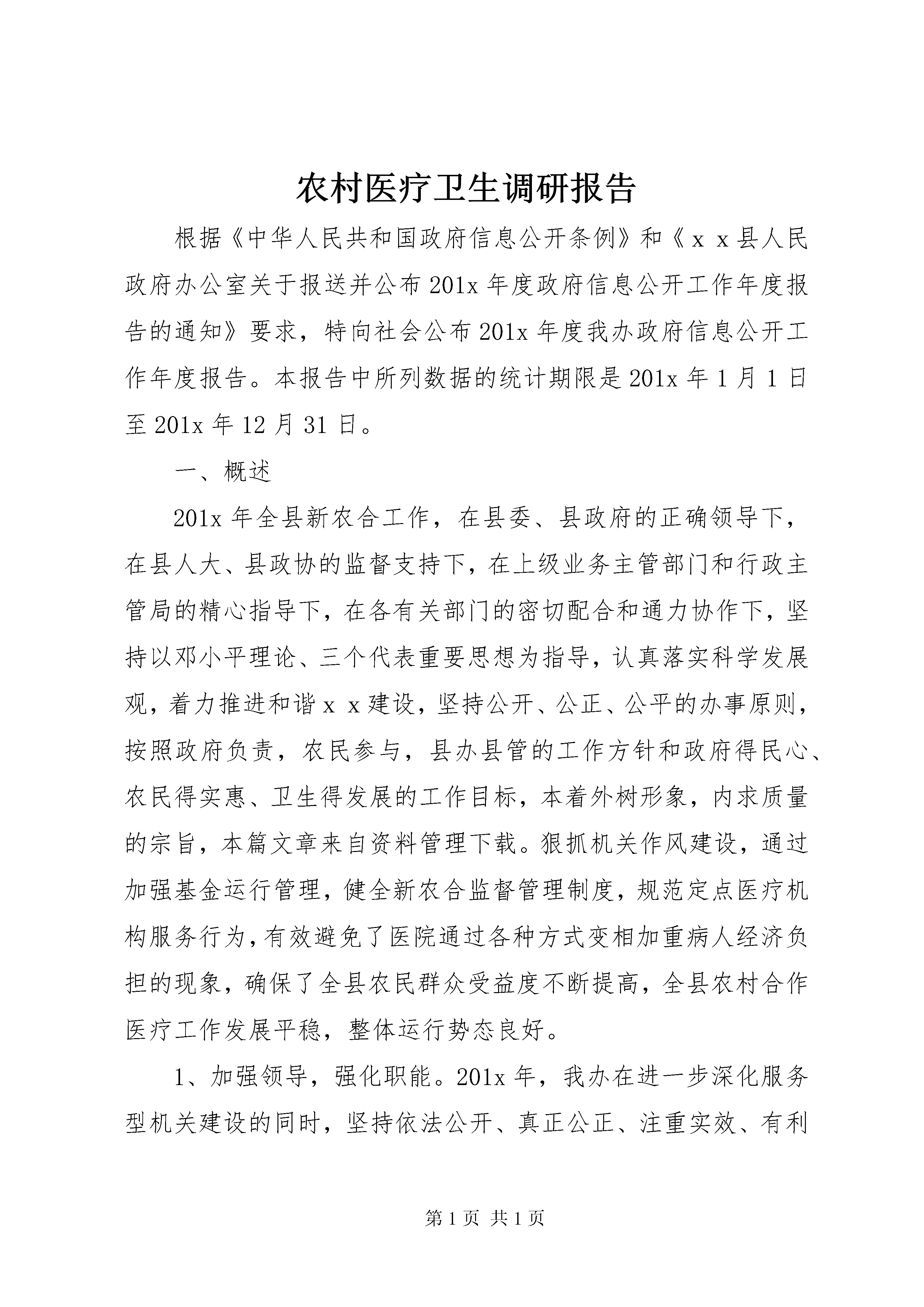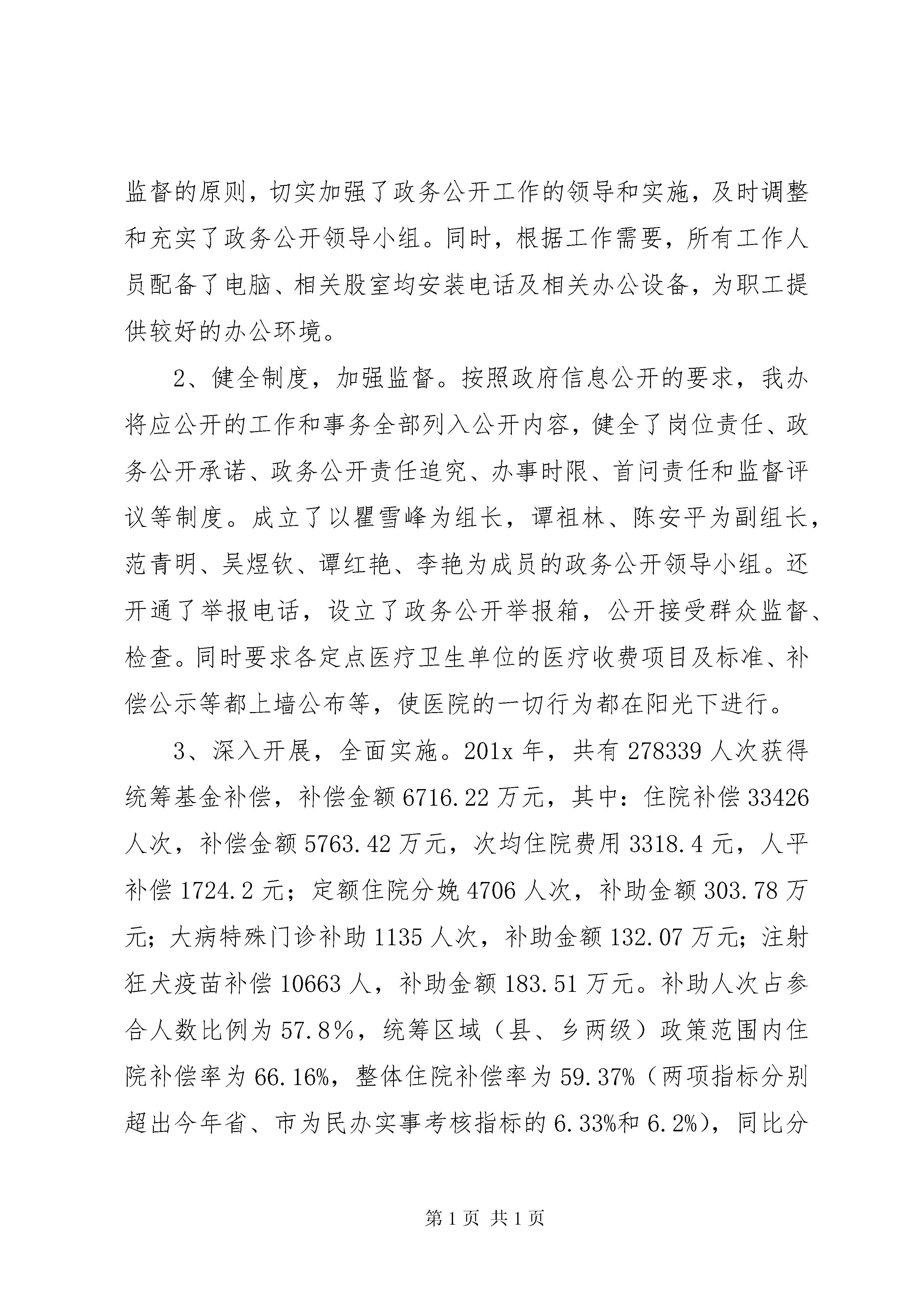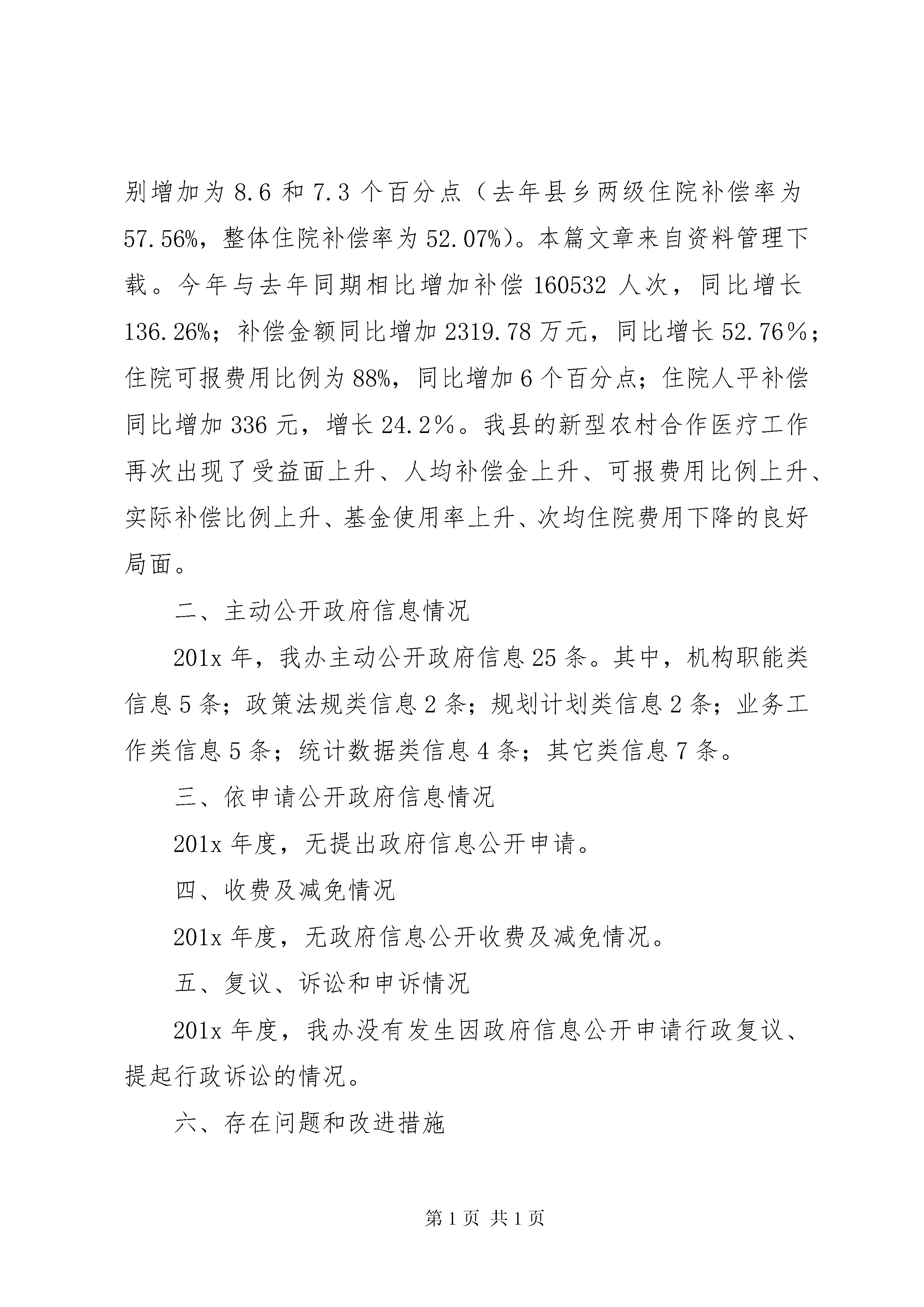 农村医疗卫生调研报告根据《中华人民共和国政府信息公开条例》和《xx县人民政府办公室关于报送并公布201x年度政府信息公开工作年度报告的通知》要求,特向社会公布201x年度我办政府信息公开工作年度报告。本报告中所列数据的统计期限是201x年1月1日至201x年12月31日。一、概述201x年全县新农合工作,在县委、县政府的正确领导下,在县人大、县政协的监督支持下,在上级业务主管部门和行政主管局的精心指导下,在各有关部门的密切配合和通力协作下,坚持以邓小平理论、三个代表重要思想为指导,认真落实科学发展观,着力推进和谐xx建设,坚持公开、公正、公平的办事原则,按照政府负责,农民参与,县办县管的工作方针和政府得民心、农民得实惠、卫生得发展的工作目标,本着外树形象,内求质量的宗旨,本篇文章来自资料管理下载。狠抓机关作风建设,通过加强基金运行管理,健全新农合监督管理制度,规范定点医疗机构服务行为,有效避免了医院通过各种方式变相加重病人经济负担的现象,确保了全县农民群众受益度不断提高,全县农村合作医疗工作发展平稳,整体运行势态良好。1、加强领导,强化职能。201x年,我办在进一步深化服务型机关建设的同时,坚持依法公开、真正公正、注重实效、有利监督的原则,切实加强了政务公开工作的领导和实施,及时调整和充实了政务公开领导小组。同时,根据工作需要,所有工作人员配备了电脑、相关股室均安装电话及相关办公设备,为职工提供较好的办公环境。2、健全制度,加强监督。按照政府信息公开的要求,我办将应公开的工作和事务全部列入公开内容,健全了岗位责任、政务公开承诺、政务公开责任追究、办事时限、首问责任和监督评议等制度。成立了以瞿雪峰为组长,谭祖林、陈安平为副组长,范青明、吴煜钦、谭红艳、李艳为成员的政务公开领导小组。还开通了举报电话,设立了政务公开举报箱,公开接受群众监督、检查。同时要求各定点医疗卫生单位的医疗收费项目及标准、补偿公示等都上墙公布等,使医院的一切行为都在阳光下进行。3、深入开展,全面实施。201x年,共有278339人次获得统筹基金补偿,补偿金额6716.22万元,其中:住院补偿33426人次,补偿金额5763.42万元,次均住院费用3318.4元,人平补偿1724.2元;定额住院分娩4706人次,补助金额303.78万元;大病特殊门诊补助1135人次,补助金额132.07万元;注射狂犬疫苗补偿10663人,补助金额183.51万元。补助人次占参合人数比例为57.8%,统筹区域(县、乡两级)政策范围内住院补偿率为66.16%,整体住院补偿率为59.37%(两项指标分别超出今年省、市为民办实事考核指标的6.33%和6.2%),同比分别增加为8.6和7.3个百分点(去年县乡两级住院补偿率为57.56%,整体住院补偿率为52.07%)。本篇文章来自资料管理下载。今年与去年同期相比增加补偿160532人次,同比增长136.26%;补偿金额同比增加2319.78万元,同比增长52.76%;住院可报费用比例为88%,同比增加6个百分点;住院人平补偿同比增加336元,增长24.2%。我县的新型农村合作医疗工作再次出现了受益面上升、人均补偿金上升、可报费用比例上升、实际补偿比例上升、基金使用率上升、次均住院费用下降的良好局面。二、主动公开政府信息情况201x年,我办主动公开政府信息25条。其中,机构职能类信息5条;政策法规类信息2条;规划计划类信息2条;业务工作类信息5条;统计数据类信息4条;其它类信息7条。三、依申请公开政府信息情况201x年度,无提出政府信息公开申请。四、收费及减免情况201x年度,无政府信息公开收费及减免情况。五、复议、诉讼和申诉情况201x年度,我办没有发生因政府信息公开申请行政复议、提起行政诉讼的情况。六、存在问题和改进措施我办的政府信息公开工作虽然取得了显著成效,但是与上级的要求、与人民群众的期望还存在一定差距,主要是政府信息公开管理制度有待进一步加强和健全。为此,在今后工作中,一是认真贯彻执行《政府信息公开条例》,进一步加强和完善政府信息公开工作;二是进一步健全政府信息公开管理制度,三是继续完善和充实政府信息公开内容,做到及时增删,确保信息公开内容的合法、全面、及时。