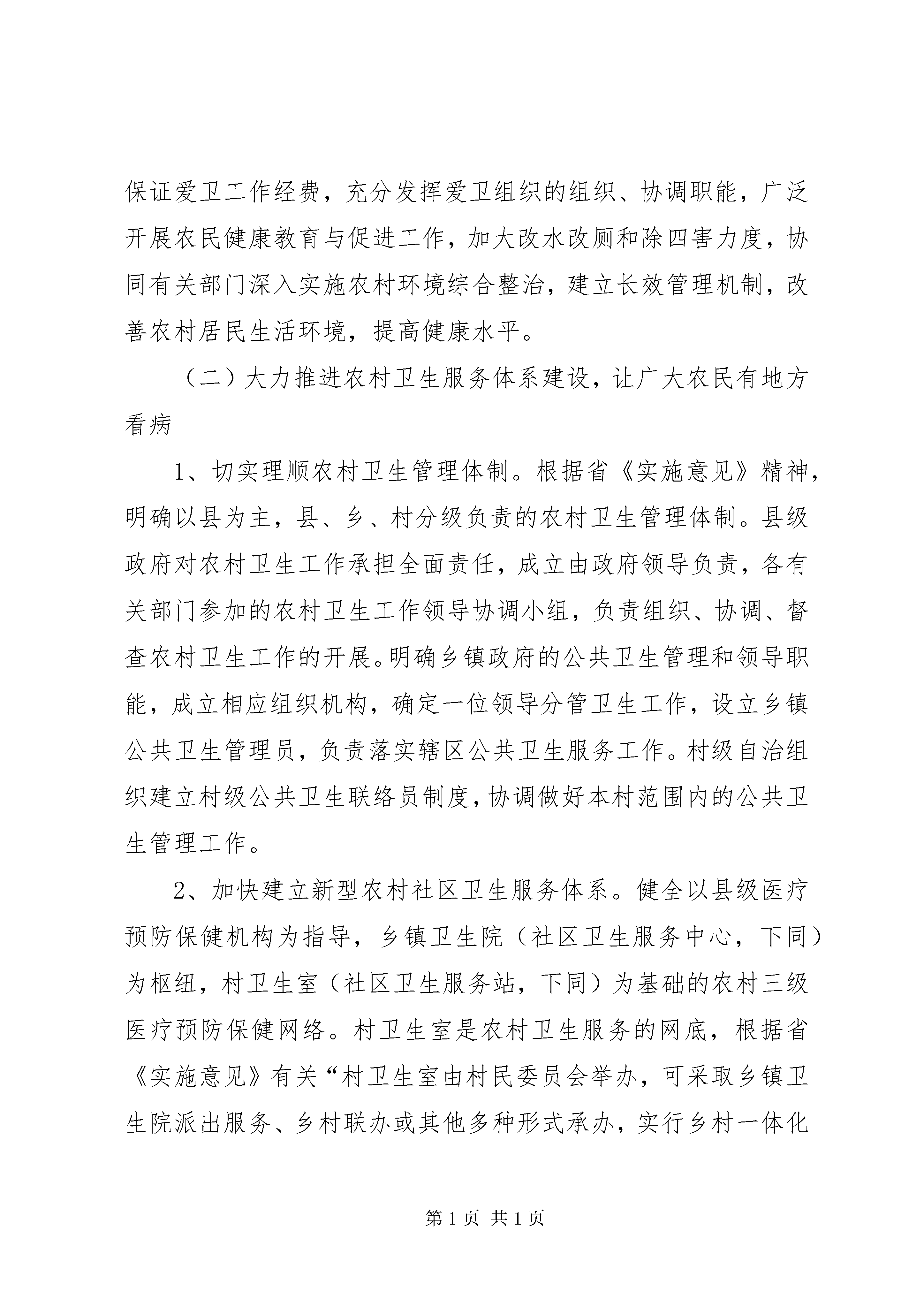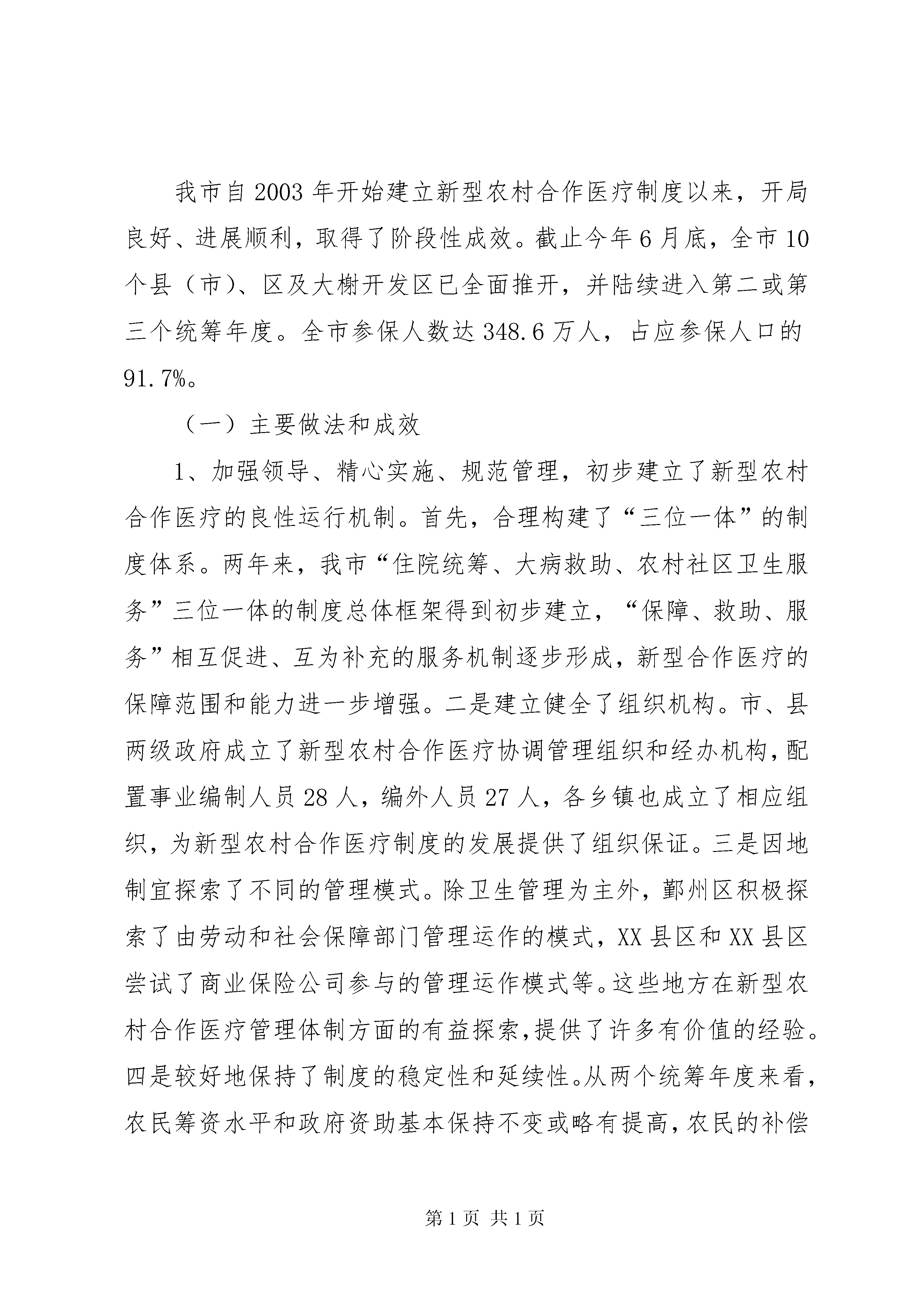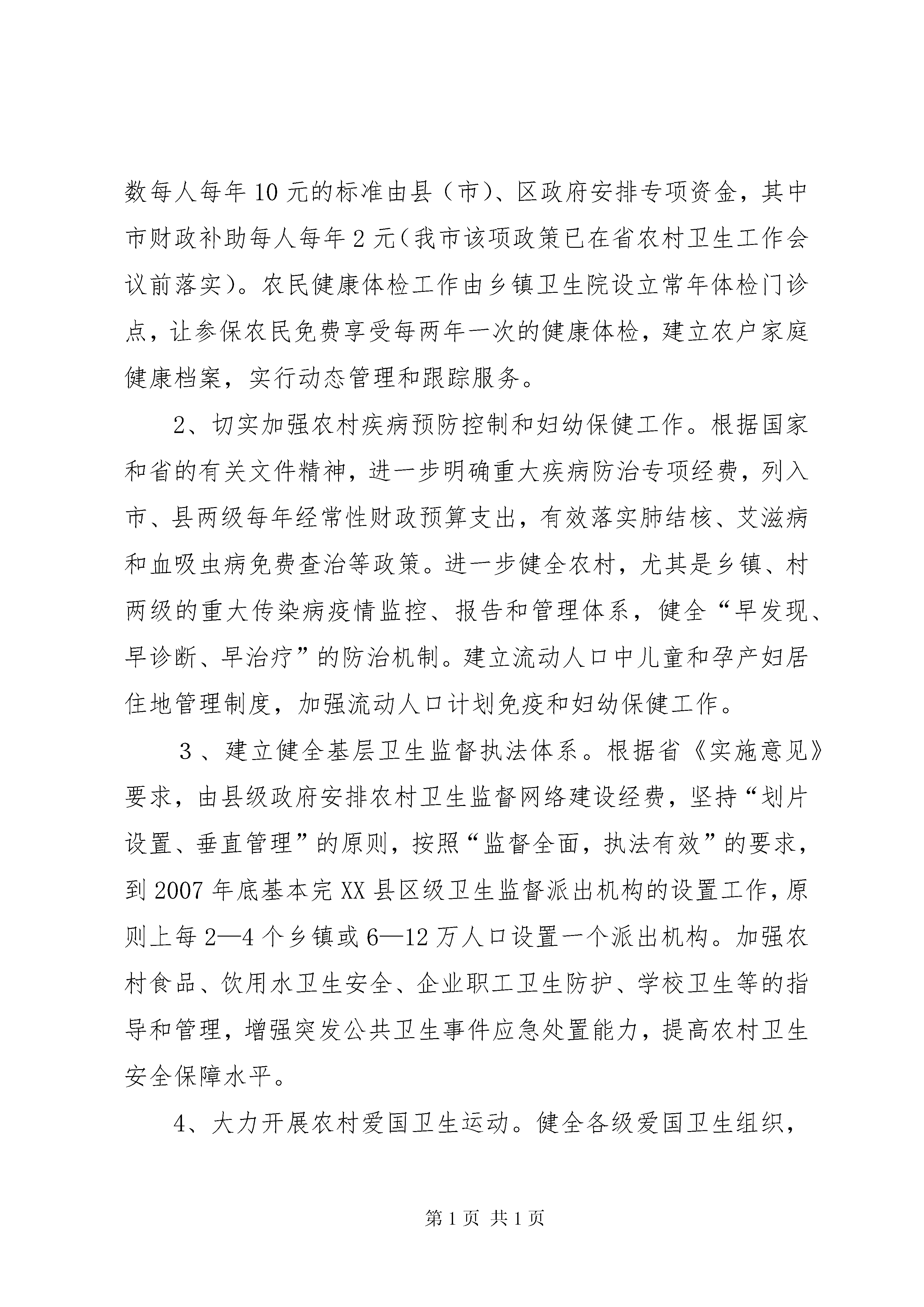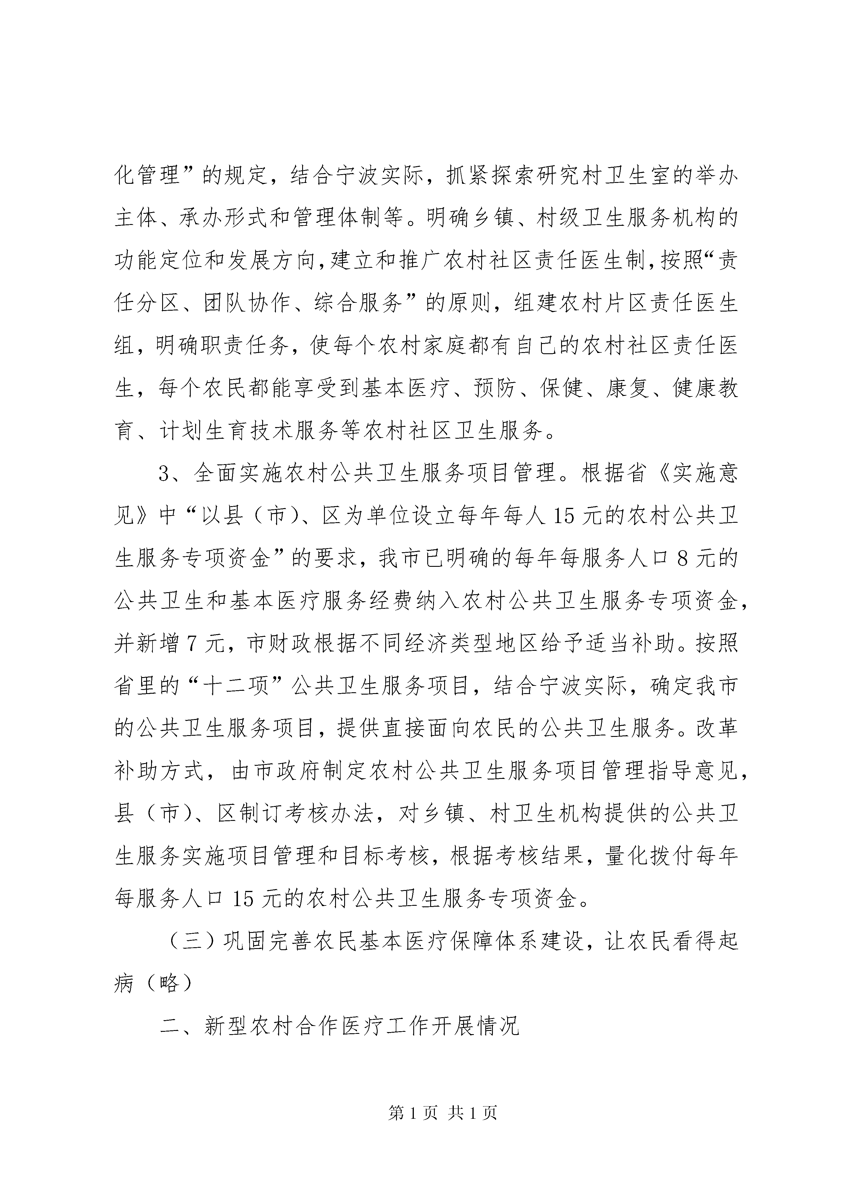 农村卫生工作汇报近年来,**市委、市政府高度重视农村卫生工作,根据中央和省委、省政府的部署,围绕加强农村卫生工作、建立新型农村合作医疗制度、发展农村社区卫生服务,先后制定出台了一系列政策性文件,并积极组织实施,极大地推动了我市农村卫生事业发展。现将全省农村卫生工作会议之后贯彻落实情况和新型农村合作医疗开展情况等汇报如下:一、贯彻落实全省农村卫生工作会议情况8月30日全省农村卫生工作会议以后,**市政府把贯彻这次会议精神,进一步加快发展我市农村卫生工作列入了近期的政府重要工作。根据省委、省政府会议的精神,按照让农民尽量少生病、有地方看病、看得起病的要求,对照我市的农村卫生工作现状,***副市长与卫生、发改和财政等有关部门进行了认真研究,形成了初步的贯彻实施意见,现正准备提交市政府常务会议研究审议,并拟研究制定《关于加快发展我市农村卫生工作的若干意见》。我们的主要措施有以下三方面:(一)全面加强农村公共卫生服务工作,让广大农民尽量少生病1、扎实做好农民健康体检工作。根据省政府《关于加强农村公共卫生工作的实施意见》(以下简称省《实施意见》)要求,建立农民健康体检专项资金,按参加新型农村合作医疗的农民人数每人每年10元的标准由县(市)、区政府安排专项资金,其中市财政补助每人每年2元(我市该项政策已在省农村卫生工作会议前落实)。农民健康体检工作由乡镇卫生院设立常年体检门诊点,让参保农民免费享受每两年一次的健康体检,建立农户家庭健康档案,实行动态管理和跟踪服务。2、切实加强农村疾病预防控制和妇幼保健工作。根据国家和省的有关文件精神,进一步明确重大疾病防治专项经费,列入市、县两级每年经常性财政预算支出,有效落实肺结核、艾滋病和血吸虫病免费查治等政策。进一步健全农村,尤其是乡镇、村两级的重大传染病疫情监控、报告和管理体系,健全“早发现、早诊断、早治疗”的防治机制。建立流动人口中儿童和孕产妇居住地管理制度,加强流动人口计划免疫和妇幼保健工作。3、建立健全基层卫生监督执法体系。根据省《实施意见》要求,由县级政府安排农村卫生监督网络建设经费,坚持“划片设置、垂直管理”的原则,按照“监督全面,执法有效”的要求,到2007年底基本完XX县区级卫生监督派出机构的设置工作,原则上每2—4个乡镇或6—12万人口设置一个派出机构。加强农村食品、饮用水卫生安全、企业职工卫生防护、学校卫生等的指导和管理,增强突发公共卫生事件应急处置能力,提高农村卫生安全保障水平。4、大力开展农村爱国卫生运动。健全各级爱国卫生组织,保证爱卫工作经费,充分发挥爱卫组织的组织、协调职能,广泛开展农民健康教育与促进工作,加大改水改厕和除四害力度,协同有关部门深入实施农村环境综合整治,建立长效管理机制,改善农村居民生活环境,提高健康水平。(二)大力推进农村卫生服务体系建设,让广大农民有地方看病1、切实理顺农村卫生管理体制。根据省《实施意见》精神,明确以县为主,县、乡、村分级负责的农村卫生管理体制。县级政府对农村卫生工作承担全面责任,成立由政府领导负责,各有关部门参加的农村卫生工作领导协调小组,负责组织、协调、督查农村卫生工作的开展。明确乡镇政府的公共卫生管理和领导职能,成立相应组织机构,确定一位领导分管卫生工作,设立乡镇公共卫生管理员,负责落实辖区公共卫生服务工作。村级自治组织建立村级公共卫生联络员制度,协调做好本村范围内的公共卫生管理工作。2、加快建立新型农村社区卫生服务体系。健全以县级医疗预防保健机构为指导,乡镇卫生院(社区卫生服务中心,下同)为枢纽,村卫生室(社区卫生服务站,下同)为基础的农村三级医疗预防保健网络。村卫生室是农村卫生服务的网底,根据省《实施意见》有关“村卫生室由村民委员会举办,可采取乡镇卫生院派出服务、乡村联办或其他多种形式承办,实行乡村一体化化管理”的规定,结合宁波实际,抓紧探索研究村卫生室的举办主体、承办形式和管理体制等。明确乡镇、村级卫生服务机构的功能定位和发展方向,建立和推广农村社区责任医生制,按照“责任分区、团队协作、综合服务”的原则,组建农村片区责任医生组,明确职责任务,使每个农村家庭都有自己的农村社区责任医生,每个农民都能享受到基本医疗、预防、保健、康复、健康教育、计划生育技术服务等农村社区卫生服务。3、全面实施农村公共卫生服务项目管理。根据省《实施意见》中“以县(市)、区为单位设立每年每人15元的农村公共卫生服务专项资金”的要求,我市已明确的每年每服务人口8元的公共卫生和基本医疗服务经费纳入农村公共卫生服务专项资金,并新增7元,市财政根据不同经济类型地区给予适当补助。按照省里的“十二项”公共卫生服务项目,结合宁波实际,确定我市的公共卫生服务项目,提供直接面向农民的公共卫生服务。改革补助方式,由市政府制定农村公共卫生服务项目管理
