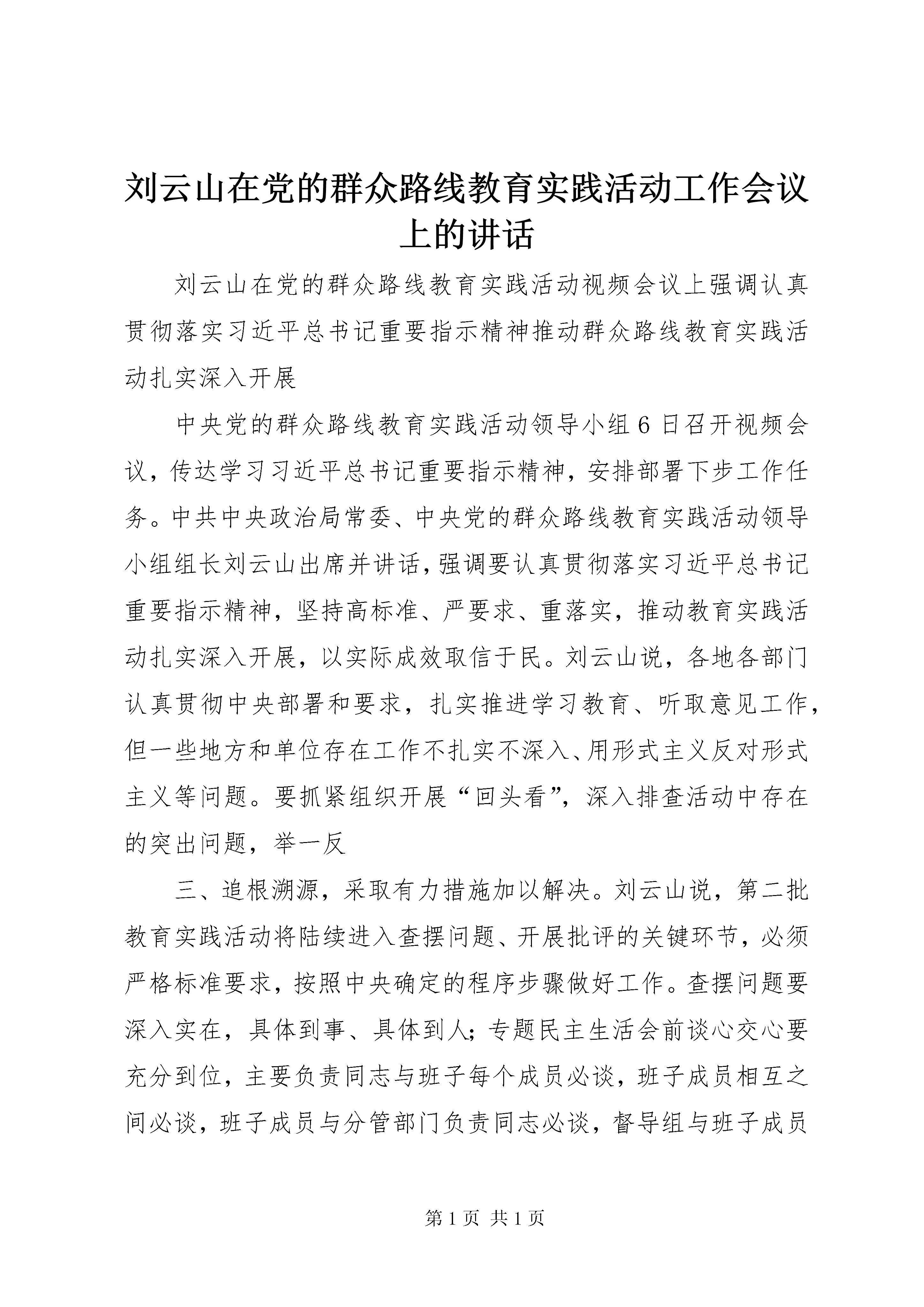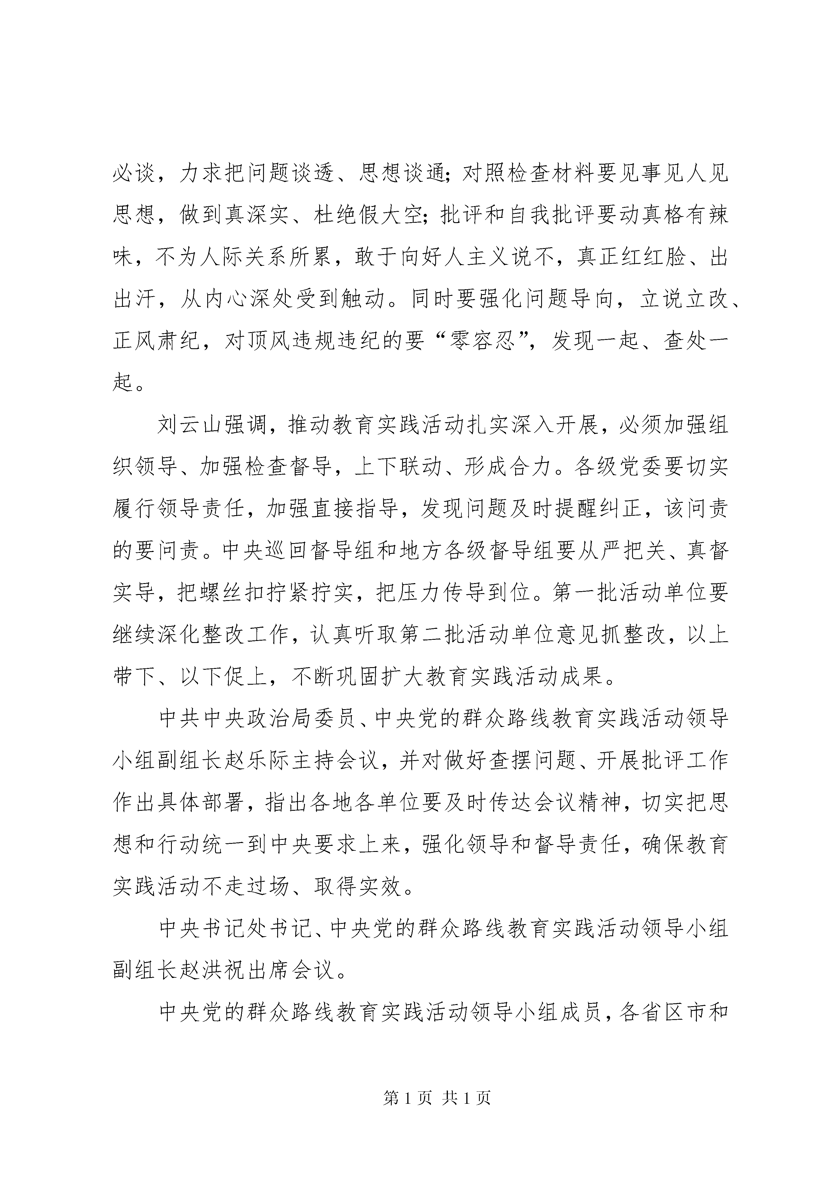 刘云山在党的群众路线教育实践活动工作会议上的讲话刘云山在党的群众路线教育实践活动视频会议上强调认真贯彻落实习近平总书记重要指示精神推动群众路线教育实践活动扎实深入开展中央党的群众路线教育实践活动领导小组6日召开视频会议,传达学习习近平总书记重要指示精神,安排部署下步工作任务。中共中央政治局常委、中央党的群众路线教育实践活动领导小组组长刘云山出席并讲话,强调要认真贯彻落实习近平总书记重要指示精神,坚持高标准、严要求、重落实,推动教育实践活动扎实深入开展,以实际成效取信于民。刘云山说,各地各部门认真贯彻中央部署和要求,扎实推进学习教育、听取意见工作,但一些地方和单位存在工作不扎实不深入、用形式主义反对形式主义等问题。要抓紧组织开展“回头看”,深入排查活动中存在的突出问题,举一反三、追根溯源,采取有力措施加以解决。刘云山说,第二批教育实践活动将陆续进入查摆问题、开展批评的关键环节,必须严格标准要求,按照中央确定的程序步骤做好工作。查摆问题要深入实在,具体到事、具体到人;专题民主生活会前谈心交心要充分到位,主要负责同志与班子每个成员必谈,班子成员相互之间必谈,班子成员与分管部门负责同志必谈,督导组与班子成员必谈,力求把问题谈透、思想谈通;对照检查材料要见事见人见思想,做到真深实、杜绝假大空;批评和自我批评要动真格有辣味,不为人际关系所累,敢于向好人主义说不,真正红红脸、出出汗,从内心深处受到触动。同时要强化问题导向,立说立改、正风肃纪,对顶风违规违纪的要“零容忍”,发现一起、查处一起。刘云山强调,推动教育实践活动扎实深入开展,必须加强组织领导、加强检查督导,上下联动、形成合力。各级党委要切实履行领导责任,加强直接指导,发现问题及时提醒纠正,该问责的要问责。中央巡回督导组和地方各级督导组要从严把关、真督实导,把螺丝扣拧紧拧实,把压力传导到位。第一批活动单位要继续深化整改工作,认真听取第二批活动单位意见抓整改,以上带下、以下促上,不断巩固扩大教育实践活动成果。中共中央政治局委员、中央党的群众路线教育实践活动领导小组副组长赵乐际主持会议,并对做好查摆问题、开展批评工作作出具体部署,指出各地各单位要及时传达会议精神,切实把思想和行动统一到中央要求上来,强化领导和督导责任,确保教育实践活动不走过场、取得实效。中央书记处书记、中央党的群众路线教育实践活动领导小组副组长赵洪祝出席会议。中央党的群众路线教育实践活动领导小组成员,各省区市和副省级城市、新疆生产建设兵团,中央和国家机关、人民团体、中管金融企业、中管企业、中管高校教育实践活动领导小组负责同志在北京主会场参加会议。各省区市教育实践活动领导小组成员及办公室负责同志、各市县党政领导班子成员、中央巡回督导组成员等参加各分会场会议。