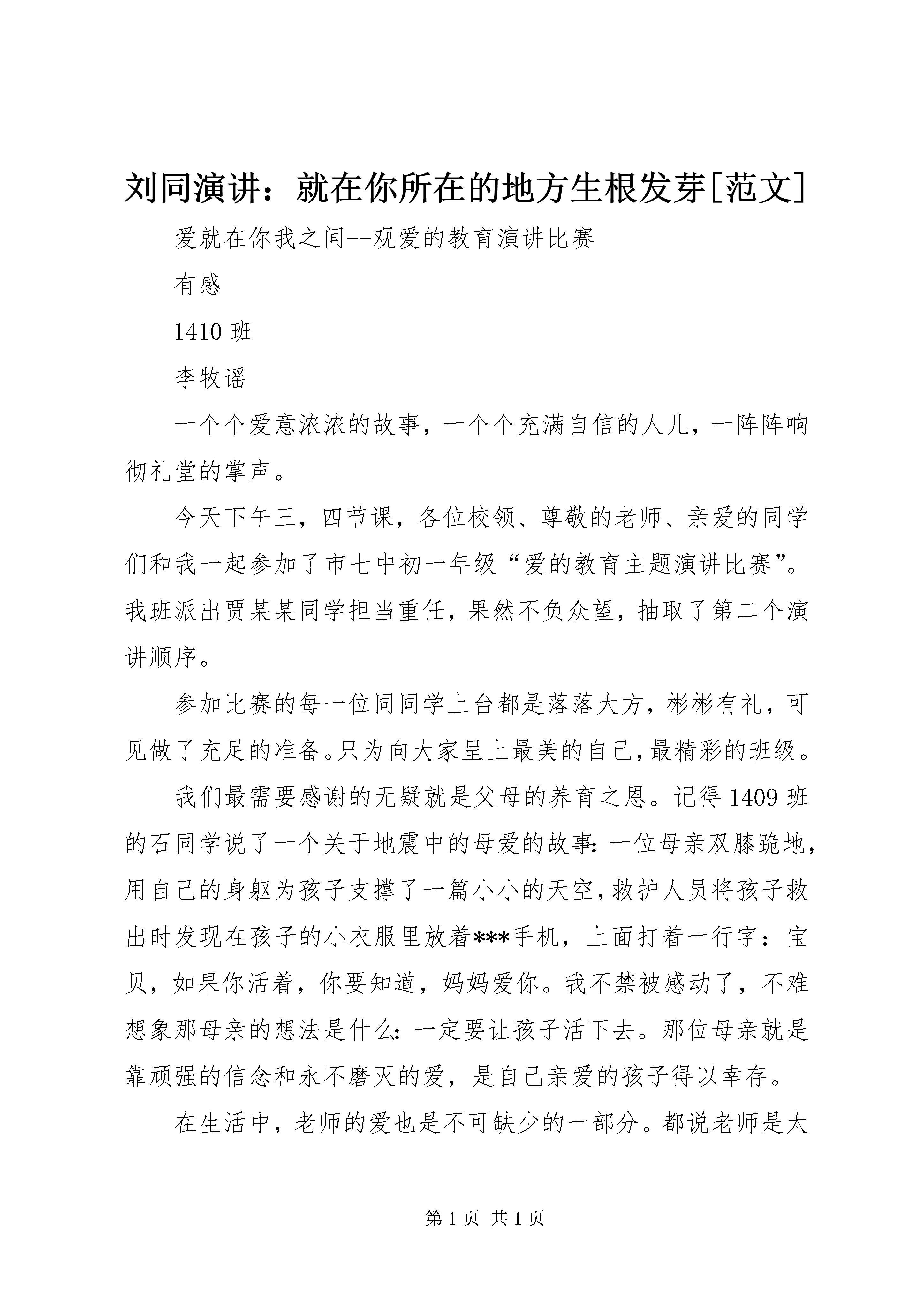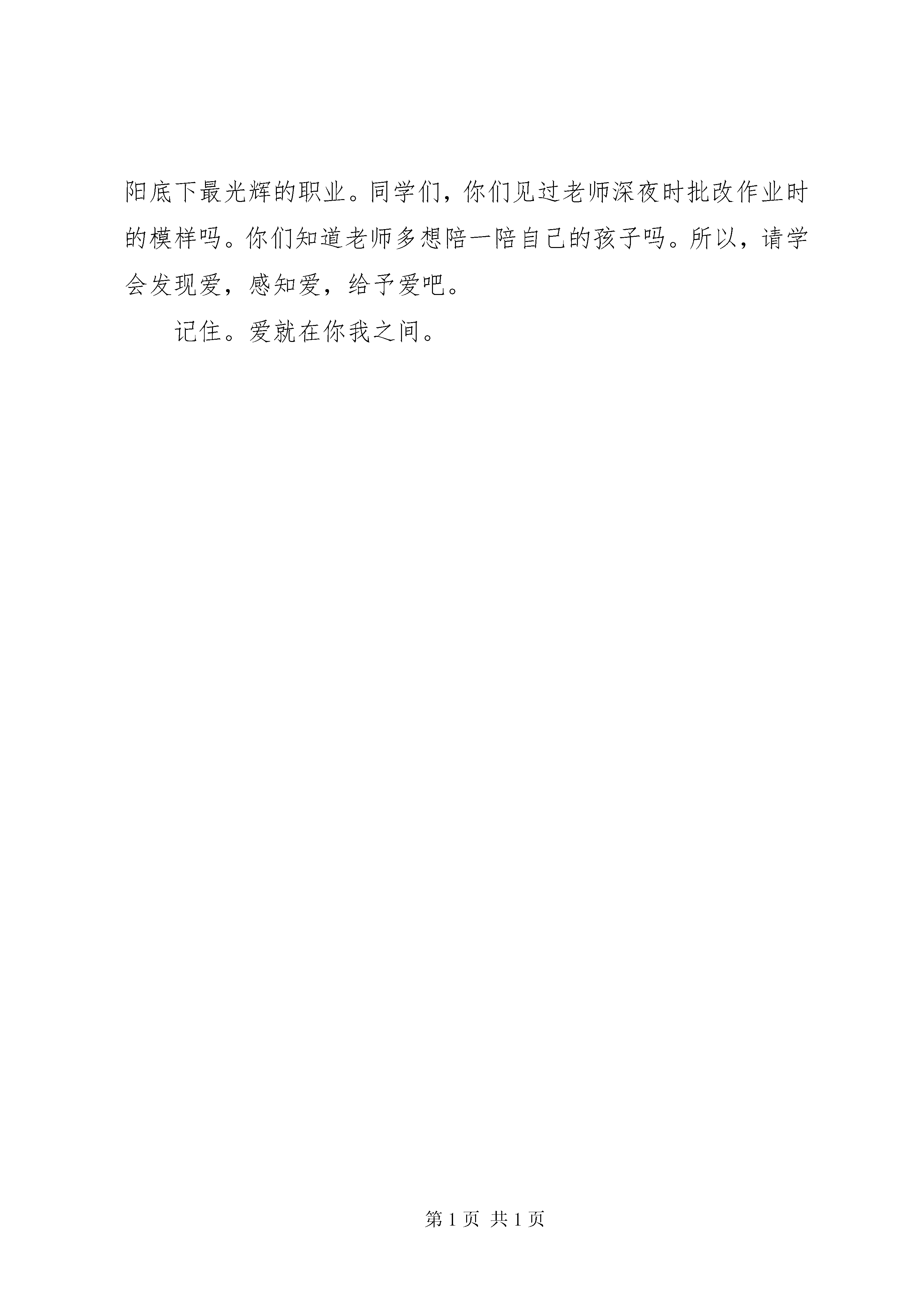 刘同演讲:就在你所在的地方生根发芽[范文]爱就在你我之间--观爱的教育演讲比赛有感1410班李牧谣一个个爱意浓浓的故事,一个个充满自信的人儿,一阵阵响彻礼堂的掌声。今天下午三,四节课,各位校领、尊敬的老师、亲爱的同学们和我一起参加了市七中初一年级“爱的教育主题演讲比赛”。我班派出贾某某同学担当重任,果然不负众望,抽取了第二个演讲顺序。参加比赛的每一位同同学上台都是落落大方,彬彬有礼,可见做了充足的准备。只为向大家呈上最美的自己,最精彩的班级。我们最需要感谢的无疑就是父母的养育之恩。记得1409班的石同学说了一个关于地震中的母爱的故事:一位母亲双膝跪地,用自己的身躯为孩子支撑了一篇小小的天空,救护人员将孩子救出时发现在孩子的小衣服里放着***手机,上面打着一行字:宝贝,如果你活着,你要知道,妈妈爱你。我不禁被感动了,不难想象那母亲的想法是什么:一定要让孩子活下去。那位母亲就是靠顽强的信念和永不磨灭的爱,是自己亲爱的孩子得以幸存。在生活中,老师的爱也是不可缺少的一部分。都说老师是太阳底下最光辉的职业。同学们,你们见过老师深夜时批改作业时的模样吗。你们知道老师多想陪一陪自己的孩子吗。所以,请学会发现爱,感知爱,给予爱吧。记住。爱就在你我之间。