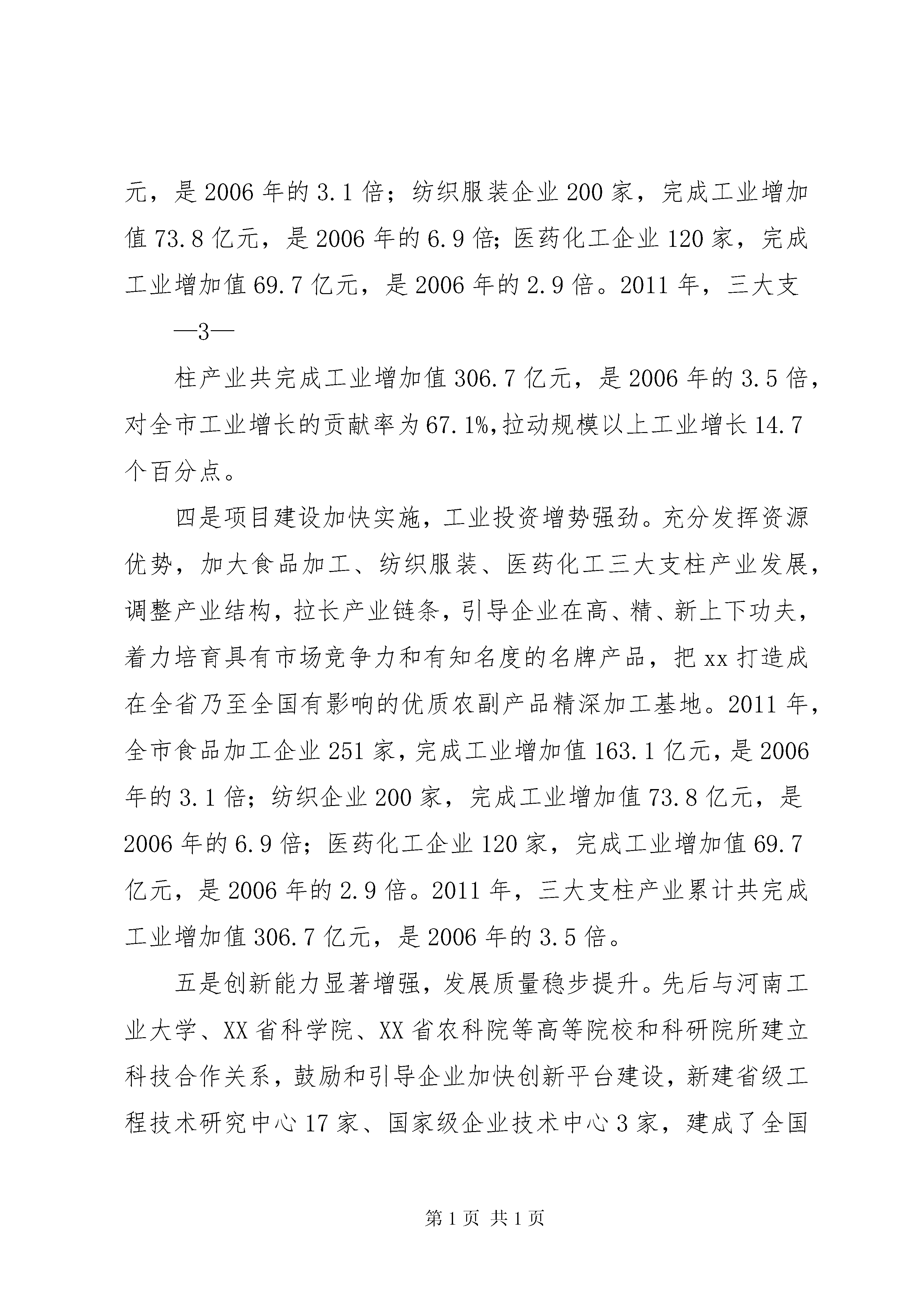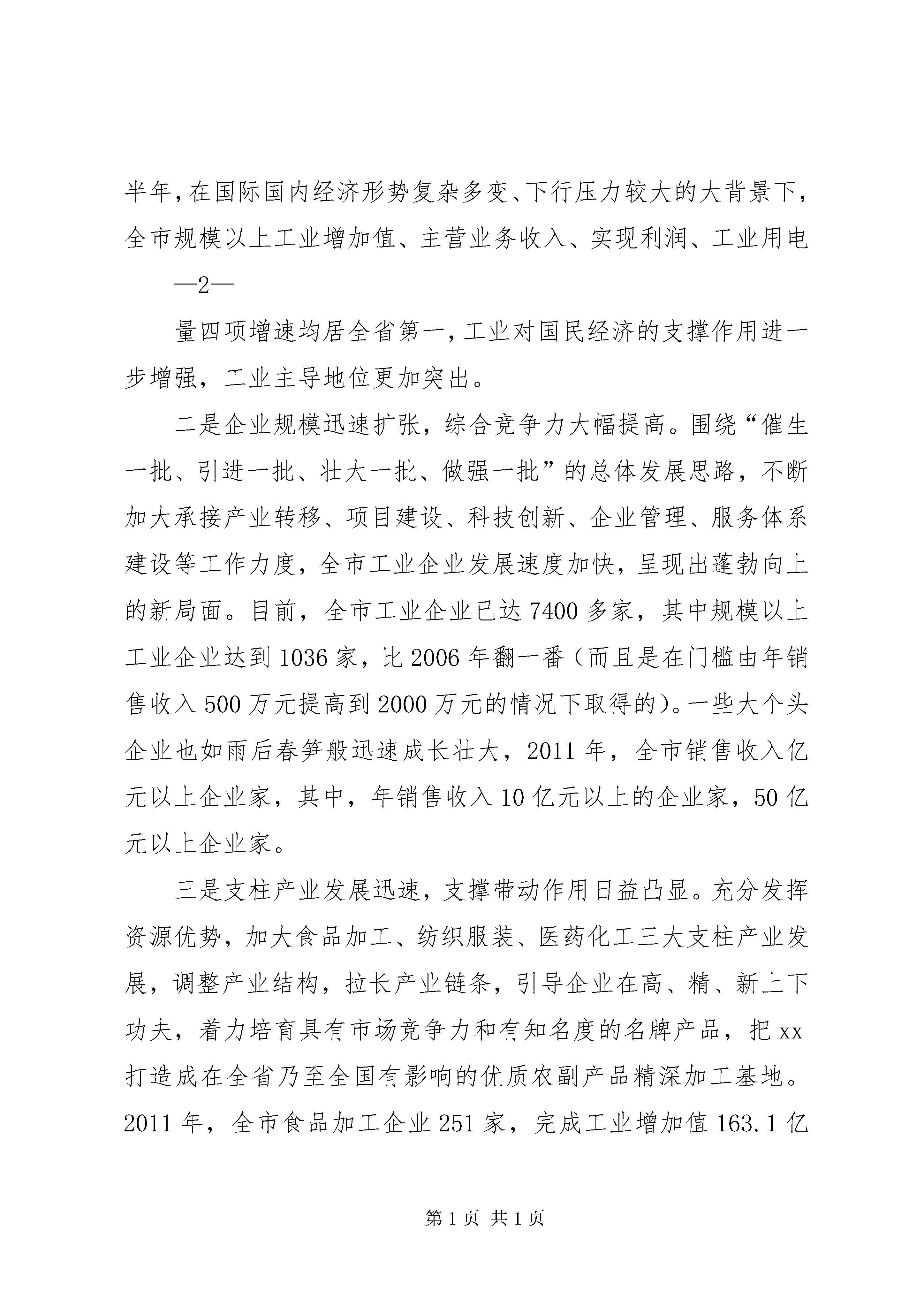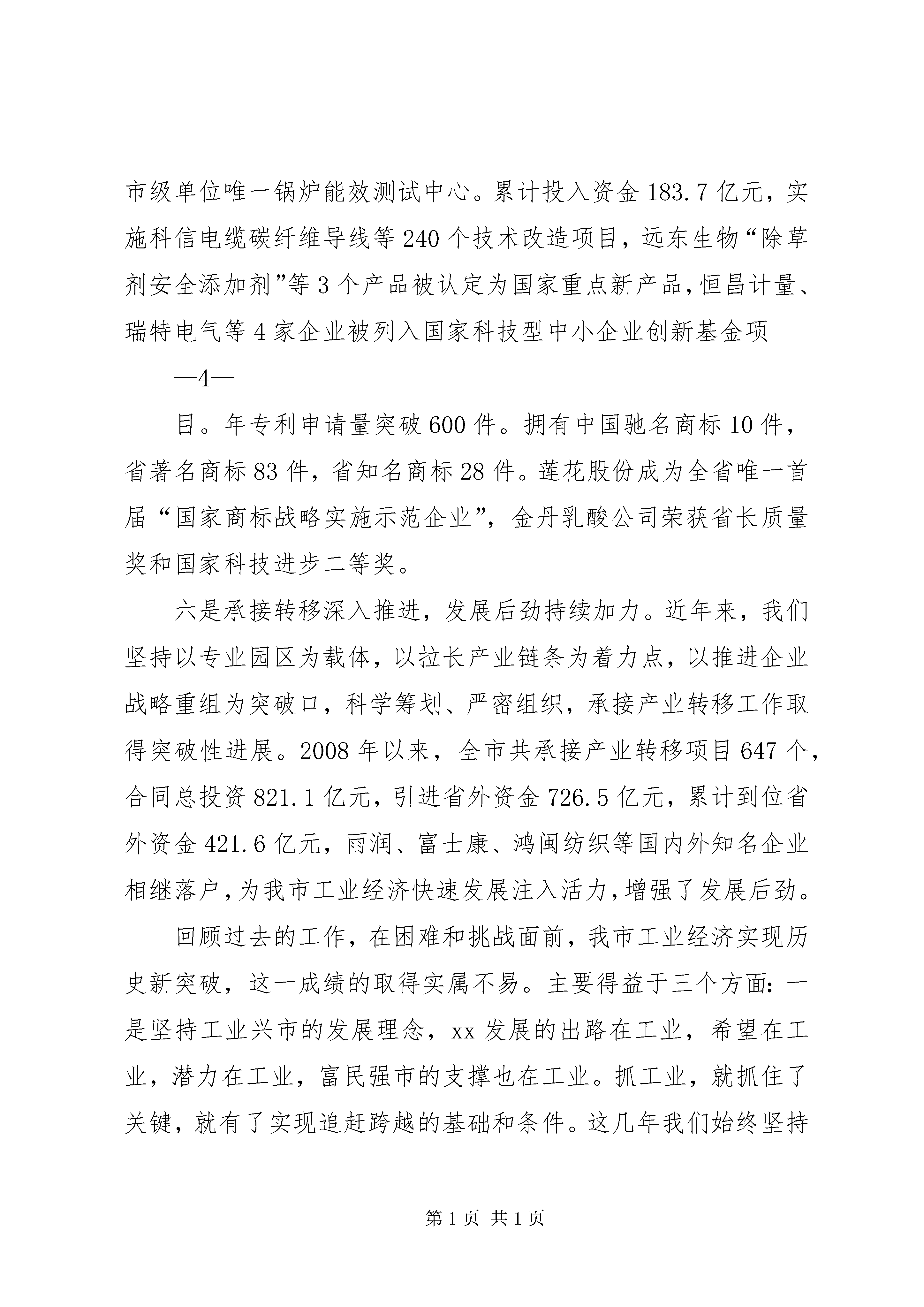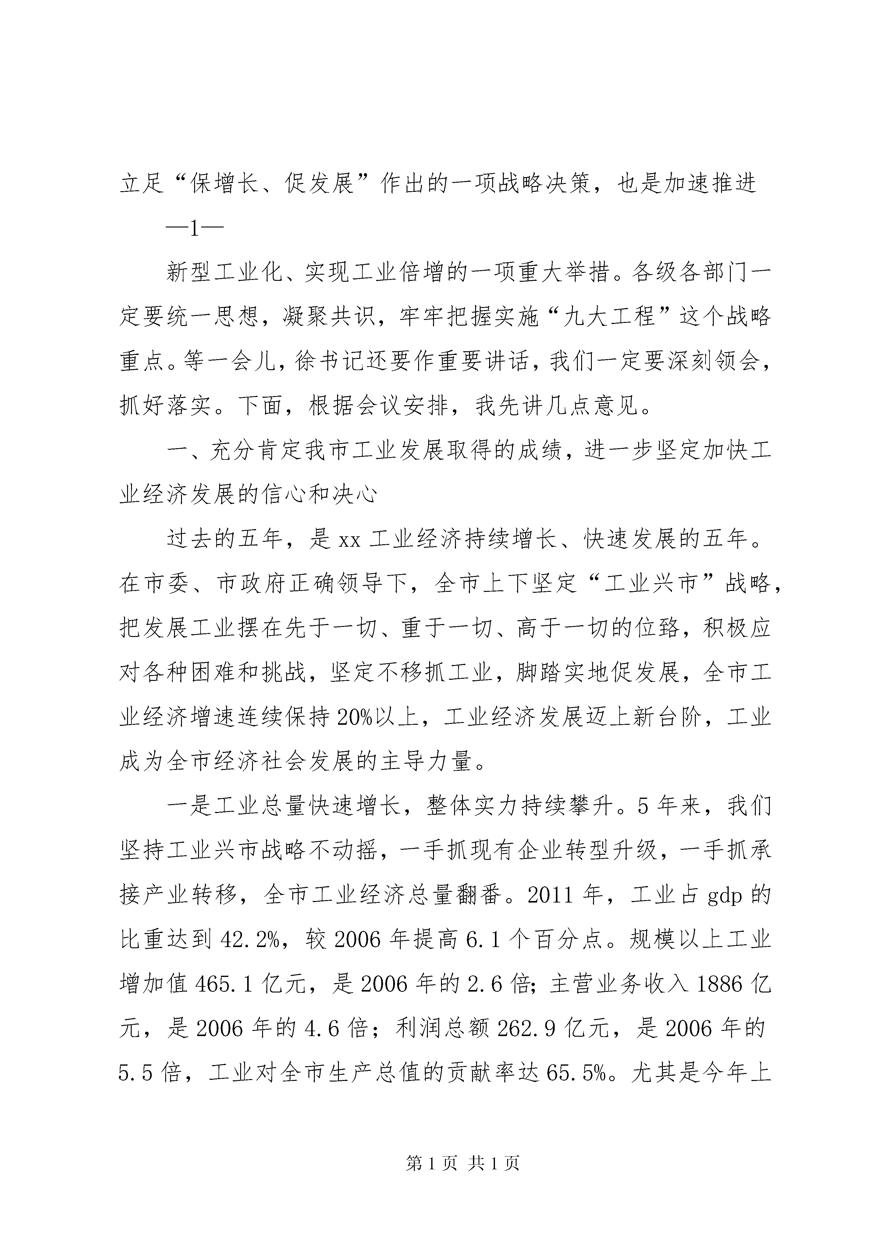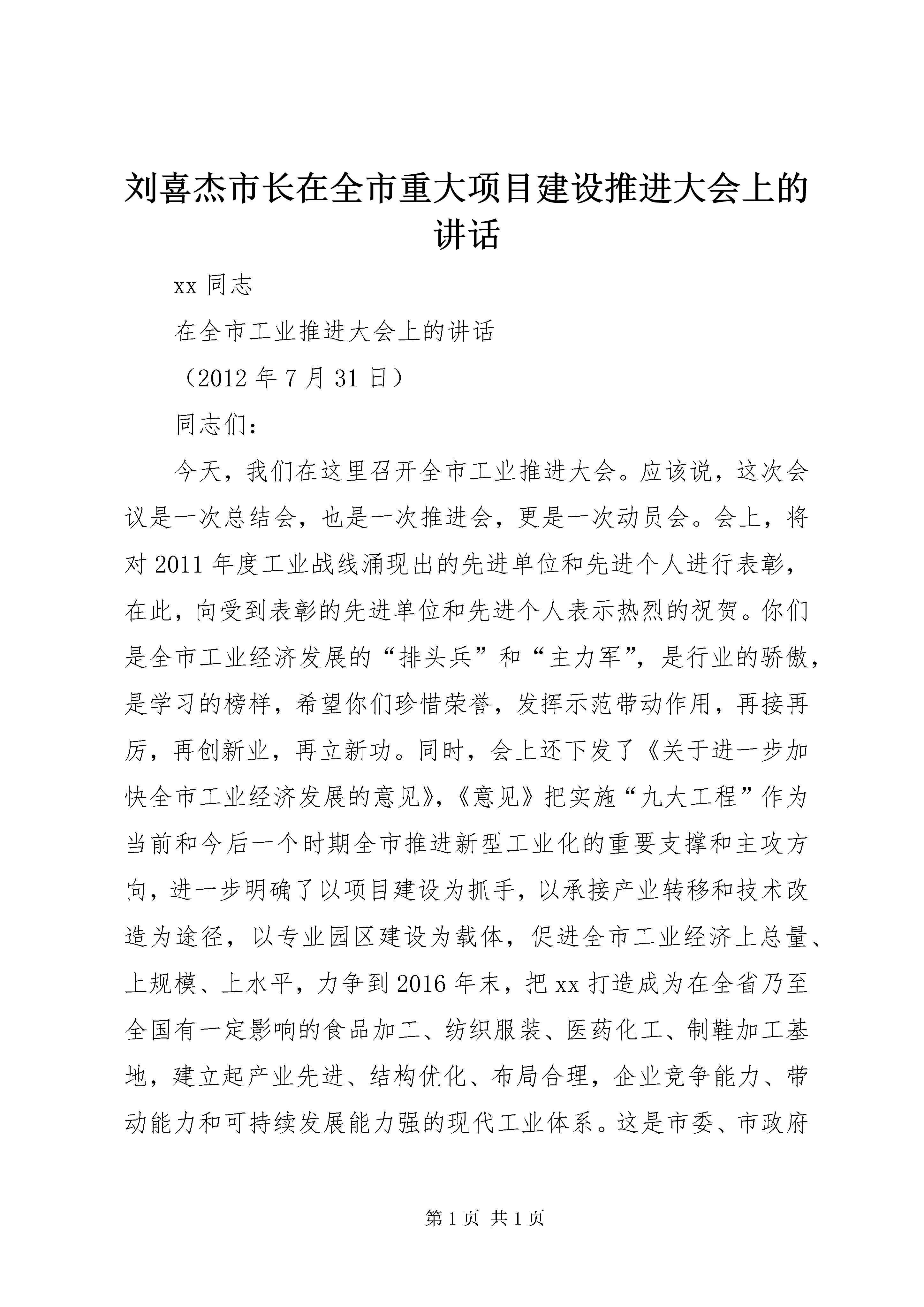 刘喜杰市长在全市重大项目建设推进大会上的讲话xx同志在全市工业推进大会上的讲话(2012年7月31日)同志们:今天,我们在这里召开全市工业推进大会。应该说,这次会议是一次总结会,也是一次推进会,更是一次动员会。会上,将对2011年度工业战线涌现出的先进单位和先进个人进行表彰,在此,向受到表彰的先进单位和先进个人表示热烈的祝贺。你们是全市工业经济发展的“排头兵”和“主力军”,是行业的骄傲,是学习的榜样,希望你们珍惜荣誉,发挥示范带动作用,再接再厉,再创新业,再立新功。同时,会上还下发了《关于进一步加快全市工业经济发展的意见》,《意见》把实施“九大工程”作为当前和今后一个时期全市推进新型工业化的重要支撑和主攻方向,进一步明确了以项目建设为抓手,以承接产业转移和技术改造为途径,以专业园区建设为载体,促进全市工业经济上总量、上规模、上水平,力争到2016年末,把xx打造成为在全省乃至全国有一定影响的食品加工、纺织服装、医药化工、制鞋加工基地,建立起产业先进、结构优化、布局合理,企业竞争能力、带动能力和可持续发展能力强的现代工业体系。这是市委、市政府立足“保增长、促发展”作出的一项战略决策,也是加速推进—1—新型工业化、实现工业倍增的一项重大举措。各级各部门一定要统一思想,凝聚共识,牢牢把握实施“九大工程”这个战略重点。等一会儿,徐书记还要作重要讲话,我们一定要深刻领会,抓好落实。下面,根据会议安排,我先讲几点意见。一、充分肯定我市工业发展取得的成绩,进一步坚定加快工业经济发展的信心和决心过去的五年,是xx工业经济持续增长、快速发展的五年。在市委、市政府正确领导下,全市上下坚定“工业兴市”战略,把发展工业摆在先于一切、重于一切、高于一切的位臵,积极应对各种困难和挑战,坚定不移抓工业,脚踏实地促发展,全市工业经济增速连续保持20%以上,工业经济发展迈上新台阶,工业成为全市经济社会发展的主导力量。一是工业总量快速增长,整体实力持续攀升。5年来,我们坚持工业兴市战略不动摇,一手抓现有企业转型升级,一手抓承接产业转移,全市工业经济总量翻番。2011年,工业占gdp的比重达到42.2%,较2006年提高6.1个百分点。规模以上工业增加值465.1亿元,是2006年的2.6倍;主营业务收入1886亿元,是2006年的4.6倍;利润总额262.9亿元,是2006年的5.5倍,工业对全市生产总值的贡献率达65.5%。尤其是今年上半年,在国际国内经济形势复杂多变、下行压力较大的大背景下,全市规模以上工业增加值、主营业务收入、实现利润、工业用电—2—量四项增速均居全省第一,工业对国民经济的支撑作用进一步增强,工业主导地位更加突出。二是企业规模迅速扩张,综合竞争力大幅提高。围绕“催生一批、引进一批、壮大一批、做强一批”的总体发展思路,不断加大承接产业转移、项目建设、科技创新、企业管理、服务体系建设等工作力度,全市工业企业发展速度加快,呈现出蓬勃向上的新局面。目前,全市工业企业已达7400多家,其中规模以上工业企业达到1036家,比2006年翻一番(而且是在门槛由年销售收入500万元提高到2000万元的情况下取得的)。一些大个头企业也如雨后春笋般迅速成长壮大,2011年,全市销售收入亿元以上企业家,其中,年销售收入10亿元以上的企业家,50亿元以上企业家。三是支柱产业发展迅速,支撑带动作用日益凸显。充分发挥资源优势,加大食品加工、纺织服装、医药化工三大支柱产业发展,调整产业结构,拉长产业链条,引导企业在高、精、新上下功夫,着力培育具有市场竞争力和有知名度的名牌产品,把xx打造成在全省乃至全国有影响的优质农副产品精深加工基地。2011年,全市食品加工企业251家,完成工业增加值163.1亿元,是2006年的3.1倍;纺织服装企业200家,完成工业增加值73.8亿元,是2006年的6.9倍;医药化工企业120家,完成工业增加值69.7亿元,是2006年的2.9倍。2011年,三大支—3—柱产业共完成工业增加值306.7亿元,是2006年的3.5倍,对全市工业增长的贡献率为67.1%,拉动规模以上工业增长14.7个百分点。四是项目建设加快实施,工业投资增势强劲。充分发挥资源优势,加大食品加工、纺织服装、医药化工三大支柱产业发展,调整产业结构,拉长产业链条,引导企业在高、精、新上下功夫,着力培育具有市场竞争力和有知名度的名牌产品,把xx打造成在全省乃至全国有影响的优质农副产品精深加工基地。2011年,全市食品加工企业251家,完成工业增加值163.1亿元,是2006年的3.1倍;纺织企业200家,完成工业增加值73.8亿元,是2006年的6.9倍;医药化工企业120家,完成工业增加值69.7亿元,是2006年的2.9倍。2011年,三大支柱产