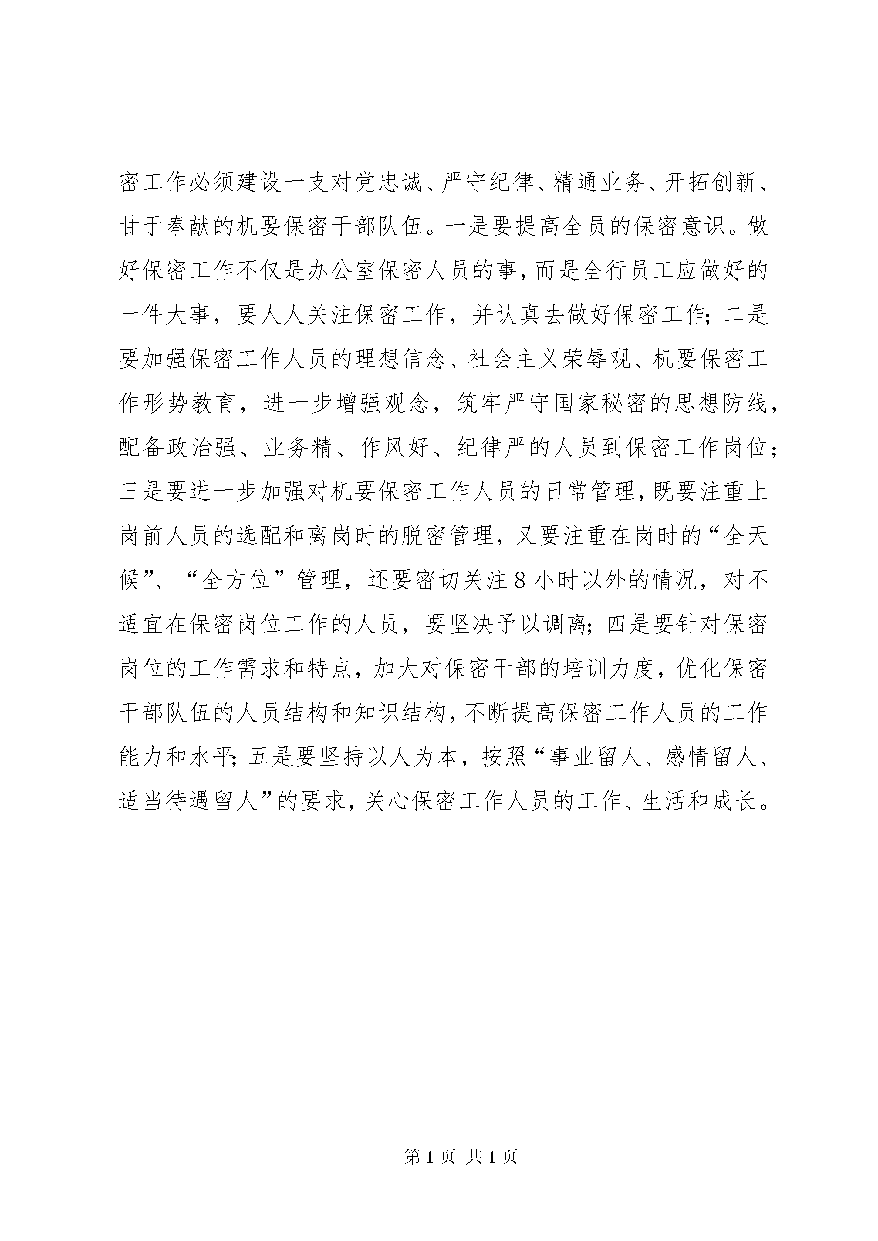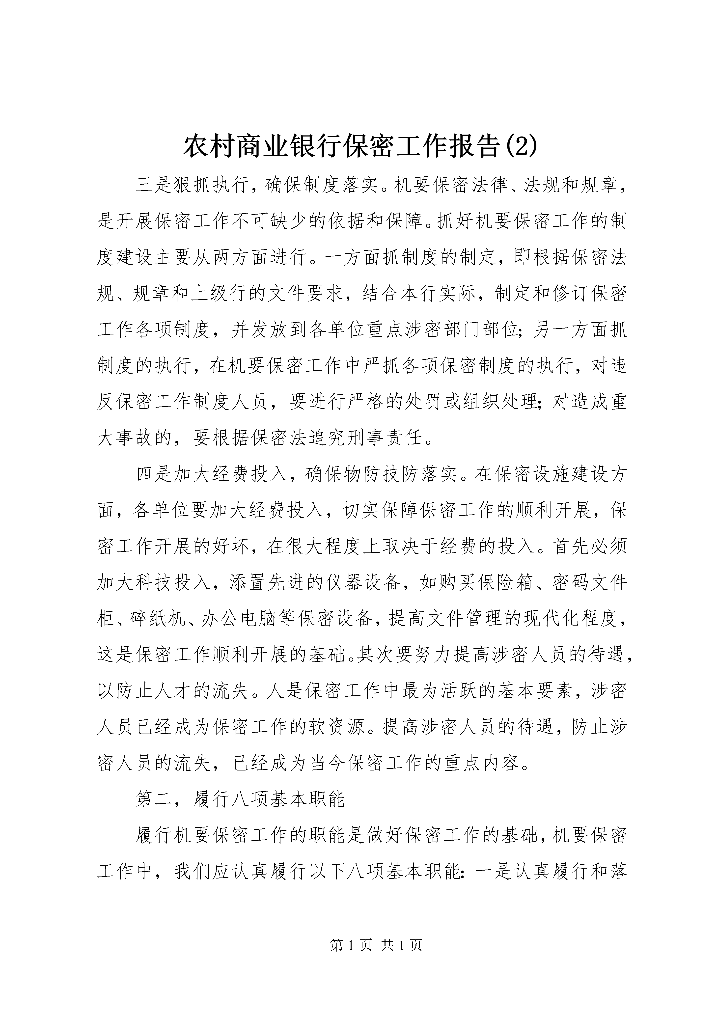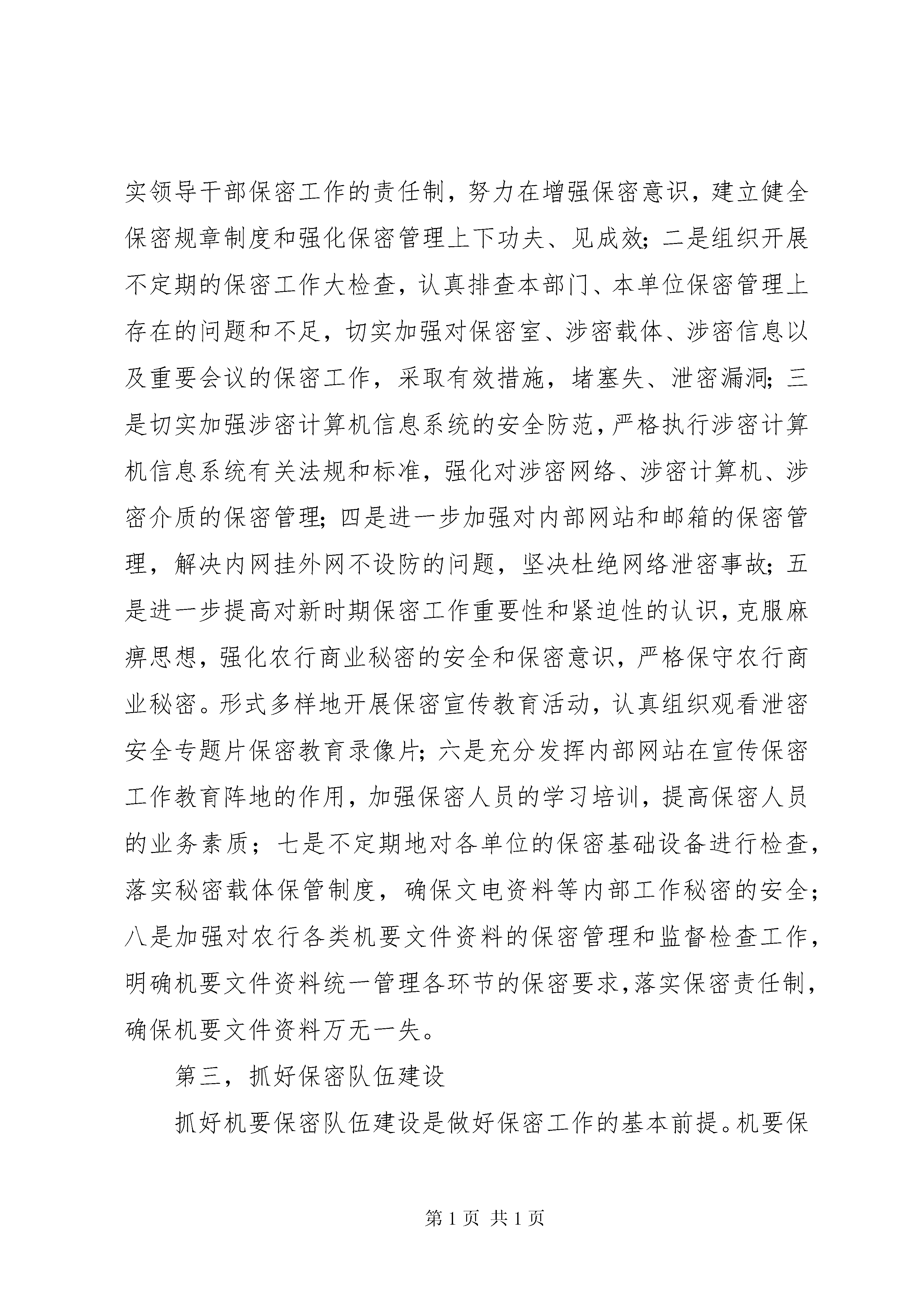农村商业银行保密工作报告(2)三是狠抓执行,确保制度落实。机要保密法律、法规和规章,是开展保密工作不可缺少的依据和保障。抓好机要保密工作的制度建设主要从两方面进行。一方面抓制度的制定,即根据保密法规、规章和上级行的文件要求,结合本行实际,制定和修订保密工作各项制度,并发放到各单位重点涉密部门部位;另一方面抓制度的执行,在机要保密工作中严抓各项保密制度的执行,对违反保密工作制度人员,要进行严格的处罚或组织处理;对造成重大事故的,要根据保密法追究刑事责任。四是加大经费投入,确保物防技防落实。在保密设施建设方面,各单位要加大经费投入,切实保障保密工作的顺利开展,保密工作开展的好坏,在很大程度上取决于经费的投入。首先必须加大科技投入,添置先进的仪器设备,如购买保险箱、密码文件柜、碎纸机、办公电脑等保密设备,提高文件管理的现代化程度,这是保密工作顺利开展的基础。其次要努力提高涉密人员的待遇,以防止人才的流失。人是保密工作中最为活跃的基本要素,涉密人员已经成为保密工作的软资源。提高涉密人员的待遇,防止涉密人员的流失,已经成为当今保密工作的重点内容。第二,履行八项基本职能履行机要保密工作的职能是做好保密工作的基础,机要保密工作中,我们应认真履行以下八项基本职能:一是认真履行和落实领导干部保密工作的责任制,努力在增强保密意识,建立健全保密规章制度和强化保密管理上下功夫、见成效;二是组织开展不定期的保密工作大检查,认真排查本部门、本单位保密管理上存在的问题和不足,切实加强对保密室、涉密载体、涉密信息以及重要会议的保密工作,采取有效措施,堵塞失、泄密漏洞;三是切实加强涉密计算机信息系统的安全防范,严格执行涉密计算机信息系统有关法规和标准,强化对涉密网络、涉密计算机、涉密介质的保密管理;四是进一步加强对内部网站和邮箱的保密管理,解决内网挂外网不设防的问题,坚决杜绝网络泄密事故;五是进一步提高对新时期保密工作重要性和紧迫性的认识,克服麻痹思想,强化农行商业秘密的安全和保密意识,严格保守农行商业秘密。形式多样地开展保密宣传教育活动,认真组织观看泄密安全专题片保密教育录像片;六是充分发挥内部网站在宣传保密工作教育阵地的作用,加强保密人员的学习培训,提高保密人员的业务素质;七是不定期地对各单位的保密基础设备进行检查,落实秘密载体保管制度,确保文电资料等内部工作秘密的安全;八是加强对农行各类机要文件资料的保密管理和监督检查工作,明确机要文件资料统一管理各环节的保密要求,落实保密责任制,确保机要文件资料万无一失。第三,抓好保密队伍建设抓好机要保密队伍建设是做好保密工作的基本前提。机要保密工作必须建设一支对党忠诚、严守纪律、精通业务、开拓创新、甘于奉献的机要保密干部队伍。一是要提高全员的保密意识。做好保密工作不仅是办公室保密人员的事,而是全行员工应做好的一件大事,要人人关注保密工作,并认真去做好保密工作;二是要加强保密工作人员的理想信念、社会主义荣辱观、机要保密工作形势教育,进一步增强观念,筑牢严守国家秘密的思想防线,配备政治强、业务精、作风好、纪律严的人员到保密工作岗位;三是要进一步加强对机要保密工作人员的日常管理,既要注重上岗前人员的选配和离岗时的脱密管理,又要注重在岗时的“全天候”、“全方位”管理,还要密切关注8小时以外的情况,对不适宜在保密岗位工作的人员,要坚决予以调离;四是要针对保密岗位的工作需求和特点,加大对保密干部的培训力度,优化保密干部队伍的人员结构和知识结构,不断提高保密工作人员的工作能力和水平;五是要坚持以人为本,按照“事业留人、感情留人、适当待遇留人”的要求,关心保密工作人员的工作、生活和成长。
