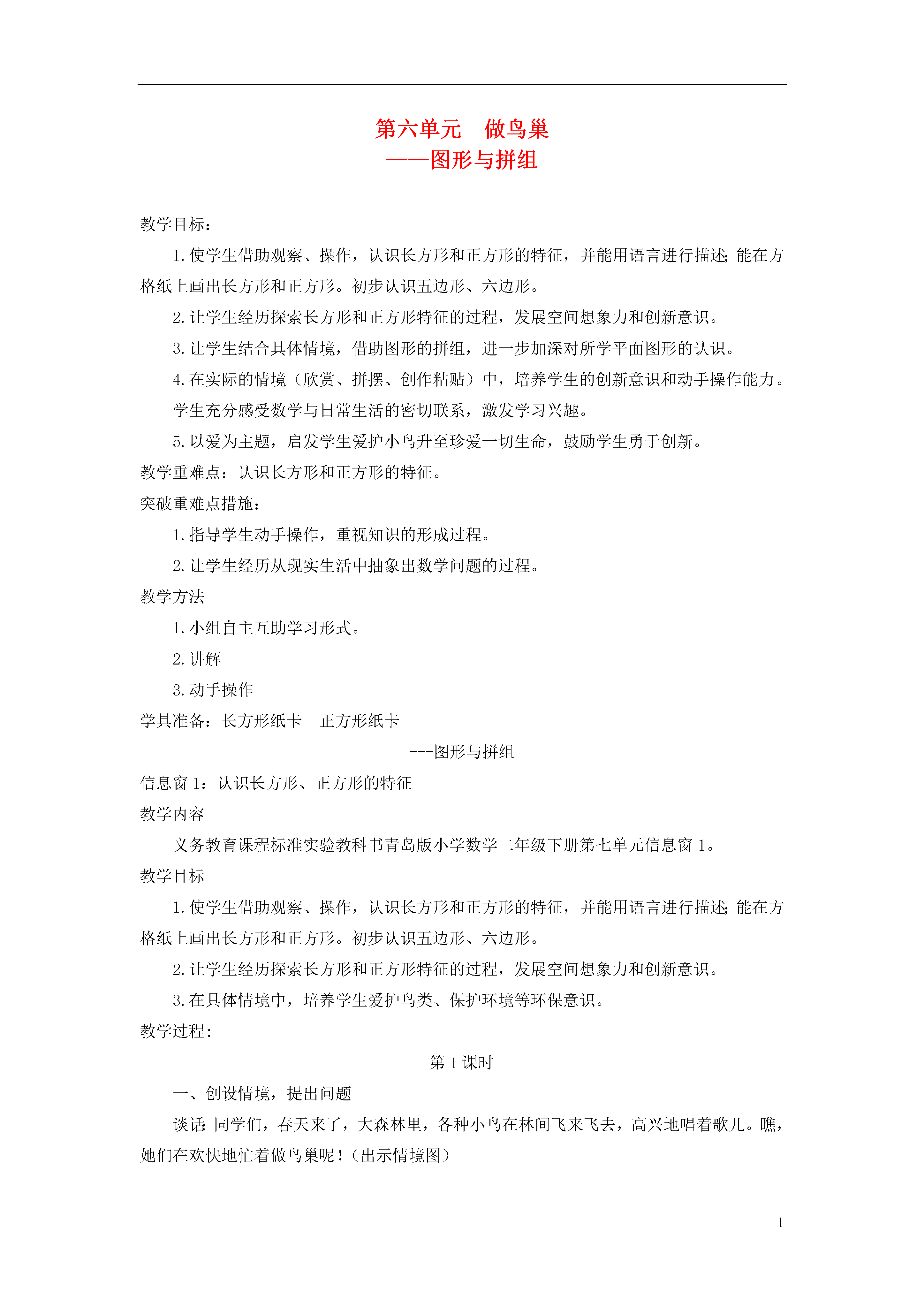 1第六单元做鸟巢——图形与拼组教学目标:1.使学生借助观察、操作,认识长方形和正方形的特征,并能用语言进行描述;能在方格纸上画出长方形和正方形。初步认识五边形、六边形。2.让学生经历探索长方形和正方形特征的过程,发展空间想象力和创新意识。3.让学生结合具体情境,借助图形的拼组,进一步加深对所学平面图形的认识。4.在实际的情境(欣赏、拼摆、创作粘贴)中,培养学生的创新意识和动手操作能力。学生充分感受数学与日常生活的密切联系,激发学习兴趣。5.以爱为主题,启发学生爱护小鸟升至珍爱一切生命,鼓励学生勇于创新。教学重难点:认识长方形和正方形的特征。突破重难点措施:1.指导学生动手操作,重视知识的形成过程。2.让学生经历从现实生活中抽象出数学问题的过程。教学方法1.小组自主互助学习形式。2.讲解3.动手操作学具准备:长方形纸卡正方形纸卡---图形与拼组信息窗1:认识长方形、正方形的特征教学内容义务教育课程标准实验教科书青岛版小学数学二年级下册第七单元信息窗1。教学目标1.使学生借助观察、操作,认识长方形和正方形的特征,并能用语言进行描述;能在方格纸上画出长方形和正方形。初步认识五边形、六边形。2.让学生经历探索长方形和正方形特征的过程,发展空间想象力和创新意识。3.在具体情境中,培养学生爱护鸟类、保护环境等环保意识。教学过程:第1课时一、创设情境,提出问题谈话:同学们,春天来了,大森林里,各种小鸟在林间飞来飞去,高兴地唱着歌儿。瞧,她们在欢快地忙着做鸟巢呢!(出示情境图)谈话:你知道每个鸟巢是什么形状的吗?我们把这个长方体的面画下来,(板书)你知道它叫什么图形吗?关于长方形你都知道了什么?你还想知道什么?(引导学生提出关于长方形、正方形特征的问题)二、自主探索,解决问题1.解决第一个红点问题,认识长方形、正方形的特征。(1)认识长方形的特征。(2)观察猜测。谈话:仔细观察长方形的边和角,你有什么新的发现?(根据学生的交流,引导认识“对边”并适时板书特征)(3)操作验证。谈话:你能想法验证长方形的对边相等,四个角都是直角吗?①学生独立操作。②班内交流,展示方法,认识长方形边的特征③小结特征,认识长、宽。谈话:经过同学们自己猜测、验证,你发现长方形有什么特征?长方形的长边叫“长”,短边叫“宽”。(4)找生活中的长方形。谈话:生活中,哪些物体的面是长方形的?(学生找一找、指一指、说一说。)