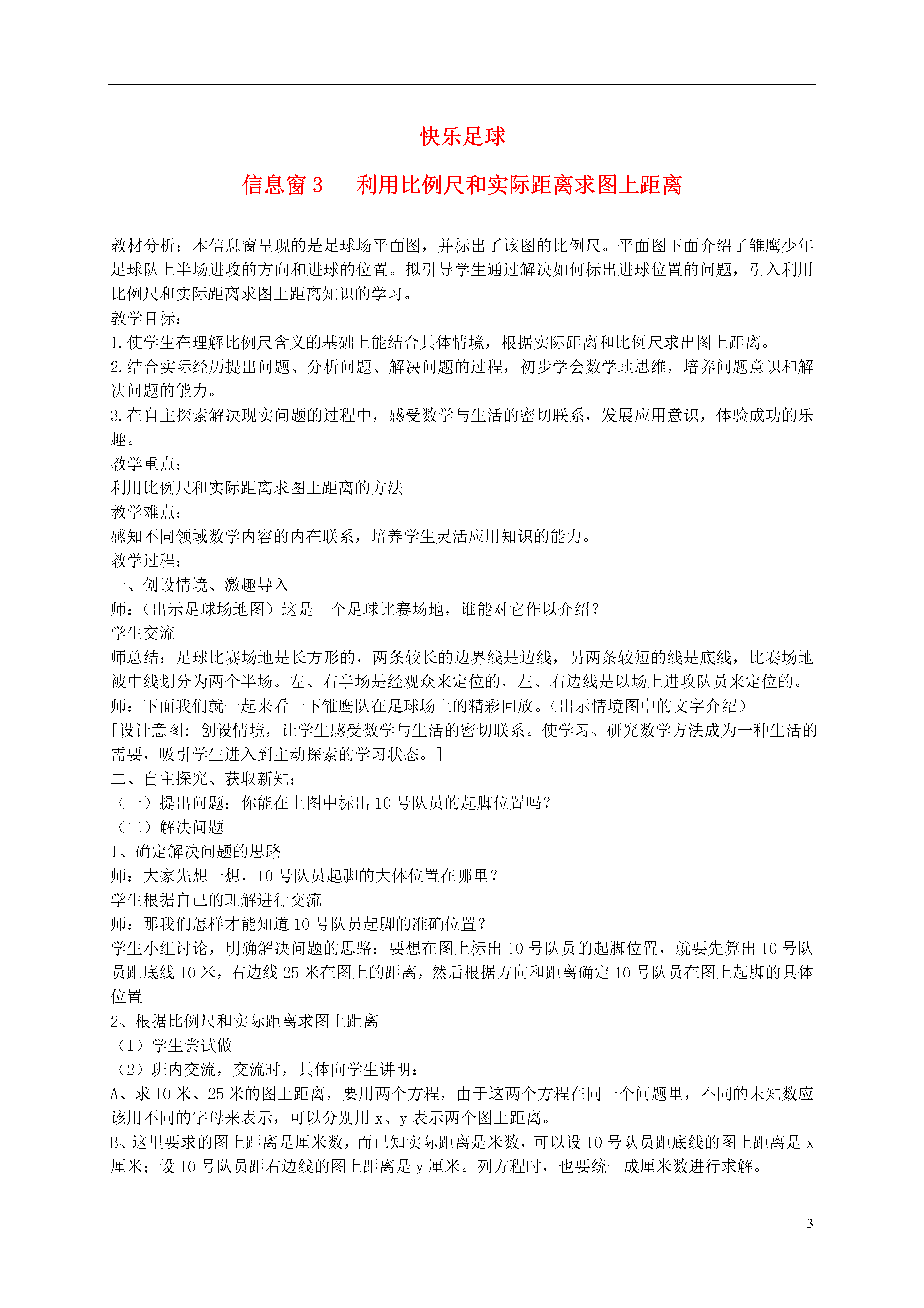 3快乐足球信息窗3利用比例尺和实际距离求图上距离教材分析:本信息窗呈现的是足球场平面图,并标出了该图的比例尺。平面图下面介绍了雏鹰少年足球队上半场进攻的方向和进球的位置。拟引导学生通过解决如何标出进球位置的问题,引入利用比例尺和实际距离求图上距离知识的学习。教学目标:1.使学生在理解比例尺含义的基础上能结合具体情境,根据实际距离和比例尺求出图上距离。2.结合实际经历提出问题、分析问题、解决问题的过程,初步学会数学地思维,培养问题意识和解决问题的能力。3.在自主探索解决现实问题的过程中,感受数学与生活的密切联系,发展应用意识,体验成功的乐趣。教学重点:利用比例尺和实际距离求图上距离的方法教学难点:感知不同领域数学内容的内在联系,培养学生灵活应用知识的能力。教学过程:一、创设情境、激趣导入师:(出示足球场地图)这是一个足球比赛场地,谁能对它作以介绍?学生交流师总结:足球比赛场地是长方形的,两条较长的边界线是边线,另两条较短的线是底线,比赛场地被中线划分为两个半场。左、右半场是经观众来定位的,左、右边线是以场上进攻队员来定位的。师:下面我们就一起来看一下雏鹰队在足球场上的精彩回放。(出示情境图中的文字介绍)[设计意图:创设情境,让学生感受数学与生活的密切联系。使学习、研究数学方法成为一种生活的需要,吸引学生进入到主动探索的学习状态。]二、自主探究、获取新知:(一)提出问题:你能在上图中标出10号队员的起脚位置吗?(二)解决问题1、确定解决问题的思路师:大家先想一想,10号队员起脚的大体位置在哪里?学生根据自己的理解进行交流师:那我们怎样才能知道10号队员起脚的准确位置?学生小组讨论,明确解决问题的思路:要想在图上标出10号队员的起脚位置,就要先算出10号队员距底线10米,右边线25米在图上的距离,然后根据方向和距离确定10号队员在图上起脚的具体位置2、根据比例尺和实际距离求图上距离(1)学生尝试做(2)班内交流,交流时,具体向学生讲明:A、求10米、25米的图上距离,要用两个方程,由于这两个方程在同一个问题里,不同的未知数应该用不同的字母来表示,可以分别用x、y表示两个图上距离。B、这里要求的图上距离是厘米数,而已知实际距离是米数,可以设10号队员距底线的图上距离是x厘米;设10号队员距右边线的图上距离是y厘米。列方程时,也要统一成厘米数进行求解。(3)学生根据交流情况,自行改正、完善3、根据方向和距离在图上标出起脚的位置自行标出——班内交流结合用数对表示位置的知识标注位置后介绍理由。(三)学生交流:如何根据实际距离和比例尺求出图上距离?(可以用方程解答,也可以用实际距离×比例尺=图上距离)[设计意图:尊重学生的思维特性,激励学生用多种思维方法解答,并在方法运用上不做统一要求,但目标是一致的——让学生学会读图、用图、制图,并让学生共享思维的成果,培养学生思维角度的多样化,促进学生创造性思维的发展。]三、灵活应用、解决问题1、学生自行计算并在图上标出4号队员的起脚位置。2、自主练习第1题(1)组内交流思路(2)自行解答(教师注意了解学生对长度单位的处理情况)(3)班内交流(4)自行改正四、小结:学生谈收获课后反思:本节课的教学把生活中的鲜活题材引入到数学课堂上,激起学生探寻真知的强烈欲望,在知识的建构过程中,引导学生在解决问题的过程中,一步步地体验到解决问题的方法策略,注意到要圆满解决问题所需考虑到的细节问题,真正参与到解决问题的全过程,给学生提供一个展示激情、智慧与个性的大舞台,让他们在教学活动中获得多方面发展,形成良好的学习数学的能力。。第二课时一、串联情境唤醒旧知。谈话引入,回顾利用比例尺和实际距离求图上距离的方法二、综合运用解决问题1、自主练习第二题第一问:引导学生先量出图上距离,再根据比例尺求出实际距离。第二问:引导学生先把线段比例尺改写成数值比例尺,然后根据实际距离求出图上距离,再根据方向和距离确定位置。思考:还有其他方法吗?第三问:先让学生独立完成,再组织学生交流解题方法。2、自主练习第三题先引导学生回忆,图上距离:实际距离=比例尺的关系式,然后放手让学生完成。3、自主练习第四题讨论:怎样求出实际面积交流解题思路后总结方法,先测出图上卧室的长和宽,再根据比例尺求出实际的长和宽,然后求出实际面积[设计意图:]引导学生通过练习进一步理解比例尺的意义,巩固所学知识,并能灵活应用所学知识解决生活中的实际问题。三、拓展训练灵活运用1、补充题:在比例尺是1/25000的地图上量得甲乙两地之间的距离是26厘米,如果把它改画在比例尺为1:2000000的地图上,甲乙两地的图上距