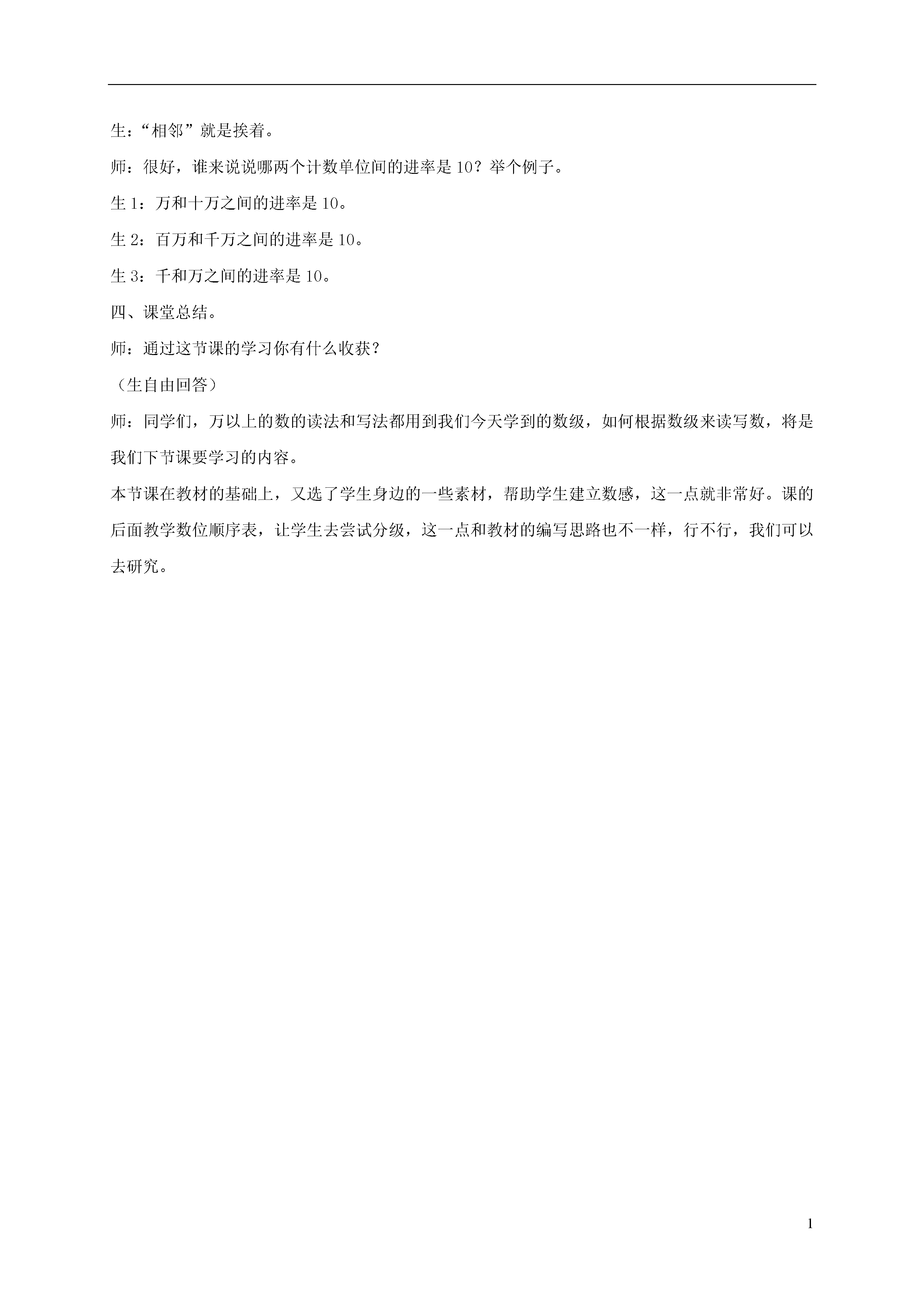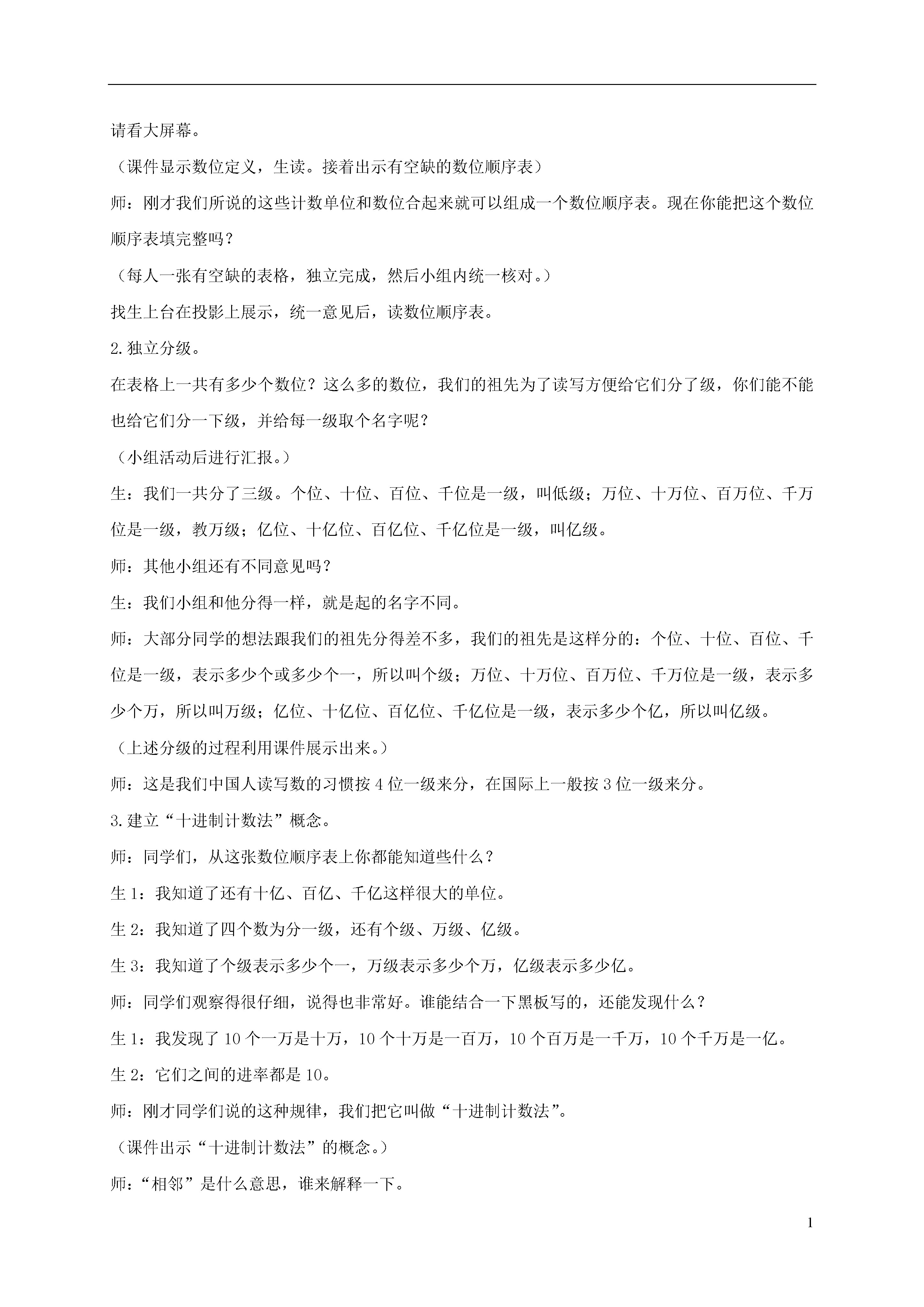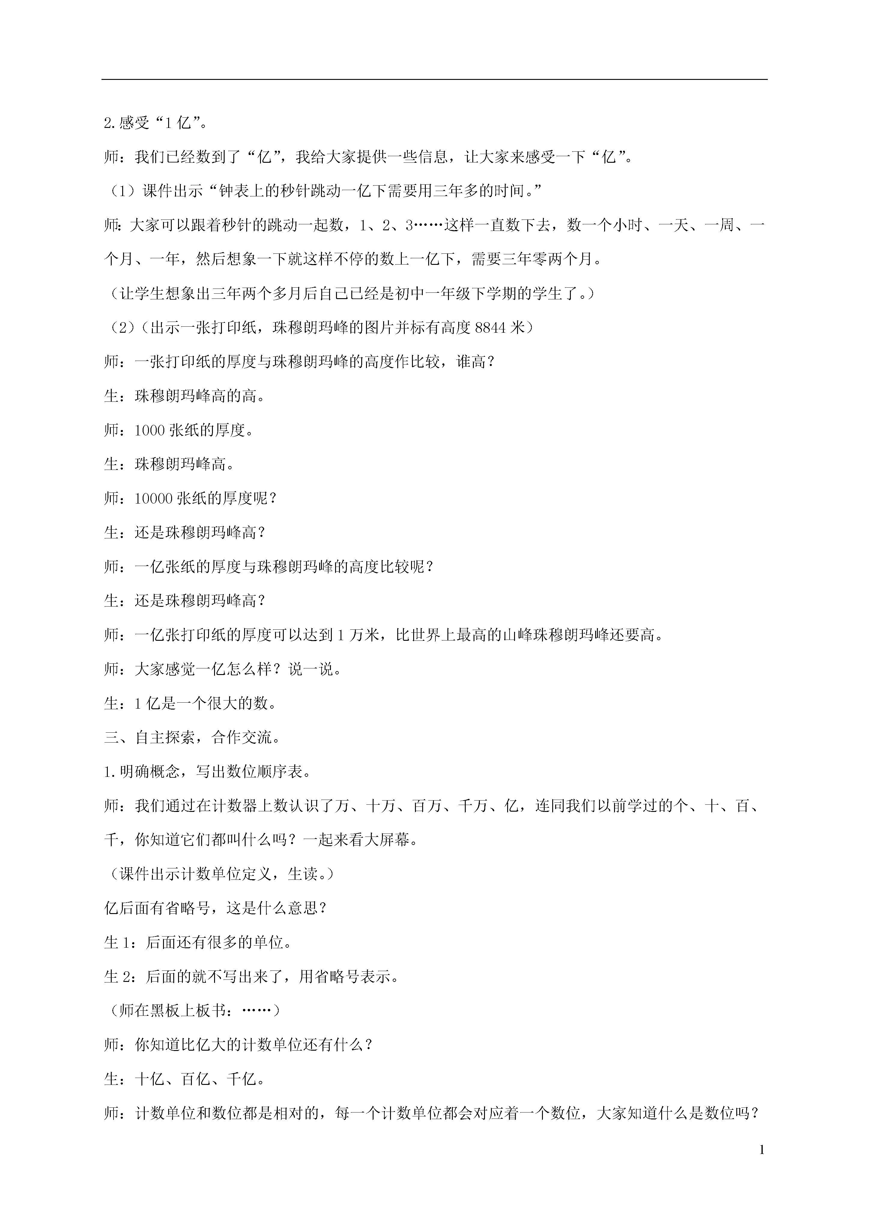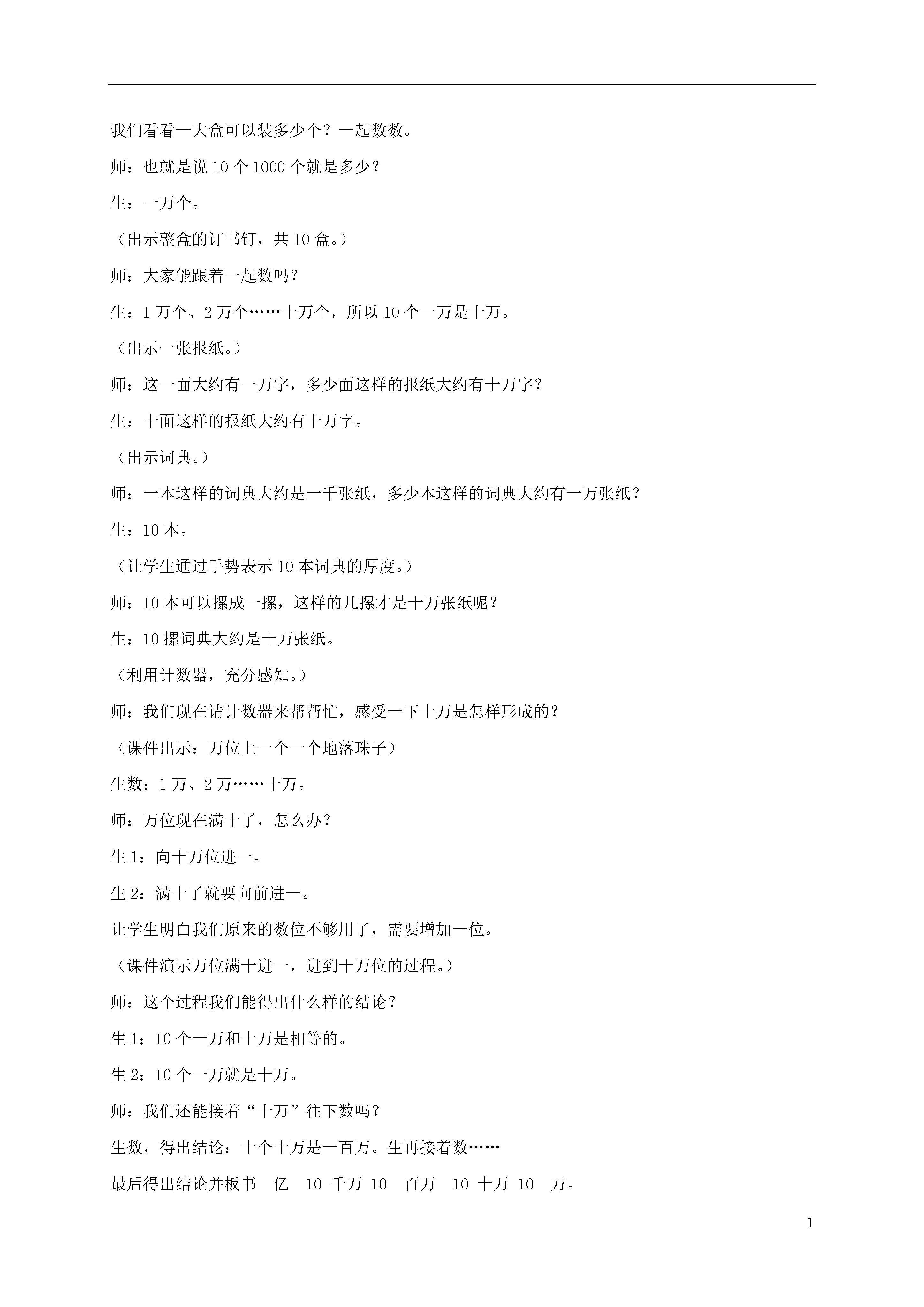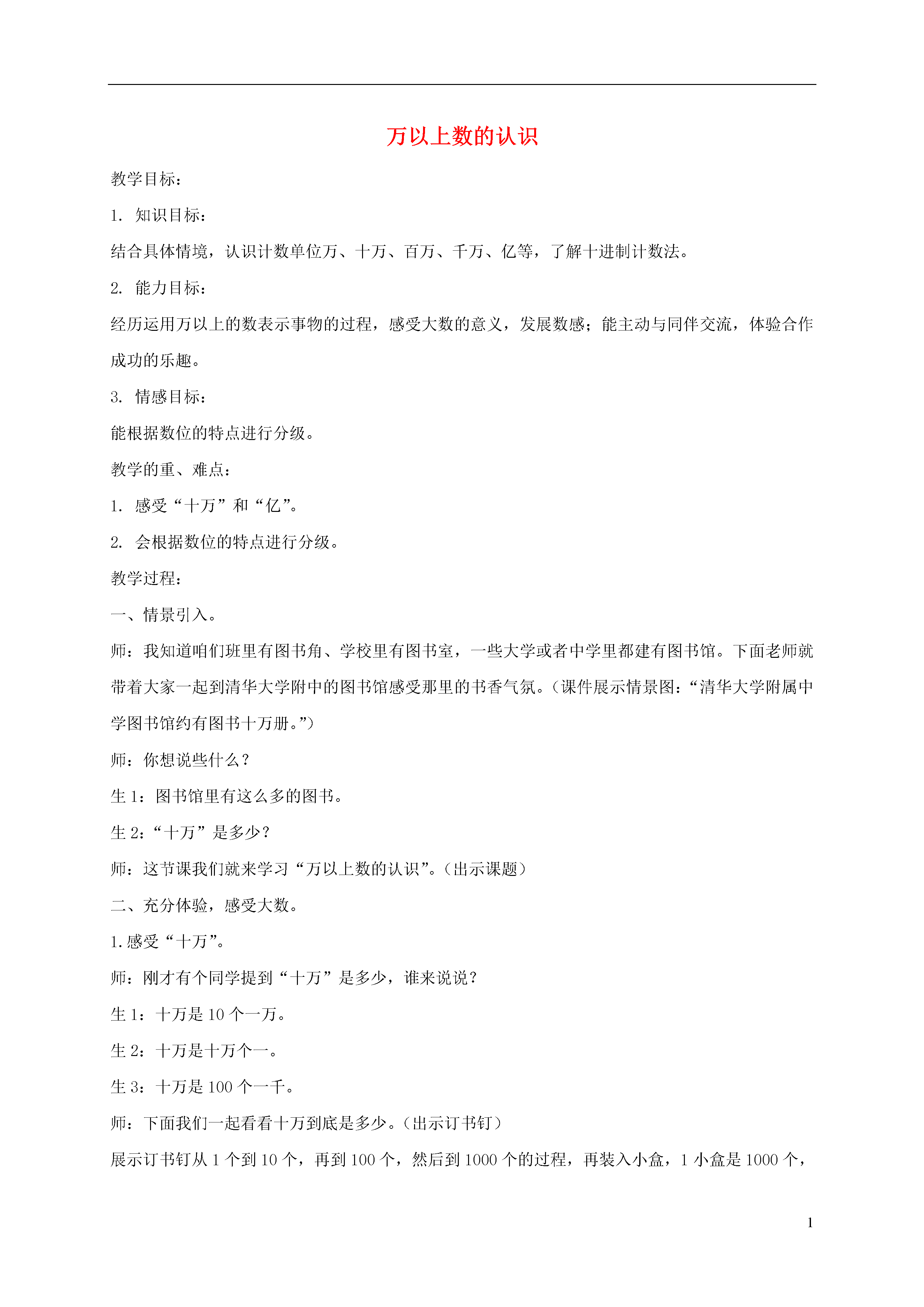 1万以上数的认识教学目标:1.知识目标:结合具体情境,认识计数单位万、十万、百万、千万、亿等,了解十进制计数法。2.能力目标:经历运用万以上的数表示事物的过程,感受大数的意义,发展数感;能主动与同伴交流,体验合作成功的乐趣。3.情感目标:能根据数位的特点进行分级。教学的重、难点:1.感受“十万”和“亿”。2.会根据数位的特点进行分级。教学过程:一、情景引入。师:我知道咱们班里有图书角、学校里有图书室,一些大学或者中学里都建有图书馆。下面老师就带着大家一起到清华大学附中的图书馆感受那里的书香气氛。(课件展示情景图:“清华大学附属中学图书馆约有图书十万册。”)师:你想说些什么?生1:图书馆里有这么多的图书。生2:“十万”是多少?师:这节课我们就来学习“万以上数的认识”。(出示课题)二、充分体验,感受大数。1.感受“十万”。师:刚才有个同学提到“十万”是多少,谁来说说?生1:十万是10个一万。生2:十万是十万个一。生3:十万是100个一千。师:下面我们一起看看十万到底是多少。(出示订书钉)展示订书钉从1个到10个,再到100个,然后到1000个的过程,再装入小盒,1小盒是1000个,我们看看一大盒可以装多少个?一起数数。师:也就是说10个1000个就是多少?生:一万个。(出示整盒的订书钉,共10盒。)师:大家能跟着一起数吗?生:1万个、2万个……十万个,所以10个一万是十万。(出示一张报纸。)师:这一面大约有一万字,多少面这样的报纸大约有十万字?生:十面这样的报纸大约有十万字。(出示词典。)师:一本这样的词典大约是一千张纸,多少本这样的词典大约有一万张纸?生:10本。(让学生通过手势表示10本词典的厚度。)师:10本可以摞成一摞,这样的几摞才是十万张纸呢?生:10摞词典大约是十万张纸。(利用计数器,充分感知。)师:我们现在请计数器来帮帮忙,感受一下十万是怎样形成的?(课件出示:万位上一个一个地落珠子)生数:1万、2万……十万。师:万位现在满十了,怎么办?生1:向十万位进一。生2:满十了就要向前进一。让学生明白我们原来的数位不够用了,需要增加一位。(课件演示万位满十进一,进到十万位的过程。)师:这个过程我们能得出什么样的结论?生1:10个一万和十万是相等的。生2:10个一万就是十万。师:我们还能接着“十万”往下数吗?生数,得出结论:十个十万是一百万。生再接着数……最后得出结论并板书亿10千万10百万10十万10万。2.感受“1亿”。师:我们已经数到了“亿”,我给大家提供一些信息,让大家来感受一下“亿”。(1)课件出示“钟表上的秒针跳动一亿下需要用三年多的时间。”师:大家可以跟着秒针的跳动一起数,1、2、3……这样一直数下去,数一个小时、一天、一周、一个月、一年,然后想象一下就这样不停的数上一亿下,需要三年零两个月。(让学生想象出三年两个多月后自己已经是初中一年级下学期的学生了。)(2)(出示一张打印纸,珠穆朗玛峰的图片并标有高度8844米)师:一张打印纸的厚度与珠穆朗玛峰的高度作比较,谁高?生:珠穆朗玛峰高的高。师:1000张纸的厚度。生:珠穆朗玛峰高。师:10000张纸的厚度呢?生:还是珠穆朗玛峰高?师:一亿张纸的厚度与珠穆朗玛峰的高度比较呢?生:还是珠穆朗玛峰高?师:一亿张打印纸的厚度可以达到1万米,比世界上最高的山峰珠穆朗玛峰还要高。师:大家感觉一亿怎么样?说一说。生:1亿是一个很大的数。三、自主探索,合作交流。1.明确概念,写出数位顺序表。师:我们通过在计数器上数认识了万、十万、百万、千万、亿,连同我们以前学过的个、十、百、千,你知道它们都叫什么吗?一起来看大屏幕。(课件出示计数单位定义,生读。)亿后面有省略号,这是什么意思?生1:后面还有很多的单位。生2:后面的就不写出来了,用省略号表示。(师在黑板上板书:……)师:你知道比亿大的计数单位还有什么?生:十亿、百亿、千亿。师:计数单位和数位都是相对的,每一个计数单位都会对应着一个数位,大家知道什么是数位吗?请看大屏幕。(课件显示数位定义,生读。接着出示有空缺的数位顺序表)师:刚才我们所说的这些计数单位和数位合起来就可以组成一个数位顺序表。现在你能把这个数位顺序表填完整吗?(每人一张有空缺的表格,独立完成,然后小组内统一核对。)找生上台在投影上展示,统一意见后,读数位顺序表。2.独立分级。在表格上一共有多少个数位?这么多的数位,我们的祖先为了读写方便给它们分了级,你们能不能也给它们分一下级,并给每一级取个名字呢?(小组活动后进行汇报。)生:我们一共分了三级。个位、十位、百位、千位是一级,