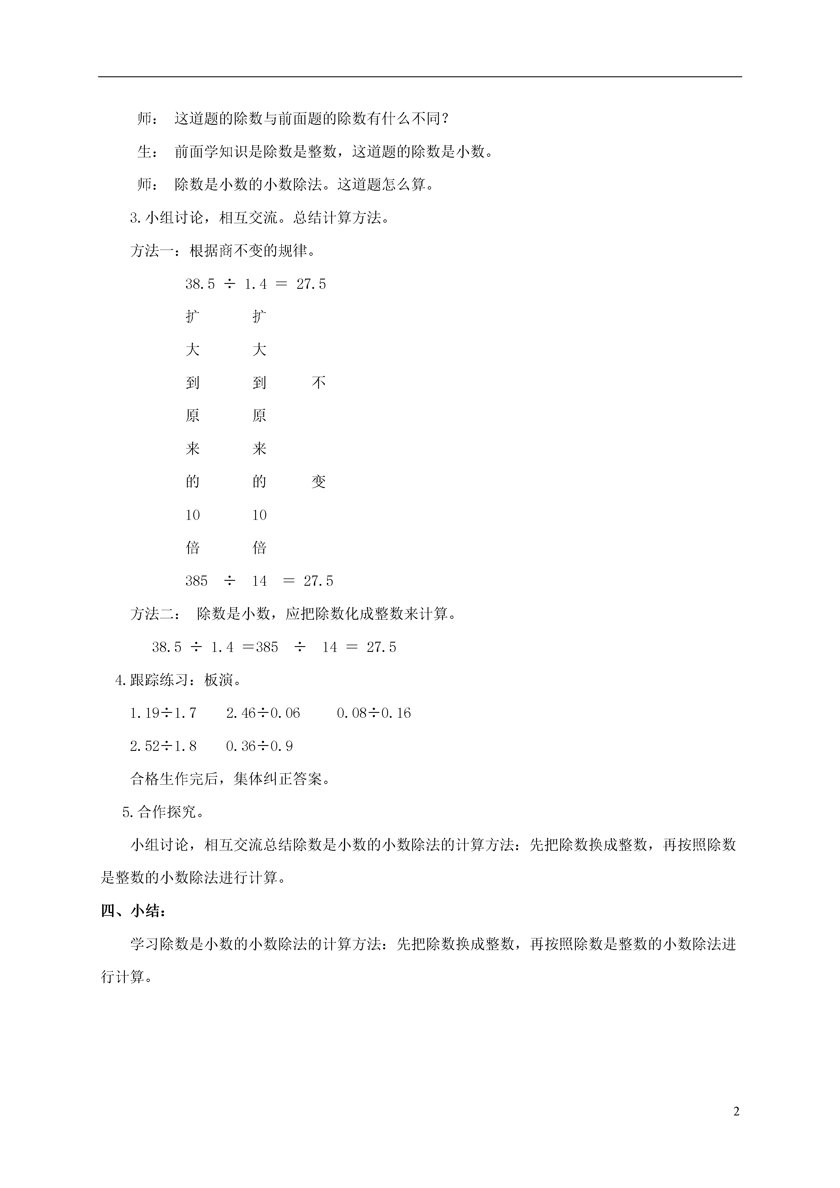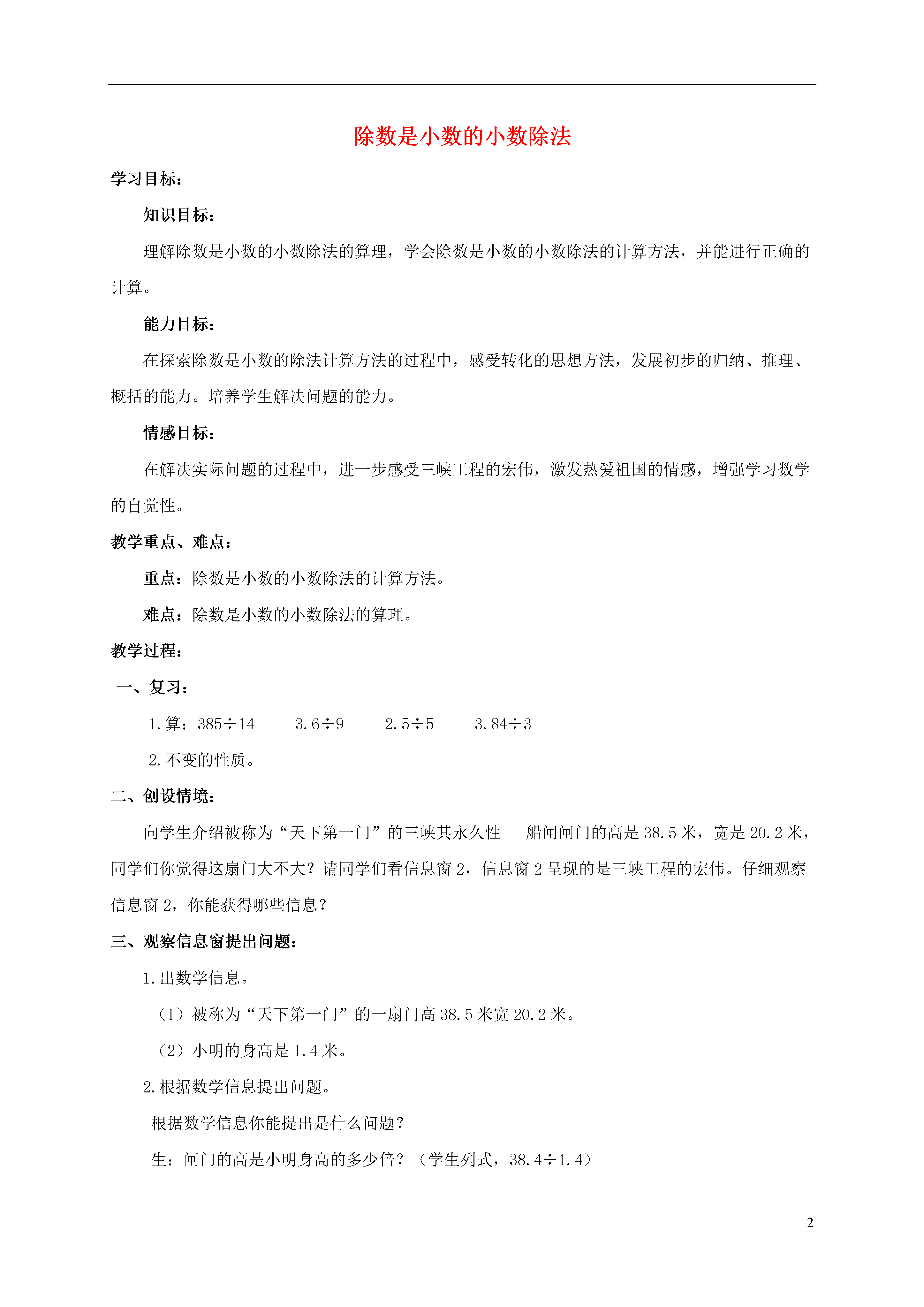 2除数是小数的小数除法学习目标:知识目标:理解除数是小数的小数除法的算理,学会除数是小数的小数除法的计算方法,并能进行正确的计算。能力目标:在探索除数是小数的除法计算方法的过程中,感受转化的思想方法,发展初步的归纳、推理、概括的能力。培养学生解决问题的能力。情感目标:在解决实际问题的过程中,进一步感受三峡工程的宏伟,激发热爱祖国的情感,增强学习数学的自觉性。教学重点、难点:重点:除数是小数的小数除法的计算方法。难点:除数是小数的小数除法的算理。教学过程:一、复习:1.算:385÷143.6÷92.5÷53.84÷32.不变的性质。二、创设情境:向学生介绍被称为“天下第一门”的三峡其永久性船闸闸门的高是38.5米,宽是20.2米,同学们你觉得这扇门大不大?请同学们看信息窗2,信息窗2呈现的是三峡工程的宏伟。仔细观察信息窗2,你能获得哪些信息?三、观察信息窗提出问题:1.出数学信息。(1)被称为“天下第一门”的一扇门高38.5米宽20.2米。(2)小明的身高是1.4米。2.根据数学信息提出问题。根据数学信息你能提出是什么问题?生:闸门的高是小明身高的多少倍?(学生列式,38.4÷1.4)师:这道题的除数与前面题的除数有什么不同?生:前面学知识是除数是整数,这道题的除数是小数。师:除数是小数的小数除法。这道题怎么算。3.小组讨论,相互交流。总结计算方法。方法一:根据商不变的规律。38.5÷1.4=27.5扩扩大大到到不原原来来的的变1010倍倍385÷14=27.5方法二:除数是小数,应把除数化成整数来计算。38.5÷1.4=385÷14=27.54.跟踪练习:板演。1.19÷1.72.46÷0.060.08÷0.162.52÷1.80.36÷0.9合格生作完后,集体纠正答案。5.合作探究。小组讨论,相互交流总结除数是小数的小数除法的计算方法:先把除数换成整数,再按照除数是整数的小数除法进行计算。四、小结:学习除数是小数的小数除法的计算方法:先把除数换成整数,再按照除数是整数的小数除法进行计算。