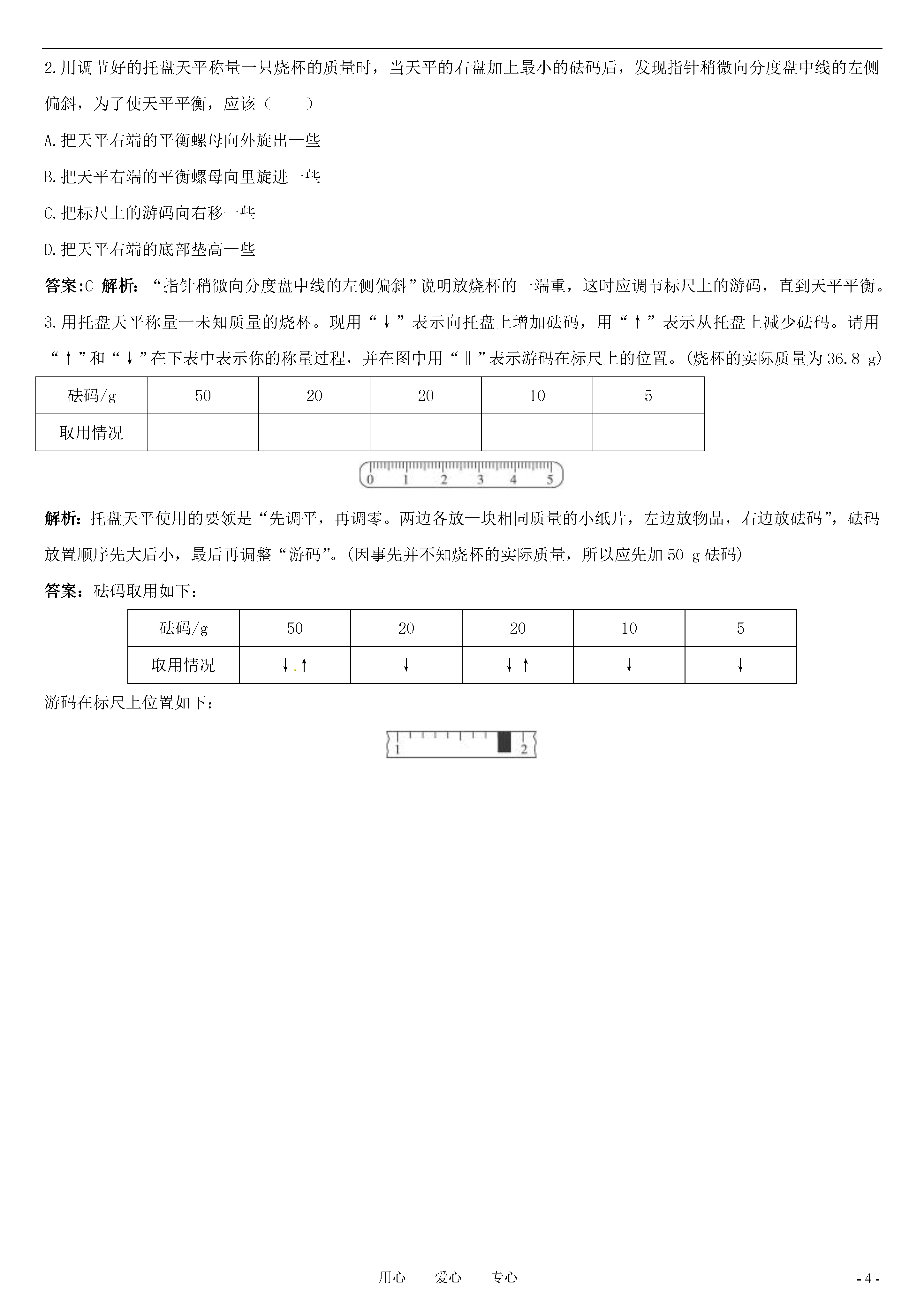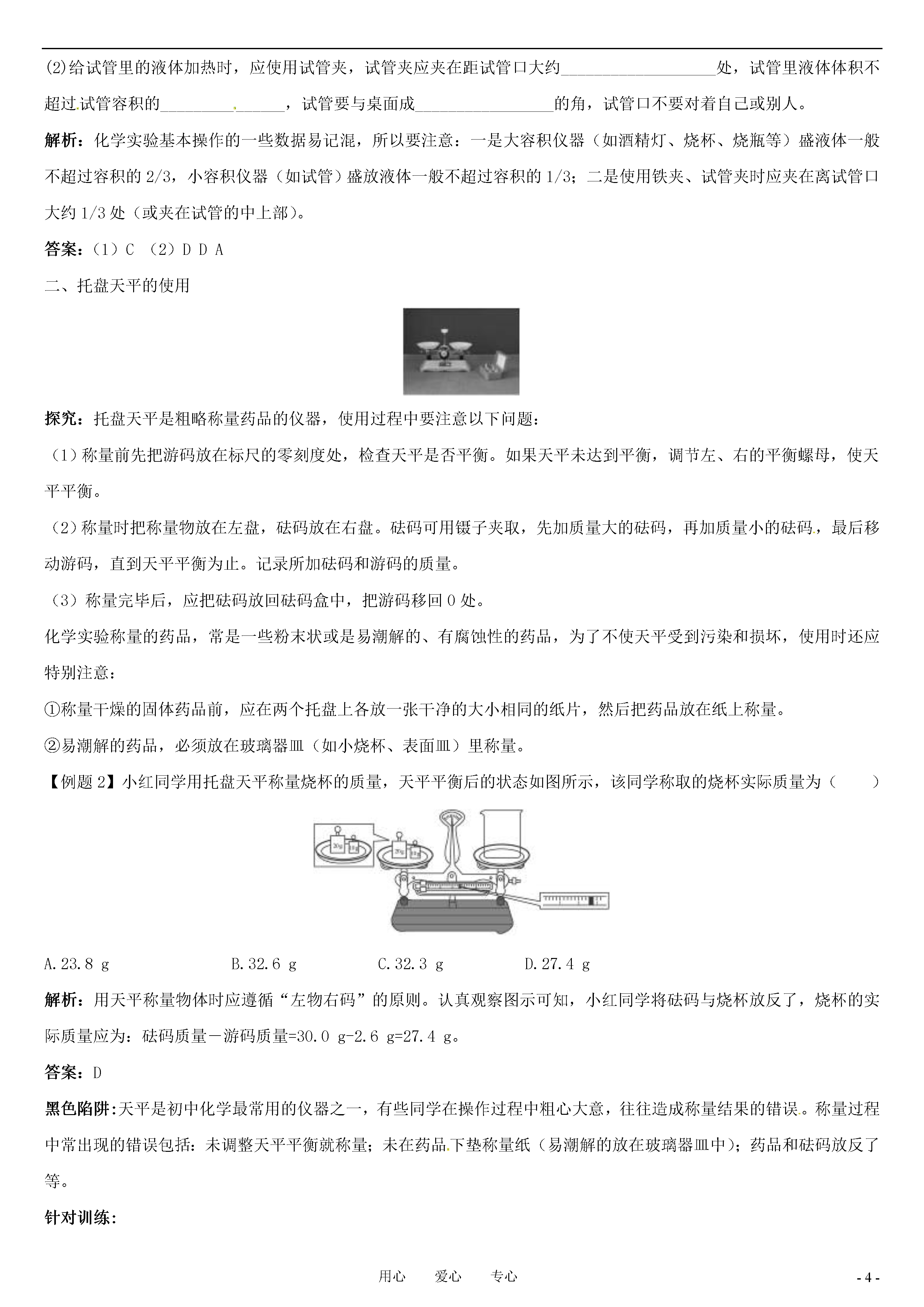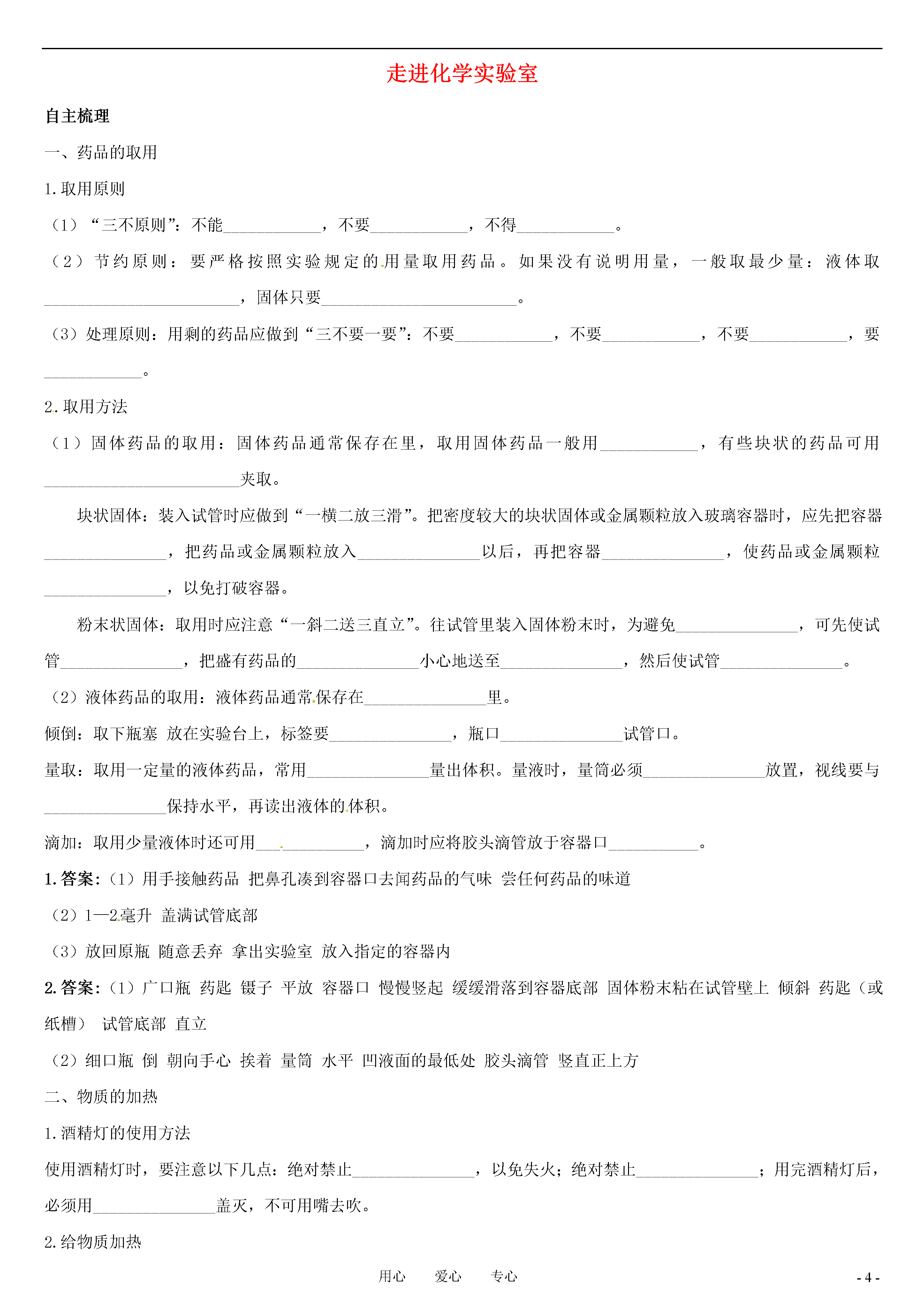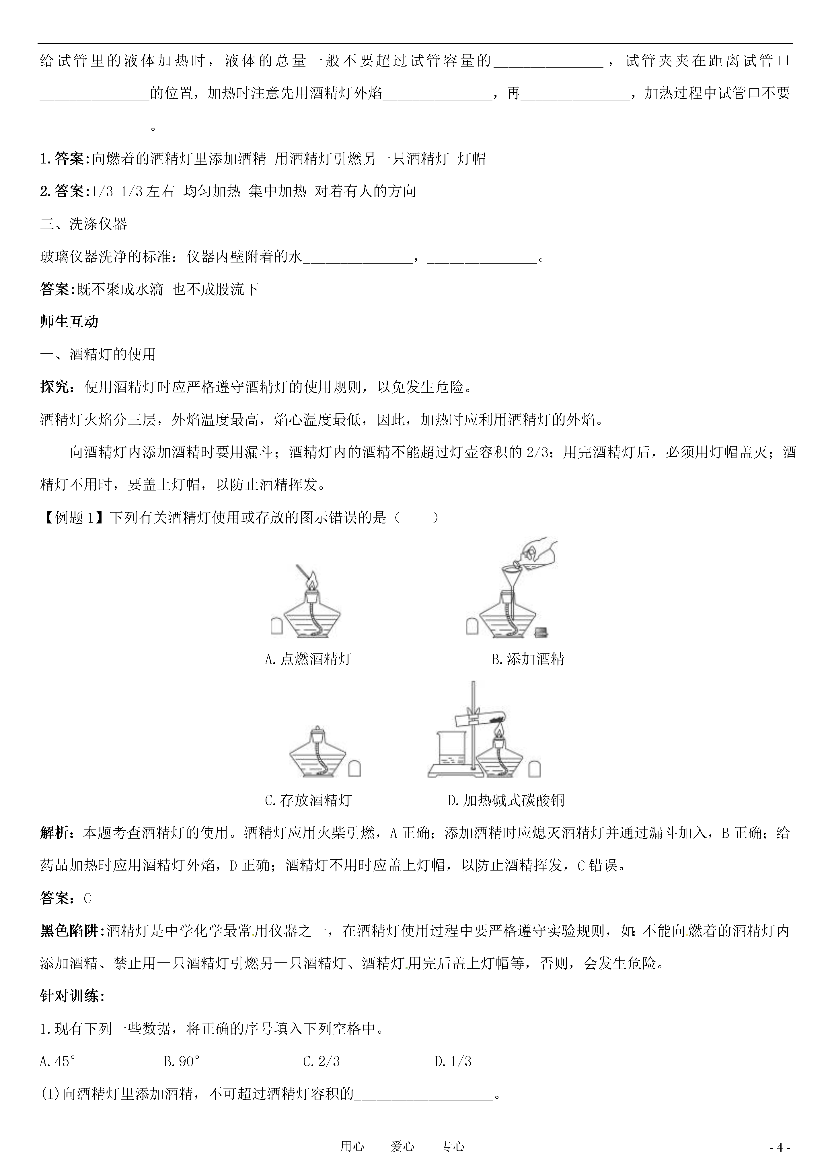 -4-用心爱心专心走进化学实验室自主梳理一、药品的取用1.取用原则(1)“三不原则”:不能____________,不要____________,不得____________。(2)节约原则:要严格按照实验规定的用量取用药品。如果没有说明用量,一般取最少量:液体取________________________,固体只要________________________。(3)处理原则:用剩的药品应做到“三不要一要”:不要____________,不要____________,不要____________,要____________。2.取用方法(1)固体药品的取用:固体药品通常保存在里,取用固体药品一般用____________,有些块状的药品可用________________________夹取。块状固体:装入试管时应做到“一横二放三滑”。把密度较大的块状固体或金属颗粒放入玻璃容器时,应先把容器_______________,把药品或金属颗粒放入_______________以后,再把容器_______________,使药品或金属颗粒_______________,以免打破容器。粉末状固体:取用时应注意“一斜二送三直立”。往试管里装入固体粉末时,为避免_______________,可先使试管_______________,把盛有药品的_______________小心地送至_______________,然后使试管_______________。(2)液体药品的取用:液体药品通常保存在_______________里。倾倒:取下瓶塞放在实验台上,标签要_______________,瓶口_______________试管口。量取:取用一定量的液体药品,常用_______________量出体积。量液时,量筒必须_______________放置,视线要与_______________保持水平,再读出液体的体积。滴加:取用少量液体时还可用_____________,滴加时应将胶头滴管放于容器口___________。1.答案:(1)用手接触药品把鼻孔凑到容器口去闻药品的气味尝任何药品的味道(2)1—2毫升盖满试管底部(3)放回原瓶随意丢弃拿出实验室放入指定的容器内2.答案:(1)广口瓶药匙镊子平放容器口慢慢竖起缓缓滑落到容器底部固体粉末粘在试管壁上倾斜药匙(或纸槽)试管底部直立(2)细口瓶倒朝向手心挨着量筒水平凹液面的最低处胶头滴管竖直正上方二、物质的加热1.酒精灯的使用方法使用酒精灯时,要注意以下几点:绝对禁止_______________,以免失火;绝对禁止_______________;用完酒精灯后,必须用_______________盖灭,不可用嘴去吹。2.给物质加热给试管里的液体加热时,液体的总量一般不要超过试管容量的_______________,试管夹夹在距离试管口_______________的位置,加热时注意先用酒精灯外焰_______________,再_______________,加热过程中试管口不要_______________。1.答案:向燃着的酒精灯里添加酒精用酒精灯引燃另一只酒精灯灯帽2.答案:1/31/3左右均匀加热集中加热对着有人的方向三、洗涤仪器玻璃仪器洗净的标准:仪器内壁附着的水_______________,_______________。答案:既不聚成水滴也不成股流下师生互动一、酒精灯的使用探究:使用酒精灯时应严格遵守酒精灯的使用规则,以免发生危险。酒精灯火焰分三层,外焰温度最高,焰心温度最低,因此,加热时应利用酒精灯的外焰。向酒精灯内添加酒精时要用漏斗;酒精灯内的酒精不能超过灯壶容积的2/3;用完酒精灯后,必须用灯帽盖灭;酒精灯不用时,要盖上灯帽,以防止酒精挥发。【例题1】下列有关酒精灯使用或存放的图示错误的是()A.点燃酒精灯B.添加酒精C.存放酒精灯D.加热碱式碳酸铜解析:本题考查酒精灯的使用。酒精灯应用火柴引燃,A正确;添加酒精时应熄灭酒精灯并通过漏斗加入,B正确;给药品加热时应用酒精灯外焰,D正确;酒精灯不用时应盖上灯帽,以防止酒精挥发,C错误。答案:C黑色陷阱:酒精灯是中学化学最常用仪器之一,在酒精灯使用过程中要严格遵守实验规则,如:不能向燃着的酒精灯内添加酒精、禁止用一只酒精灯引燃另一只酒精灯、酒精灯用完后盖上灯帽等,否则,会发生危险。针对训练:1.现有下列一些数据,将正确的序号填入下列空格中。A.45°B.90°C.2/3D.1/3(1)向酒精灯里添加酒精,不可超过酒精灯容积的___________________。(2)给试管里的液体加热时,应使用试管
