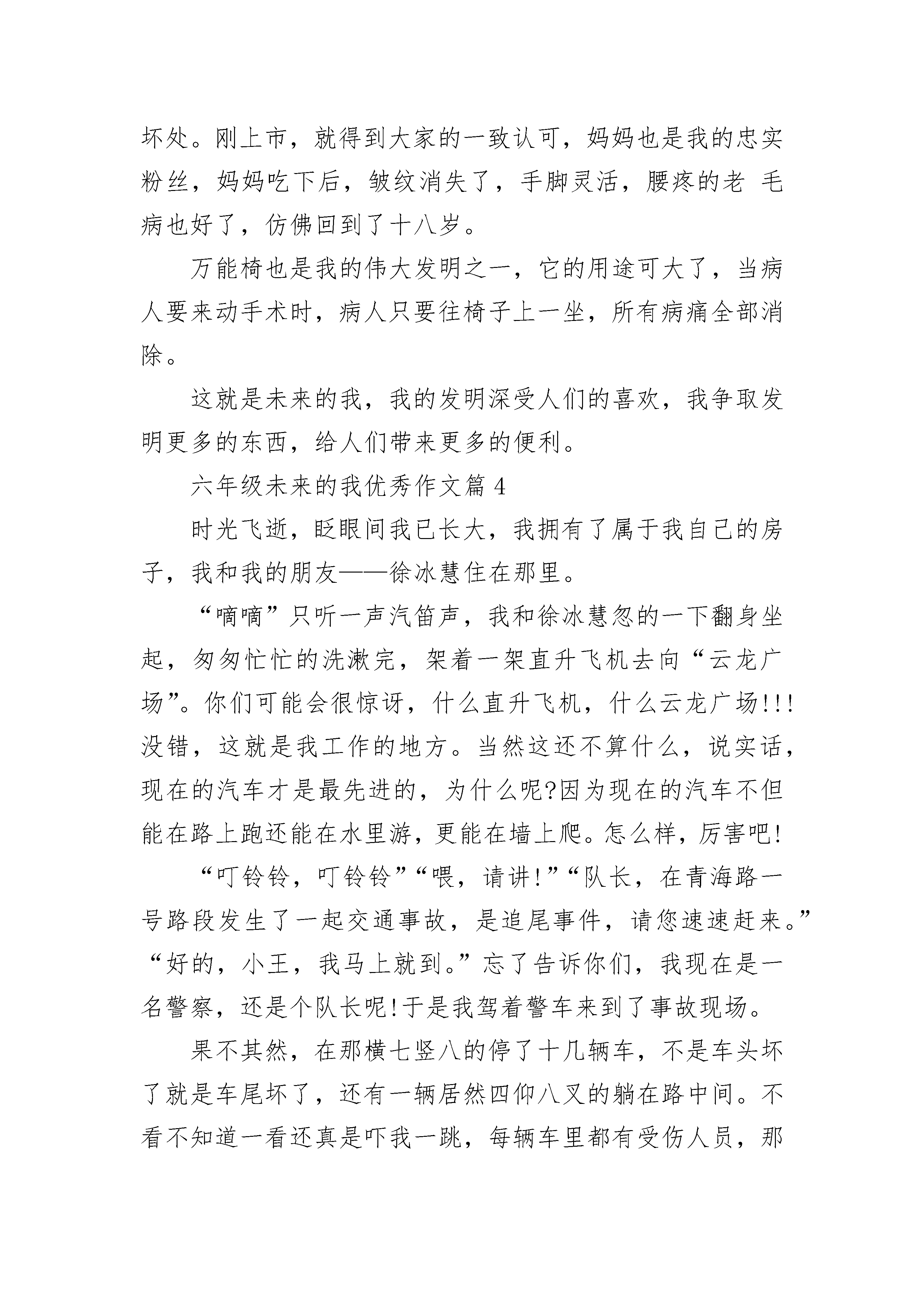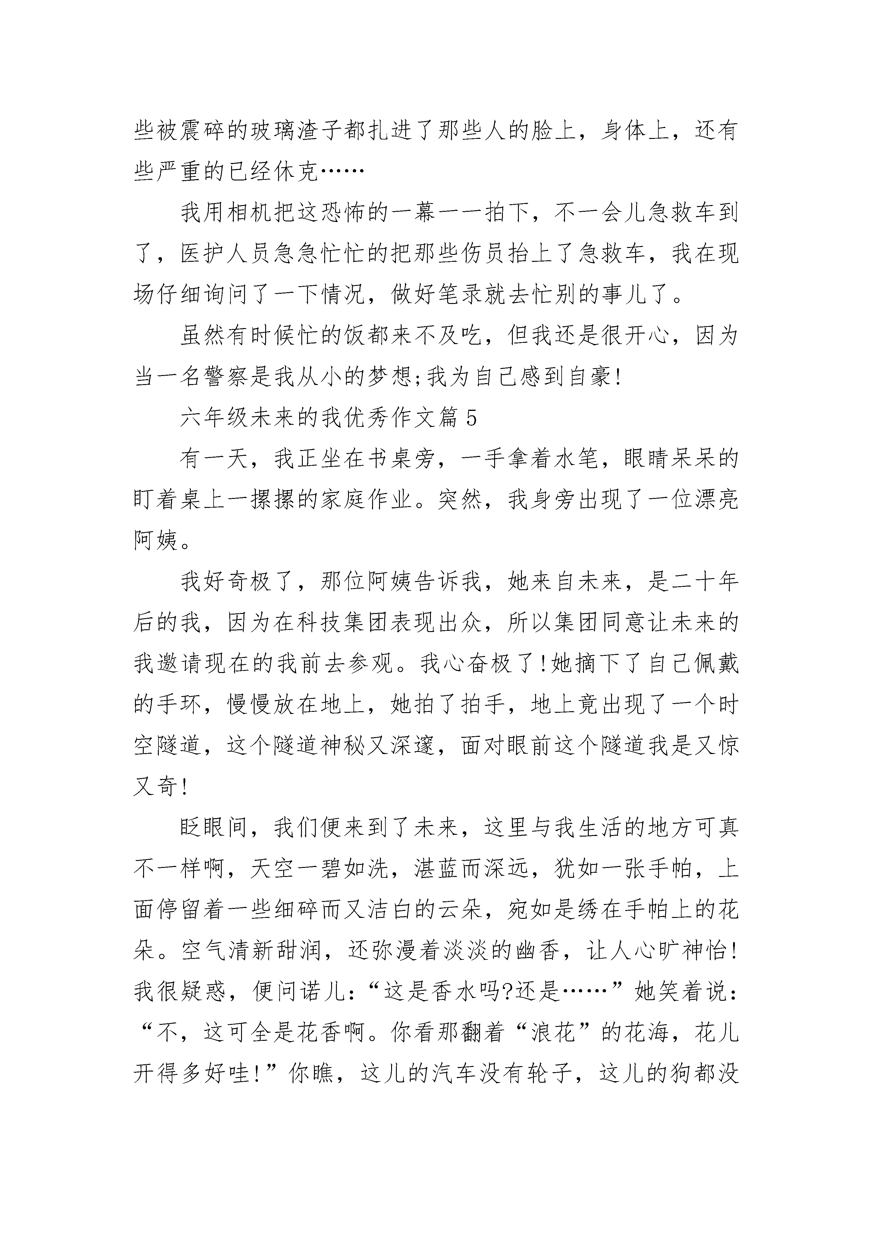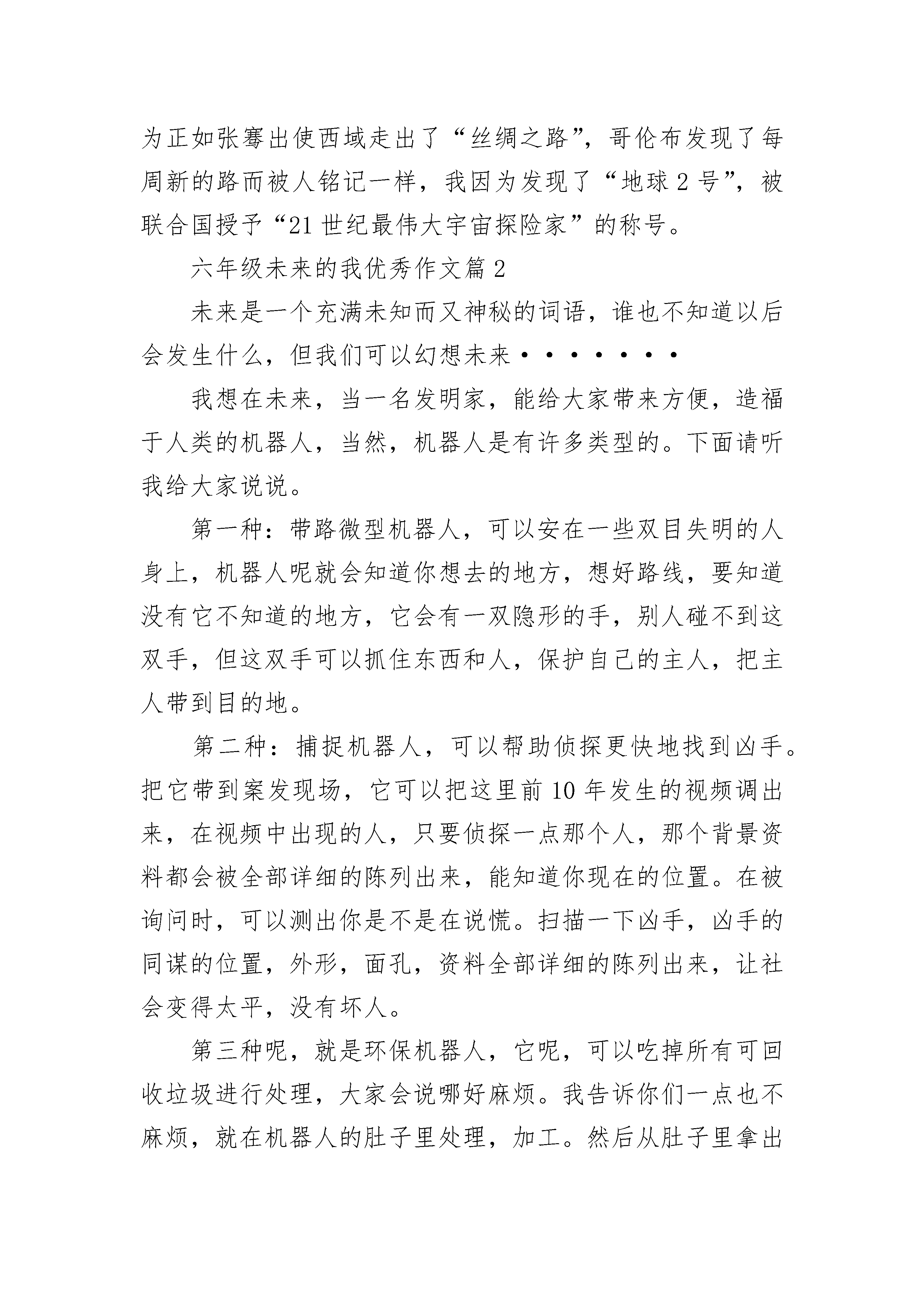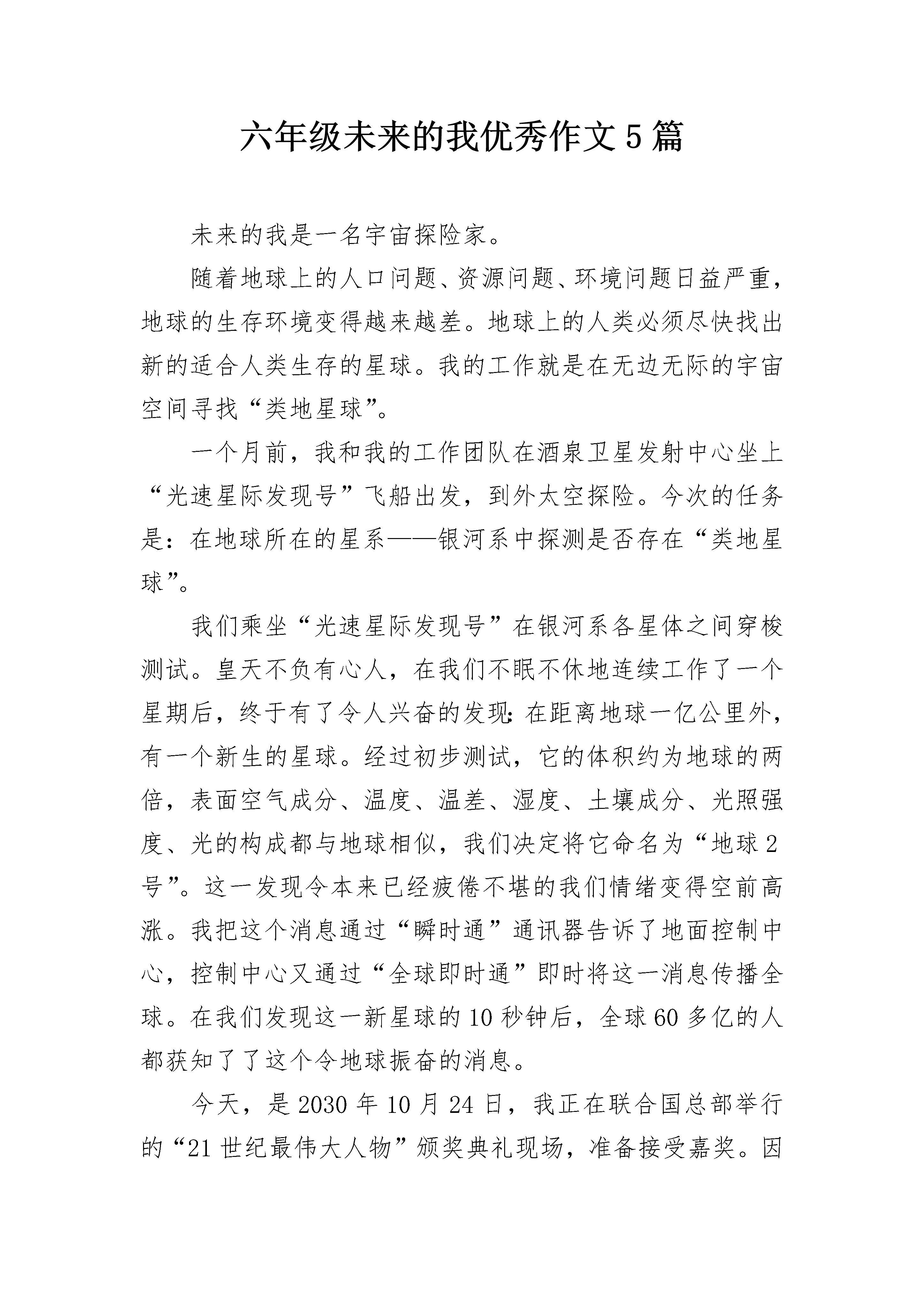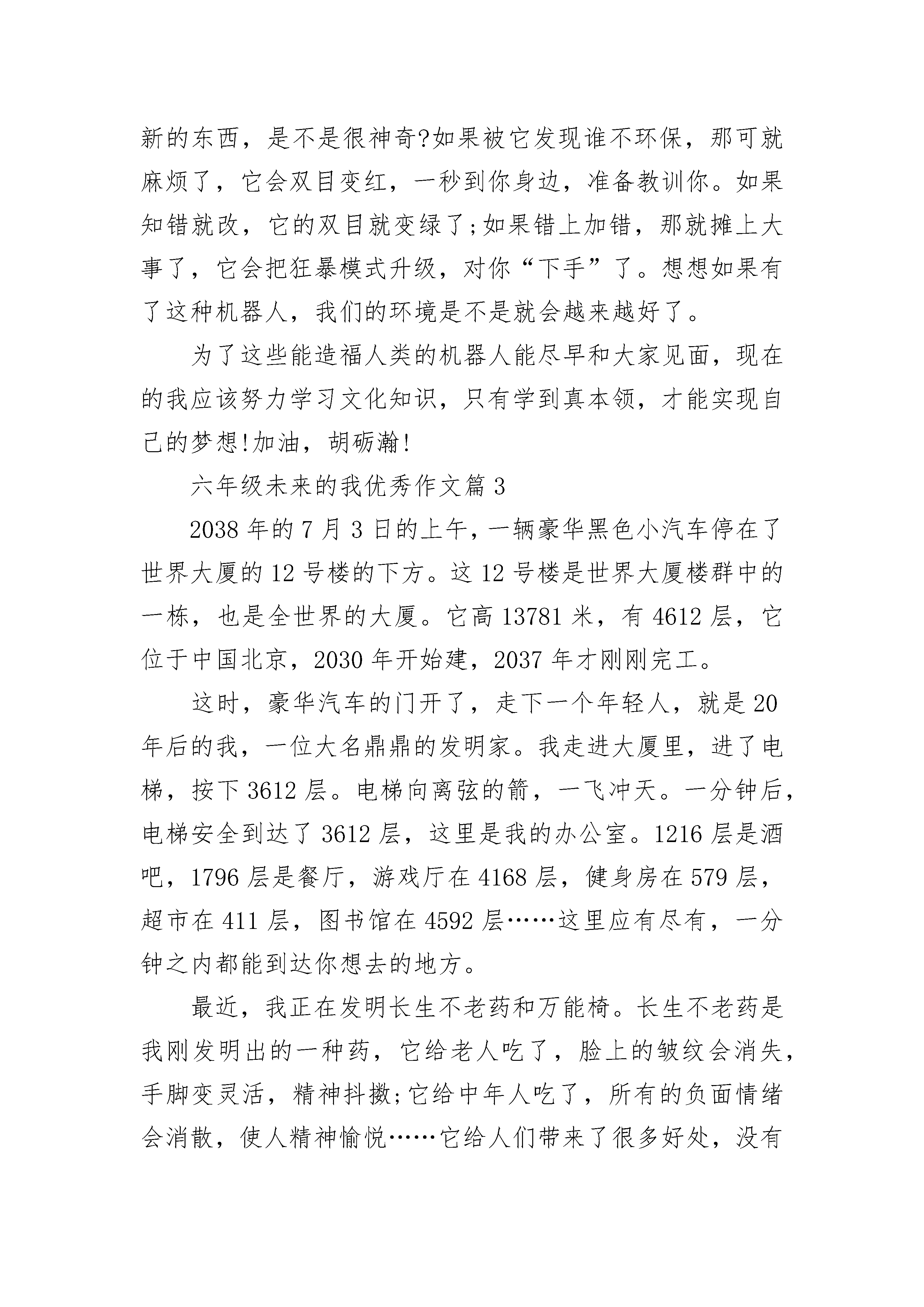 六年级未来的我优秀作文5篇未来的我是一名宇宙探险家。随着地球上的人口问题、资源问题、环境问题日益严重,地球的生存环境变得越来越差。地球上的人类必须尽快找出新的适合人类生存的星球。我的工作就是在无边无际的宇宙空间寻找“类地星球”。一个月前,我和我的工作团队在酒泉卫星发射中心坐上“光速星际发现号”飞船出发,到外太空探险。今次的任务是:在地球所在的星系——银河系中探测是否存在“类地星球”。我们乘坐“光速星际发现号”在银河系各星体之间穿梭测试。皇天不负有心人,在我们不眠不休地连续工作了一个星期后,终于有了令人兴奋的发现:在距离地球一亿公里外,有一个新生的星球。经过初步测试,它的体积约为地球的两倍,表面空气成分、温度、温差、湿度、土壤成分、光照强度、光的构成都与地球相似,我们决定将它命名为“地球2号”。这一发现令本来已经疲倦不堪的我们情绪变得空前高涨。我把这个消息通过“瞬时通”通讯器告诉了地面控制中心,控制中心又通过“全球即时通”即时将这一消息传播全球。在我们发现这一新星球的10秒钟后,全球60多亿的人都获知了了这个令地球振奋的消息。今天,是2030年10月24日,我正在联合国总部举行的“21世纪最伟大人物”颁奖典礼现场,准备接受嘉奖。因为正如张骞出使西域走出了“丝绸之路”,哥伦布发现了每周新的路而被人铭记一样,我因为发现了“地球2号”,被联合国授予“21世纪最伟大宇宙探险家”的称号。六年级未来的我优秀作文篇2未来是一个充满未知而又神秘的词语,谁也不知道以后会发生什么,但我们可以幻想未来·······我想在未来,当一名发明家,能给大家带来方便,造福于人类的机器人,当然,机器人是有许多类型的。下面请听我给大家说说。第一种:带路微型机器人,可以安在一些双目失明的人身上,机器人呢就会知道你想去的地方,想好路线,要知道没有它不知道的地方,它会有一双隐形的手,别人碰不到这双手,但这双手可以抓住东西和人,保护自己的主人,把主人带到目的地。第二种:捕捉机器人,可以帮助侦探更快地找到凶手。把它带到案发现场,它可以把这里前10年发生的视频调出来,在视频中出现的人,只要侦探一点那个人,那个背景资料都会被全部详细的陈列出来,能知道你现在的位置。在被询问时,可以测出你是不是在说慌。扫描一下凶手,凶手的同谋的位置,外形,面孔,资料全部详细的陈列出来,让社会变得太平,没有坏人。第三种呢,就是环保机器人,它呢,可以吃掉所有可回收垃圾进行处理,大家会说哪好麻烦。我告诉你们一点也不麻烦,就在机器人的肚子里处理,加工。然后从肚子里拿出新的东西,是不是很神奇?如果被它发现谁不环保,那可就麻烦了,它会双目变红,一秒到你身边,准备教训你。如果知错就改,它的双目就变绿了;如果错上加错,那就摊上大事了,它会把狂暴模式升级,对你“下手”了。想想如果有了这种机器人,我们的环境是不是就会越来越好了。为了这些能造福人类的机器人能尽早和大家见面,现在的我应该努力学习文化知识,只有学到真本领,才能实现自己的梦想!加油,胡砺瀚!六年级未来的我优秀作文篇32038年的7月3日的上午,一辆豪华黑色小汽车停在了世界大厦的12号楼的下方。这12号楼是世界大厦楼群中的一栋,也是全世界的大厦。它高13781米,有4612层,它位于中国北京,2030年开始建,2037年才刚刚完工。这时,豪华汽车的门开了,走下一个年轻人,就是20年后的我,一位大名鼎鼎的发明家。我走进大厦里,进了电梯,按下3612层。电梯向离弦的箭,一飞冲天。一分钟后,电梯安全到达了3612层,这里是我的办公室。1216层是酒吧,1796层是餐厅,游戏厅在4168层,健身房在579层,超市在411层,图书馆在4592层……这里应有尽有,一分钟之内都能到达你想去的地方。最近,我正在发明长生不老药和万能椅。长生不老药是我刚发明出的一种药,它给老人吃了,脸上的皱纹会消失,手脚变灵活,精神抖擞;它给中年人吃了,所有的负面情绪会消散,使人精神愉悦……它给人们带来了很多好处,没有坏处。刚上市,就得到大家的一致认可,妈妈也是我的忠实粉丝,妈妈吃下后,皱纹消失了,手脚灵活,腰疼的老毛病也好了,仿佛回到了十八岁。万能椅也是我的伟大发明之一,它的用途可大了,当病人要来动手术时,病人只要往椅子上一坐,所有病痛全部消除。这就是未来的我,我的发明深受人们的喜欢,我争取发明更多的东西,给人们带来更多的便利。六年级未来的我优秀作文篇4时光飞逝,眨眼间我已长大,我拥有了属于我自己的房子,我和我的朋友——徐冰慧住在那里。“嘀嘀”只听一声汽笛声,我和徐冰慧忽的一下翻身坐起,匆匆忙忙的洗漱完,架着一架直升飞机去向“云龙广场”。你们可能会很惊讶,什么直升飞机,什么云龙广场!!!没错,这就是我工作的地方。当然这还不算什么,说实话,现在的汽车才是最先进的,为什么呢?因为现在的汽车不但