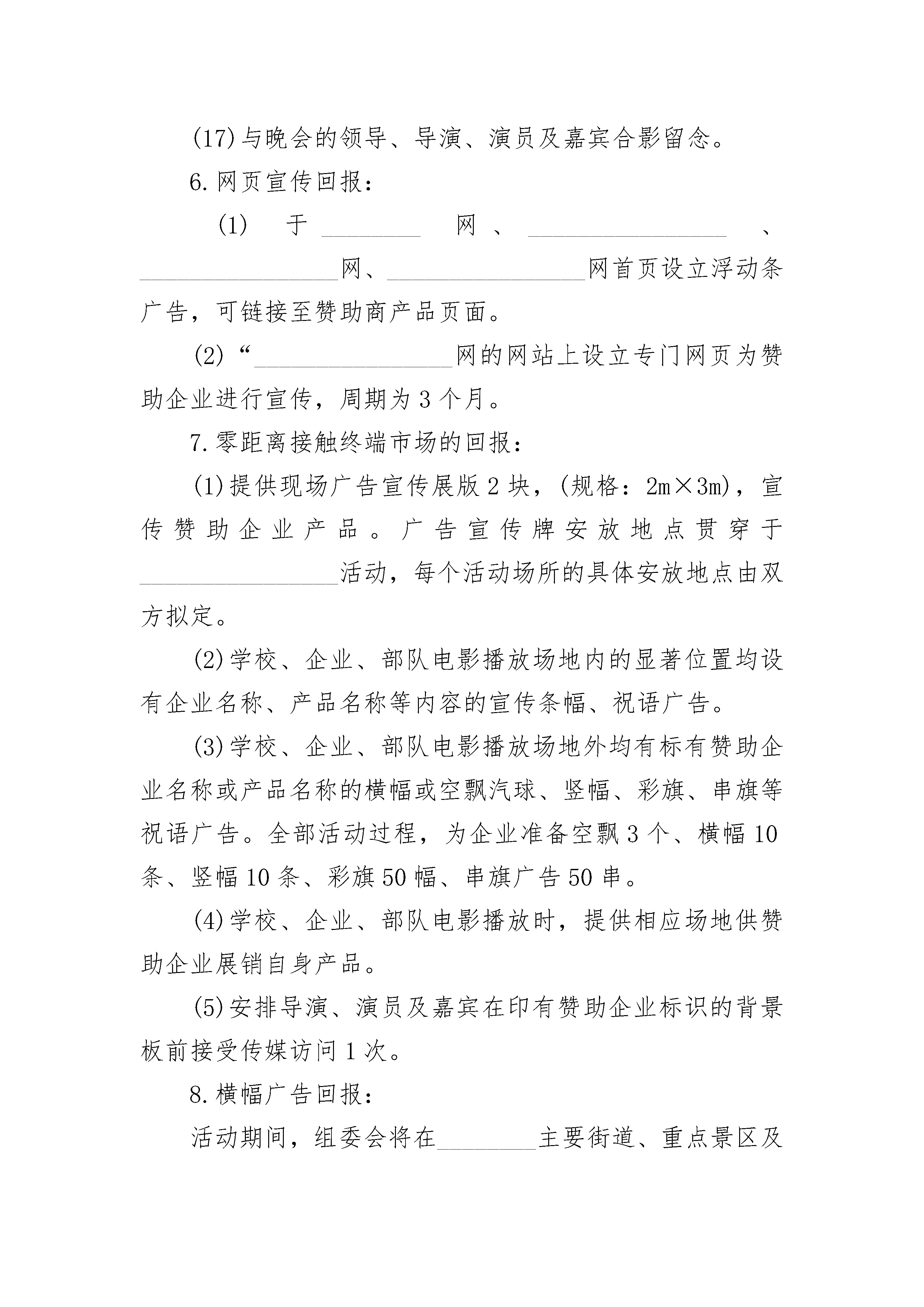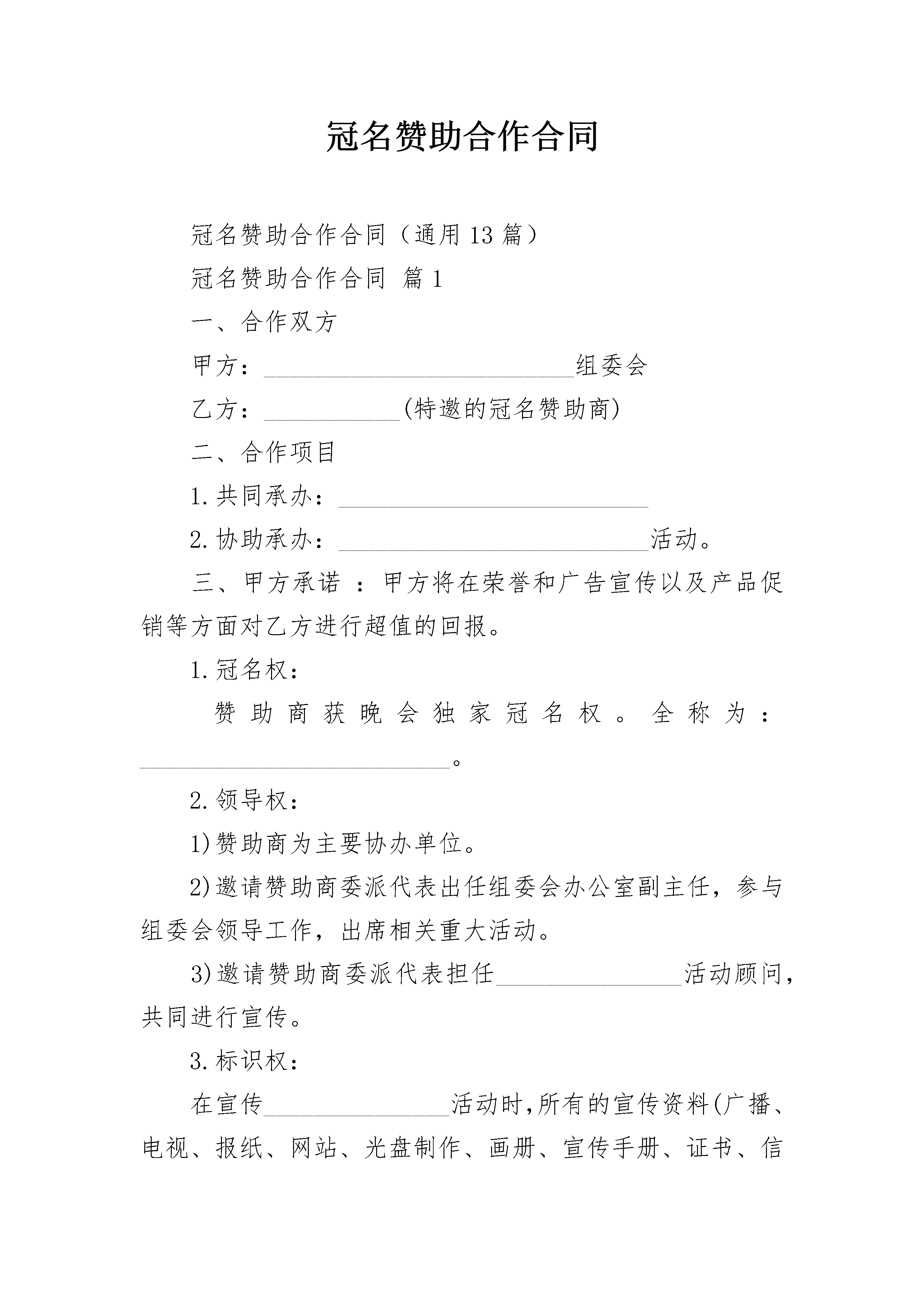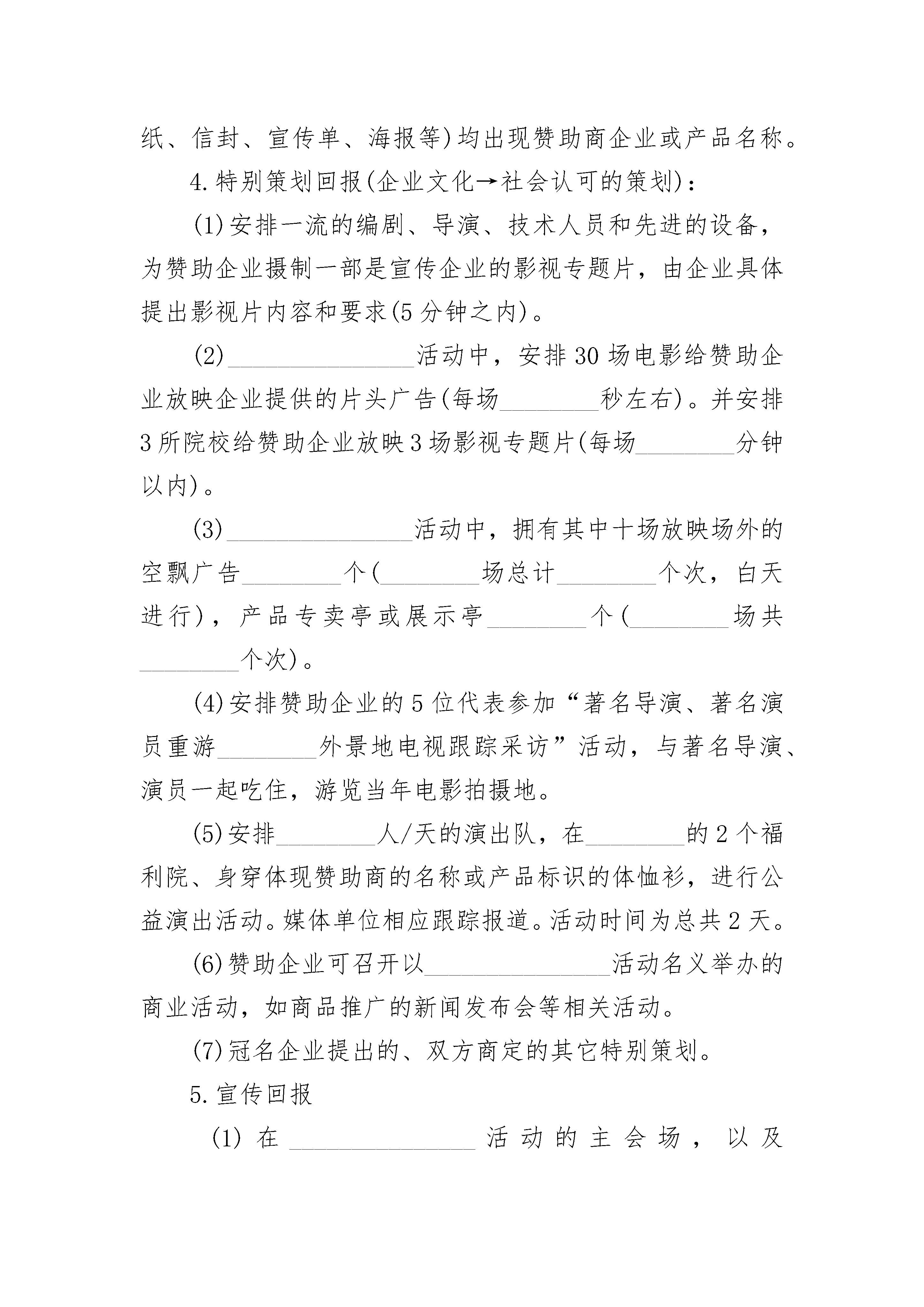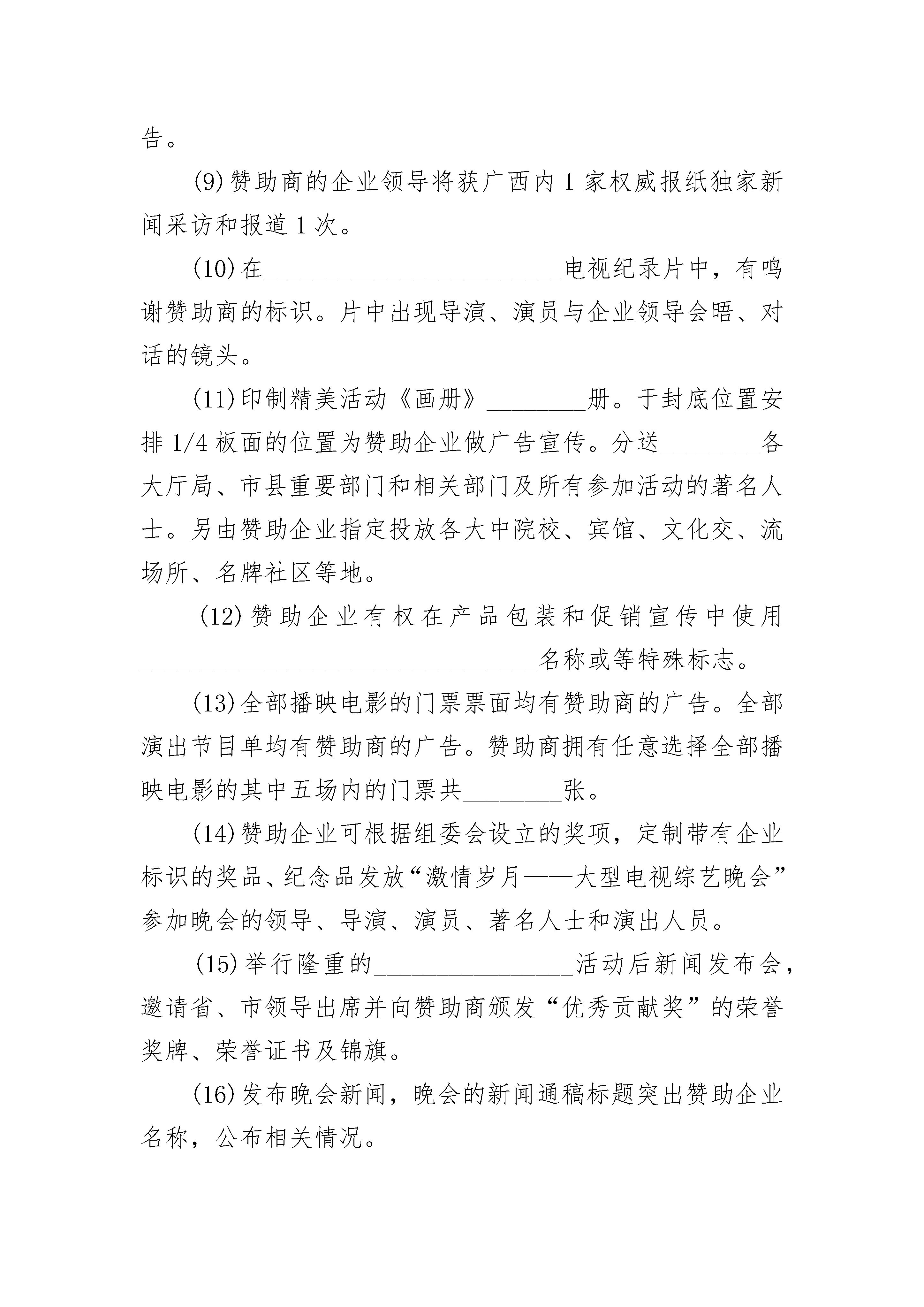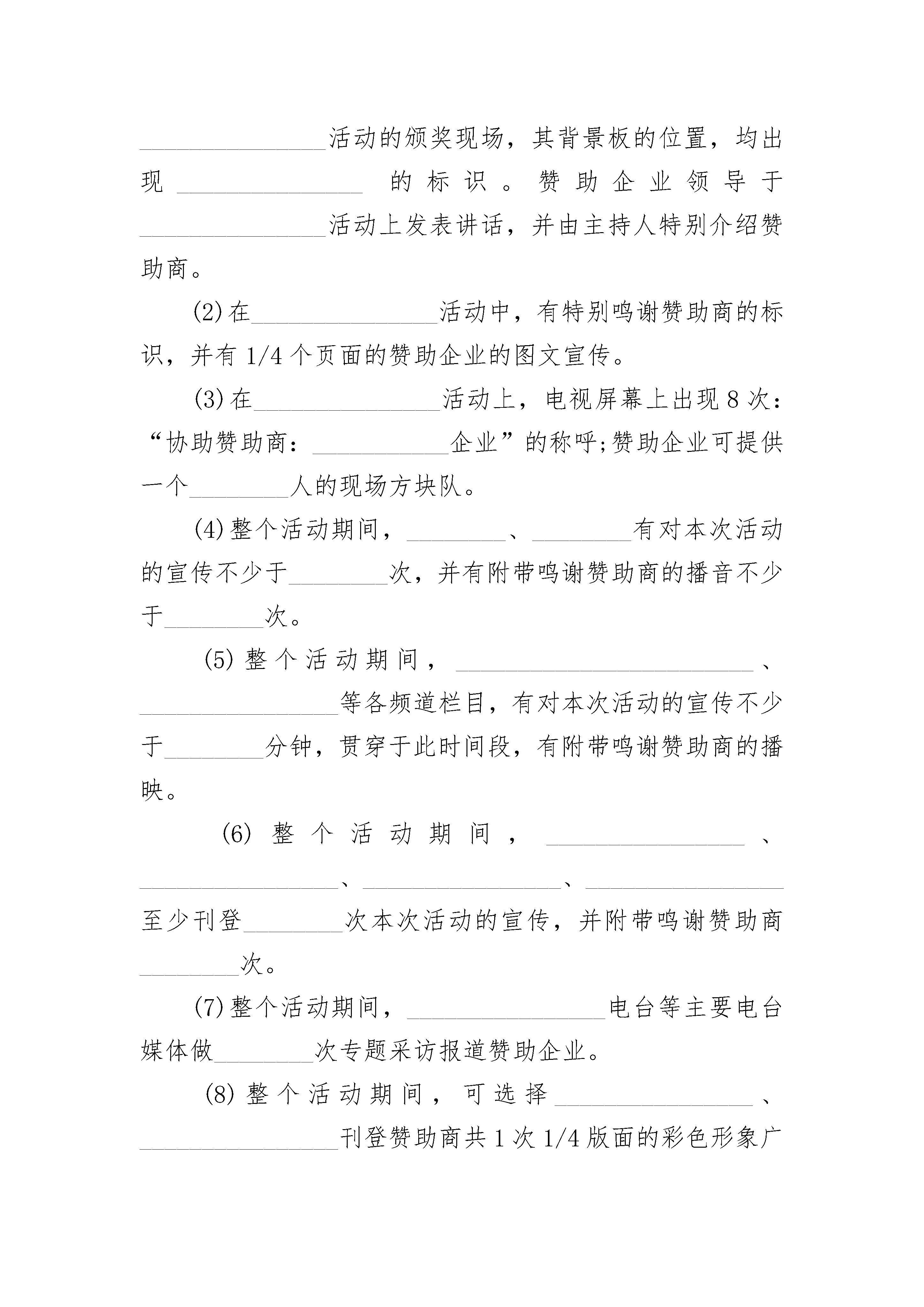 冠名赞助合作合同冠名赞助合作合同(通用13篇)冠名赞助合作合同篇1一、合作双方甲方:_________________________组委会乙方:___________(特邀的冠名赞助商)二、合作项目1.共同承办:_________________________2.协助承办:_________________________活动。三、甲方承诺:甲方将在荣誉和广告宣传以及产品促销等方面对乙方进行超值的回报。1.冠名权:赞助商获晚会独家冠名权。全称为:_________________________。2.领导权:1)赞助商为主要协办单位。2)邀请赞助商委派代表出任组委会办公室副主任,参与组委会领导工作,出席相关重大活动。3)邀请赞助商委派代表担任_______________活动顾问,共同进行宣传。3.标识权:在宣传_______________活动时,所有的宣传资料(广播、电视、报纸、网站、光盘制作、画册、宣传手册、证书、信纸、信封、宣传单、海报等)均出现赞助商企业或产品名称。4.特别策划回报(企业文化→社会认可的策划):(1)安排一流的编剧、导演、技术人员和先进的设备,为赞助企业摄制一部是宣传企业的影视专题片,由企业具体提出影视片内容和要求(5分钟之内)。(2)_______________活动中,安排30场电影给赞助企业放映企业提供的片头广告(每场________秒左右)。并安排3所院校给赞助企业放映3场影视专题片(每场________分钟以内)。(3)_______________活动中,拥有其中十场放映场外的空飘广告________个(________场总计________个次,白天进行),产品专卖亭或展示亭________个(________场共________个次)。(4)安排赞助企业的5位代表参加“著名导演、著名演员重游________外景地电视跟踪采访”活动,与著名导演、演员一起吃住,游览当年电影拍摄地。(5)安排________人/天的演出队,在________的2个福利院、身穿体现赞助商的名称或产品标识的体恤衫,进行公益演出活动。媒体单位相应跟踪报道。活动时间为总共2天。(6)赞助企业可召开以_______________活动名义举办的商业活动,如商品推广的新闻发布会等相关活动。(7)冠名企业提出的、双方商定的其它特别策划。5.宣传回报(1)在_______________活动的主会场,以及_______________活动的颁奖现场,其背景板的位置,均出现_______________的标识。赞助企业领导于_______________活动上发表讲话,并由主持人特别介绍赞助商。(2)在_______________活动中,有特别鸣谢赞助商的标识,并有1/4个页面的赞助企业的图文宣传。(3)在_______________活动上,电视屏幕上出现8次:“协助赞助商:___________企业”的称呼;赞助企业可提供一个________人的现场方块队。(4)整个活动期间,________、________有对本次活动的宣传不少于________次,并有附带鸣谢赞助商的播音不少于________次。(5)整个活动期间,________________________、________________等各频道栏目,有对本次活动的宣传不少于________分钟,贯穿于此时间段,有附带鸣谢赞助商的播映。(6)整个活动期间,________________、________________、________________、________________至少刊登________次本次活动的宣传,并附带鸣谢赞助商________次。(7)整个活动期间,________________电台等主要电台媒体做________次专题采访报道赞助企业。(8)整个活动期间,可选择________________、________________刊登赞助商共1次1/4版面的彩色形象广告。(9)赞助商的企业领导将获广西内1家权威报纸独家新闻采访和报道1次。(10)在________________________电视纪录片中,有鸣谢赞助商的标识。片中出现导演、演员与企业领导会晤、对话的镜头。(11)印制精美活动《画册》________册。于封底位置安排1/4板面的位置为赞助企业做广告宣传。分送________各大厅局、市县重要部门和相关部门及所有参加活动的著名人士。另由赞助企业指定投放各大中院校、宾馆、文化交、流场所、名牌社区等地。(12)赞助企业有权在产品包装和促销宣传中使用________________________________名称或等特殊标志。(13)全部播映电影的门票票面均有赞助商的广告。全部演出节目单均有赞助商的