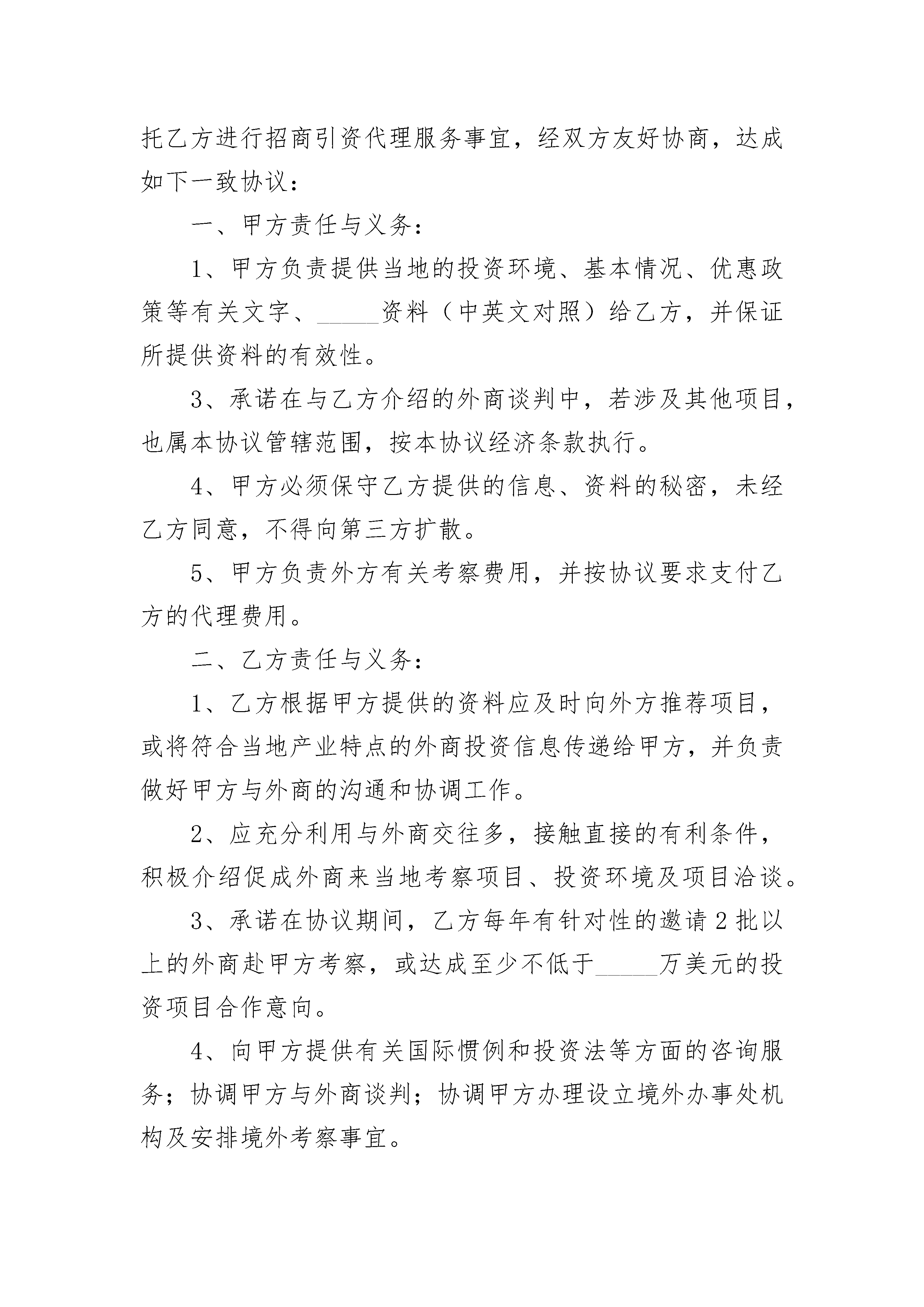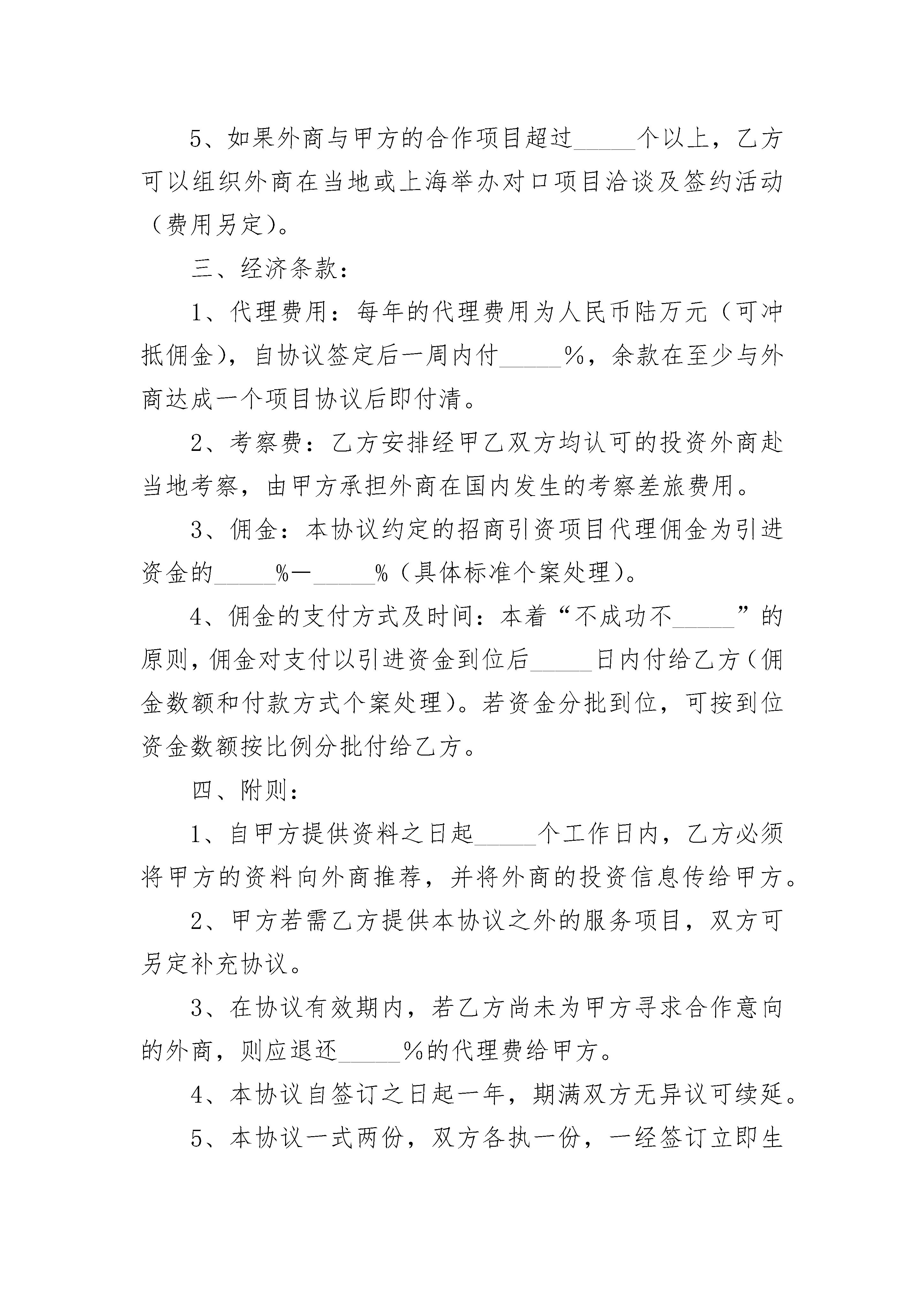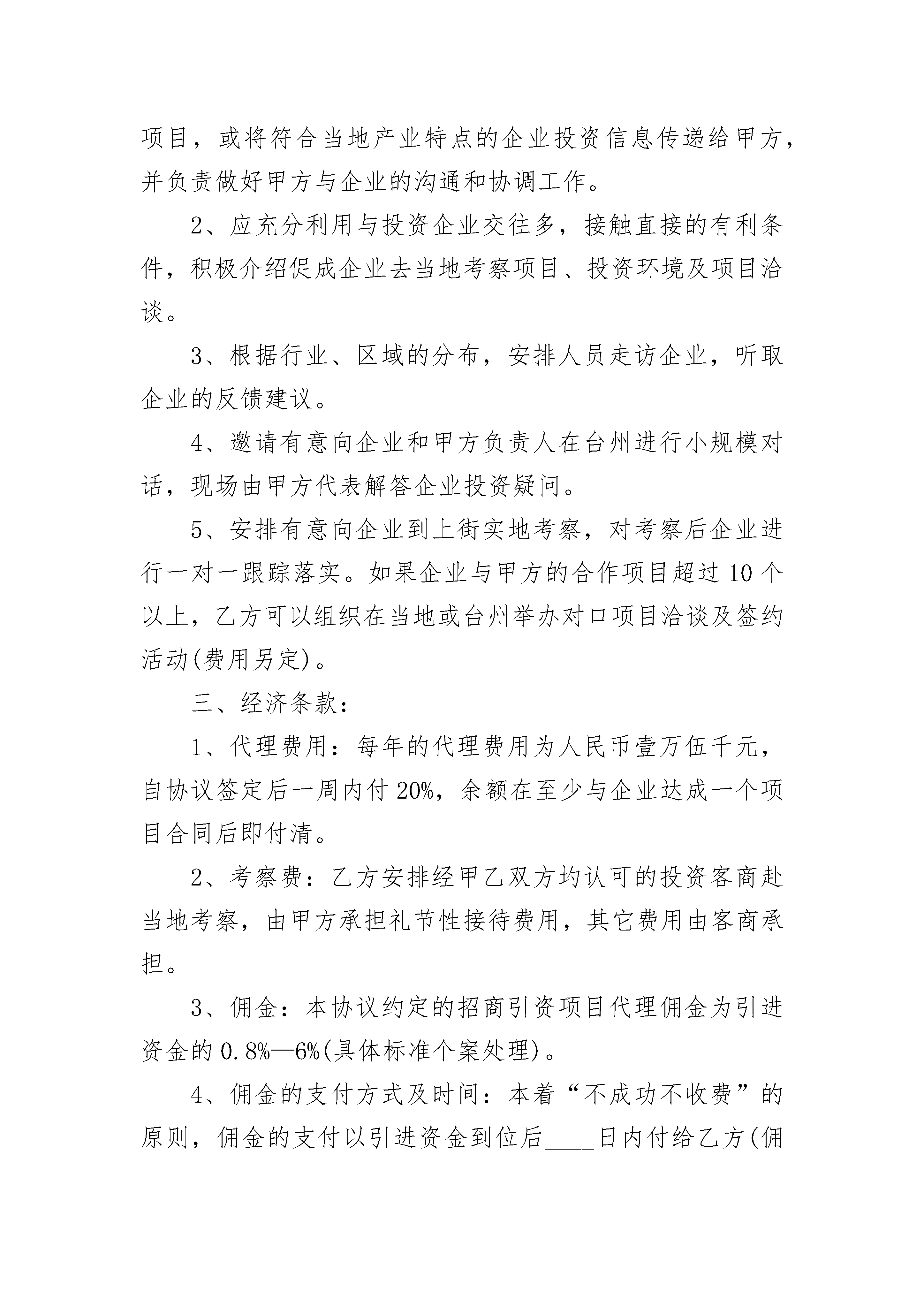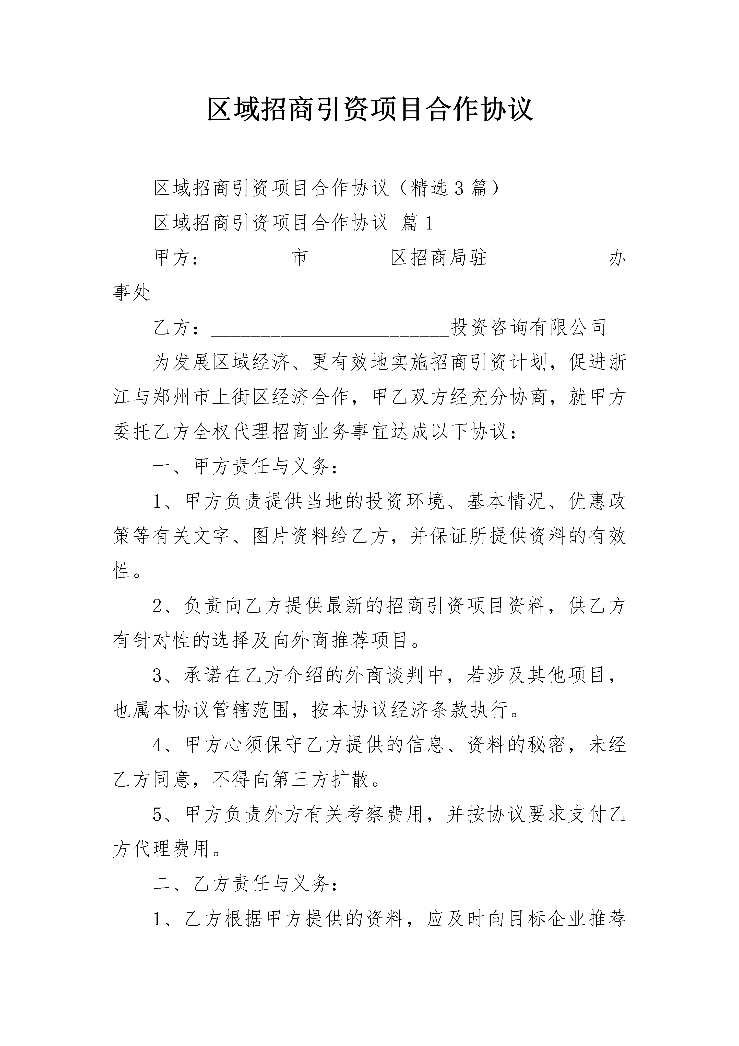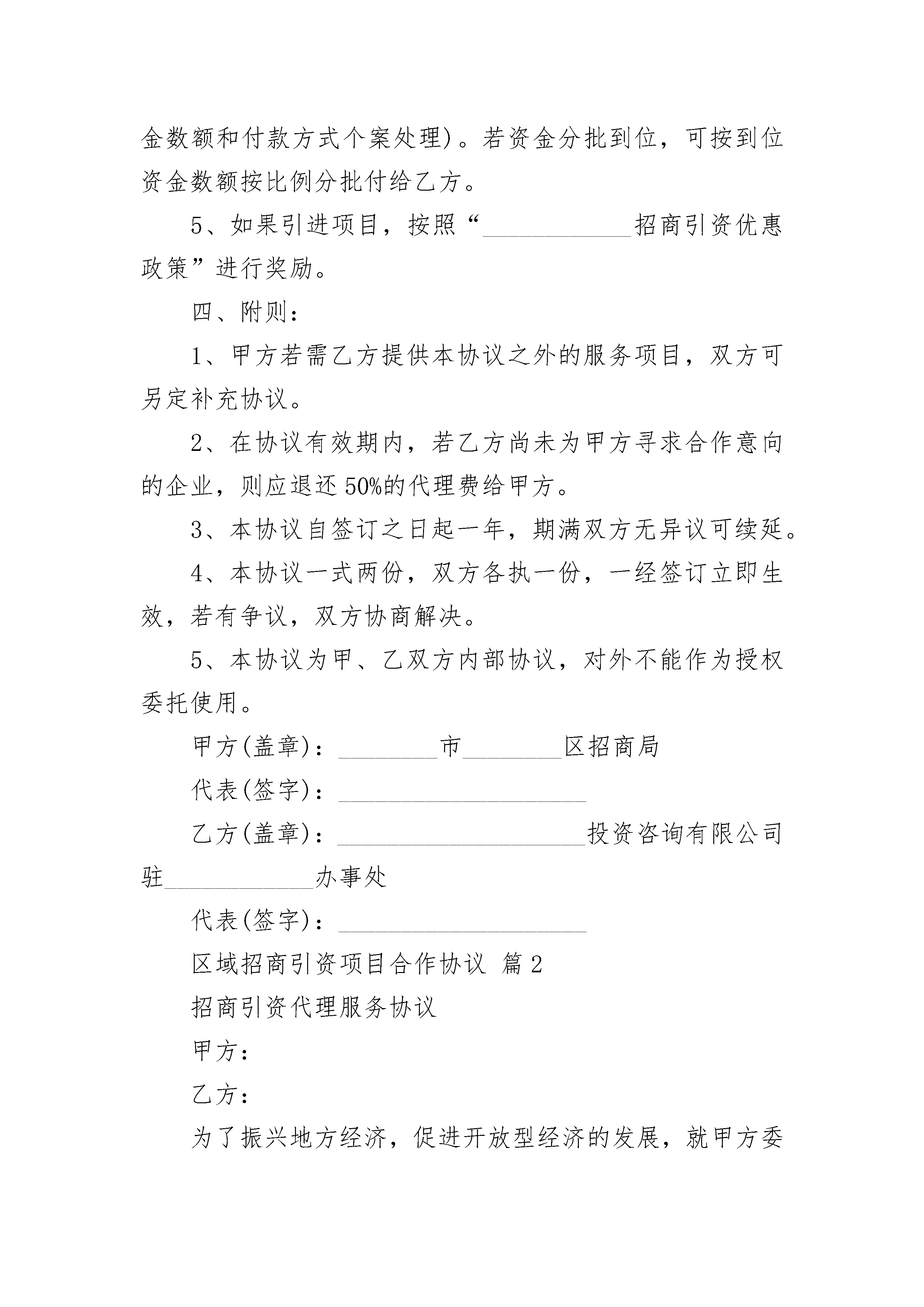 区域招商引资项目合作协议区域招商引资项目合作协议(精选3篇)区域招商引资项目合作协议篇1甲方:________市________区招商局驻____________办事处乙方:________________________投资咨询有限公司为发展区域经济、更有效地实施招商引资计划,促进浙江与郑州市上街区经济合作,甲乙双方经充分协商,就甲方委托乙方全权代理招商业务事宜达成以下协议:一、甲方责任与义务:1、甲方负责提供当地的投资环境、基本情况、优惠政策等有关文字、图片资料给乙方,并保证所提供资料的有效性。2、负责向乙方提供最新的招商引资项目资料,供乙方有针对性的选择及向外商推荐项目。3、承诺在乙方介绍的外商谈判中,若涉及其他项目,也属本协议管辖范围,按本协议经济条款执行。4、甲方心须保守乙方提供的信息、资料的秘密,未经乙方同意,不得向第三方扩散。5、甲方负责外方有关考察费用,并按协议要求支付乙方代理费用。二、乙方责任与义务:1、乙方根据甲方提供的资料,应及时向目标企业推荐项目,或将符合当地产业特点的企业投资信息传递给甲方,并负责做好甲方与企业的沟通和协调工作。2、应充分利用与投资企业交往多,接触直接的有利条件,积极介绍促成企业去当地考察项目、投资环境及项目洽谈。3、根据行业、区域的分布,安排人员走访企业,听取企业的反馈建议。4、邀请有意向企业和甲方负责人在台州进行小规模对话,现场由甲方代表解答企业投资疑问。5、安排有意向企业到上街实地考察,对考察后企业进行一对一跟踪落实。如果企业与甲方的合作项目超过10个以上,乙方可以组织在当地或台州举办对口项目洽谈及签约活动(费用另定)。三、经济条款:1、代理费用:每年的代理费用为人民币壹万伍千元,自协议签定后一周内付20%,余额在至少与企业达成一个项目合同后即付清。2、考察费:乙方安排经甲乙双方圴认可的投资客商赴当地考察,由甲方承担礼节性接待费用,其它费用由客商承担。3、佣金:本协议约定的招商引资项目代理佣金为引进资金的0.8%—6%(具体标准个案处理)。4、佣金的支付方式及时间:本着“不成功不收费”的原则,佣金的支付以引进资金到位后____日内付给乙方(佣金数额和付款方式个案处理)。若资金分批到位,可按到位资金数额按比例分批付给乙方。5、如果引进项目,按照“____________招商引资优惠政策”进行奖励。四、附则:1、甲方若需乙方提供本协议之外的服务项目,双方可另定补充协议。2、在协议有效期内,若乙方尚未为甲方寻求合作意向的企业,则应退还50%的代理费给甲方。3、本协议自签订之日起一年,期满双方无异议可续延。4、本协议一式两份,双方各执一份,一经签订立即生效,若有争议,双方协商解决。5、本协议为甲、乙双方内部协议,对外不能作为授权委托使用。甲方(盖章):________市________区招商局代表(签字):____________________乙方(盖章):____________________投资咨询有限公司驻____________办事处代表(签字):____________________区域招商引资项目合作协议篇2招商引资代理服务协议甲方:乙方:为了振兴地方经济,促进开放型经济的发展,就甲方委托乙方进行招商引资代理服务事宜,经双方友好协商,达成如下一致协议:一、甲方责任与义务:1、甲方负责提供当地的投资环境、基本情况、优惠政策等有关文字、_____资料(中英文对照)给乙方,并保证所提供资料的有效性。3、承诺在与乙方介绍的外商谈判中,若涉及其他项目,也属本协议管辖范围,按本协议经济条款执行。4、甲方必须保守乙方提供的信息、资料的秘密,未经乙方同意,不得向第三方扩散。5、甲方负责外方有关考察费用,并按协议要求支付乙方的代理费用。二、乙方责任与义务:1、乙方根据甲方提供的资料应及时向外方推荐项目,或将符合当地产业特点的外商投资信息传递给甲方,并负责做好甲方与外商的沟通和协调工作。2、应充分利用与外商交往多,接触直接的有利条件,积极介绍促成外商来当地考察项目、投资环境及项目洽谈。3、承诺在协议期间,乙方每年有针对性的邀请2批以上的外商赴甲方考察,或达成至少不低于_____万美元的投资项目合作意向。4、向甲方提供有关国际惯例和投资法等方面的咨询服务;协调甲方与外商谈判;协调甲方办理设立境外办事处机构及安排境外考察事宜。5、如果外商与甲方的合作项目超过_____个以上,乙方可以组织外商在当地或上海举办对口项目洽谈及签约活动(费用另定)。三、经济条款:1、代理费用:每年的代理费用为人民币陆万元(可冲抵佣金),自协议签定后一周内付_____%,余款在至少与外商达成一个项目协议后即付清。2、考察费:乙方安排经甲乙双方均认可的投资外商赴当地考察,由甲方承担外商在国内发生的考察差旅费用。3、佣