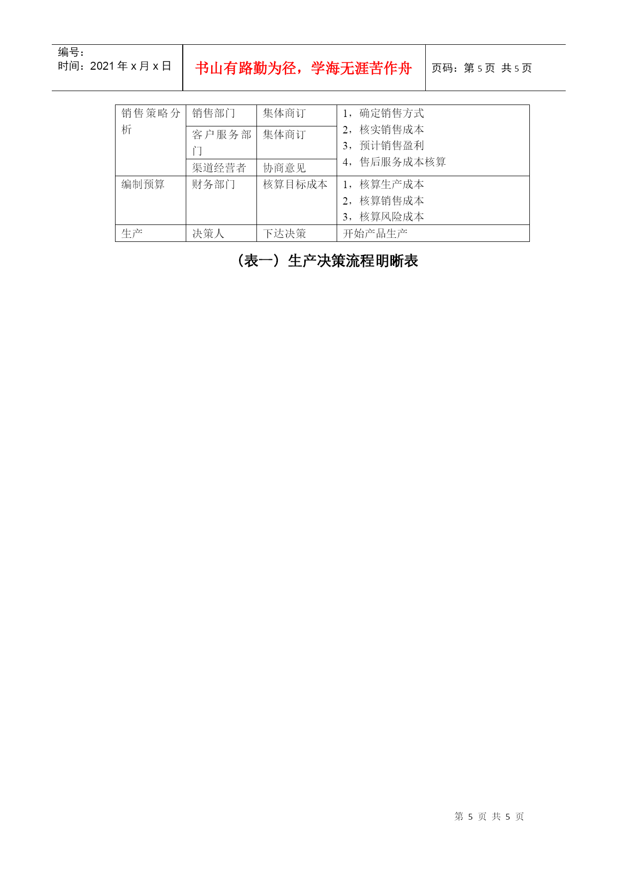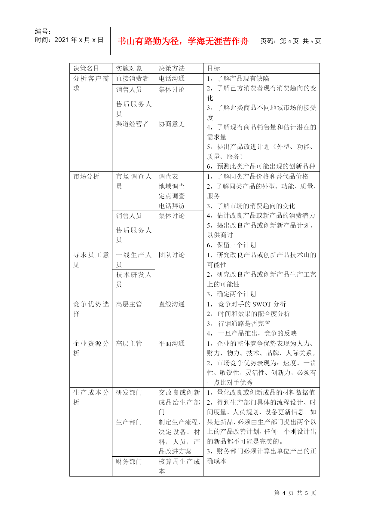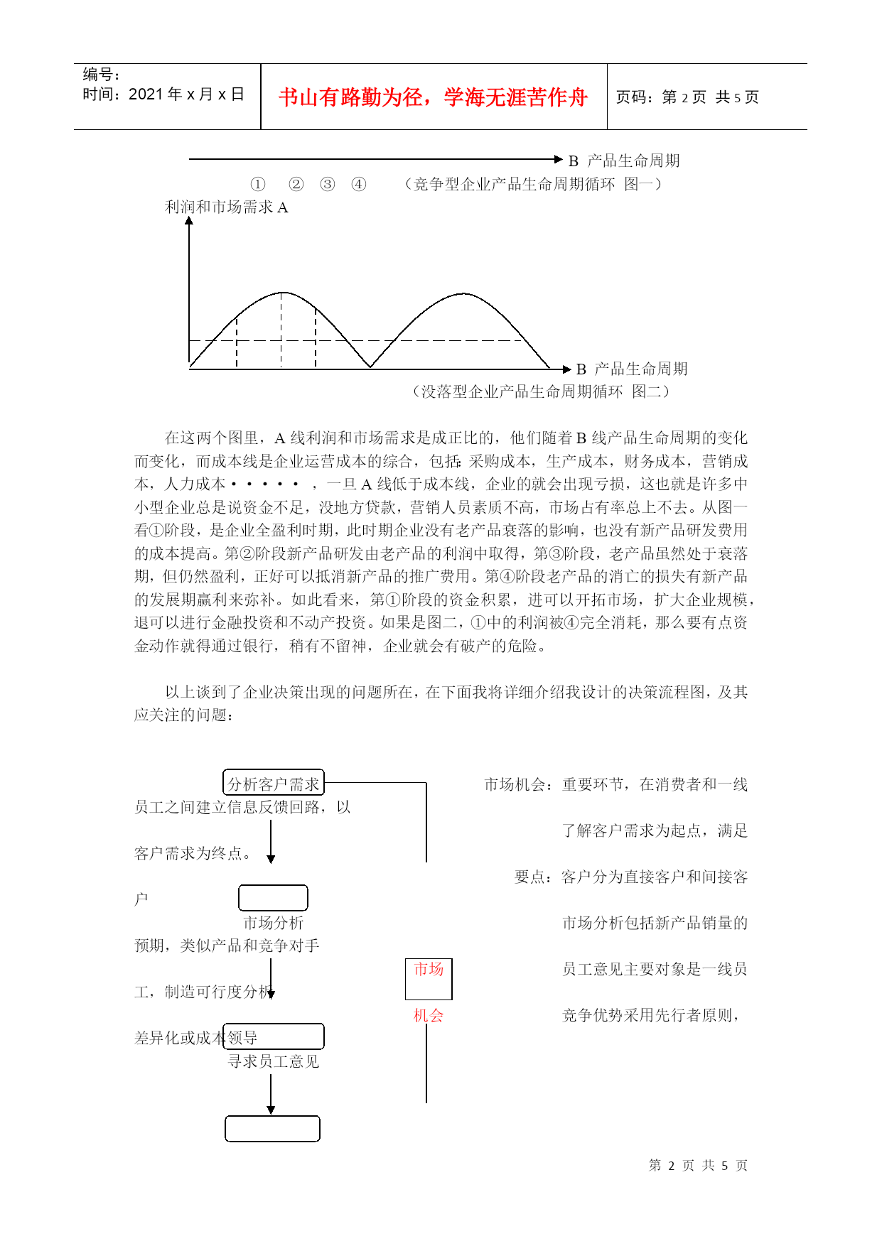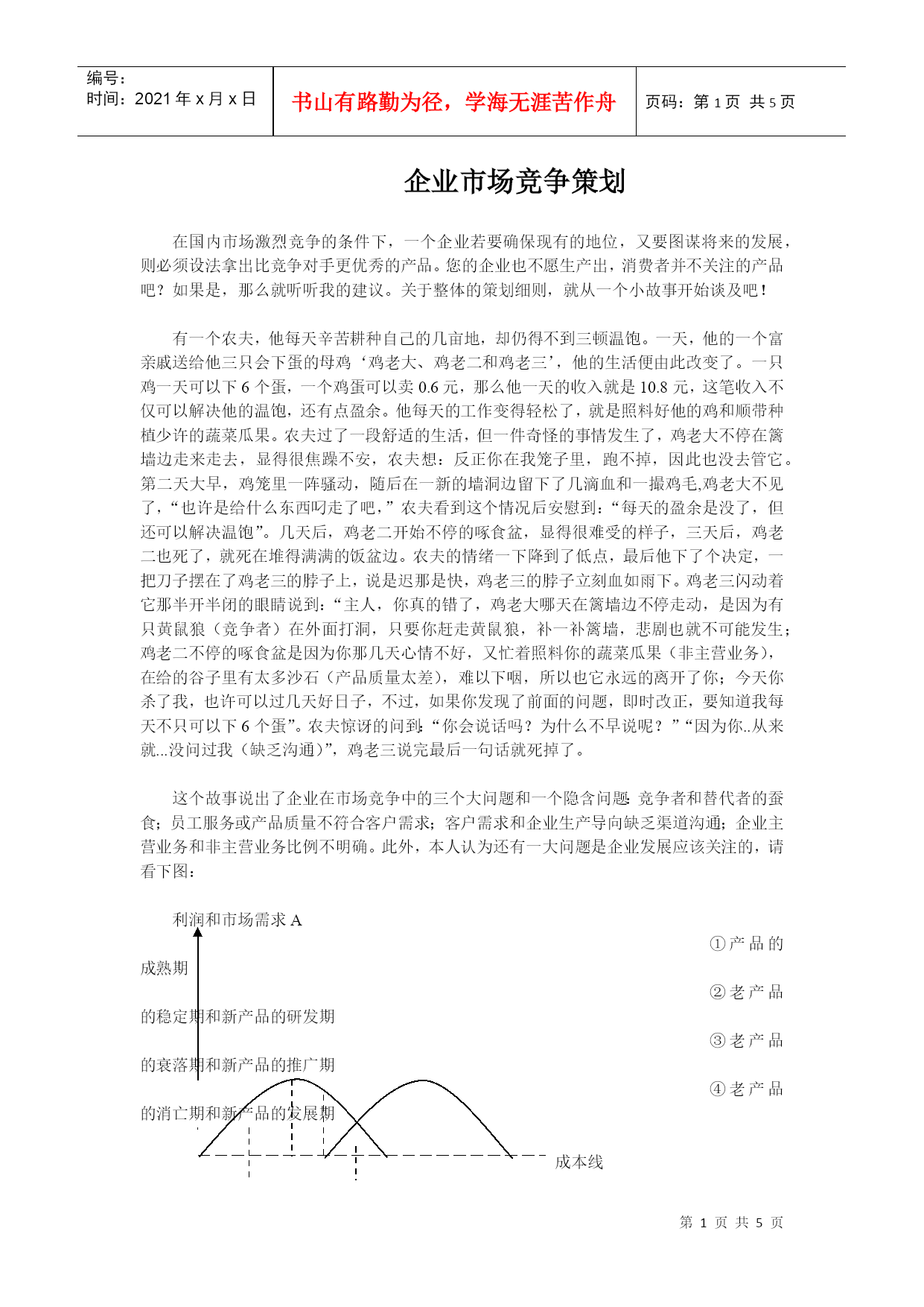 编号:时间:2021年x月x日书山有路勤为径,学海无涯苦作舟页码:第页共NUMPAGES5页第PAGE\*MERGEFORMAT5页共NUMPAGES\*MERGEFORMAT5页企业市场竞争策划在国内市场激烈竞争的条件下,一个企业若要确保现有的地位,又要图谋将来的发展,则必须设法拿出比竞争对手更优秀的产品。您的企业也不愿生产出,消费者并不关注的产品吧?如果是,那么就听听我的建议。关于整体的策划细则,就从一个小故事开始谈及吧!有一个农夫,他每天辛苦耕种自己的几亩地,却仍得不到三顿温饱。一天,他的一个富亲戚送给他三只会下蛋的母鸡‘鸡老大、鸡老二和鸡老三’,他的生活便由此改变了。一只鸡一天可以下6个蛋,一个鸡蛋可以卖0.6元,那么他一天的收入就是10.8元,这笔收入不仅可以解决他的温饱,还有点盈余。他每天的工作变得轻松了,就是照料好他的鸡和顺带种植少许的蔬菜瓜果。农夫过了一段舒适的生活,但一件奇怪的事情发生了,鸡老大不停在篱墙边走来走去,显得很焦躁不安,农夫想:反正你在我笼子里,跑不掉,因此也没去管它。第二天大早,鸡笼里一阵骚动,随后在一新的墙洞边留下了几滴血和一撮鸡毛,鸡老大不见了,“也许是给什么东西叼走了吧,”农夫看到这个情况后安慰到:“每天的盈余是没了,但还可以解决温饱”。几天后,鸡老二开始不停的啄食盆,显得很难受的样子,三天后,鸡老二也死了,就死在堆得满满的饭盆边。农夫的情绪一下降到了低点,最后他下了个决定,一把刀子摆在了鸡老三的脖子上,说是迟那是快,鸡老三的脖子立刻血如雨下。鸡老三闪动着它那半开半闭的眼睛说到:“主人,你真的错了,鸡老大哪天在篱墙边不停走动,是因为有只黄鼠狼(竞争者)在外面打洞,只要你赶走黄鼠狼,补一补篱墙,悲剧也就不可能发生;鸡老二不停的啄食盆是因为你那几天心情不好,又忙着照料你的蔬菜瓜果(非主营业务),在给的谷子里有太多沙石(产品质量太差),难以下咽,所以也它永远的离开了你;今天你杀了我,也许可以过几天好日子,不过,如果你发现了前面的问题,即时改正,要知道我每天不只可以下6个蛋”。农夫惊讶的问到:“你会说话吗?为什么不早说呢?”“因为你..从来就...没问过我(缺乏沟通)”,鸡老三说完最后一句话就死掉了。这个故事说出了企业在市场竞争中的三个大问题和一个隐含问题:竞争者和替代者的蚕食;员工服务或产品质量不符合客户需求;客户需求和企业生产导向缺乏渠道沟通;企业主营业务和非主营业务比例不明确。此外,本人认为还有一大问题是企业发展应该关注的,请看下图:利润和市场需求A①产品的成熟期②老产品的稳定期和新产品的研发期③老产品的衰落期和新产品的推广期④老产品的消亡期和新产品的发展期成本线B产品生命周期①②③④(竞争型企业产品生命周期循环图一)利润和市场需求AB产品生命周期(没落型企业产品生命周期循环图二)在这两个图里,A线利润和市场需求是成正比的,他们随着B线产品生命周期的变化而变化,而成本线是企业运营成本的综合,包括:采购成本,生产成本,财务成本,营销成本,人力成本·····,一旦A线低于成本线,企业的就会出现亏损,这也就是许多中小型企业总是说资金不足,没地方贷款,营销人员素质不高,市场占有率总上不去。从图一看①阶段,是企业全盈利时期,此时期企业没有老产品衰落的影响,也没有新产品研发费用的成本提高。第②阶段新产品研发由老产品的利润中取得,第③阶段,老产品虽然处于衰落期,但仍然盈利,正好可以抵消新产品的推广费用。第④阶段老产品的消亡的损失有新产品的发展期赢利来弥补。如此看来,第①阶段的资金积累,进可以开拓市场,扩大企业规模,退可以进行金融投资和不动产投资。如果是图二,①中的利润被④完全消耗,那么要有点资金动作就得通过银行,稍有不留神,企业就会有破产的危险。以上谈到了企业决策出现的问题所在,在下面我将详细介绍我设计的决策流程图,及其应关注的问题:分析客户需求市场机会:重要环节,在消费者和一线员工之间建立信息反馈回路,以了解客户需求为起点,满足客户需求为终点。要点:客户分为直接客户和间接客户市场分析市场分析包括新产品销量的预期,类似产品和竞争对手市场员工意见主要对象是一线员工,制造可行度分析机会竞争优势采用先行者原则,差异化或成本领导寻求员工意见竞争优势选择企业资源分析核心竞争力:研究企业是否具有生产此项产品的实力。核心要点:企业有形优势表现为人力,财力,物力,技术,品牌,人际生产成本分析竞争力关系;无形的竞争力表现在速度、一贯性、敏锐性、灵活性、创造性销售策略分析编制预算财务决策注意事项:必须预算营销成本和销售盈利生产生产决策(图三)企业生产决策流程此流程图主要针对企业的两项生产决策,一方面是现有产品的改良以及同质产品生产线的扩张,即根据客户需求变化,在保留原有核心技术的同时,对产品