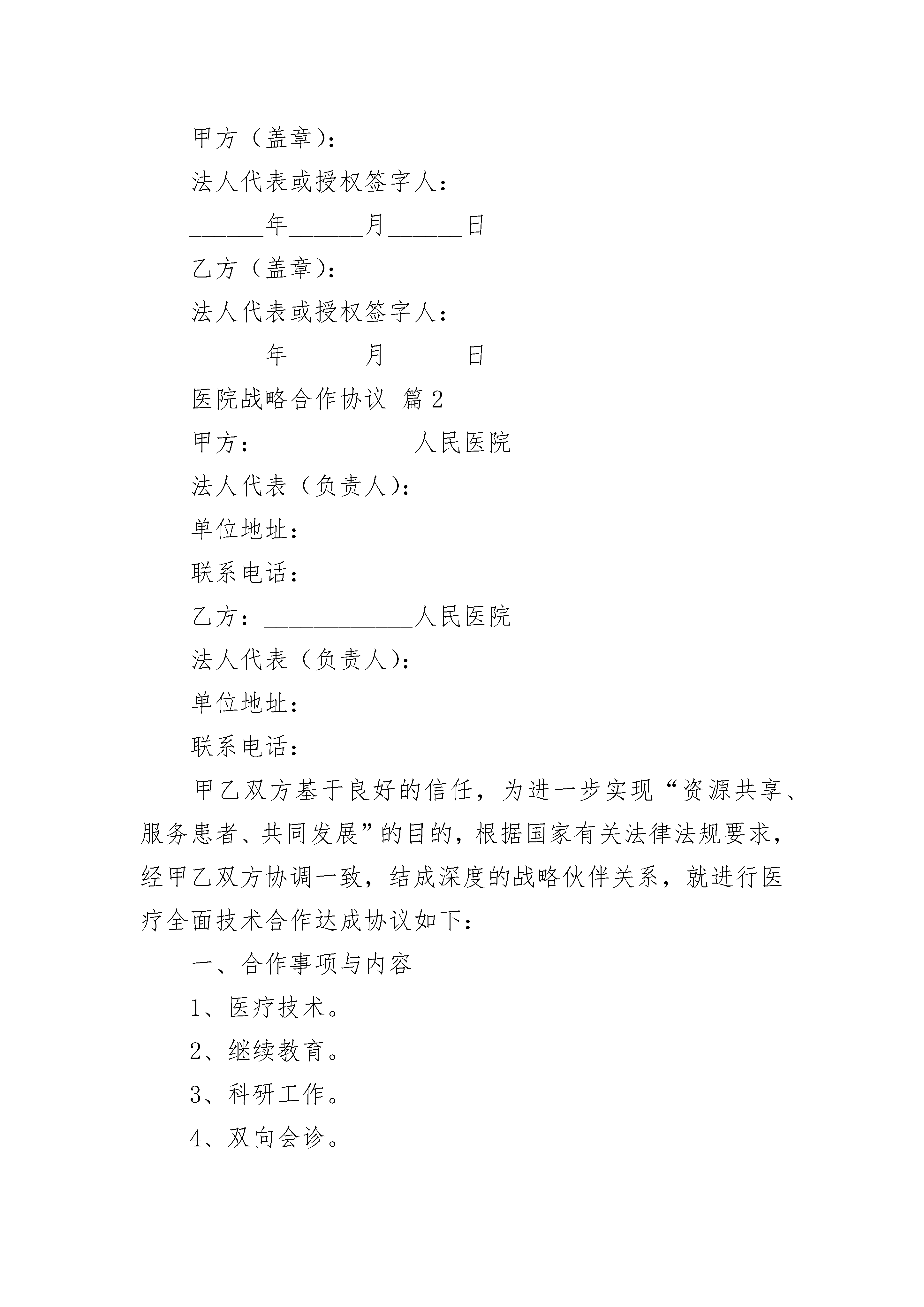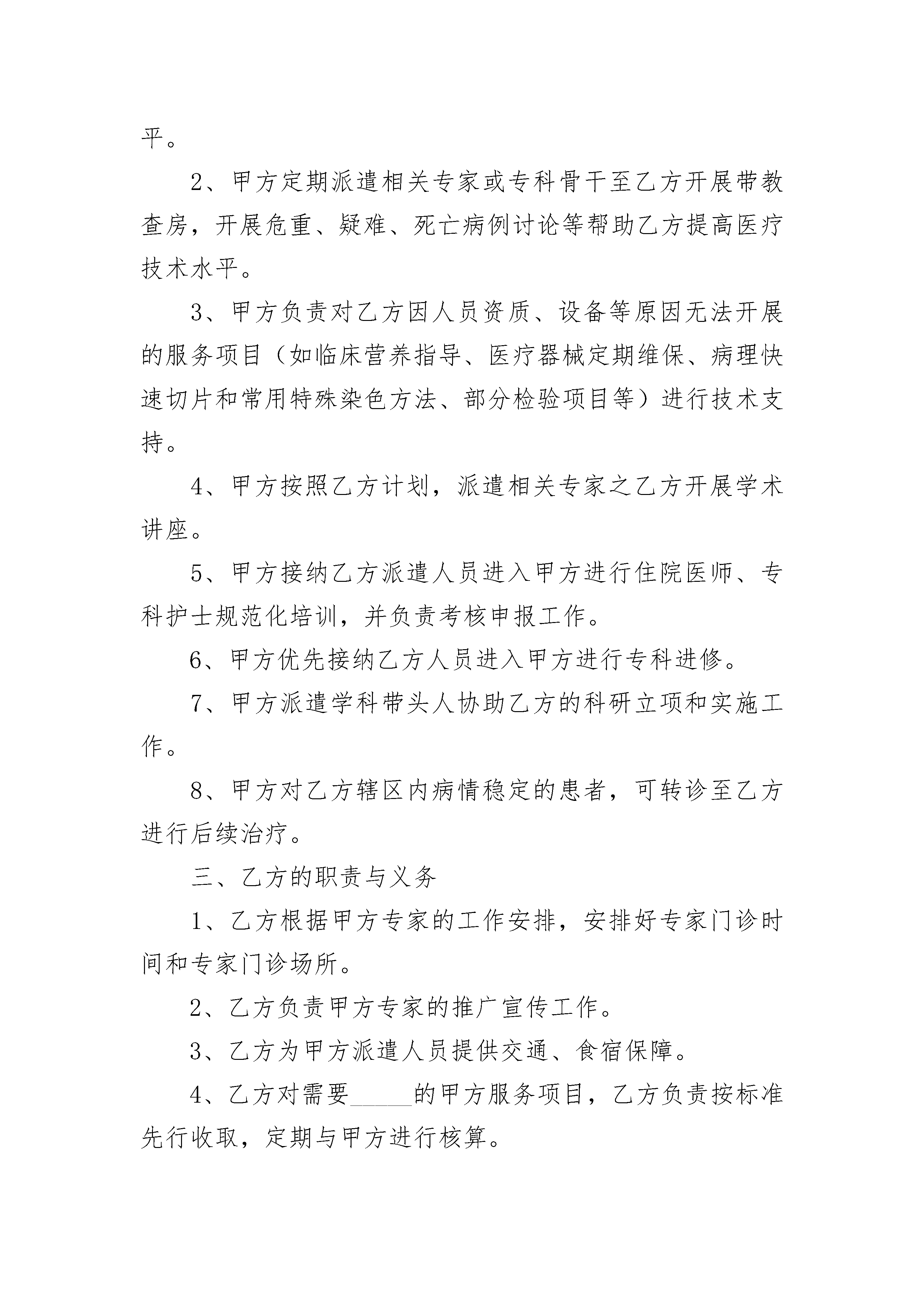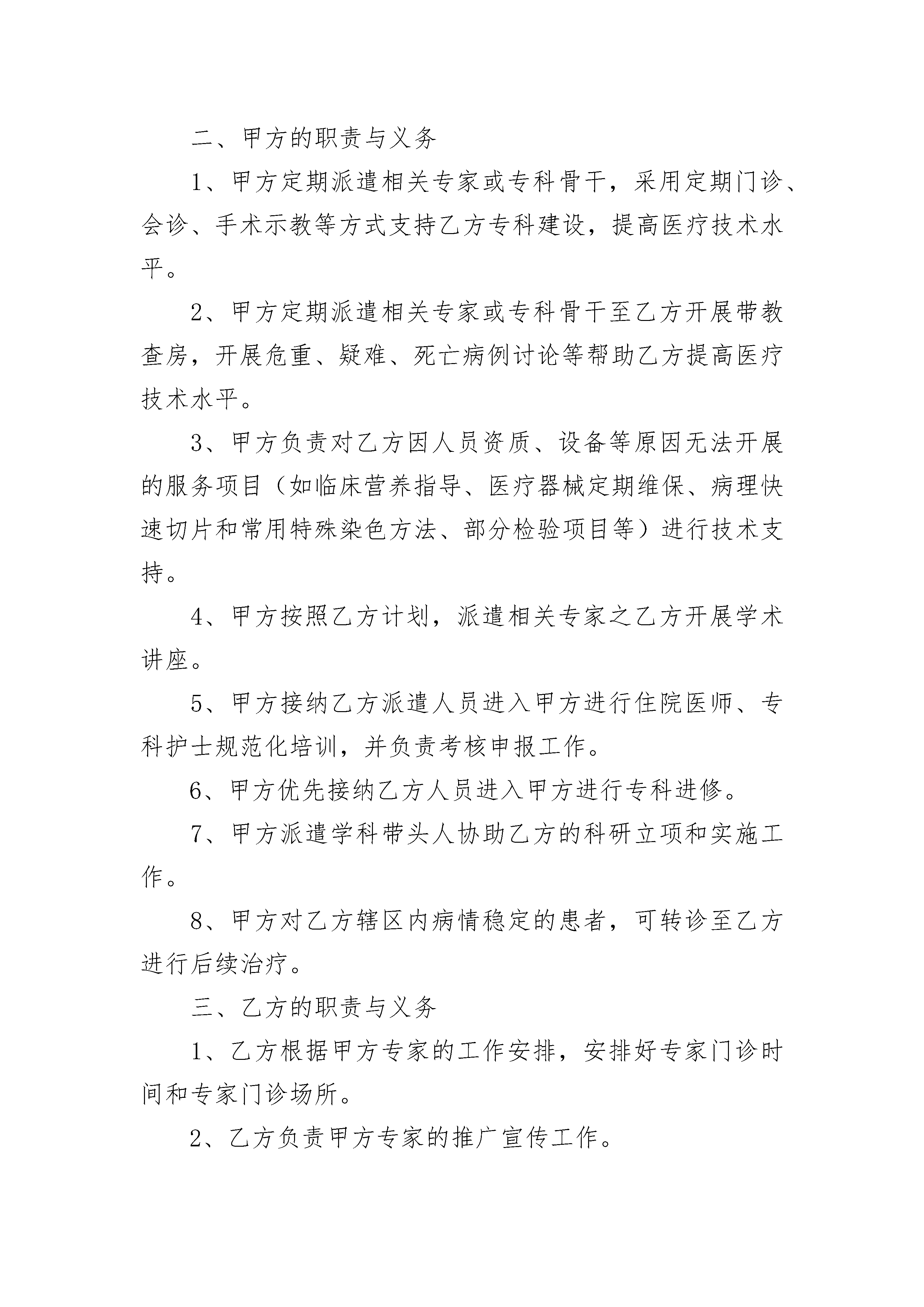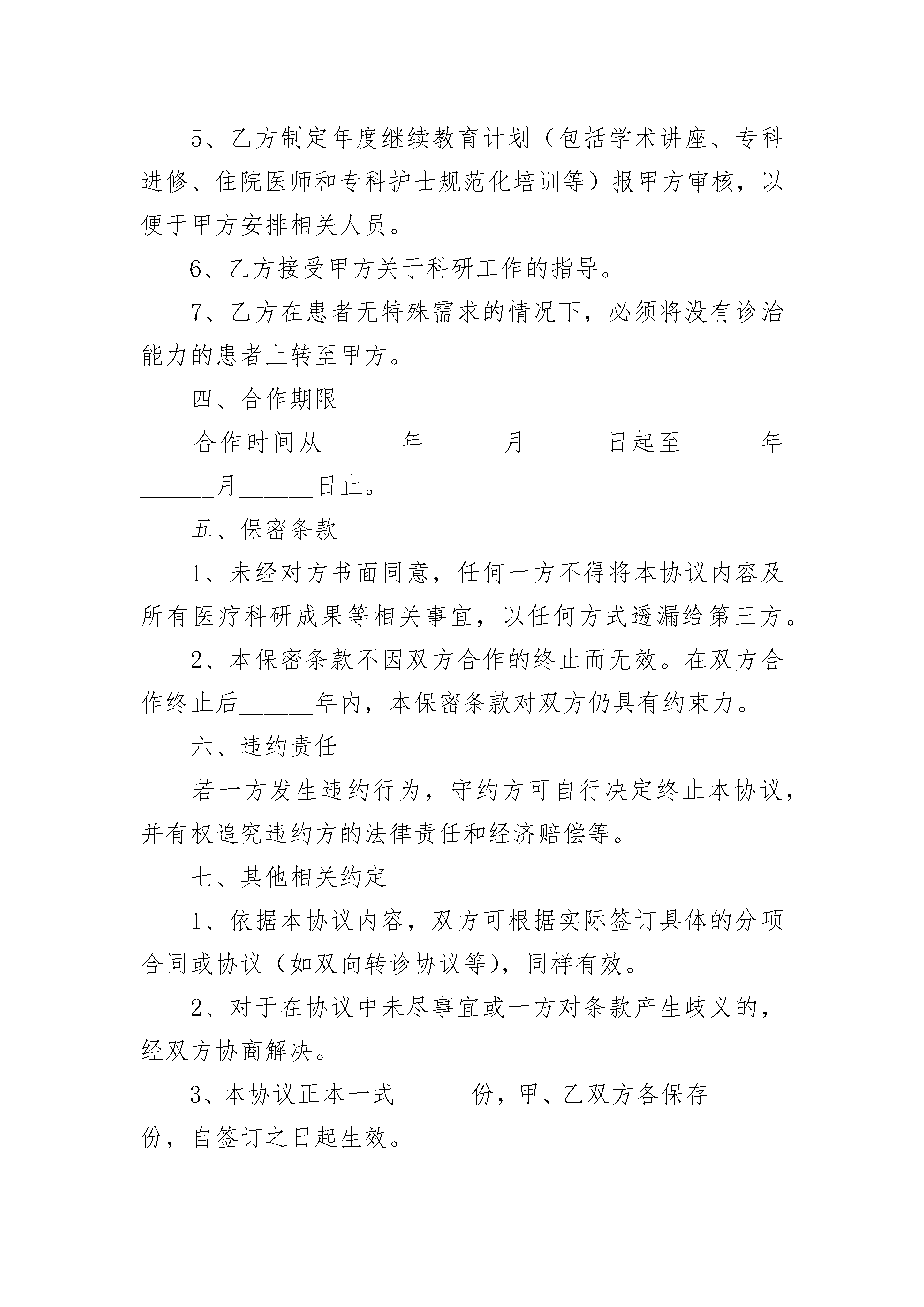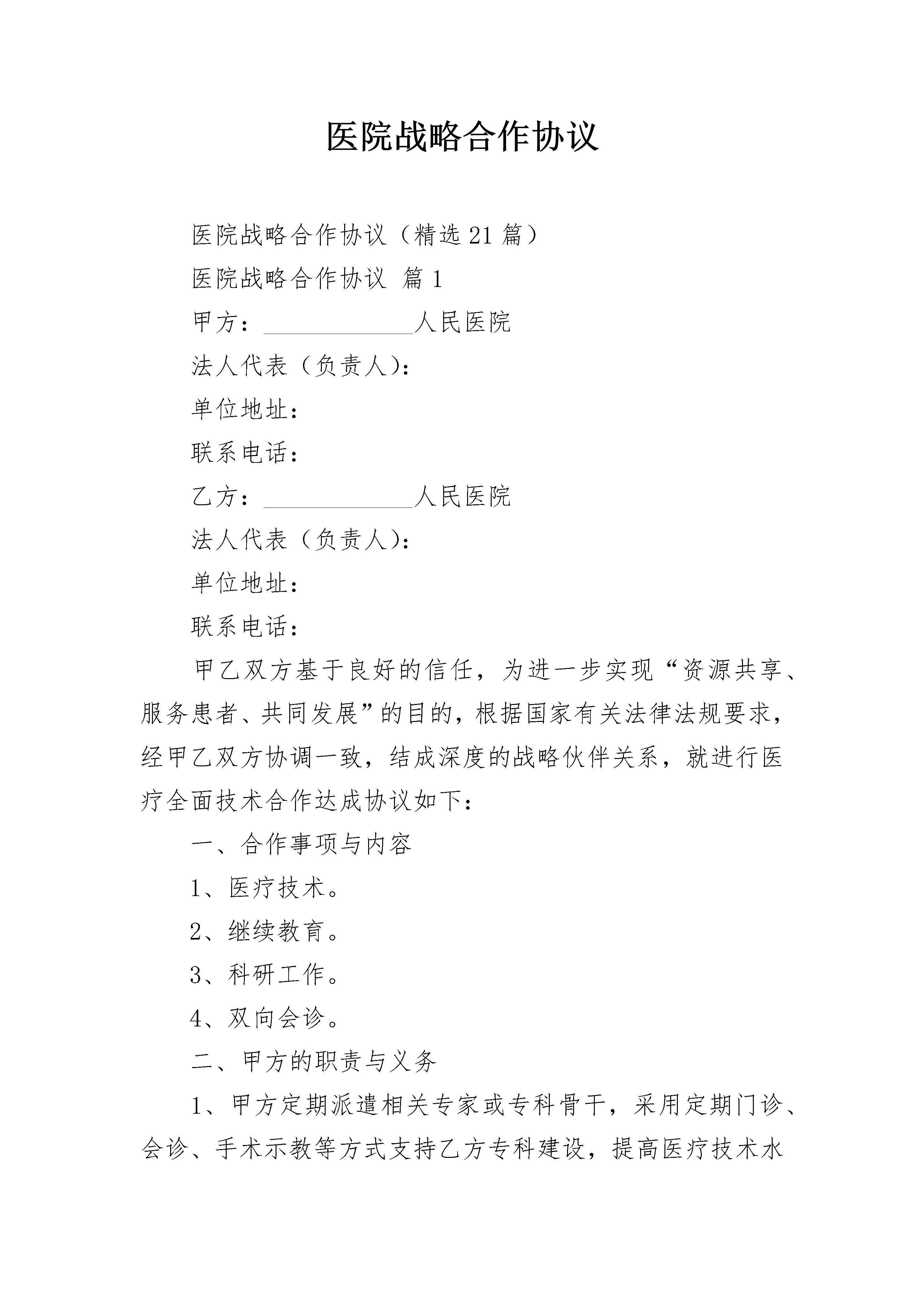 医院战略合作协议医院战略合作协议(精选21篇)医院战略合作协议篇1甲方:____________人民医院法人代表(负责人):单位地址:联系电话:乙方:____________人民医院法人代表(负责人):单位地址:联系电话:甲乙双方基于良好的信任,为进一步实现“资源共享、服务患者、共同发展”的目的,根据国家有关法律法规要求,经甲乙双方协调一致,结成深度的战略伙伴关系,就进行医疗全面技术合作达成协议如下:一、合作事项与内容1、医疗技术。2、继续教育。3、科研工作。4、双向会诊。二、甲方的职责与义务1、甲方定期派遣相关专家或专科骨干,采用定期门诊、会诊、手术示教等方式支持乙方专科建设,提高医疗技术水平。2、甲方定期派遣相关专家或专科骨干至乙方开展带教查房,开展危重、疑难、死亡病例讨论等帮助乙方提高医疗技术水平。3、甲方负责对乙方因人员资质、设备等原因无法开展的服务项目(如临床营养指导、医疗器械定期维保、病理快速切片和常用特殊染色方法、部分检验项目等)进行技术支持。4、甲方按照乙方计划,派遣相关专家之乙方开展学术讲座。5、甲方接纳乙方派遣人员进入甲方进行住院医师、专科护士规范化培训,并负责考核申报工作。6、甲方优先接纳乙方人员进入甲方进行专科进修。7、甲方派遣学科带头人协助乙方的科研立项和实施工作。8、甲方对乙方辖区内病情稳定的患者,可转诊至乙方进行后续治疗。三、乙方的职责与义务1、乙方根据甲方专家的工作安排,安排好专家门诊时间和专家门诊场所。2、乙方负责甲方专家的推广宣传工作。3、乙方为甲方派遣人员提供交通、食宿保障。4、乙方对需要_____的甲方服务项目,乙方负责按标准先行收取,定期与甲方进行核算。5、乙方制定年度继续教育计划(包括学术讲座、专科进修、住院医师和专科护士规范化培训等)报甲方审核,以便于甲方安排相关人员。6、乙方接受甲方关于科研工作的指导。7、乙方在患者无特殊需求的情况下,必须将没有诊治能力的患者上转至甲方。四、合作期限合作时间从______年______月______日起至______年______月______日止。五、保密条款1、未经对方书面同意,任何一方不得将本协议内容及所有医疗科研成果等相关事宜,以任何方式透漏给第三方。2、本保密条款不因双方合作的终止而无效。在双方合作终止后______年内,本保密条款对双方仍具有约束力。六、违约责任若一方发生违约行为,守约方可自行决定终止本协议,并有权追究违约方的法律责任和经济赔偿等。七、其他相关约定1、依据本协议内容,双方可根据实际签订具体的分项合同或协议(如双向转诊协议等),同样有效。2、对于在协议中未尽事宜或一方对条款产生歧义的,经双方协商解决。3、本协议正本一式______份,甲、乙双方各保存______份,自签订之日起生效。甲方(盖章):法人代表或授权签字人:______年______月______日乙方(盖章):法人代表或授权签字人:______年______月______日医院战略合作协议篇2甲方:____________人民医院法人代表(负责人):单位地址:联系电话:乙方:____________人民医院法人代表(负责人):单位地址:联系电话:甲乙双方基于良好的信任,为进一步实现“资源共享、服务患者、共同发展”的目的,根据国家有关法律法规要求,经甲乙双方协调一致,结成深度的战略伙伴关系,就进行医疗全面技术合作达成协议如下:一、合作事项与内容1、医疗技术。2、继续教育。3、科研工作。4、双向会诊。二、甲方的职责与义务1、甲方定期派遣相关专家或专科骨干,采用定期门诊、会诊、手术示教等方式支持乙方专科建设,提高医疗技术水平。2、甲方定期派遣相关专家或专科骨干至乙方开展带教查房,开展危重、疑难、死亡病例讨论等帮助乙方提高医疗技术水平。3、甲方负责对乙方因人员资质、设备等原因无法开展的服务项目(如临床营养指导、医疗器械定期维保、病理快速切片和常用特殊染色方法、部分检验项目等)进行技术支持。4、甲方按照乙方计划,派遣相关专家之乙方开展学术讲座。5、甲方接纳乙方派遣人员进入甲方进行住院医师、专科护士规范化培训,并负责考核申报工作。6、甲方优先接纳乙方人员进入甲方进行专科进修。7、甲方派遣学科带头人协助乙方的科研立项和实施工作。8、甲方对乙方辖区内病情稳定的患者,可转诊至乙方进行后续治疗。三、乙方的职责与义务1、乙方根据甲方专家的工作安排,安排好专家门诊时间和专家门诊场所。2、乙方负责甲方专家的推广宣传工作。3、乙方为甲方派遣人员提供交通、食宿保障。4、乙方对需要收费的甲方服务项目,乙方负责按标准先行收取,定期与甲方进行核算。5、乙方制定年度继续教育计划(包括学术讲座、专科进修、住院医师和专科护士规范化培训等)报甲方审核,以便于甲方安排相关人员。6、乙方接受甲方关于科
