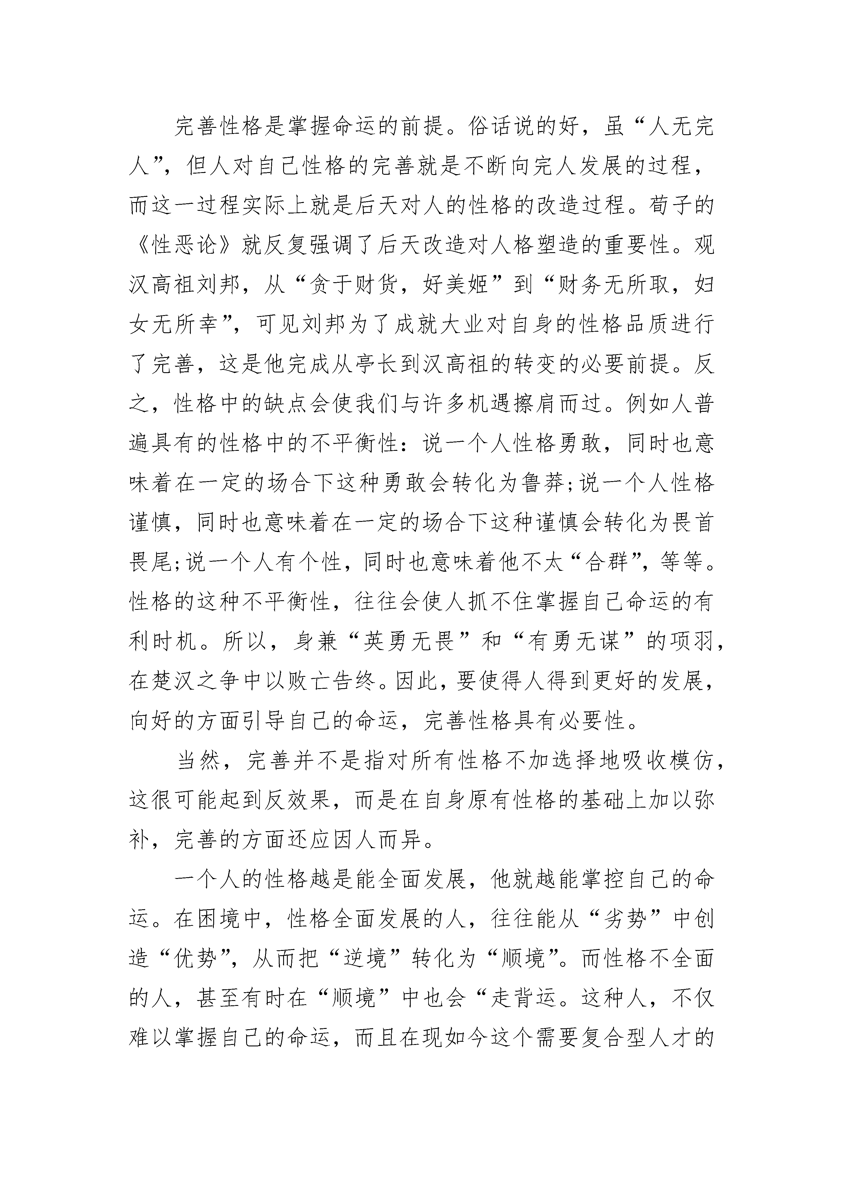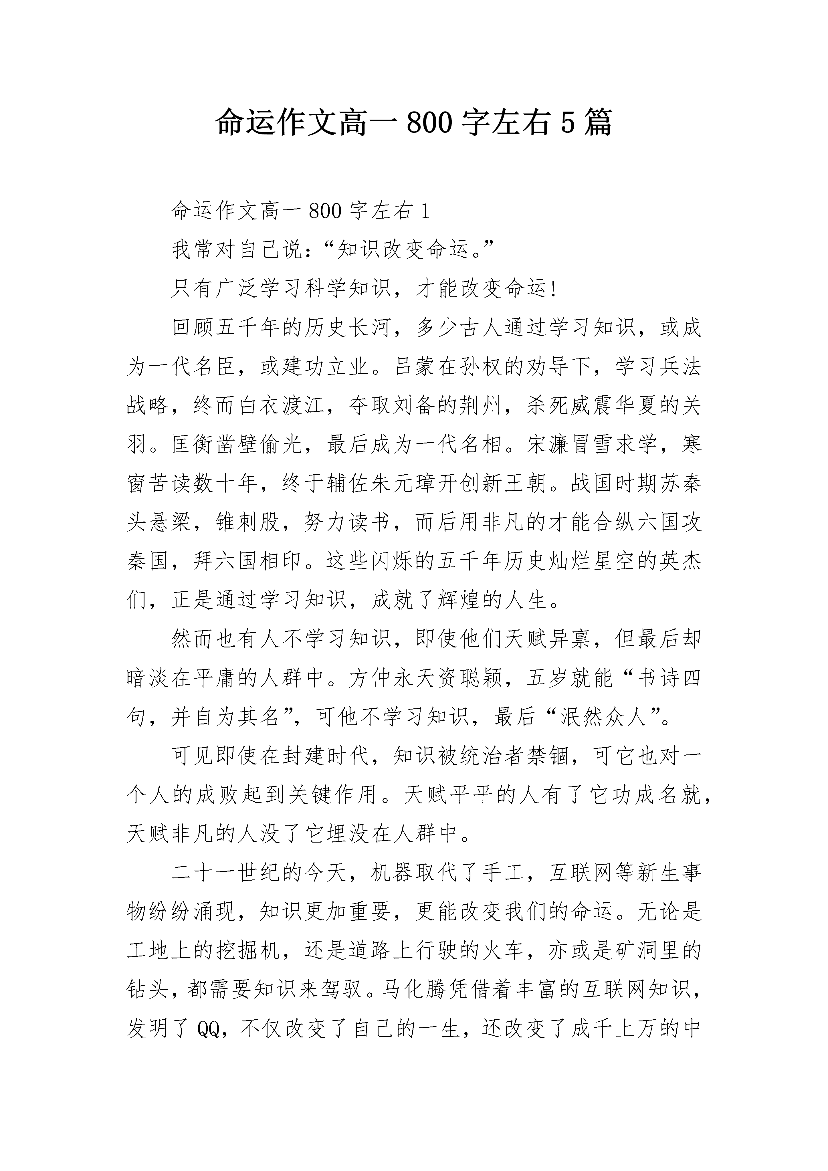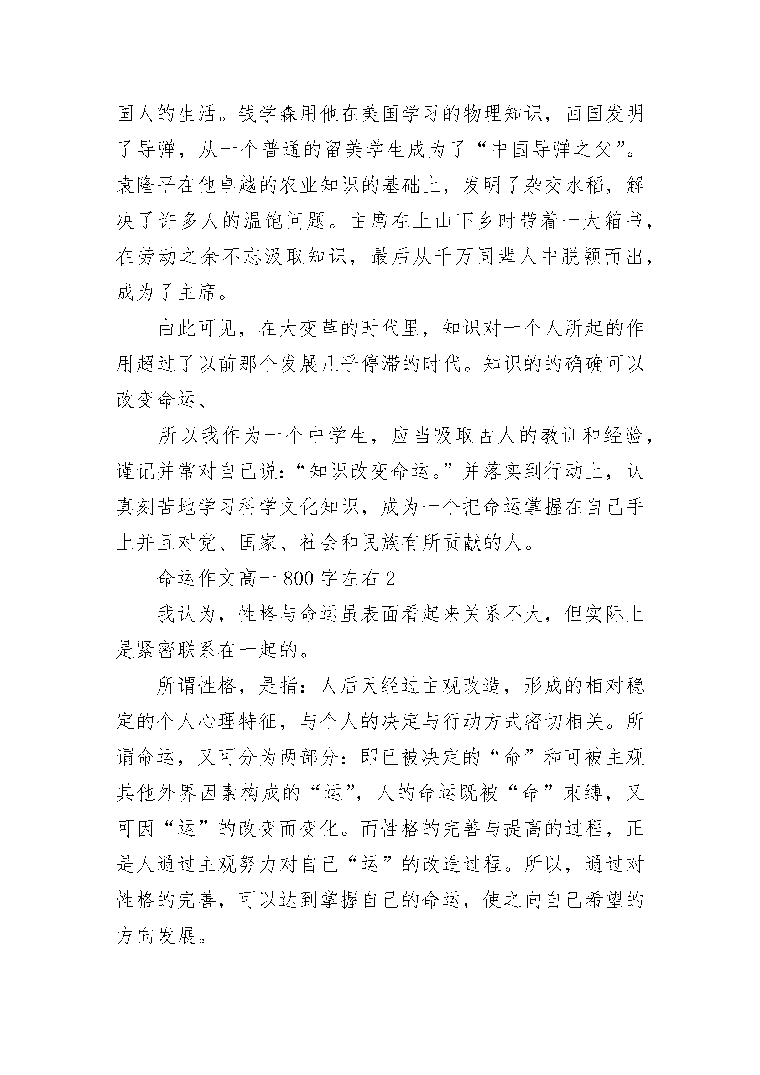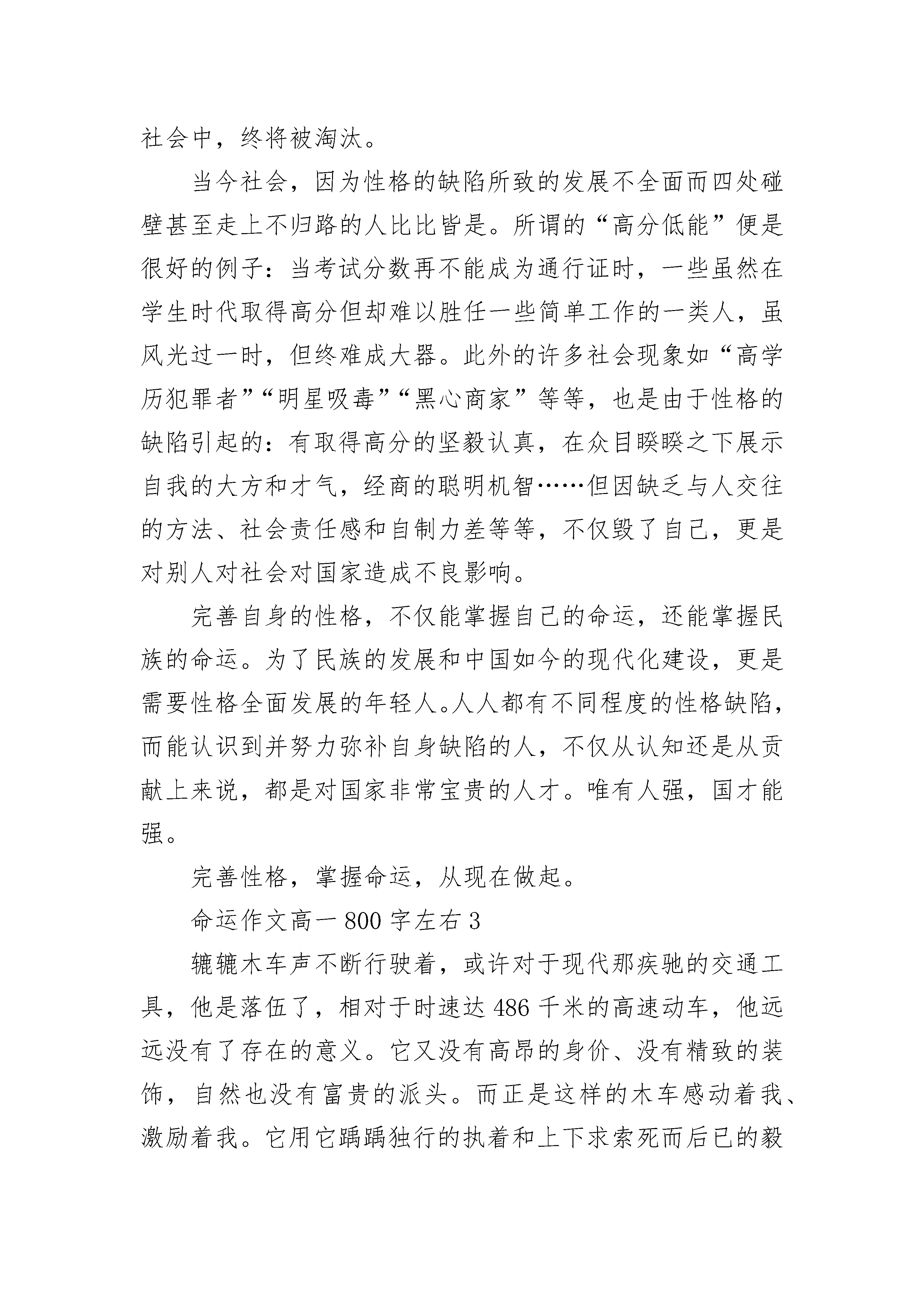 命运作文高一800字左右5篇命运作文高一800字左右1我常对自己说:“知识改变命运。”只有广泛学习科学知识,才能改变命运!回顾五千年的历史长河,多少古人通过学习知识,或成为一代名臣,或建功立业。吕蒙在孙权的劝导下,学习兵法战略,终而白衣渡江,夺取刘备的荆州,杀死威震华夏的关羽。匡衡凿壁偷光,最后成为一代名相。宋濂冒雪求学,寒窗苦读数十年,终于辅佐朱元璋开创新王朝。战国时期苏秦头悬梁,锥刺股,努力读书,而后用非凡的才能合纵六国攻秦国,拜六国相印。这些闪烁的五千年历史灿烂星空的英杰们,正是通过学习知识,成就了辉煌的人生。然而也有人不学习知识,即使他们天赋异禀,但最后却暗淡在平庸的人群中。方仲永天资聪颖,五岁就能“书诗四句,并自为其名”,可他不学习知识,最后“泯然众人”。可见即使在封建时代,知识被统治者禁锢,可它也对一个人的成败起到关键作用。天赋平平的人有了它功成名就,天赋非凡的人没了它埋没在人群中。二十一世纪的今天,机器取代了手工,互联网等新生事物纷纷涌现,知识更加重要,更能改变我们的命运。无论是工地上的挖掘机,还是道路上行驶的火车,亦或是矿洞里的钻头,都需要知识来驾驭。马化腾凭借着丰富的互联网知识,发明了QQ,不仅改变了自己的一生,还改变了成千上万的中国人的生活。钱学森用他在美国学习的物理知识,回国发明了导弹,从一个普通的留美学生成为了“中国导弹之父”。袁隆平在他卓越的农业知识的基础上,发明了杂交水稻,解决了许多人的温饱问题。主席在上山下乡时带着一大箱书,在劳动之余不忘汲取知识,最后从千万同辈人中脱颖而出,成为了主席。由此可见,在大变革的时代里,知识对一个人所起的作用超过了以前那个发展几乎停滞的时代。知识的的确确可以改变命运、所以我作为一个中学生,应当吸取古人的教训和经验,谨记并常对自己说:“知识改变命运。”并落实到行动上,认真刻苦地学习科学文化知识,成为一个把命运掌握在自己手上并且对党、国家、社会和民族有所贡献的人。命运作文高一800字左右2我认为,性格与命运虽表面看起来关系不大,但实际上是紧密联系在一起的。所谓性格,是指:人后天经过主观改造,形成的相对稳定的个人心理特征,与个人的决定与行动方式密切相关。所谓命运,又可分为两部分:即已被决定的“命”和可被主观其他外界因素构成的“运”,人的命运既被“命”束缚,又可因“运”的改变而变化。而性格的完善与提高的过程,正是人通过主观努力对自己“运”的改造过程。所以,通过对性格的完善,可以达到掌握自己的命运,使之向自己希望的方向发展。完善性格是掌握命运的前提。俗话说的好,虽“人无完人”,但人对自己性格的完善就是不断向完人发展的过程,而这一过程实际上就是后天对人的性格的改造过程。荀子的《性恶论》就反复强调了后天改造对人格塑造的重要性。观汉高祖刘邦,从“贪于财货,好美姬”到“财务无所取,妇女无所幸”,可见刘邦为了成就大业对自身的性格品质进行了完善,这是他完成从亭长到汉高祖的转变的必要前提。反之,性格中的缺点会使我们与许多机遇擦肩而过。例如人普遍具有的性格中的不平衡性:说一个人性格勇敢,同时也意味着在一定的场合下这种勇敢会转化为鲁莽;说一个人性格谨慎,同时也意味着在一定的场合下这种谨慎会转化为畏首畏尾;说一个人有个性,同时也意味着他不太“合群”,等等。性格的这种不平衡性,往往会使人抓不住掌握自己命运的有利时机。所以,身兼“英勇无畏”和“有勇无谋”的项羽,在楚汉之争中以败亡告终。因此,要使得人得到更好的发展,向好的方面引导自己的命运,完善性格具有必要性。当然,完善并不是指对所有性格不加选择地吸收模仿,这很可能起到反效果,而是在自身原有性格的基础上加以弥补,完善的方面还应因人而异。一个人的性格越是能全面发展,他就越能掌控自己的命运。在困境中,性格全面发展的人,往往能从“劣势”中创造“优势”,从而把“逆境”转化为“顺境”。而性格不全面的人,甚至有时在“顺境”中也会“走背运。这种人,不仅难以掌握自己的命运,而且在现如今这个需要复合型人才的社会中,终将被淘汰。当今社会,因为性格的缺陷所致的发展不全面而四处碰壁甚至走上不归路的人比比皆是。所谓的“高分低能”便是很好的例子:当考试分数再不能成为通行证时,一些虽然在学生时代取得高分但却难以胜任一些简单工作的一类人,虽风光过一时,但终难成大器。此外的许多社会现象如“高学历犯罪者”“明星吸毒”“黑心商家”等等,也是由于性格的缺陷引起的:有取得高分的坚毅认真,在众目睽睽之下展示自我的大方和才气,经商的聪明机智……但因缺乏与人交往的方法、社会责任感和自制力差等等,不仅毁了自己,更是对别人对社会对国家造成不良影响。完善自身的性格,不仅能掌握自己的命运,还能掌握民族的命运。为了民族的发展和中国如今的现代化建设,更是需要性格全面发展的年轻人。人人都有不同程度的性格缺陷,而
