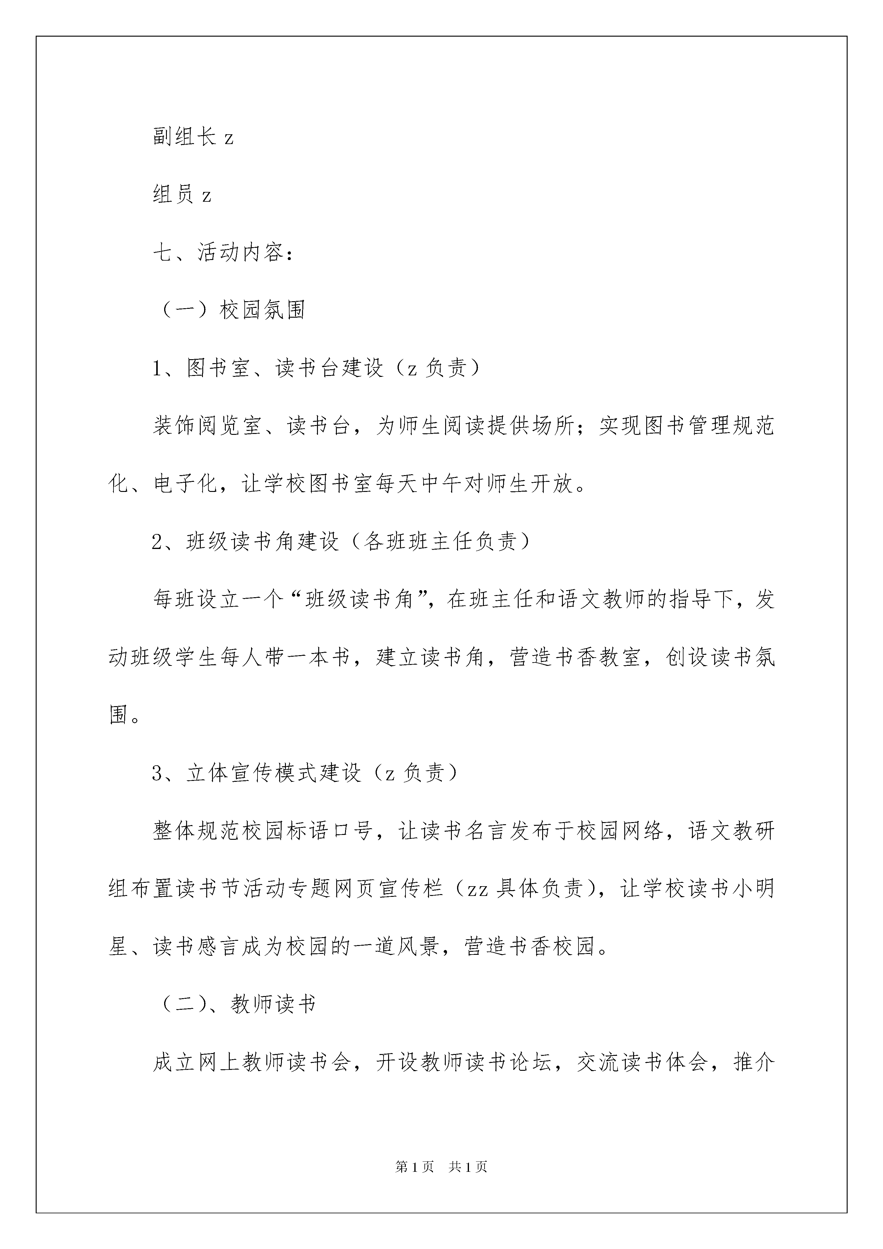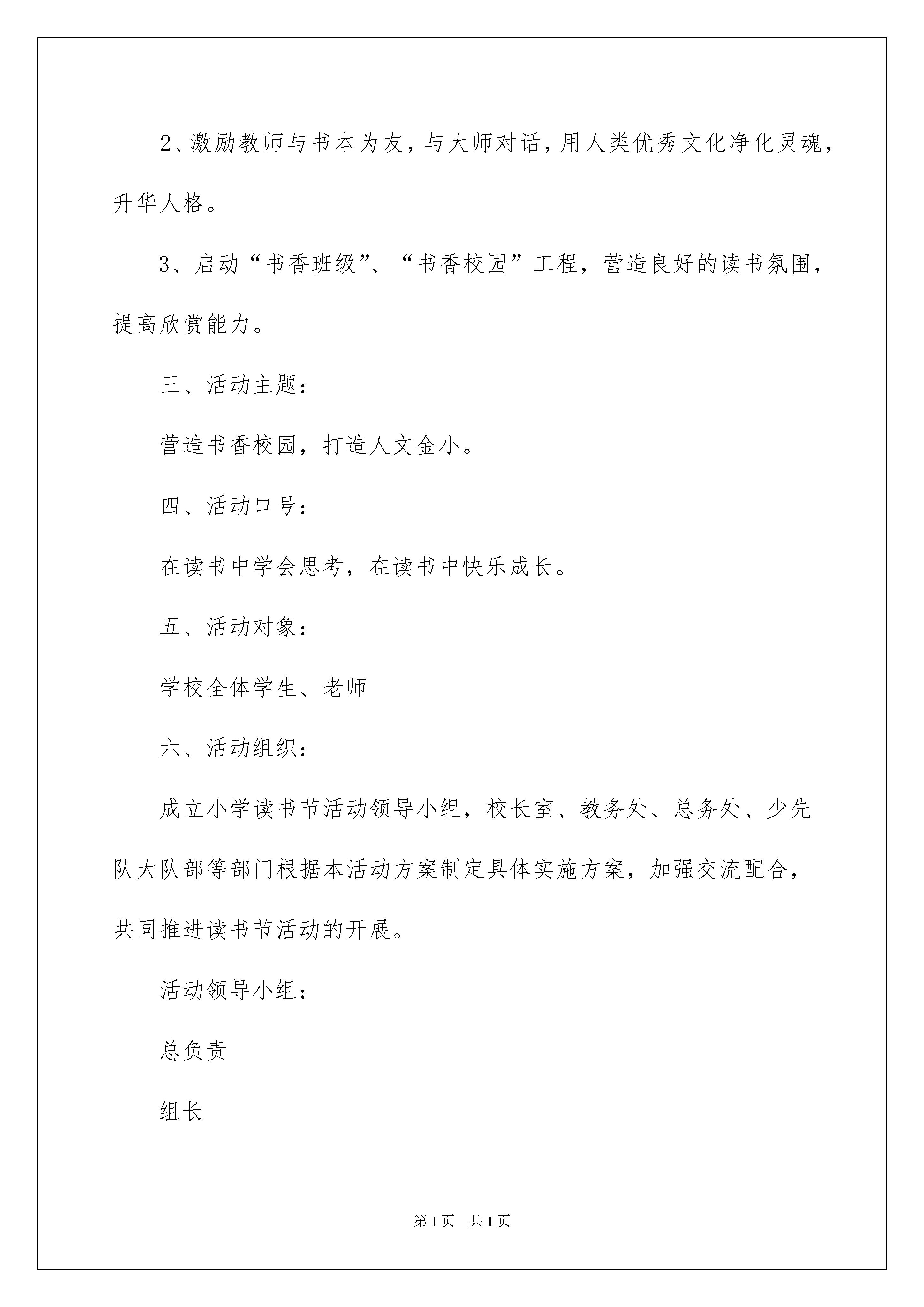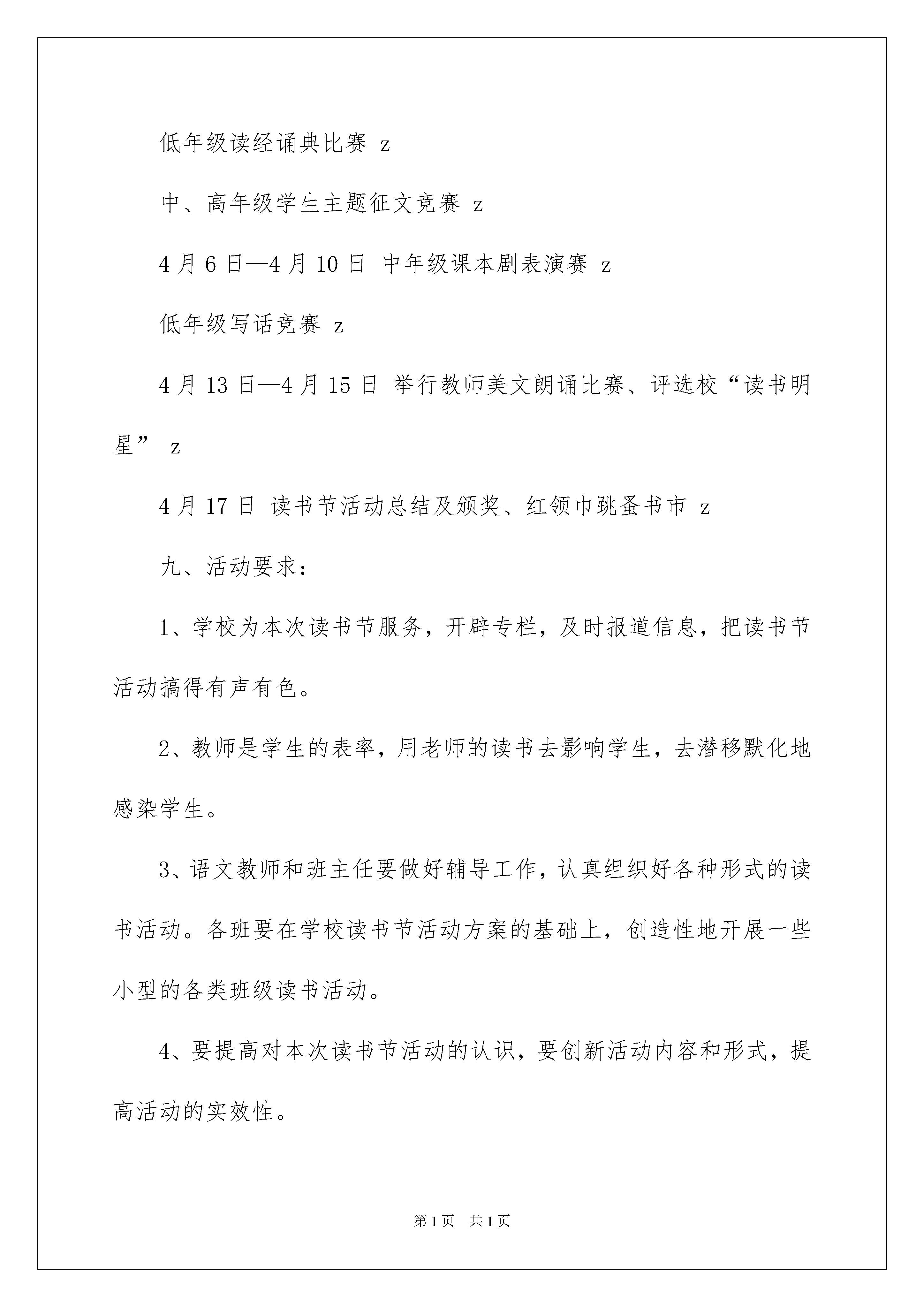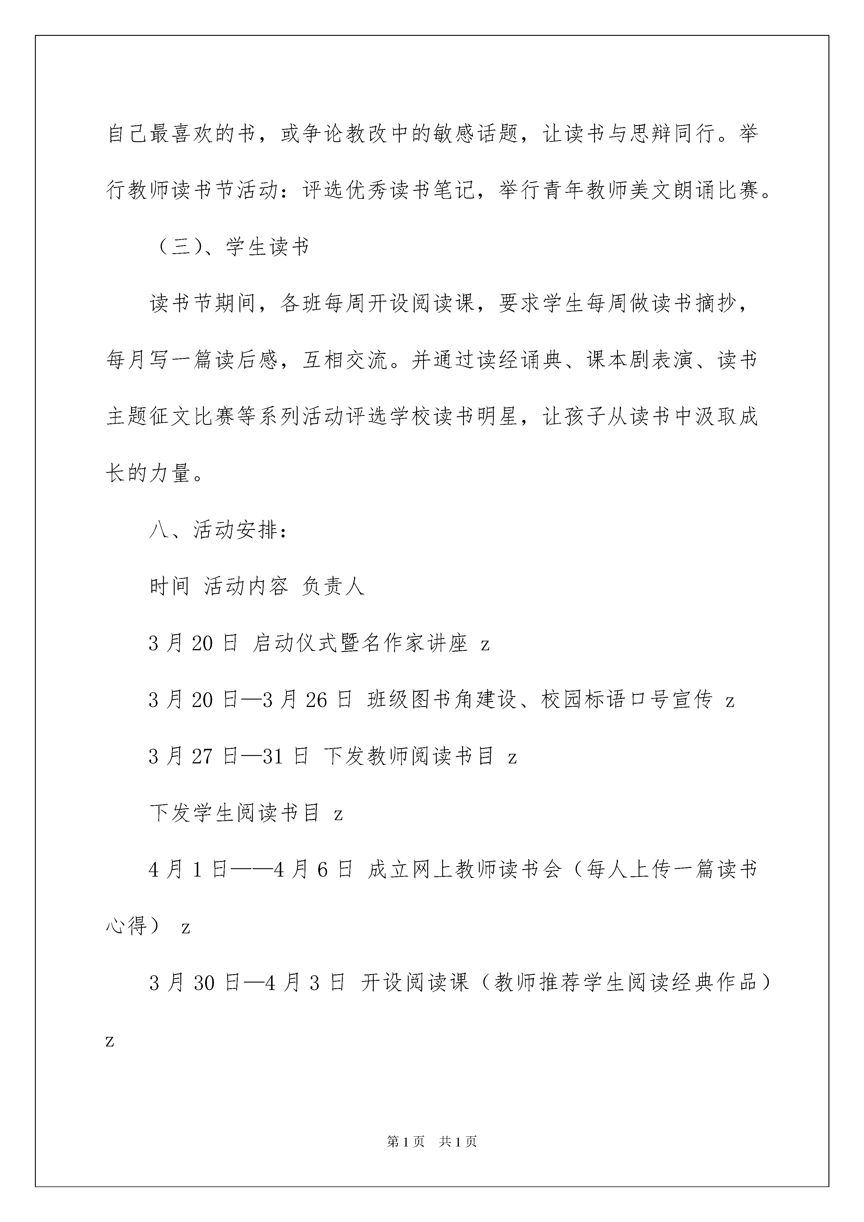 2022小学读书节活动方案小学读书节活动方案为确保事情或工作顺利开展,常常要根据具体情况预先制定方案,方案一般包括指导思想、主要目标、工作重点、实施步骤、政策措施、具体要求等项目。我们应该怎么制定方案呢?下面是我整理的小学读书节活动方案,希望对大家有所帮助。小学读书节活动方案1一、指导思想:孩子爱读书,我们才有未来;老师爱读书,教育之树才会常青。读书是学生无悔的成长方式,是教师良好的生活习惯,是构建和谐校园的基石。学校将以读书节活动为契机,借助于读书活动,激发学生才气,夯实教师底气,营造校园生气。培养学生爱读书、读好书;引导教师勤读书,善读书;打造书香校园,建设学校文化。二、活动目的:1、培养学生爱读书、读好书的习惯,拓展学生的知识面,提高学生的内在素质与修养。2、激励教师与书本为友,与大师对话,用人类优秀文化净化灵魂,升华人格。3、启动“书香班级”、“书香校园”工程,营造良好的读书氛围,提高欣赏能力。三、活动主题:营造书香校园,打造人文金小。四、活动口号:在读书中学会思考,在读书中快乐成长。五、活动对象:学校全体学生、老师六、活动组织:成立小学读书节活动领导小组,校长室、教务处、总务处、少先队大队部等部门根据本活动方案制定具体实施方案,加强交流配合,共同推进读书节活动的开展。活动领导小组:总负责组长副组长z组员z七、活动内容:(一)校园氛围1、图书室、读书台建设(z负责)装饰阅览室、读书台,为师生阅读提供场所;实现图书管理规范化、电子化,让学校图书室每天中午对师生开放。2、班级读书角建设(各班班主任负责)每班设立一个“班级读书角”,在班主任和语文教师的指导下,发动班级学生每人带一本书,建立读书角,营造书香教室,创设读书氛围。3、立体宣传模式建设(z负责)整体规范校园标语口号,让读书名言发布于校园网络,语文教研组布置读书节活动专题网页宣传栏(zz具体负责),让学校读书小明星、读书感言成为校园的一道风景,营造书香校园。(二)、教师读书成立网上教师读书会,开设教师读书论坛,交流读书体会,推介自己最喜欢的书,或争论教改中的敏感话题,让读书与思辩同行。举行教师读书节活动:评选优秀读书笔记,举行青年教师美文朗诵比赛。(三)、学生读书读书节期间,各班每周开设阅读课,要求学生每周做读书摘抄,每月写一篇读后感,互相交流。并通过读经诵典、课本剧表演、读书主题征文比赛等系列活动评选学校读书明星,让孩子从读书中汲取成长的力量。八、活动安排:时间活动内容负责人3月20日启动仪式暨名作家讲座z3月20日—3月26日班级图书角建设、校园标语口号宣传z3月27日—31日下发教师阅读书目z下发学生阅读书目z4月1日——4月6日成立网上教师读书会(每人上传一篇读书心得)z3月30日—4月3日开设阅读课(教师推荐学生阅读经典作品)z低年级读经诵典比赛z中、高年级学生主题征文竞赛z4月6日—4月10日中年级课本剧表演赛z低年级写话竞赛z4月13日—4月15日举行教师美文朗诵比赛、评选校“读书明星”z4月17日读书节活动总结及颁奖、红领巾跳蚤书市z九、活动要求:1、学校为本次读书节服务,开辟专栏,及时报道信息,把读书节活动搞得有声有色。2、教师是学生的表率,用老师的读书去影响学生,去潜移默化地感染学生。3、语文教师和班主任要做好辅导工作,认真组织好各种形式的读书活动。各班要在学校读书节活动方案的基础上,创造性地开展一些小型的各类班级读书活动。4、要提高对本次读书节活动的认识,要创新活动内容和形式,提高活动的实效性。附:“读书明星”评选条件1、有良好的阅读习惯和较浓厚的阅读兴趣;能在班级或学校起发挥“课外阅读”的模范带头作用。2、积极参加学校组织的阅读活动,认真阅读学校推荐的阅读书籍,能写较为具体生动的读后感。3、坚持诵读《课程标准》推荐的古诗文经典诵读内容,低年段学生能背诵30首以上,默写10首;中年段学生能背诵50首以上,默写20首;高年段学生能背诵70首以上,默写30首。4、读书量大:低年级一学期课外阅读总量不少于1万字,中年级一学期课外阅读总量不少于10万字,高年级一学期课外阅读总量不少于25万字;做好“读书摘记”;积极参加市、学校、班级组织的各种读书活动,并有1-2篇作文能在市级以上作文比赛中获奖或能在市级以上刊物发表。5、“读书明星”上交相关评选材料:推荐表,该学生的读书摘记、小作文、发表文章复印件、获奖证书复印件、背诵及默写古诗文目录等所有能反映该生读书质量的材料。(发表文章、获奖证书同时上交原件)小学读书节活动方案2一、活动目的通过开展形式多样的读书活动,培养师生的阅读兴趣,增长知识、陶冶情操、愉