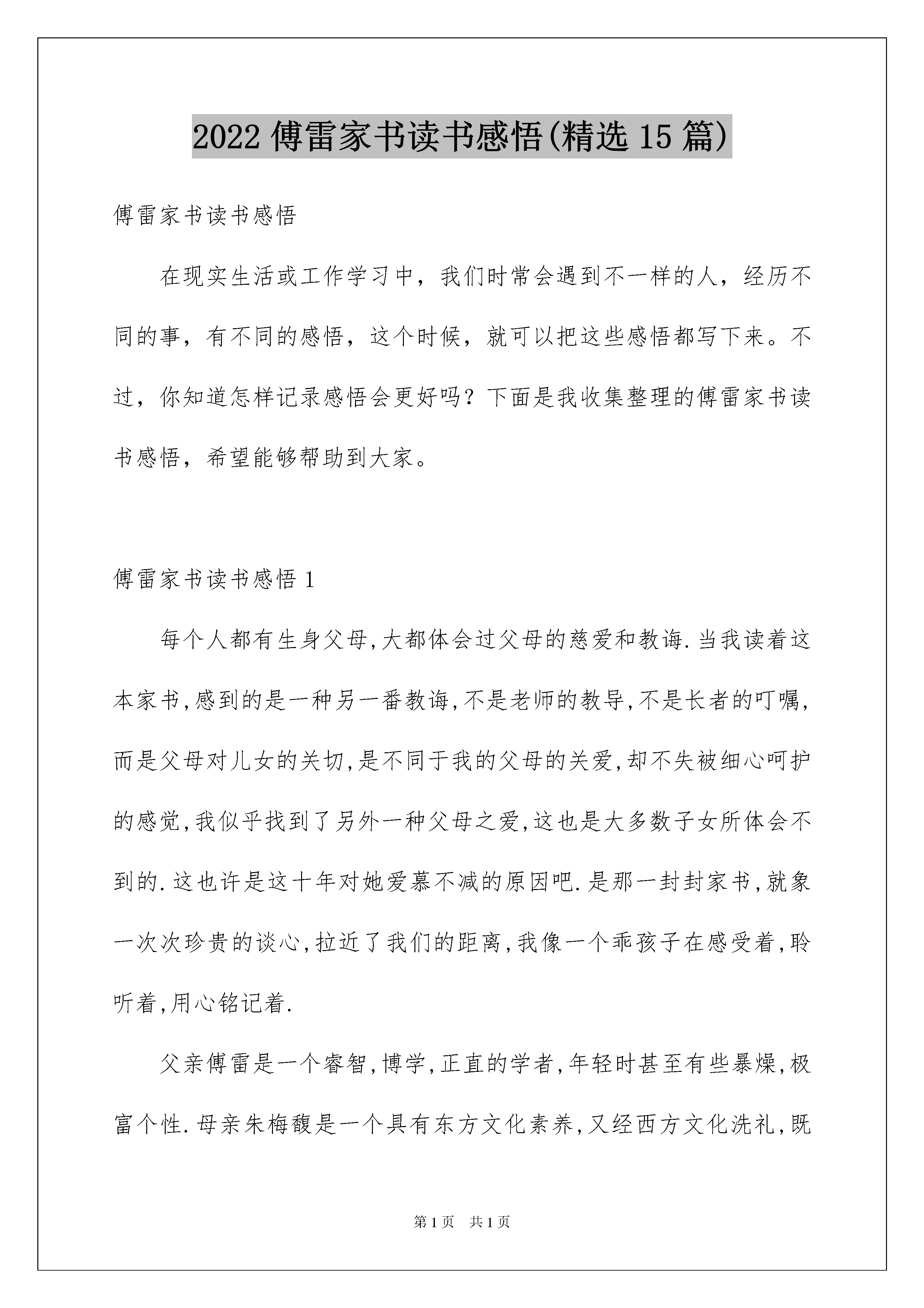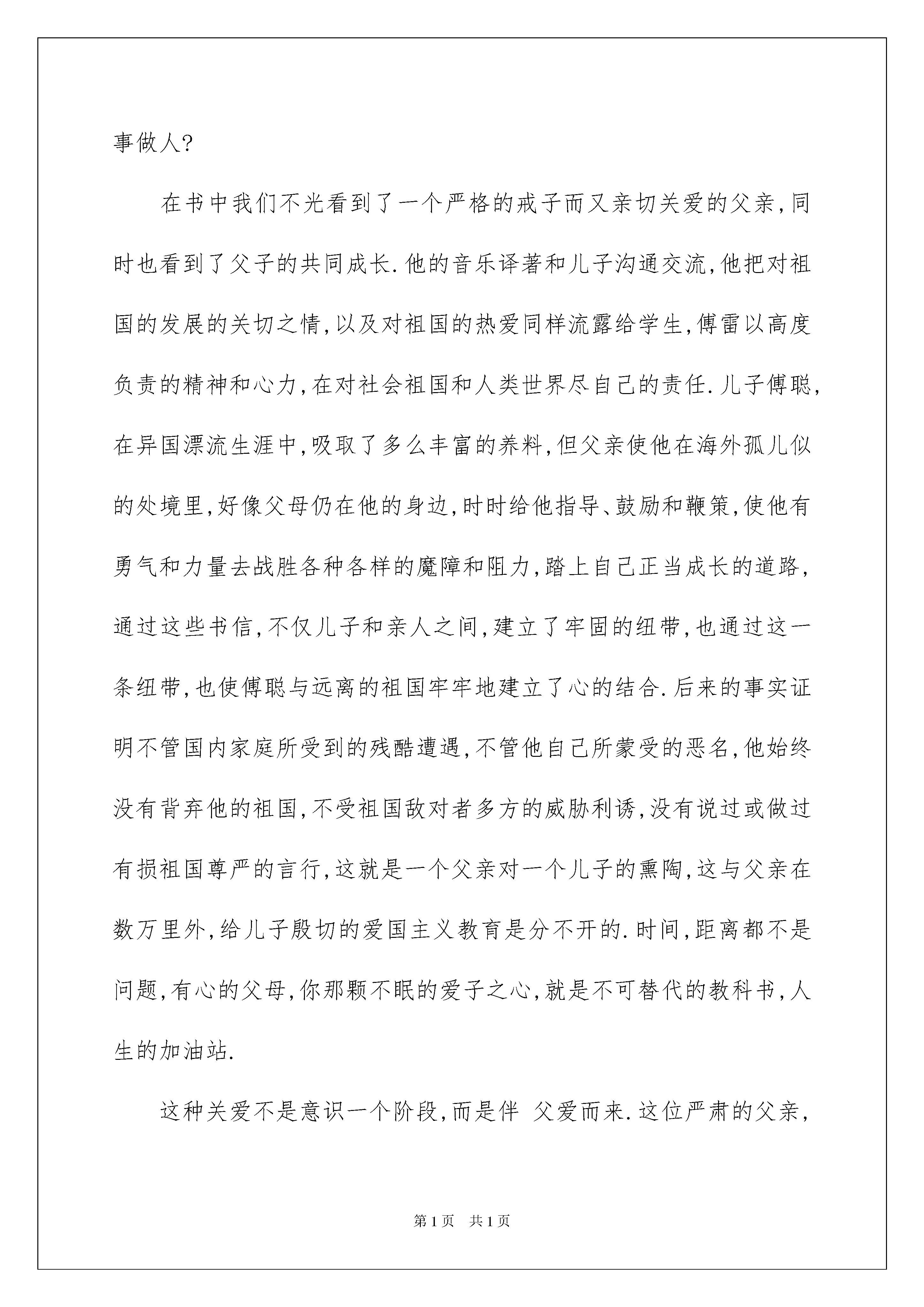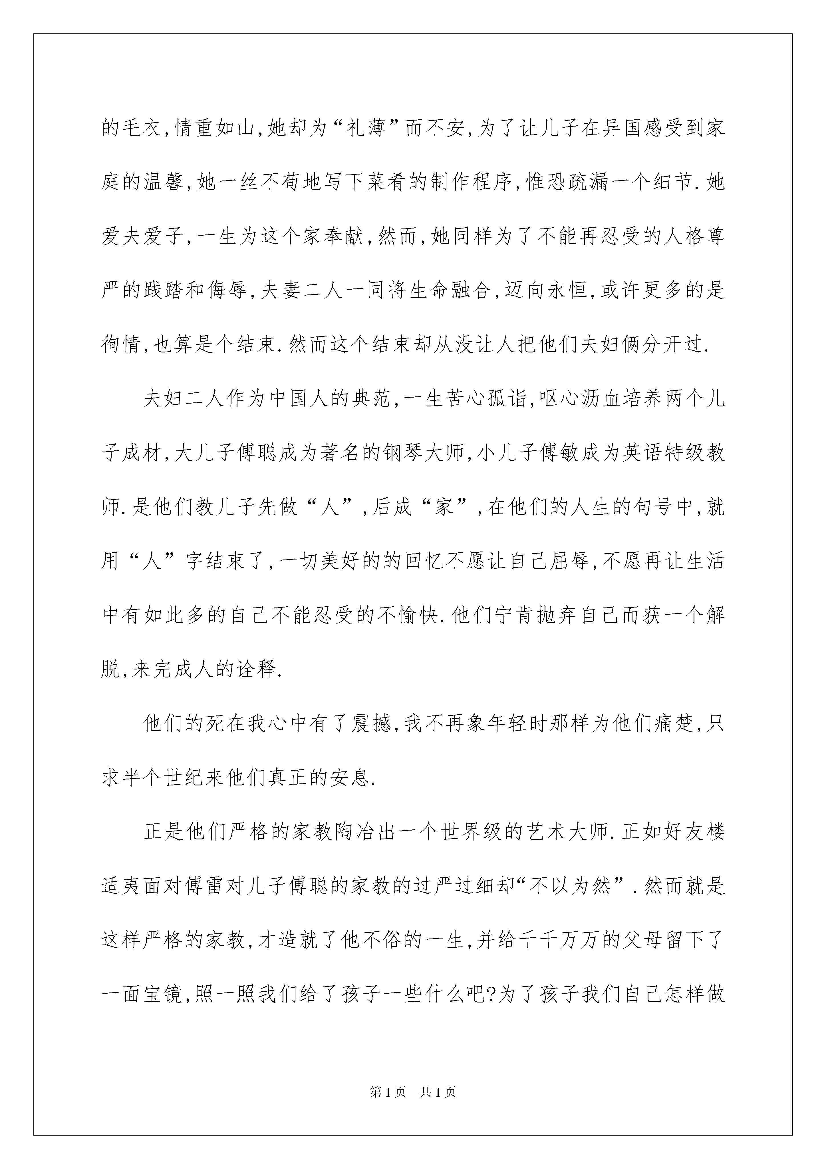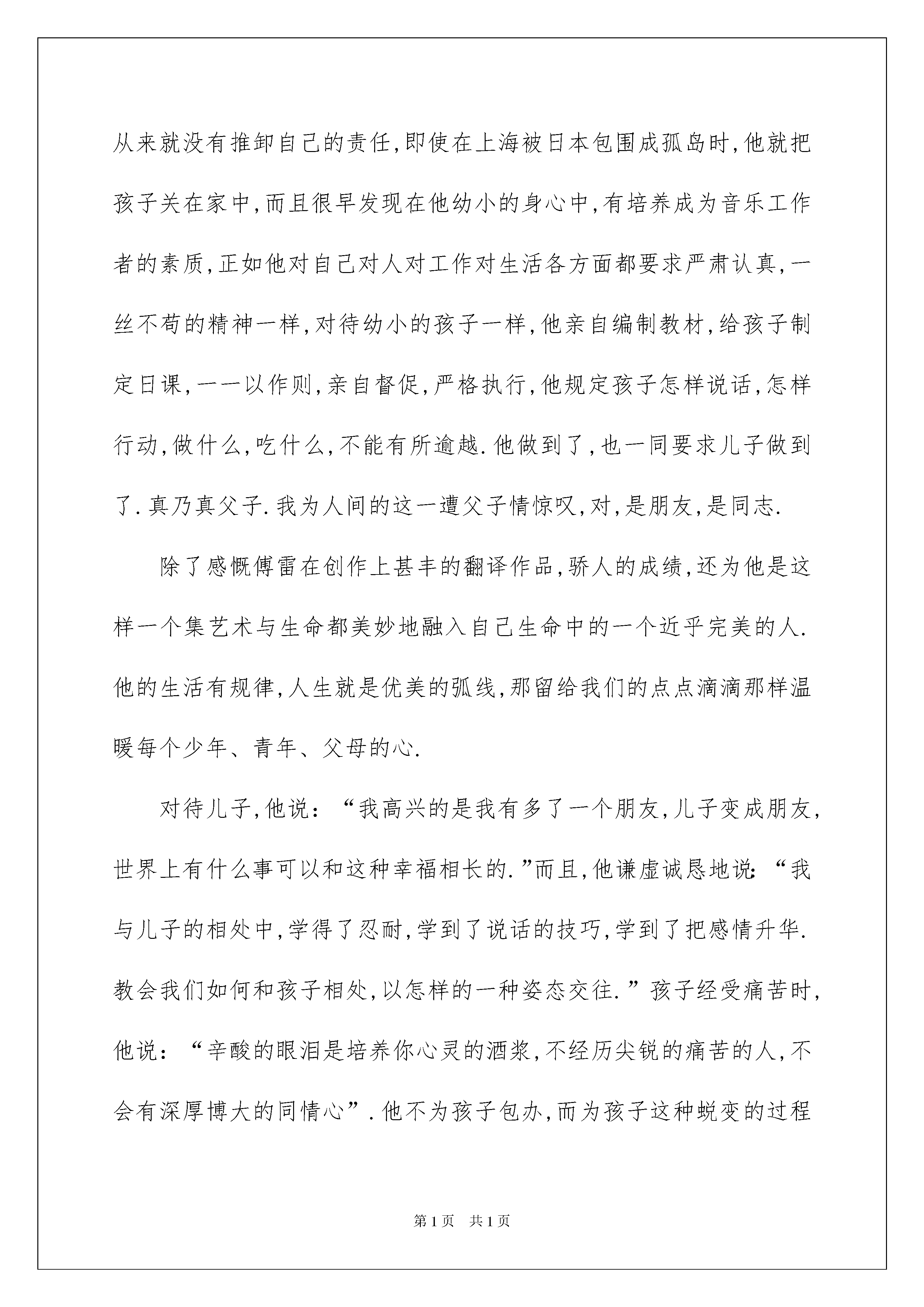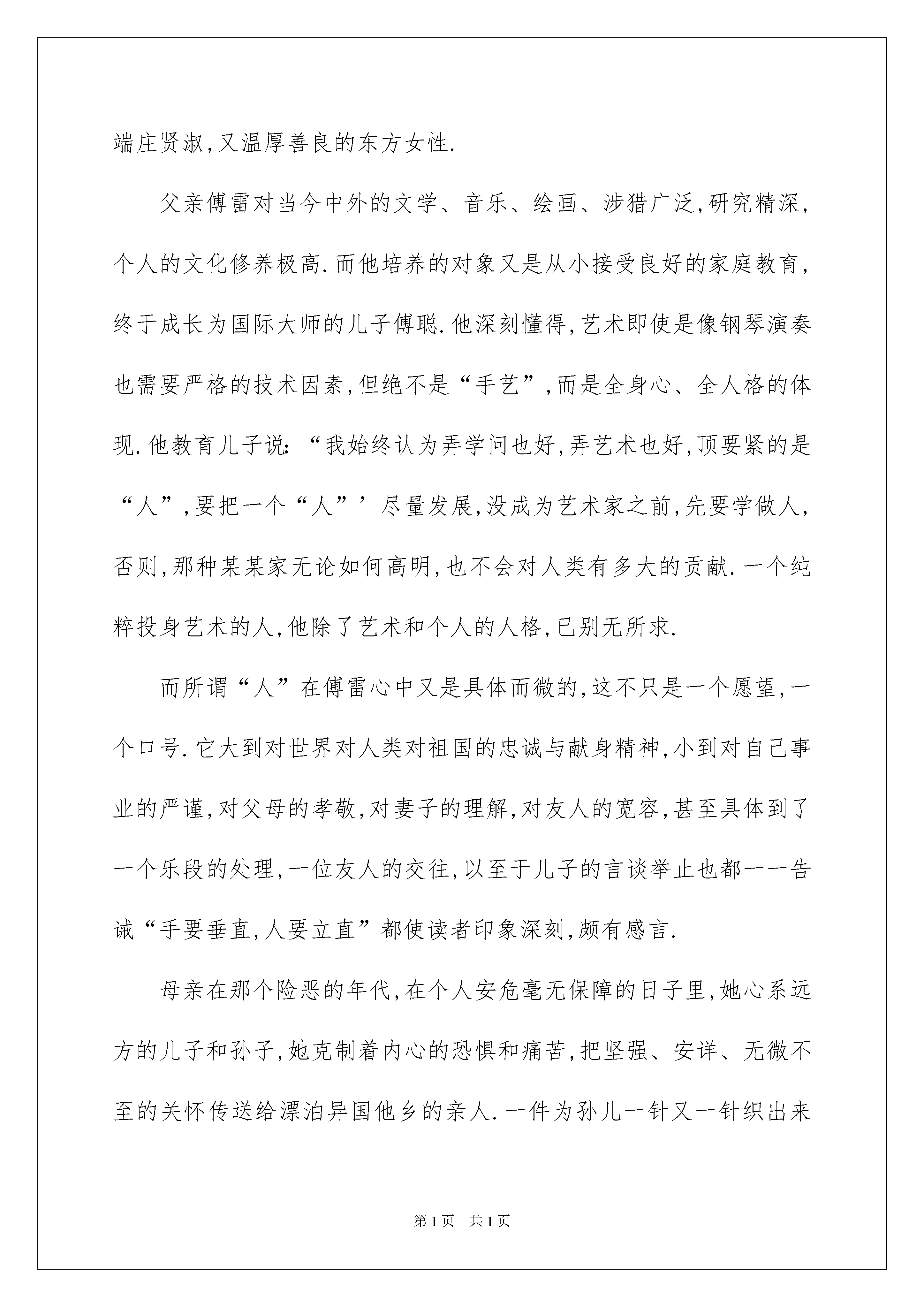 2022傅雷家书读书感悟(精选15篇)傅雷家书读书感悟在现实生活或工作学习中,我们时常会遇到不一样的人,经历不同的事,有不同的感悟,这个时候,就可以把这些感悟都写下来。不过,你知道怎样记录感悟会更好吗?下面是我收集整理的傅雷家书读书感悟,希望能够帮助到大家。傅雷家书读书感悟1每个人都有生身父母,大都体会过父母的慈爱和教诲.当我读着这本家书,感到的是一种另一番教诲,不是老师的教导,不是长者的叮嘱,而是父母对儿女的关切,是不同于我的父母的关爱,却不失被细心呵护的感觉,我似乎找到了另外一种父母之爱,这也是大多数子女所体会不到的.这也许是这十年对她爱慕不减的原因吧.是那一封封家书,就象一次次珍贵的谈心,拉近了我们的距离,我像一个乖孩子在感受着,聆听着,用心铭记着.父亲傅雷是一个睿智,博学,正直的学者,年轻时甚至有些暴燥,极富个性.母亲朱梅馥是一个具有东方文化素养,又经西方文化洗礼,既端庄贤淑,又温厚善良的东方女性.父亲傅雷对当今中外的文学、音乐、绘画、涉猎广泛,研究精深,个人的文化修养极高.而他培养的对象又是从小接受良好的家庭教育,终于成长为国际大师的儿子傅聪.他深刻懂得,艺术即使是像钢琴演奏也需要严格的技术因素,但绝不是“手艺”,而是全身心、全人格的体现.他教育儿子说:“我始终认为弄学问也好,弄艺术也好,顶要紧的是“人”,要把一个“人”’尽量发展,没成为艺术家之前,先要学做人,否则,那种某某家无论如何高明,也不会对人类有多大的贡献.一个纯粹投身艺术的人,他除了艺术和个人的人格,已别无所求.而所谓“人”在傅雷心中又是具体而微的,这不只是一个愿望,一个口号.它大到对世界对人类对祖国的忠诚与献身精神,小到对自己事业的严谨,对父母的孝敬,对妻子的理解,对友人的宽容,甚至具体到了一个乐段的处理,一位友人的交往,以至于儿子的言谈举止也都一一告诫“手要垂直,人要立直”都使读者印象深刻,颇有感言.母亲在那个险恶的年代,在个人安危毫无保障的日子里,她心系远方的儿子和孙子,她克制着内心的恐惧和痛苦,把坚强、安详、无微不至的关怀传送给漂泊异国他乡的亲人.一件为孙儿一针又一针织出来的毛衣,情重如山,她却为“礼薄”而不安,为了让儿子在异国感受到家庭的温馨,她一丝不苟地写下菜肴的制作程序,惟恐疏漏一个细节.她爱夫爱子,一生为这个家奉献,然而,她同样为了不能再忍受的人格尊严的践踏和侮辱,夫妻二人一同将生命融合,迈向永恒,或许更多的是徇情,也算是个结束.然而这个结束却从没让人把他们夫妇俩分开过.夫妇二人作为中国人的典范,一生苦心孤诣,呕心沥血培养两个儿子成材,大儿子傅聪成为著名的钢琴大师,小儿子傅敏成为英语特级教师.是他们教儿子先做“人”,后成“家”,在他们的人生的句号中,就用“人”字结束了,一切美好的的回忆不愿让自己屈辱,不愿再让生活中有如此多的自己不能忍受的不愉快.他们宁肯抛弃自己而获一个解脱,来完成人的诠释.他们的死在我心中有了震撼,我不再象年轻时那样为他们痛楚,只求半个世纪来他们真正的安息.正是他们严格的家教陶冶出一个世界级的艺术大师.正如好友楼适夷面对傅雷对儿子傅聪的家教的过严过细却“不以为然”.然而就是这样严格的家教,才造就了他不俗的一生,并给千千万万的父母留下了一面宝镜,照一照我们给了孩子一些什么吧?为了孩子我们自己怎样做事做人?在书中我们不光看到了一个严格的戒子而又亲切关爱的父亲,同时也看到了父子的共同成长.他的音乐译著和儿子沟通交流,他把对祖国的发展的关切之情,以及对祖国的热爱同样流露给学生,傅雷以高度负责的精神和心力,在对社会祖国和人类世界尽自己的责任.儿子傅聪,在异国漂流生涯中,吸取了多么丰富的养料,但父亲使他在海外孤儿似的处境里,好像父母仍在他的身边,时时给他指导、鼓励和鞭策,使他有勇气和力量去战胜各种各样的魔障和阻力,踏上自己正当成长的道路,通过这些书信,不仅儿子和亲人之间,建立了牢固的纽带,也通过这一条纽带,也使傅聪与远离的祖国牢牢地建立了心的结合.后来的事实证明不管国内家庭所受到的残酷遭遇,不管他自己所蒙受的恶名,他始终没有背弃他的祖国,不受祖国敌对者多方的威胁利诱,没有说过或做过有损祖国尊严的言行,这就是一个父亲对一个儿子的熏陶,这与父亲在数万里外,给儿子殷切的爱国主义教育是分不开的.时间,距离都不是问题,有心的父母,你那颗不眠的爱子之心,就是不可替代的教科书,人生的加油站.这种关爱不是意识一个阶段,而是伴父爱而来.这位严肃的父亲,从来就没有推卸自己的责任,即使在上海被日本包围成孤岛时,他就把孩子关在家中,而且很早发现在他幼小的身心中,有培养成为音乐工作者的素质,正如他对自己对