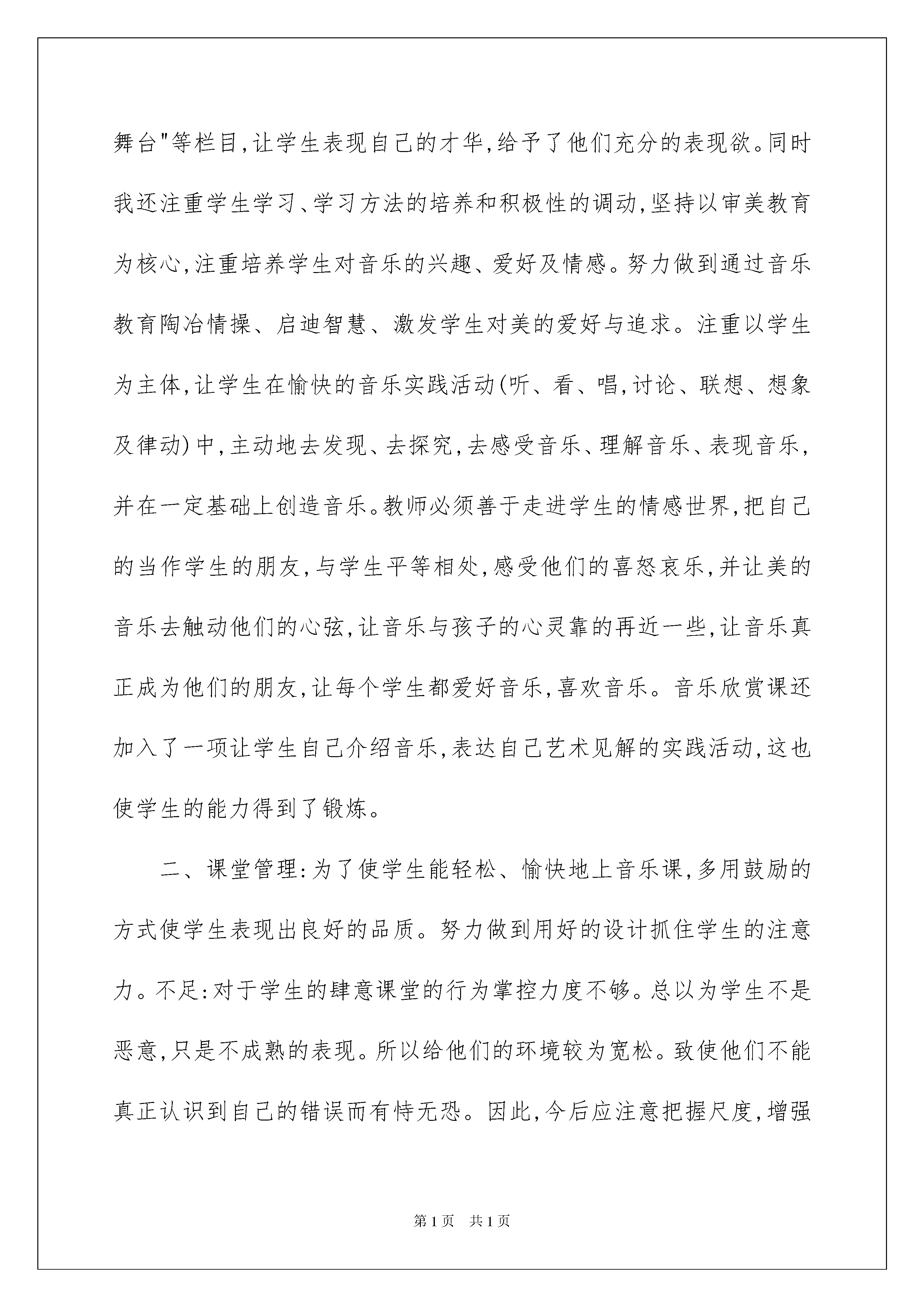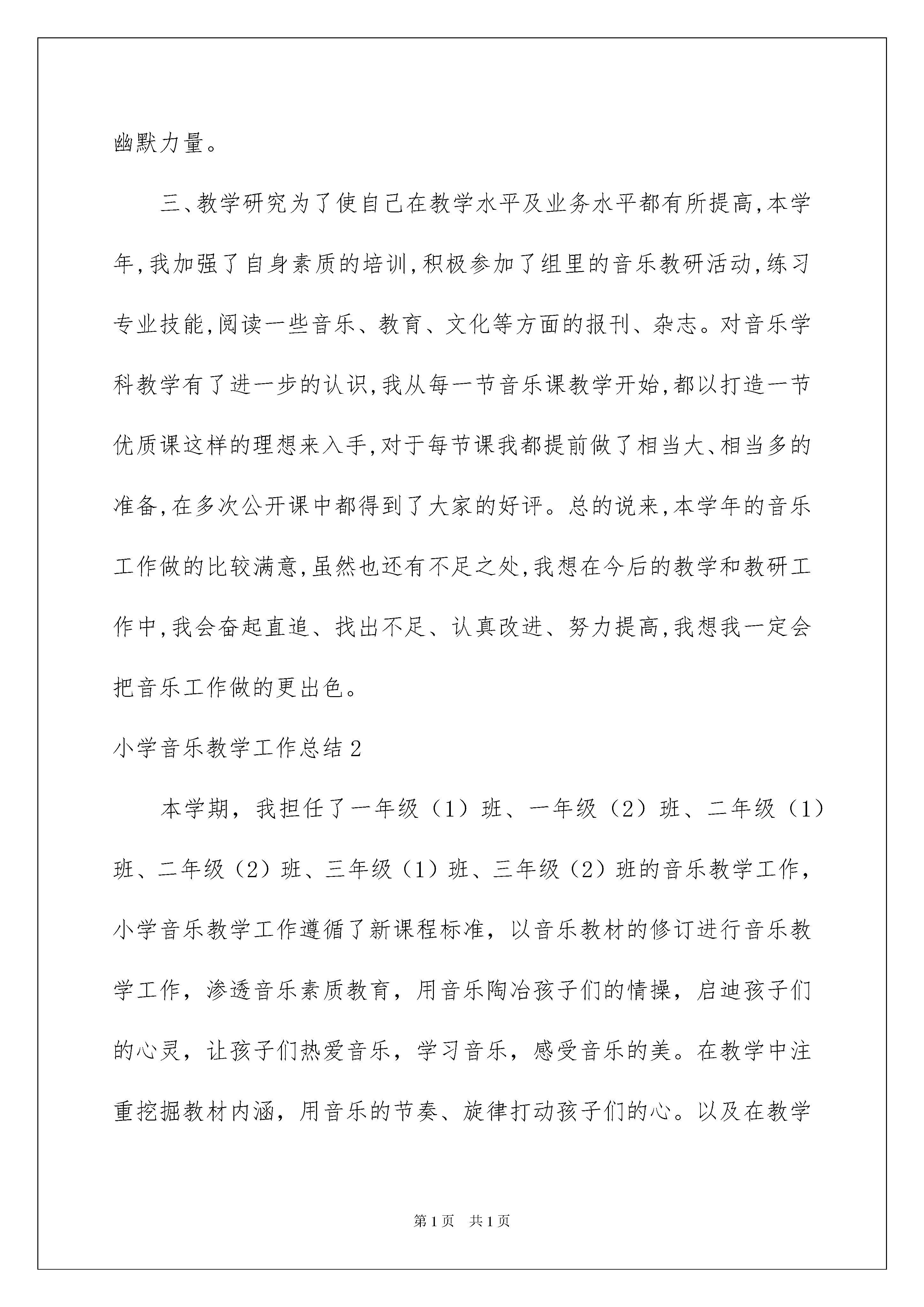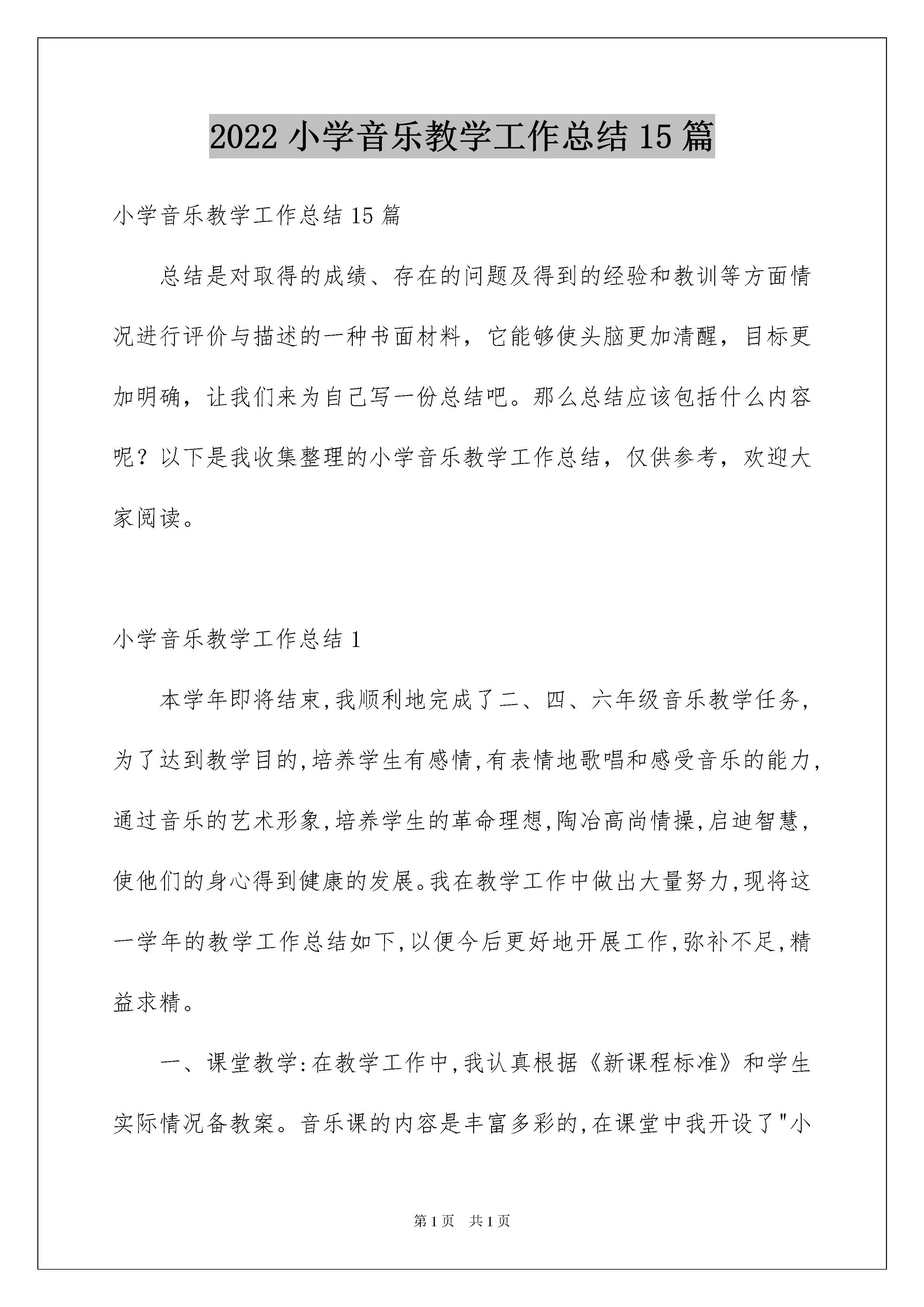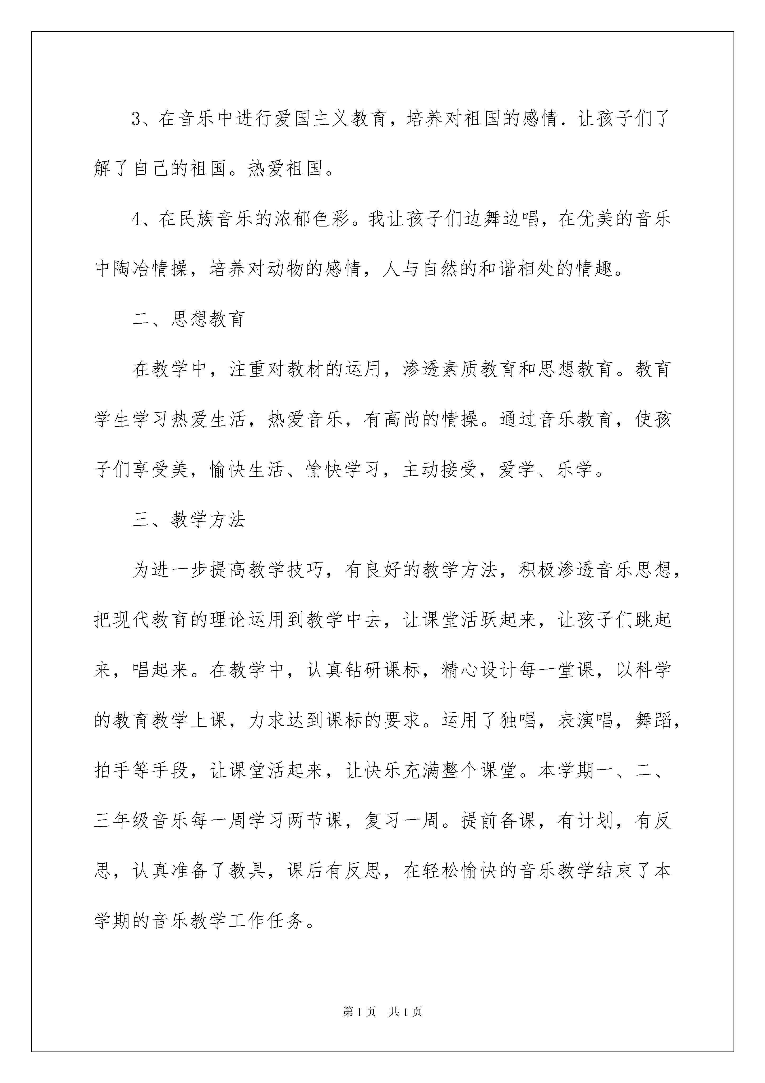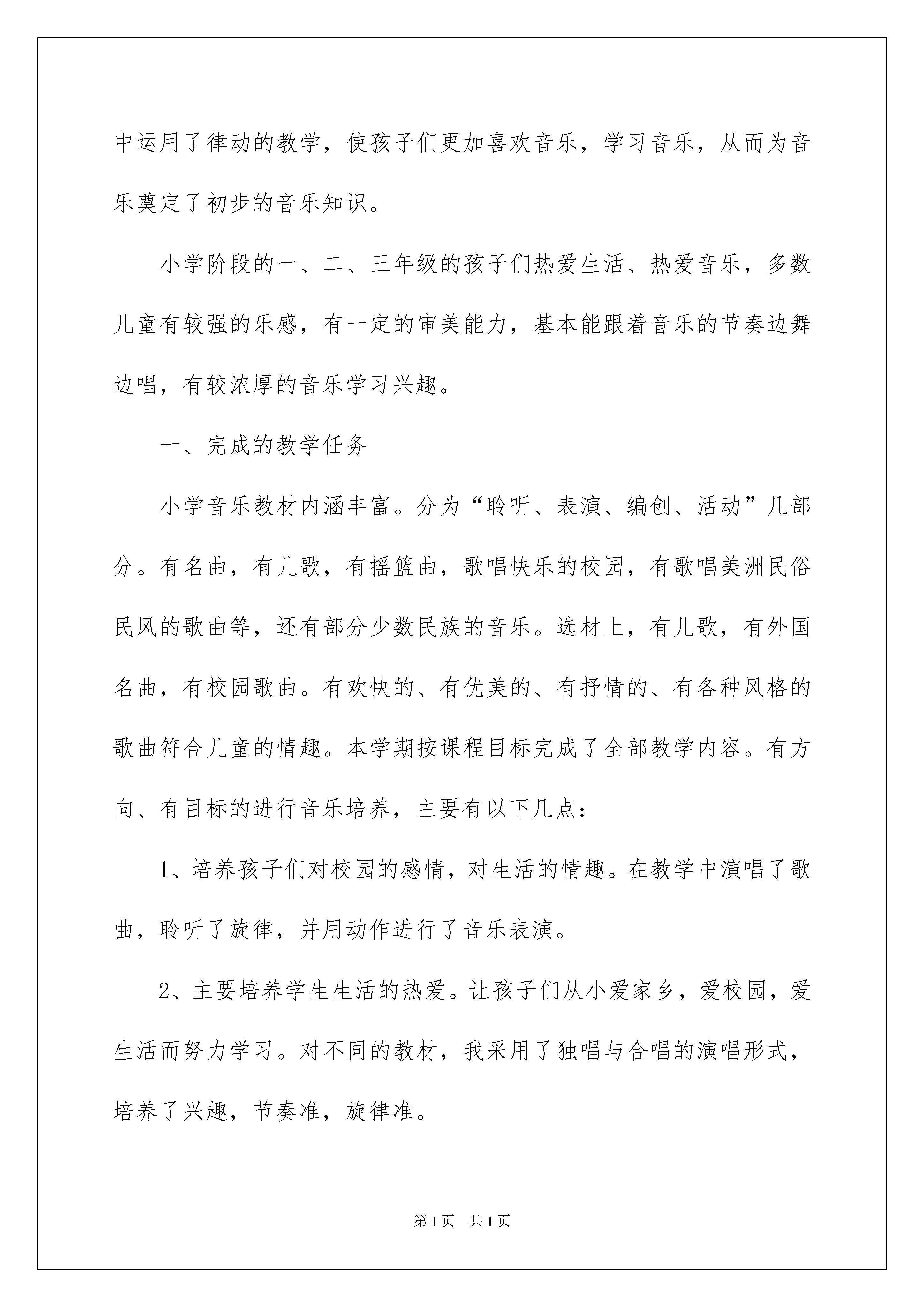 2022小学音乐教学工作总结15篇小学音乐教学工作总结15篇总结是对取得的成绩、存在的问题及得到的经验和教训等方面情况进行评价与描述的一种书面材料,它能够使头脑更加清醒,目标更加明确,让我们来为自己写一份总结吧。那么总结应该包括什么内容呢?以下是我收集整理的小学音乐教学工作总结,仅供参考,欢迎大家阅读。小学音乐教学工作总结1本学年即将结束,我顺利地完成了二、四、六年级音乐教学任务,为了达到教学目的,培养学生有感情,有表情地歌唱和感受音乐的能力,通过音乐的艺术形象,培养学生的革命理想,陶冶高尚情操,启迪智慧,使他们的身心得到健康的发展。我在教学工作中做出大量努力,现将这一学年的教学工作总结如下,以便今后更好地开展工作,弥补不足,精益求精。一、课堂教学:在教学工作中,我认真根据《新课程标准》和学生实际情况备教案。音乐课的内容是丰富多彩的,在课堂中我开设了"小舞台"等栏目,让学生表现自己的才华,给予了他们充分的表现欲。同时我还注重学生学习、学习方法的培养和积极性的调动,坚持以审美教育为核心,注重培养学生对音乐的兴趣、爱好及情感。努力做到通过音乐教育陶冶情操、启迪智慧、激发学生对美的爱好与追求。注重以学生为主体,让学生在愉快的音乐实践活动(听、看、唱,讨论、联想、想象及律动)中,主动地去发现、去探究,去感受音乐、理解音乐、表现音乐,并在一定基础上创造音乐。教师必须善于走进学生的情感世界,把自己的当作学生的朋友,与学生平等相处,感受他们的喜怒哀乐,并让美的音乐去触动他们的心弦,让音乐与孩子的心灵靠的再近一些,让音乐真正成为他们的朋友,让每个学生都爱好音乐,喜欢音乐。音乐欣赏课还加入了一项让学生自己介绍音乐,表达自己艺术见解的实践活动,这也使学生的能力得到了锻炼。二、课堂管理:为了使学生能轻松、愉快地上音乐课,多用鼓励的方式使学生表现出良好的品质。努力做到用好的设计抓住学生的注意力。不足:对于学生的肆意课堂的行为掌控力度不够。总以为学生不是恶意,只是不成熟的表现。所以给他们的环境较为宽松。致使他们不能真正认识到自己的错误而有恃无恐。因此,今后应注意把握尺度,增强幽默力量。三、教学研究为了使自己在教学水平及业务水平都有所提高,本学年,我加强了自身素质的培训,积极参加了组里的音乐教研活动,练习专业技能,阅读一些音乐、教育、文化等方面的报刊、杂志。对音乐学科教学有了进一步的认识,我从每一节音乐课教学开始,都以打造一节优质课这样的理想来入手,对于每节课我都提前做了相当大、相当多的准备,在多次公开课中都得到了大家的好评。总的说来,本学年的音乐工作做的比较满意,虽然也还有不足之处,我想在今后的教学和教研工作中,我会奋起直追、找出不足、认真改进、努力提高,我想我一定会把音乐工作做的更出色。小学音乐教学工作总结2本学期,我担任了一年级(1)班、一年级(2)班、二年级(1)班、二年级(2)班、三年级(1)班、三年级(2)班的音乐教学工作,小学音乐教学工作遵循了新课程标准,以音乐教材的修订进行音乐教学工作,渗透音乐素质教育,用音乐陶冶孩子们的情操,启迪孩子们的心灵,让孩子们热爱音乐,学习音乐,感受音乐的美。在教学中注重挖掘教材内涵,用音乐的节奏、旋律打动孩子们的心。以及在教学中运用了律动的教学,使孩子们更加喜欢音乐,学习音乐,从而为音乐奠定了初步的音乐知识。小学阶段的一、二、三年级的孩子们热爱生活、热爱音乐,多数儿童有较强的乐感,有一定的审美能力,基本能跟着音乐的节奏边舞边唱,有较浓厚的音乐学习兴趣。一、完成的教学任务小学音乐教材内涵丰富。分为“聆听、表演、编创、活动”几部分。有名曲,有儿歌,有摇篮曲,歌唱快乐的校园,有歌唱美洲民俗民风的歌曲等,还有部分少数民族的音乐。选材上,有儿歌,有外国名曲,有校园歌曲。有欢快的、有优美的、有抒情的、有各种风格的歌曲符合儿童的情趣。本学期按课程目标完成了全部教学内容。有方向、有目标的进行音乐培养,主要有以下几点:1、培养孩子们对校园的感情,对生活的情趣。在教学中演唱了歌曲,聆听了旋律,并用动作进行了音乐表演。2、主要培养学生生活的热爱。让孩子们从小爱家乡,爱校园,爱生活而努力学习。对不同的教材,我采用了独唱与合唱的演唱形式,培养了兴趣,节奏准,旋律准。3、在音乐中进行爱国主义教育,培养对祖国的感情.让孩子们了解了自己的祖国。热爱祖国。4、在民族音乐的浓郁色彩。我让孩子们边舞边唱,在优美的音乐中陶冶情操,培养对动物的感情,人与自然的和谐相处的情趣。二、思想教育在教学中,注重对教材的运用,渗透素质教育和思想教育。教育学生学习热爱生活,热爱音乐,有高尚的情操。通过音乐教育