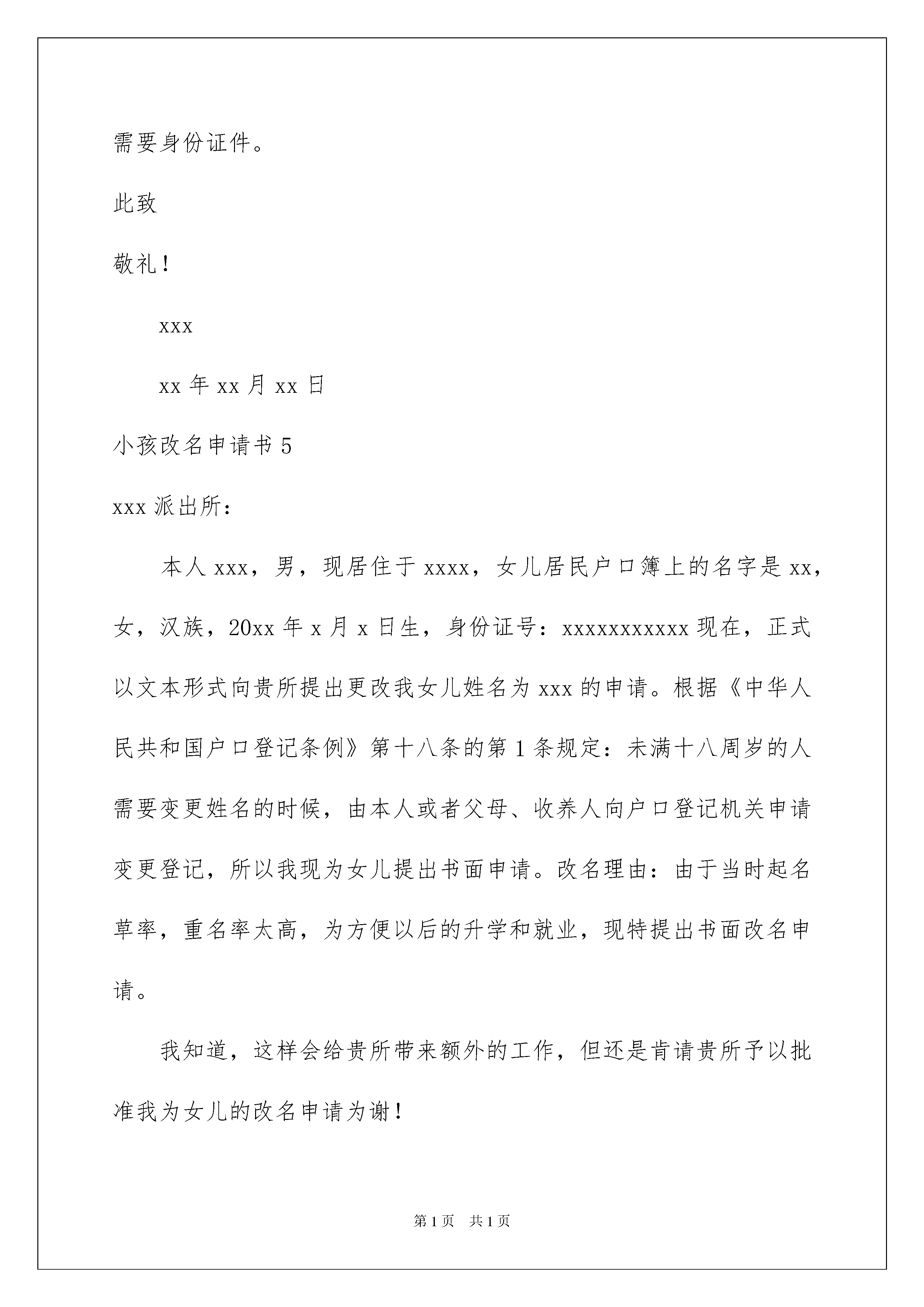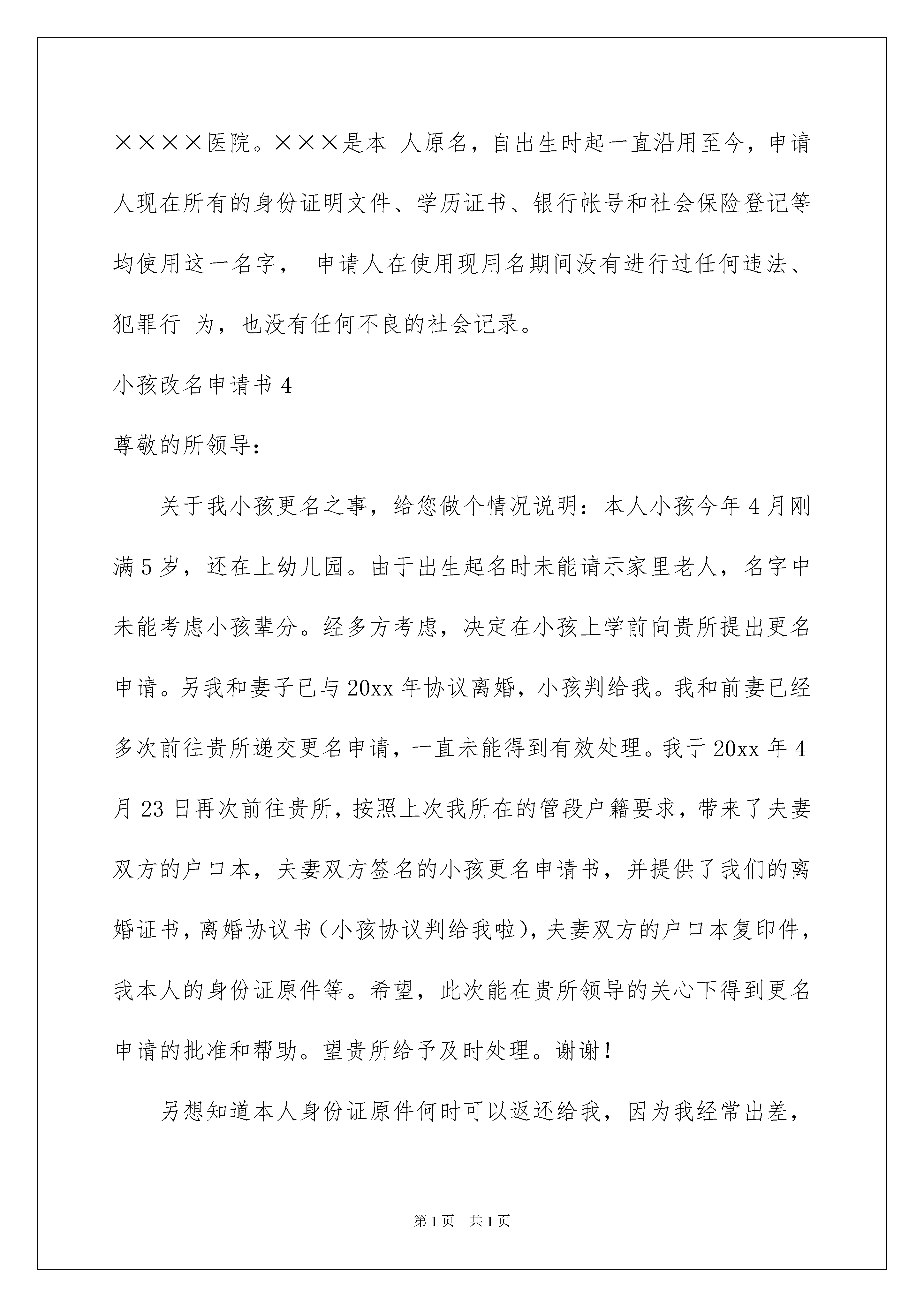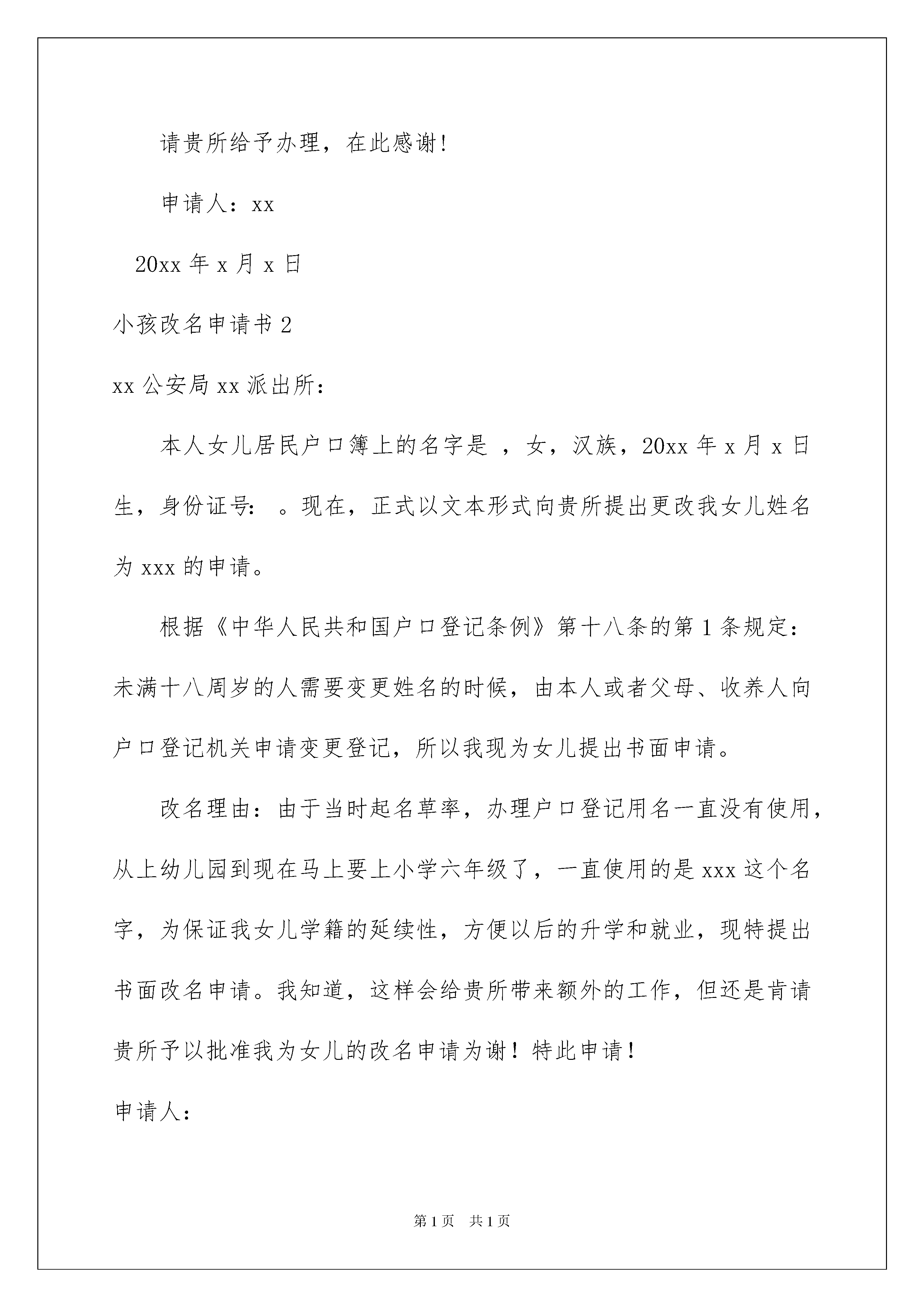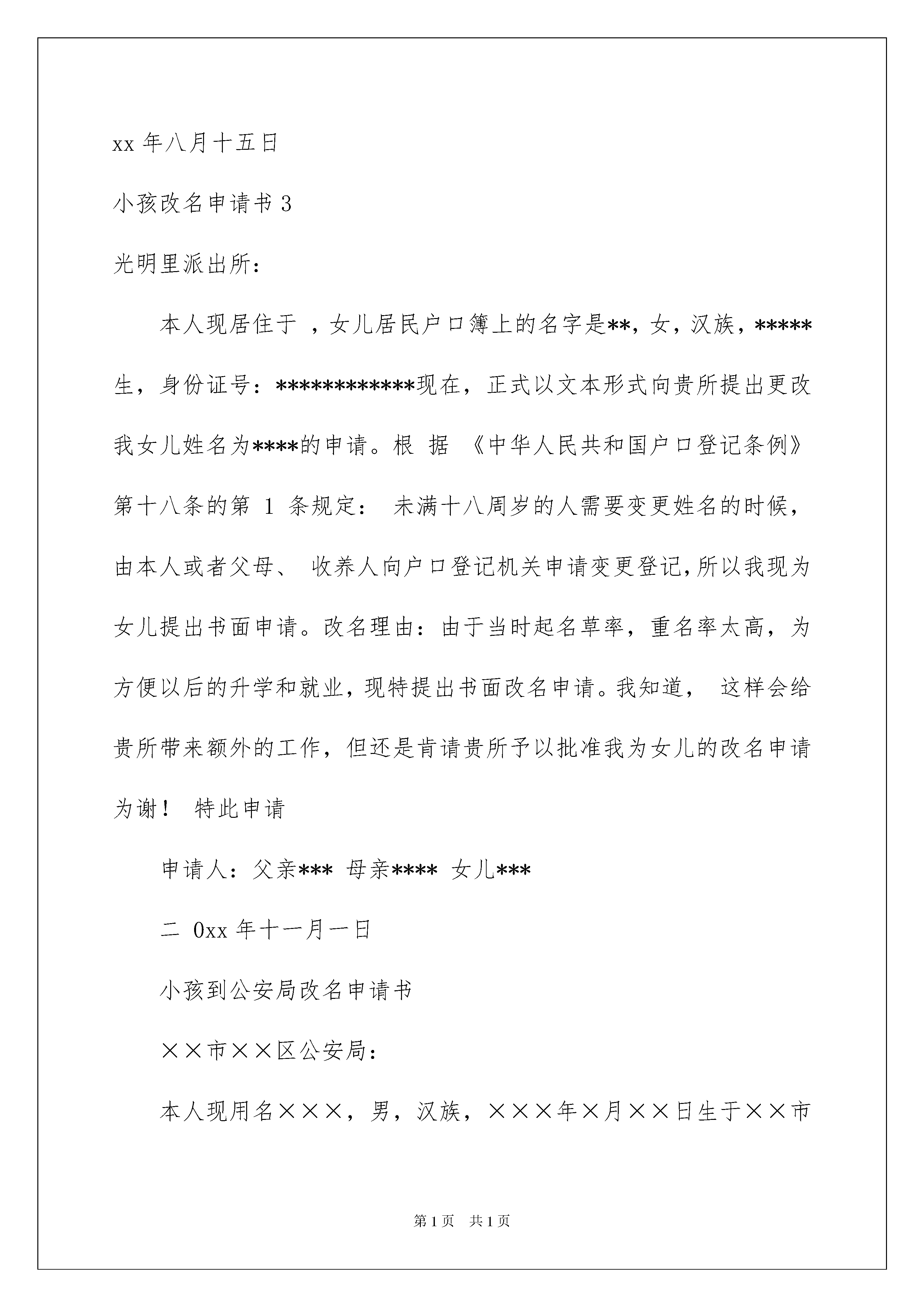 2022小孩改名申请书小孩改名申请书在当今社会高速发展的今天申请书与我们不再陌生,不同的使用场景有不同的申请书。写申请书时理由总是不够充分?以下是我为大家整理的小孩改名申请书,仅供参考,大家一起来看看吧。小孩改名申请书1xx派出所:本人儿子居民户口簿上的名字是xx,男,汉族,20xx年xx生,身份证号xxx。现在正式以文本形式向贵所提出更改我儿子姓名为xxx的申请。根据《中华人民共和国户口登记条例》第十八条的第1条规定:未满十八周岁的人需要变更姓名的时候,由本人或者父母、收养人向户口登记机关申请变更登记,所以我现为儿子提出书面申请。改名理由:由于当时起名草率,没有考虑到重名现象。办理户口登记时用的是xx,到现在一直没有在任何场合使用过,现在上幼儿园了,考虑到将来要上小学办学籍,如果还使用xxx这个名字会出现重名现象,现特向贵所提出书面改名申请。请贵所给予办理,在此感谢!申请人:xx20xx年x月x日小孩改名申请书2xx公安局xx派出所:本人女儿居民户口簿上的名字是,女,汉族,20xx年x月x日生,身份证号:。现在,正式以文本形式向贵所提出更改我女儿姓名为xxx的申请。根据《中华人民共和国户口登记条例》第十八条的第1条规定:未满十八周岁的人需要变更姓名的时候,由本人或者父母、收养人向户口登记机关申请变更登记,所以我现为女儿提出书面申请。改名理由:由于当时起名草率,办理户口登记用名一直没有使用,从上幼儿园到现在马上要上小学六年级了,一直使用的是xxx这个名字,为保证我女儿学籍的延续性,方便以后的升学和就业,现特提出书面改名申请。我知道,这样会给贵所带来额外的工作,但还是肯请贵所予以批准我为女儿的改名申请为谢!特此申请!申请人:xx年八月十五日小孩改名申请书3光明里派出所:本人现居住于,女儿居民户口簿上的名字是**,女,汉族,*****生,身份证号:************现在,正式以文本形式向贵所提出更改我女儿姓名为****的申请。根据《中华人民共和国户口登记条例》第十八条的第1条规定:未满十八周岁的人需要变更姓名的时候,由本人或者父母、收养人向户口登记机关申请变更登记,所以我现为女儿提出书面申请。改名理由:由于当时起名草率,重名率太高,为方便以后的升学和就业,现特提出书面改名申请。我知道,这样会给贵所带来额外的工作,但还是肯请贵所予以批准我为女儿的改名申请为谢!特此申请申请人:父亲***母亲****女儿***二0xx年十一月一日小孩到公安局改名申请书××市××区公安局:本人现用名×××,男,汉族,×××年×月××日生于××市××××医院。×××是本人原名,自出生时起一直沿用至今,申请人现在所有的身份证明文件、学历证书、银行帐号和社会保险登记等均使用这一名字,申请人在使用现用名期间没有进行过任何违法、犯罪行为,也没有任何不良的社会记录。小孩改名申请书4尊敬的所领导:关于我小孩更名之事,给您做个情况说明:本人小孩今年4月刚满5岁,还在上幼儿园。由于出生起名时未能请示家里老人,名字中未能考虑小孩辈分。经多方考虑,决定在小孩上学前向贵所提出更名申请。另我和妻子已与20xx年协议离婚,小孩判给我。我和前妻已经多次前往贵所递交更名申请,一直未能得到有效处理。我于20xx年4月23日再次前往贵所,按照上次我所在的管段户籍要求,带来了夫妻双方的户口本,夫妻双方签名的小孩更名申请书,并提供了我们的离婚证书,离婚协议书(小孩协议判给我啦),夫妻双方的户口本复印件,我本人的身份证原件等。希望,此次能在贵所领导的关心下得到更名申请的批准和帮助。望贵所给予及时处理。谢谢!另想知道本人身份证原件何时可以返还给我,因为我经常出差,需要身份证件。此致敬礼!xxxxx年xx月xx日小孩改名申请书5xxx派出所:本人xxx,男,现居住于xxxx,女儿居民户口簿上的名字是xx,女,汉族,20xx年x月x日生,身份证号:xxxxxxxxxxx现在,正式以文本形式向贵所提出更改我女儿姓名为xxx的申请。根据《中华人民共和国户口登记条例》第十八条的第1条规定:未满十八周岁的人需要变更姓名的时候,由本人或者父母、收养人向户口登记机关申请变更登记,所以我现为女儿提出书面申请。改名理由:由于当时起名草率,重名率太高,为方便以后的升学和就业,现特提出书面改名申请。我知道,这样会给贵所带来额外的工作,但还是肯请贵所予以批准我为女儿的改名申请为谢!特此申请申请人:父亲xxx20xx年x月x日小孩改名申请书6XX派出所:本人儿子居民户口簿上的名字是XX,男,汉族,20xx年XX生,身份证号XX。现在正式以文本形式向贵所提出更改我儿