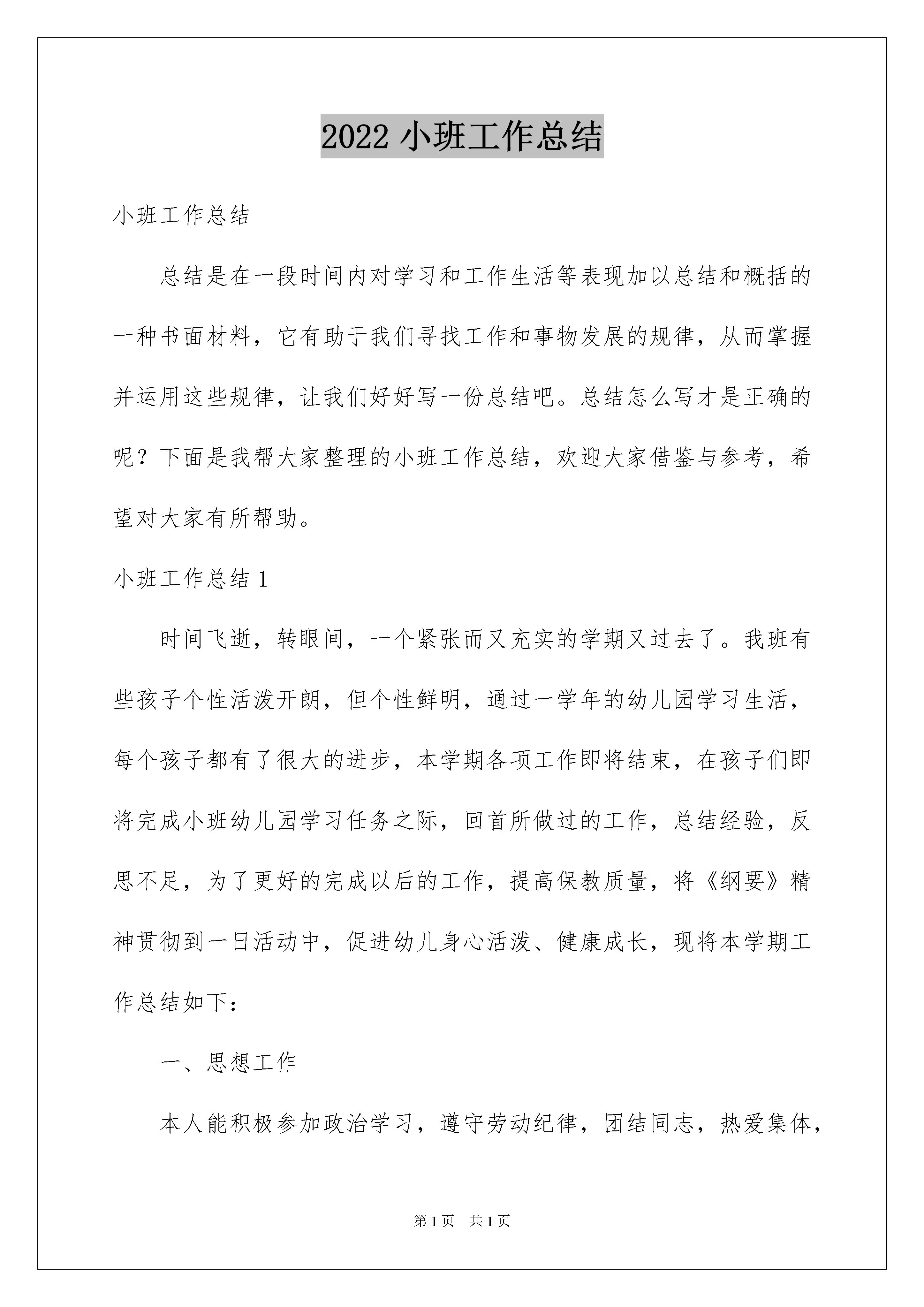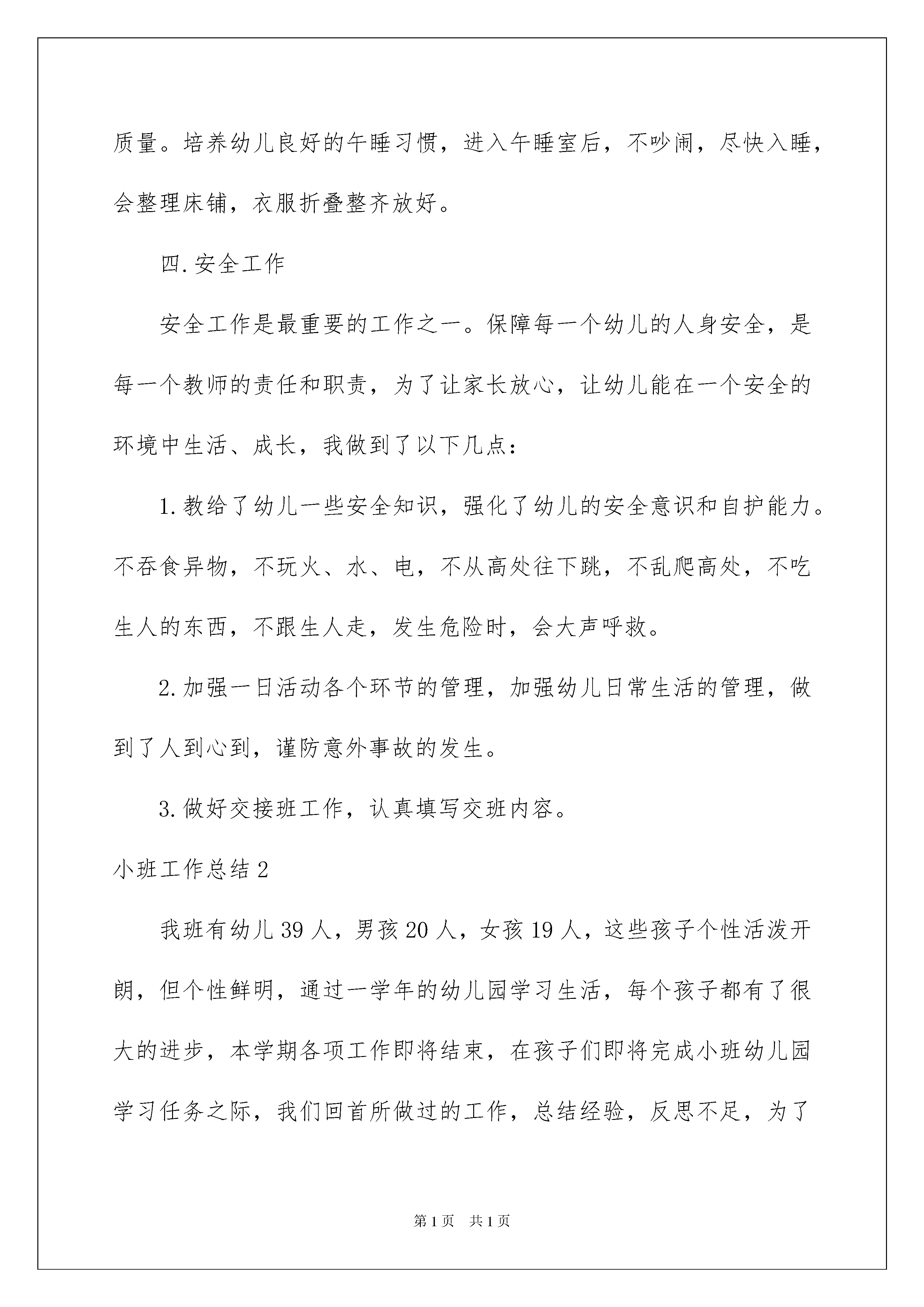 2022小班工作总结小班工作总结总结是在一段时间内对学习和工作生活等表现加以总结和概括的一种书面材料,它有助于我们寻找工作和事物发展的规律,从而掌握并运用这些规律,让我们好好写一份总结吧。总结怎么写才是正确的呢?下面是我帮大家整理的小班工作总结,欢迎大家借鉴与参考,希望对大家有所帮助。小班工作总结1时间飞逝,转眼间,一个紧张而又充实的学期又过去了。我班有些孩子个性活泼开朗,但个性鲜明,通过一学年的幼儿园学习生活,每个孩子都有了很大的进步,本学期各项工作即将结束,在孩子们即将完成小班幼儿园学习任务之际,回首所做过的工作,总结经验,反思不足,为了更好的完成以后的工作,提高保教质量,将《纲要》精神贯彻到一日活动中,促进幼儿身心活泼、健康成长,现将本学期工作总结如下:一、思想工作本人能积极参加政治学习,遵守劳动纪律,团结同志,热爱集体,服从分配,对班级工作认真负责,在工作中努力求真、求实、求新。以积极热情的心态去完成园里安排的各项工作。积极参加园内各项活动及年级组教研活动,做好各项工作,积极要求进步。爱岗敬业,做到耐心、爱心、公平、尊重地对待每一个孩子。二、教育工作在教学中我深知要提高教学质量,关键就是要上好课。为了上好课,我备好每一节课。自己动手制作教学用图和教学用具。关注全体幼儿,注重个别教育,使其保持相对稳定性,同时激发幼儿的情感,使幼儿产生愉快的心境,创造良好的课堂气氛。多看对业务有帮助的书籍,不断扩宽知识面,为教学内容注入新的活力力。在教育教学活动中,为幼儿创设良好的机会与条件,提供充足的操作材料。在一日活动中,注意教给幼儿初浅的、简单的生活知识经验,培养幼儿独立解决问题的能力。在教育教学活动中认真备课,做好课前的物质准备和知识准备工作。注意将理论贯穿于教学实践中,善于总结经验,每月撰写教育随笔,以提高自身能力与写作能力。在教学中要处理好幼儿的主体地位及教师的主导地位,以多种形式引导幼儿有兴趣地参与活动,并主动去学习,更好地因材施教,因人施教。三.保育工作在日常生活中引导幼儿了解自己与集体的关系,让幼儿知道自己是集体中的一员,并乐于参加集体活动。教育幼儿关心集体,关心同伴,礼貌待人。对幼儿进行品德教育,使幼儿养成有道德、有智慧、有礼貌的好孩子,并同家长密切联系,听取家长意见,根据幼儿在家时的表现,对幼儿进行因材施教,因人施教,同家长一起纠正幼儿不良的习惯。加强了幼儿一日常规的养成教育,加强幼儿各种行为习惯的培养和训练,使幼儿的生活习惯,学习习惯在原有基础上有了一定的发展。做好了班级园舍的环境卫生工作,做到地上无灰尘、纸屑,窗明几净,被褥整洁舒适。严格卫生保健制度,按制度要求给各种玩、用具认真地进行清洗消毒工作,保证了玩、用具的卫生、安全使用。积极配合幼儿园保健医生做好疾病防治和预防接种工作。强化幼儿健康意识,保证了幼儿进餐时心情愉快。注重培养幼儿好的进食习惯,不挑食,不偏食,进餐时不打闹讲话,不掉饭粒。勤为幼儿剪指甲,避免抓伤的安全事故发生。注意观察幼儿不同的破坏性行为,教师给予及时的制止,并进行随机教育。加强了幼儿午睡的管理及巡视,保证午睡时室内的空气质量。培养幼儿良好的午睡习惯,进入午睡室后,不吵闹,尽快入睡,会整理床铺,衣服折叠整齐放好。四.安全工作安全工作是最重要的工作之一。保障每一个幼儿的人身安全,是每一个教师的责任和职责,为了让家长放心,让幼儿能在一个安全的环境中生活、成长,我做到了以下几点:1.教给了幼儿一些安全知识,强化了幼儿的安全意识和自护能力。不吞食异物,不玩火、水、电,不从高处往下跳,不乱爬高处,不吃生人的东西,不跟生人走,发生危险时,会大声呼救。2.加强一日活动各个环节的管理,加强幼儿日常生活的管理,做到了人到心到,谨防意外事故的发生。3.做好交接班工作,认真填写交班内容。小班工作总结2我班有幼儿39人,男孩20人,女孩19人,这些孩子个性活泼开朗,但个性鲜明,通过一学年的幼儿园学习生活,每个孩子都有了很大的进步,本学期各项工作即将结束,在孩子们即将完成小班幼儿园学习任务之际,我们回首所做过的工作,总结经验,反思不足,为了更好的完成以后的工作,提高保教质量,将《纲要》精神贯彻到一日活动中,促进幼儿身心活泼、健康成长,现将本学期工作总结如下:一、教育教学工作1。在教育教学工作中,我们分析本班孩子情况,根据《纲要》和教材要求,认真制定学期工作计划,备好每一次活动,开展了丰富多彩的教育活动,先后完成了4个主题活动,开阔了孩子们的视野,帮助他们获得了丰富的生活经验。我们注重发挥班级的环境作用,定期更换班级的主题墙内容,为孩子开辟动手的小天地,充分利用班级