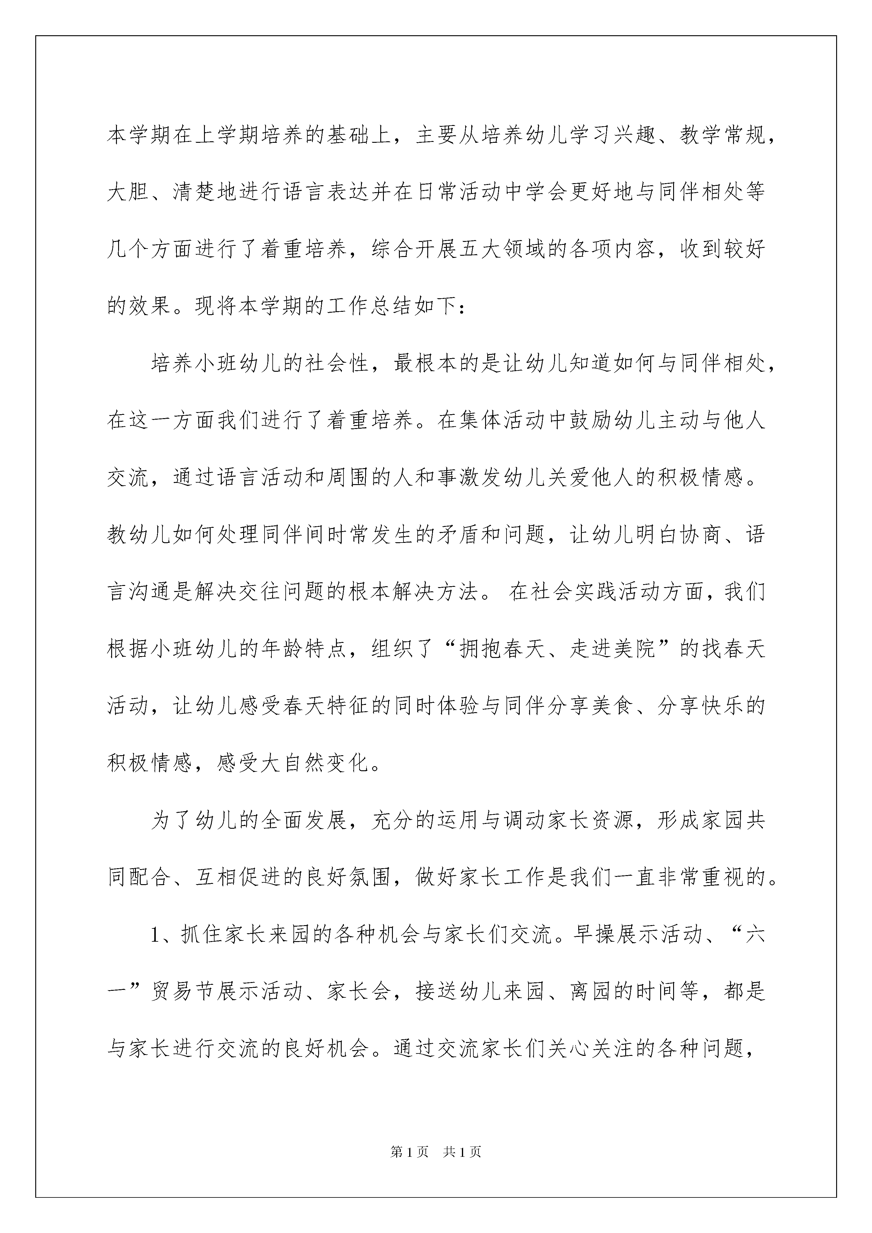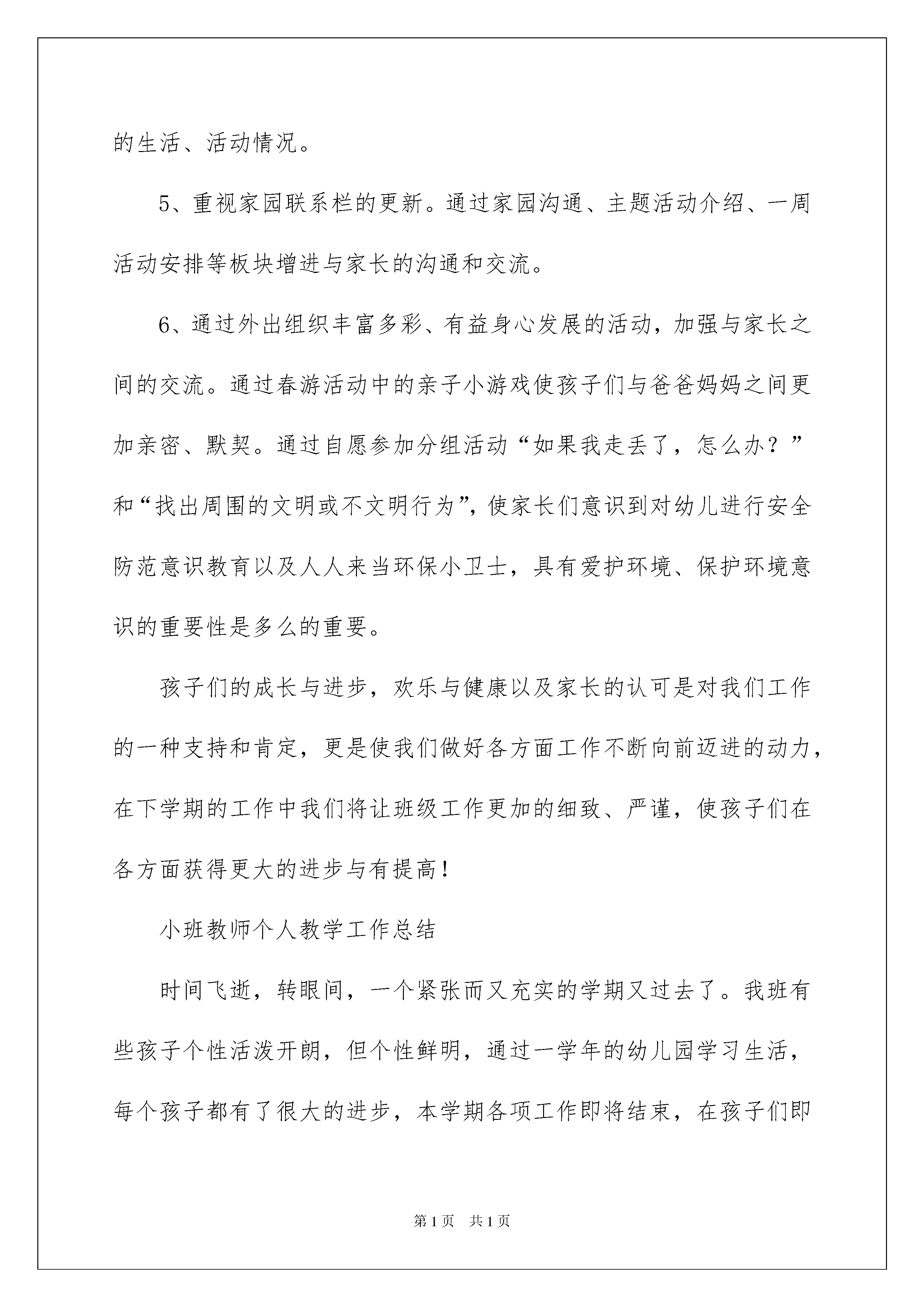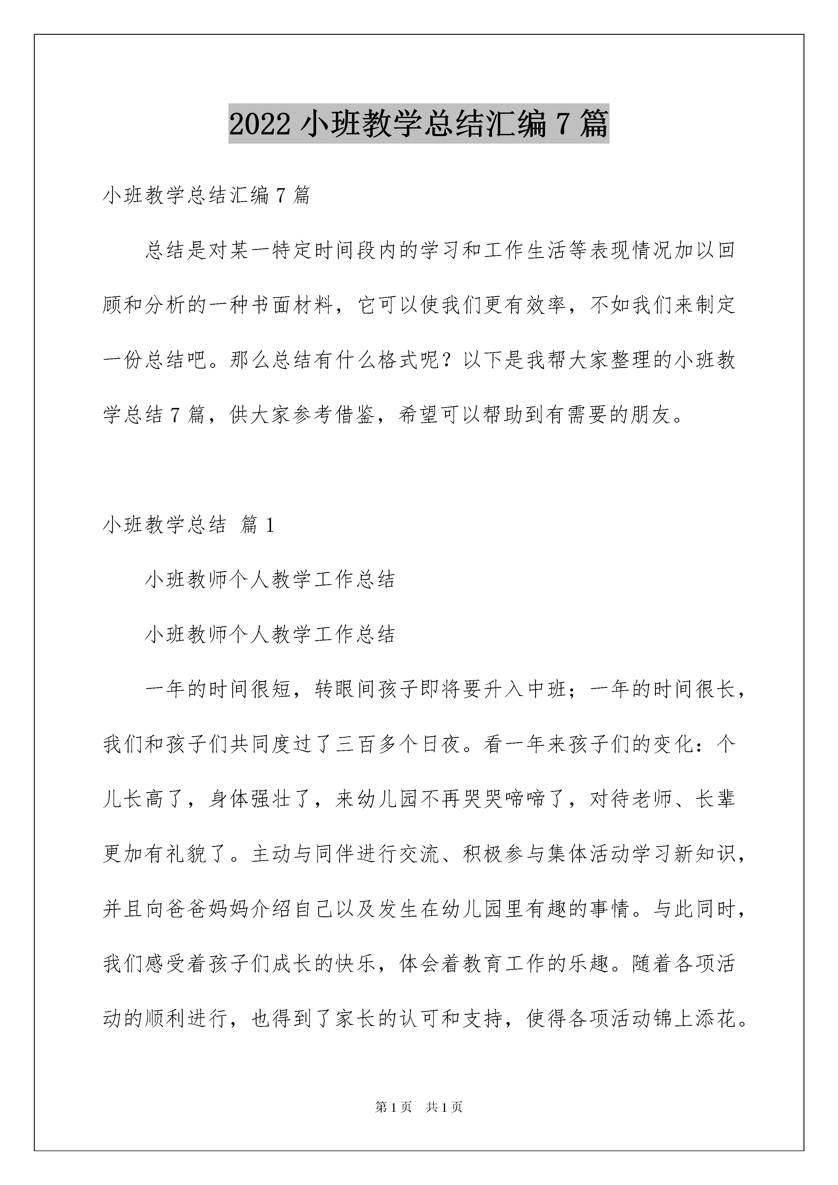 2022小班教学总结汇编7篇小班教学总结汇编7篇总结是对某一特定时间段内的学习和工作生活等表现情况加以回顾和分析的一种书面材料,它可以使我们更有效率,不如我们来制定一份总结吧。那么总结有什么格式呢?以下是我帮大家整理的小班教学总结7篇,供大家参考借鉴,希望可以帮助到有需要的朋友。小班教学总结篇1小班教师个人教学工作总结小班教师个人教学工作总结一年的时间很短,转眼间孩子即将要升入中班;一年的时间很长,我们和孩子们共同度过了三百多个日夜。看一年来孩子们的变化:个儿长高了,身体强壮了,来幼儿园不再哭哭啼啼了,对待老师、长辈更加有礼貌了。主动与同伴进行交流、积极参与集体活动学习新知识,并且向爸爸妈妈介绍自己以及发生在幼儿园里有趣的事情。与此同时,我们感受着孩子们成长的快乐,体会着教育工作的乐趣。随着各项活动的顺利进行,也得到了家长的认可和支持,使得各项活动锦上添花。本学期在上学期培养的基础上,主要从培养幼儿学习兴趣、教学常规,大胆、清楚地进行语言表达并在日常活动中学会更好地与同伴相处等几个方面进行了着重培养,综合开展五大领域的各项内容,收到较好的效果。现将本学期的工作总结如下:培养小班幼儿的社会性,最根本的是让幼儿知道如何与同伴相处,在这一方面我们进行了着重培养。在集体活动中鼓励幼儿主动与他人交流,通过语言活动和周围的人和事激发幼儿关爱他人的积极情感。教幼儿如何处理同伴间时常发生的矛盾和问题,让幼儿明白协商、语言沟通是解决交往问题的根本解决方法。在社会实践活动方面,我们根据小班幼儿的年龄特点,组织了“拥抱春天、走进美院”的找春天活动,让幼儿感受春天特征的同时体验与同伴分享美食、分享快乐的积极情感,感受大自然变化。为了幼儿的全面发展,充分的运用与调动家长资源,形成家园共同配合、互相促进的良好氛围,做好家长工作是我们一直非常重视的。1、抓住家长来园的各种机会与家长们交流。早操展示活动、“六一”贸易节展示活动、家长会,接送幼儿来园、离园的时间等,都是与家长进行交流的良好机会。通过交流家长们关心关注的各种问题,使我们理解了家长们的辛劳与不易,家长们也更加理解支持我们的工作。2、通过小任务的形式与家长进行沟通。我们每天将教育教学活动内容写在周计划表上,使家长们清楚的知道幼儿的每日教学内容。同时我们留一些小任务,比如:请爸爸妈妈听幼儿演唱歌曲、和孩子一起做游戏等形式,帮助促进幼儿巩固所学内容,结束后请家长欣赏幼儿作品。家长通过帮助幼儿完成这些小任务了解了我们的日常工作和自己孩子的掌握水平,又增进了与孩子们之间的感情。3、根据每位幼儿的特点、水平填写《幼儿成长评估体系》。《幼儿成长评估体系》非常的科学、系统,从各个方面评价幼儿。我们除了认真的填写,还将家长的填写的内容及时的进行反馈,使孩子们在轻松愉悦的氛围中清楚的认识到自己的不足,引导孩子们为以后改进不足,而不断努力。4、利用好幼儿园网站这个交流的平台,用现代化的技术搭起家园共育的桥梁。及时的把我们的活动安排、班级新闻介绍给家长,并把孩子们在园的活动拍成照片进行上传,让家长直观的了解孩子们在园的生活、活动情况。5、重视家园联系栏的更新。通过家园沟通、主题活动介绍、一周活动安排等板块增进与家长的沟通和交流。6、通过外出组织丰富多彩、有益身心发展的活动,加强与家长之间的交流。通过春游活动中的亲子小游戏使孩子们与爸爸妈妈之间更加亲密、默契。通过自愿参加分组活动“如果我走丢了,怎么办?”和“找出周围的文明或不文明行为”,使家长们意识到对幼儿进行安全防范意识教育以及人人来当环保小卫士,具有爱护环境、保护环境意识的重要性是多么的重要。孩子们的成长与进步,欢乐与健康以及家长的认可是对我们工作的一种支持和肯定,更是使我们做好各方面工作不断向前迈进的动力,在下学期的工作中我们将让班级工作更加的细致、严谨,使孩子们在各方面获得更大的进步与有提高!小班教师个人教学工作总结时间飞逝,转眼间,一个紧张而又充实的学期又过去了。我班有些孩子个性活泼开朗,但个性鲜明,通过一学年的幼儿园学习生活,每个孩子都有了很大的进步,本学期各项工作即将结束,在孩子们即将完成小班幼儿园学习任务之际,回首所做过的工作,总结经验,反思不足,为了更好的完成以后的工作,提高保教质量,将《纲要》精神贯彻到一日活动中,促进幼儿身心活泼、健康成长,现将本学期工作总结如下:一、思想工作本人能积极参加政治学习,遵守劳动纪律,团结同志,热爱集体,服从分配,对班级工作认真负责,在工作中努力求真、求实、求新。以积极热情的心态去完成园里安排的各项工作。积极参加园内各项活动及年级组教研活动,做好各项工作,积极要求进步