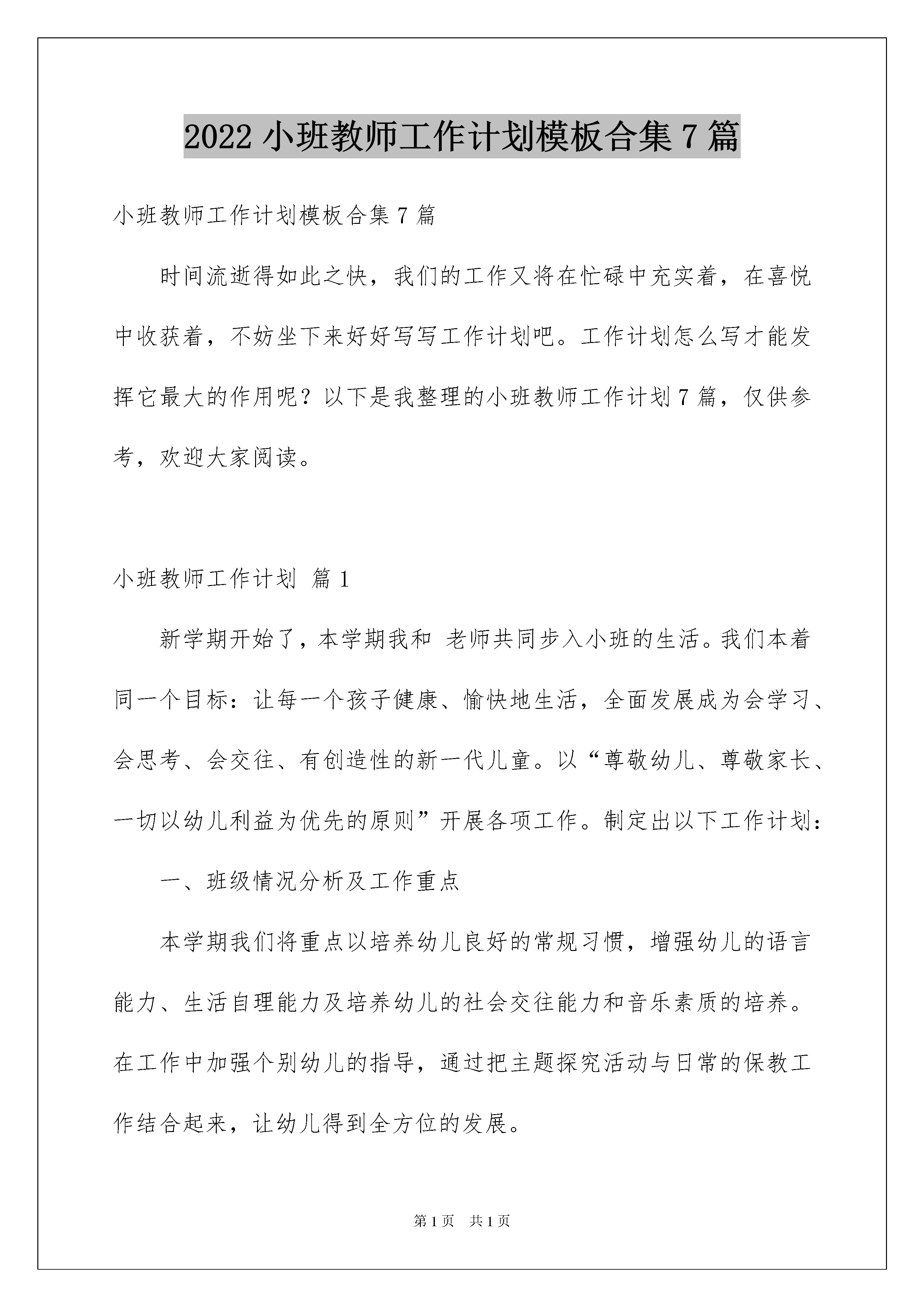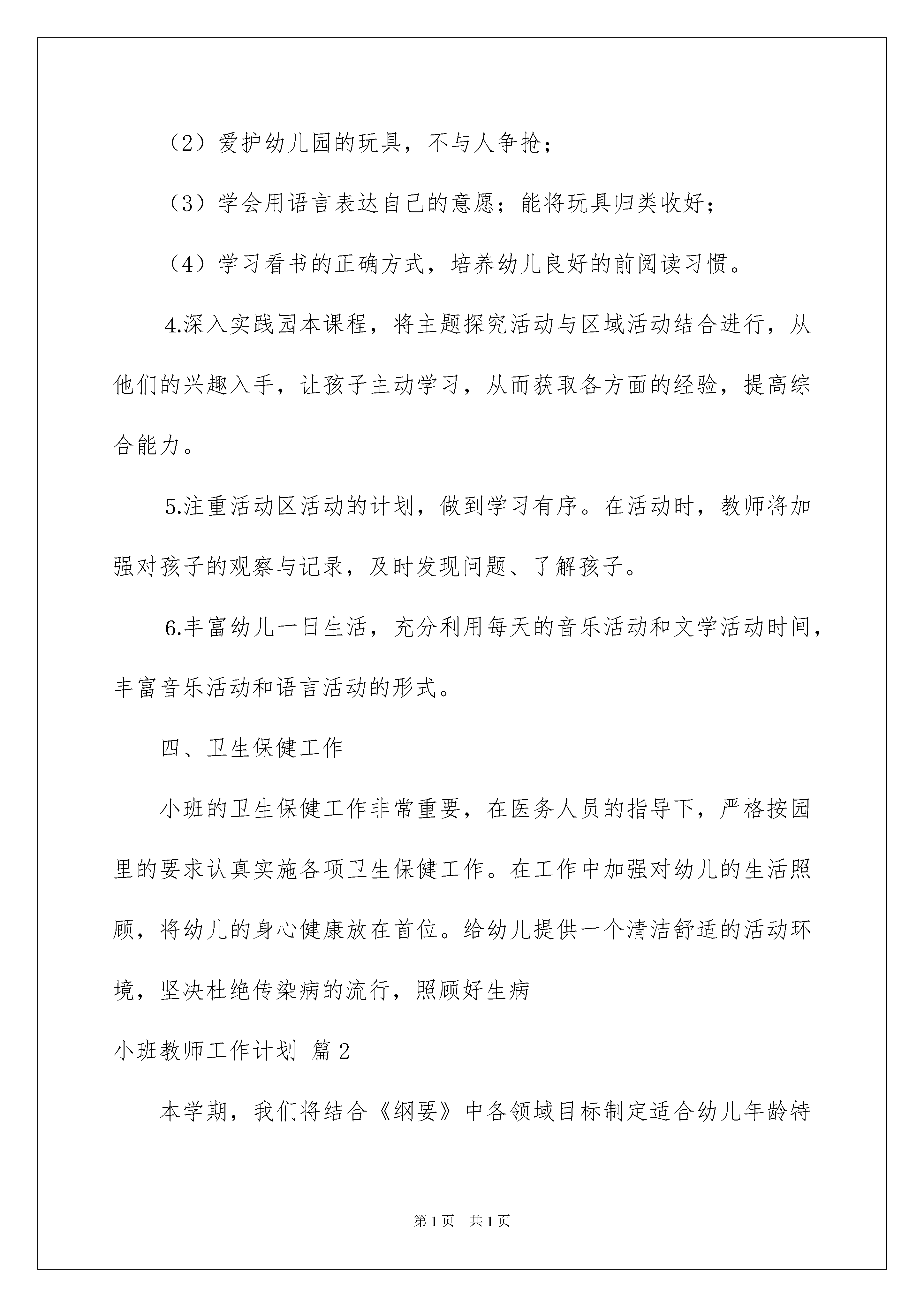 2022小班教师工作计划模板合集7篇小班教师工作计划模板合集7篇时间流逝得如此之快,我们的工作又将在忙碌中充实着,在喜悦中收获着,不妨坐下来好好写写工作计划吧。工作计划怎么写才能发挥它最大的作用呢?以下是我整理的小班教师工作计划7篇,仅供参考,欢迎大家阅读。小班教师工作计划篇1新学期开始了,本学期我和老师共同步入小班的生活。我们本着同一个目标:让每一个孩子健康、愉快地生活,全面发展成为会学习、会思考、会交往、有创造性的新一代儿童。以“尊敬幼儿、尊敬家长、一切以幼儿利益为优先的原则”开展各项工作。制定出以下工作计划:一、班级情况分析及工作重点本学期我们将重点以培养幼儿良好的常规习惯,增强幼儿的语言能力、生活自理能力及培养幼儿的社会交往能力和音乐素质的培养。在工作中加强个别幼儿的指导,通过把主题探究活动与日常的保教工作结合起来,让幼儿得到全方位的发展。二、幼儿发展目标(一)健康领域⒈逐步适应幼儿园的集体生活,情绪基本愉快。⒉在成人的帮助下学习独立喝水、进餐、洗手、入厕,学习穿脱简单的衣裤、鞋。⒊了解简单的卫生知识,愿意接受健康检查,认识五官懂得保护。⒋愿意和同伴参加体育活动,发展走、跑、跳、钻、攀爬等动作。(二)语言领域⒈学习普通话,乐意运用语言表达自己的喜好与需求,学习用普通话与人交流。⒉学习安静地听他人讲话,能听懂简单的语言指令并按其行动。⒊喜欢念儿歌、听故事、看表演、看图书等,学习表达自己的认识和感受。(三)社会领域⒈愿意上幼儿园,能参加幼儿园的活动,愿意亲近老师或熟悉的成人。⒉乐意和同伴一起游戏,尝试学习分享等待,体验其中的快乐。⒊在成人启发下学习关注他人明显的情绪表现,学习关心他人。乐意招呼熟悉的人,学习求助和感谢。⒋学习在性别、外形等外在特征上比较自己与别人的不同。⒌学习接受老师的建议和批示,学习在集体生活中遵守基本规则。(四)科学领域⒈在成人引导下,学习发现周围环境中有趣的事物。⒉乐意用多种感官感知周围的物品、现象,了解物品颜色、大小、形状等明显特征。⒊喜欢操作、摆弄。⒋亲近大自然,喜爱与学习爱护周围的植物。(五)艺术领域⒈在成人引导下,能逐渐注意和亲近周围环境中熟悉的诸如花草树木,小动物等美的事物,并产生愉悦的情绪。⒉喜欢听音乐,能借助动作,语言等表达对艺术作品的感受。⒊尝试用自己喜欢的颜色、材料和工具进行美术活动,学习用画、剪、贴、撕、提等技能。⒋学习用自然的声音唱歌,学习用身体动作自由地进行歌表演、做律动,喜欢打击乐活动,学习和老师、同伴一起做音乐游戏。三、教育教学工作⒈做好新生入园的情绪安抚工作。由于大部分孩子第一次入园,因此他们会产生哭闹、不愿来园的情绪,我们教师应做好以下几方面的工作:(1)开学前做好家园联系工作,接待孩子入园,召开家长会,介绍班级情况,让家长填写一份幼儿家庭生活调查表,使家长、教师、孩子三者之间能尽快熟悉,减轻孩子来园的消极情绪。(2)给孩子提供一个温馨、舒适、有趣的教室环境(3)教师以亲切、温和的态度对待孩子,消除他们的陌生感。⒉培养幼儿良好的生活常规,提高生活自理能力,做到生活有序。(1)认识自己的标记;(2)学会正确的洗手方法;(3)能安静午睡,不吵醒别人;(4)培养良好的进餐习惯,能学习自己吃饭等。⒊培养良好的学习常规。(1)愿意参加各项集体活动,注意力集中;(2)爱护幼儿园的玩具,不与人争抢;(3)学会用语言表达自己的意愿;能将玩具归类收好;(4)学习看书的正确方式,培养幼儿良好的前阅读习惯。⒋深入实践园本课程,将主题探究活动与区域活动结合进行,从他们的兴趣入手,让孩子主动学习,从而获取各方面的经验,提高综合能力。⒌注重活动区活动的计划,做到学习有序。在活动时,教师将加强对孩子的观察与记录,及时发现问题、了解孩子。⒍丰富幼儿一日生活,充分利用每天的音乐活动和文学活动时间,丰富音乐活动和语言活动的形式。四、卫生保健工作小班的卫生保健工作非常重要,在医务人员的指导下,严格按园里的要求认真实施各项卫生保健工作。在工作中加强对幼儿的生活照顾,将幼儿的身心健康放在首位。给幼儿提供一个清洁舒适的活动环境,坚决杜绝传染病的流行,照顾好生病小班教师工作计划篇2本学期,我们将结合《纲要》中各领域目标制定适合幼儿年龄特点的教育教学目标,认真备好每一节教育活动,准备色彩鲜明、形象直观的教具,让幼儿在轻松愉快的气氛中学习。在语言领域,在教育活动、区域活动、生活活动中,会正确使用礼貌用语,学会与伙伴交谈,倾听他人讲话,用完整话与他人交流等。社会领域中,敢于在活动中大胆的与伙伴交往,初步学习规则意识,懂得与伙伴合作和分享,做力所能及的事,爱自己的父母