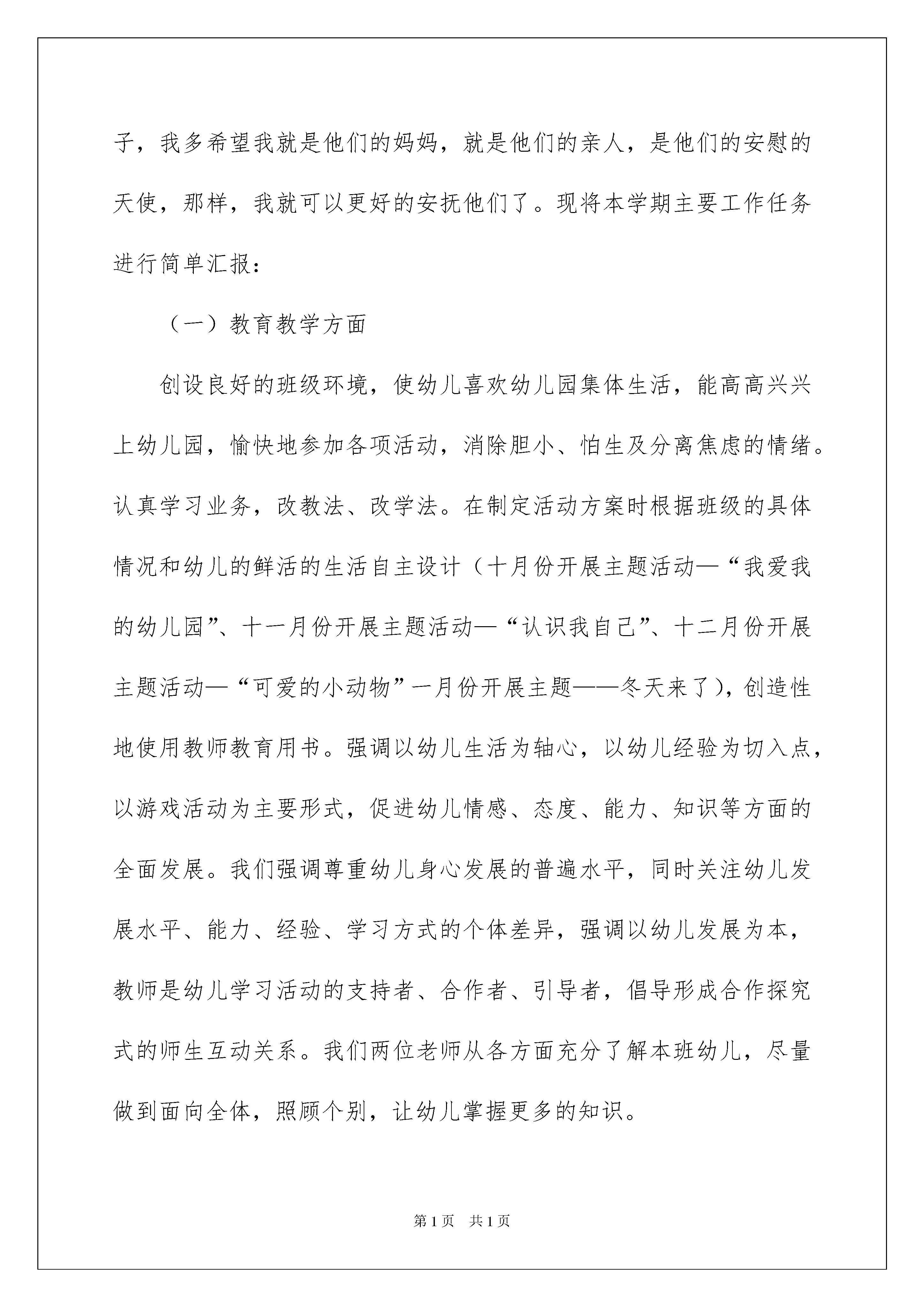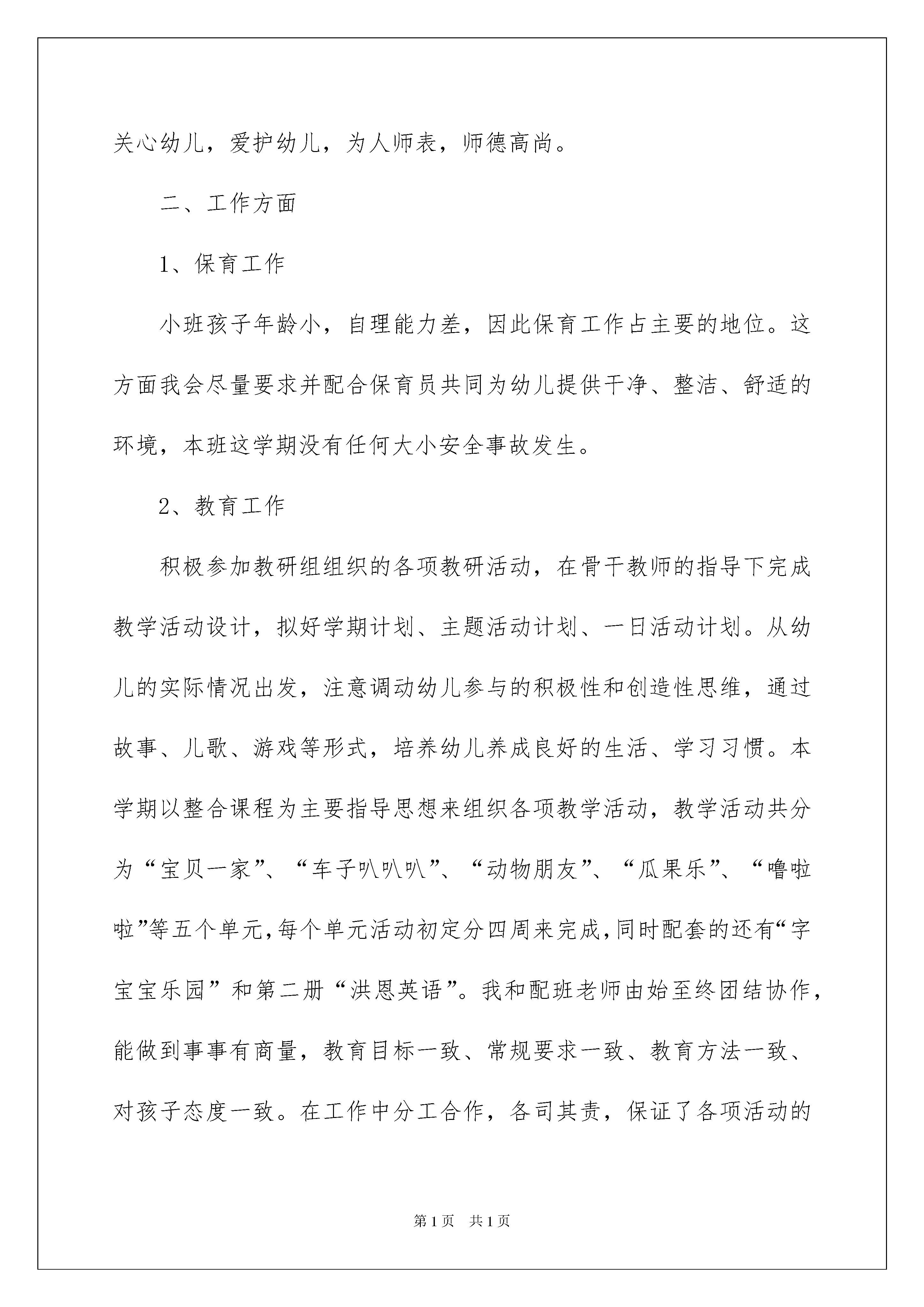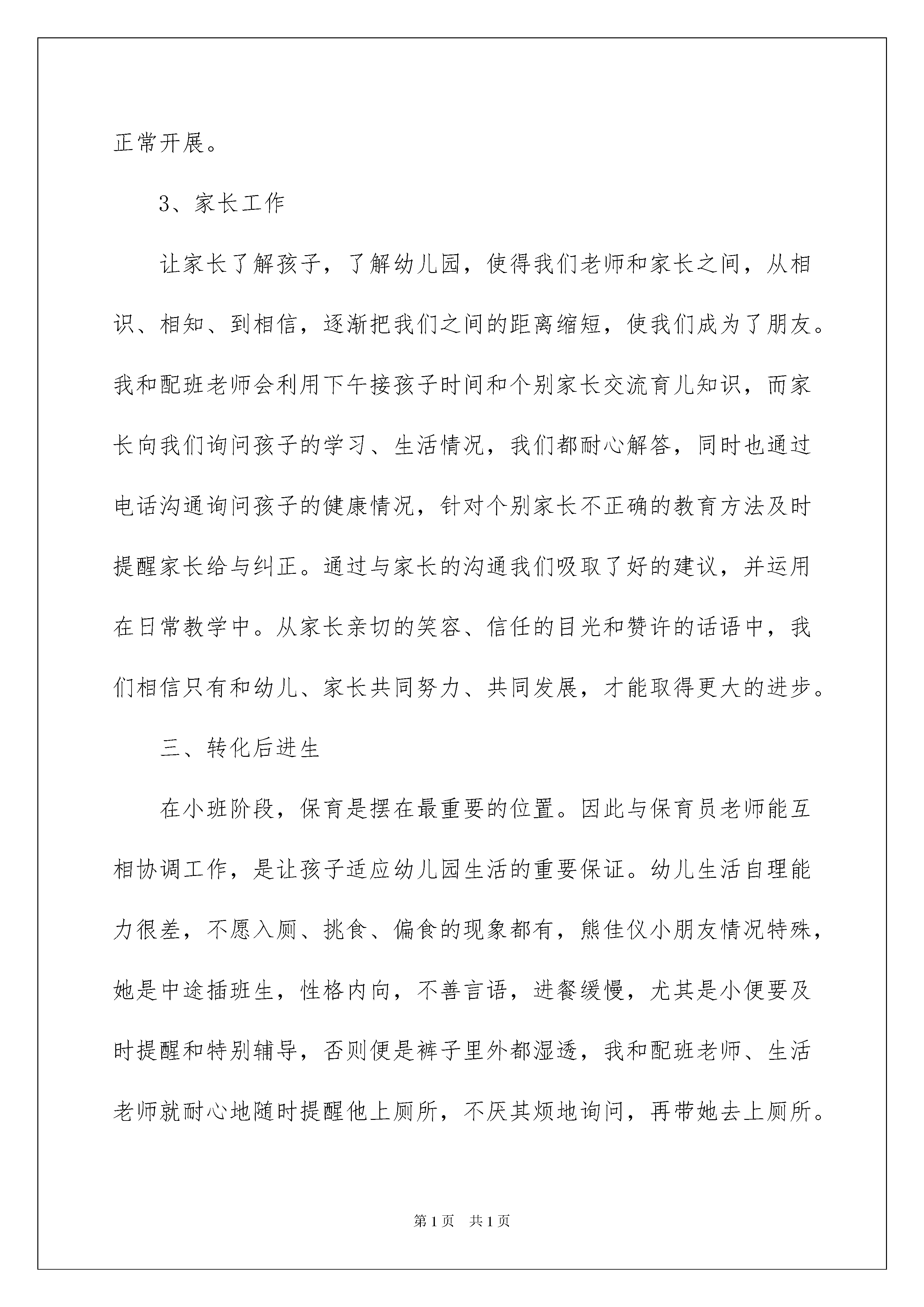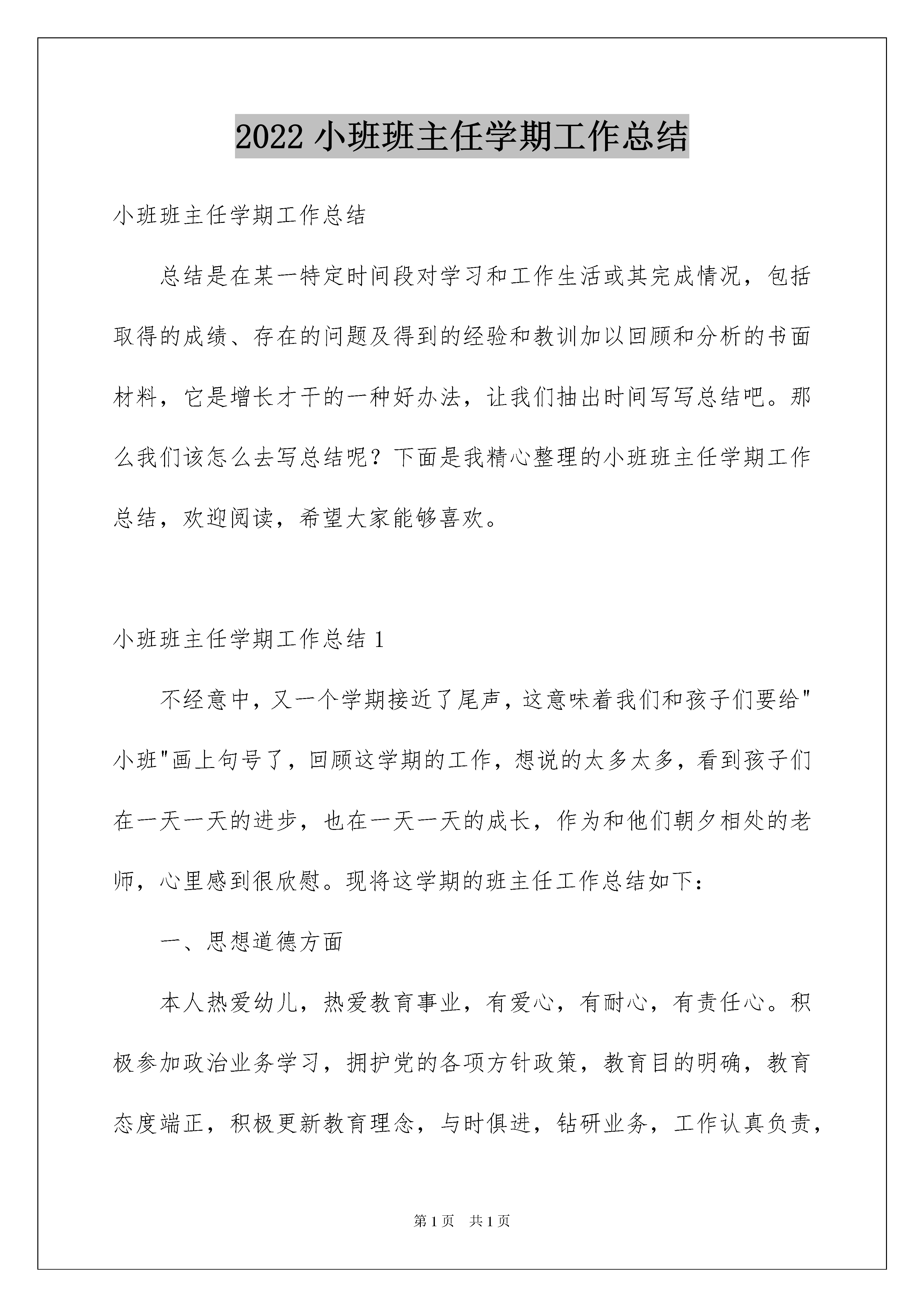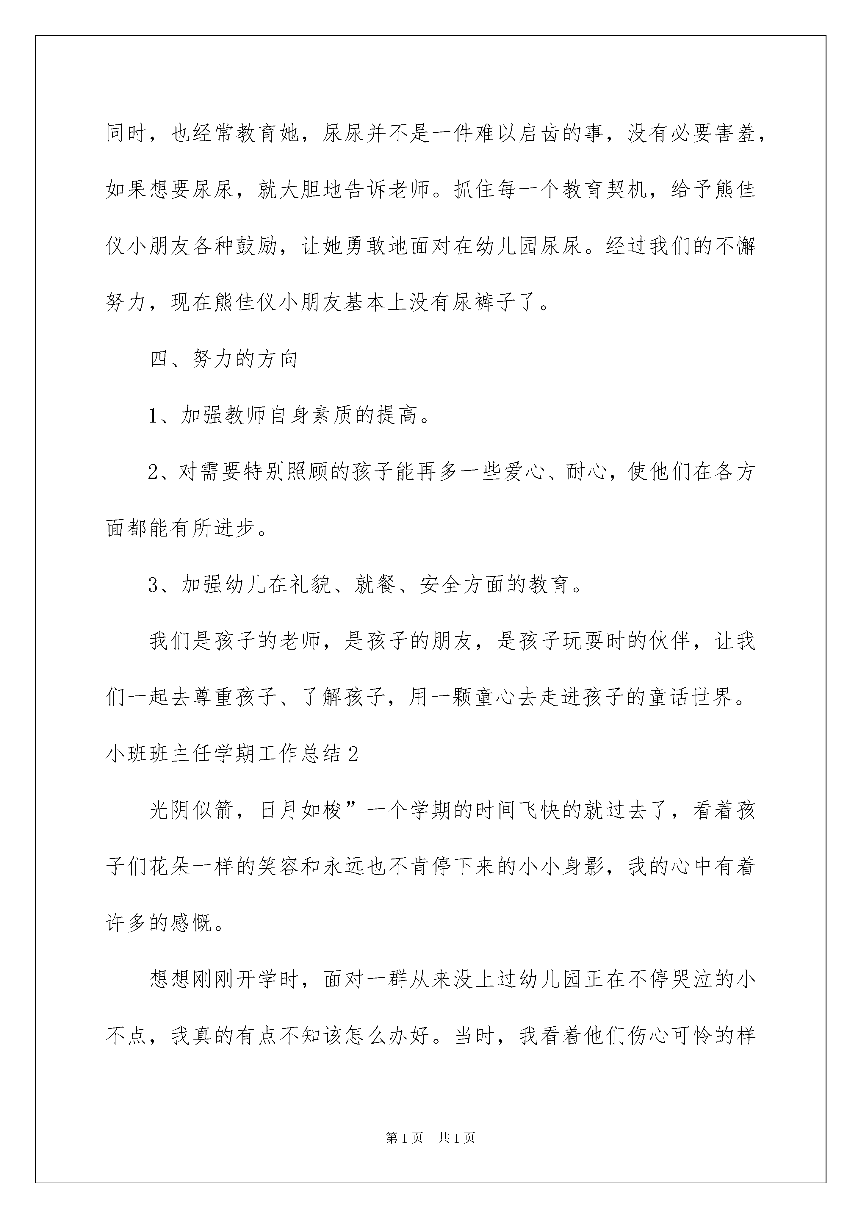 2022小班班主任学期工作总结小班班主任学期工作总结总结是在某一特定时间段对学习和工作生活或其完成情况,包括取得的成绩、存在的问题及得到的经验和教训加以回顾和分析的书面材料,它是增长才干的一种好办法,让我们抽出时间写写总结吧。那么我们该怎么去写总结呢?下面是我精心整理的小班班主任学期工作总结,欢迎阅读,希望大家能够喜欢。小班班主任学期工作总结1不经意中,又一个学期接近了尾声,这意味着我们和孩子们要给"小班"画上句号了,回顾这学期的工作,想说的太多太多,看到孩子们在一天一天的进步,也在一天一天的成长,作为和他们朝夕相处的老师,心里感到很欣慰。现将这学期的班主任工作总结如下:一、思想道德方面本人热爱幼儿,热爱教育事业,有爱心,有耐心,有责任心。积极参加政治业务学习,拥护党的各项方针政策,教育目的明确,教育态度端正,积极更新教育理念,与时俱进,钻研业务,工作认真负责,关心幼儿,爱护幼儿,为人师表,师德高尚。二、工作方面1、保育工作小班孩子年龄小,自理能力差,因此保育工作占主要的地位。这方面我会尽量要求并配合保育员共同为幼儿提供干净、整洁、舒适的环境,本班这学期没有任何大小安全事故发生。2、教育工作积极参加教研组组织的各项教研活动,在骨干教师的指导下完成教学活动设计,拟好学期计划、主题活动计划、一日活动计划。从幼儿的实际情况出发,注意调动幼儿参与的积极性和创造性思维,通过故事、儿歌、游戏等形式,培养幼儿养成良好的生活、学习习惯。本学期以整合课程为主要指导思想来组织各项教学活动,教学活动共分为“宝贝一家”、“车子叭叭叭”、“动物朋友”、“瓜果乐”、“噜啦啦”等五个单元,每个单元活动初定分四周来完成,同时配套的还有“字宝宝乐园”和第二册“洪恩英语”。我和配班老师由始至终团结协作,能做到事事有商量,教育目标一致、常规要求一致、教育方法一致、对孩子态度一致。在工作中分工合作,各司其责,保证了各项活动的正常开展。3、家长工作让家长了解孩子,了解幼儿园,使得我们老师和家长之间,从相识、相知、到相信,逐渐把我们之间的距离缩短,使我们成为了朋友。我和配班老师会利用下午接孩子时间和个别家长交流育儿知识,而家长向我们询问孩子的学习、生活情况,我们都耐心解答,同时也通过电话沟通询问孩子的健康情况,针对个别家长不正确的教育方法及时提醒家长给与纠正。通过与家长的沟通我们吸取了好的建议,并运用在日常教学中。从家长亲切的笑容、信任的目光和赞许的话语中,我们相信只有和幼儿、家长共同努力、共同发展,才能取得更大的进步。三、转化后进生在小班阶段,保育是摆在最重要的位置。因此与保育员老师能互相协调工作,是让孩子适应幼儿园生活的重要保证。幼儿生活自理能力很差,不愿入厕、挑食、偏食的现象都有,熊佳仪小朋友情况特殊,她是中途插班生,性格内向,不善言语,进餐缓慢,尤其是小便要及时提醒和特别辅导,否则便是裤子里外都湿透,我和配班老师、生活老师就耐心地随时提醒他上厕所,不厌其烦地询问,再带她去上厕所。同时,也经常教育她,尿尿并不是一件难以启齿的事,没有必要害羞,如果想要尿尿,就大胆地告诉老师。抓住每一个教育契机,给予熊佳仪小朋友各种鼓励,让她勇敢地面对在幼儿园尿尿。经过我们的不懈努力,现在熊佳仪小朋友基本上没有尿裤子了。四、努力的方向1、加强教师自身素质的提高。2、对需要特别照顾的孩子能再多一些爱心、耐心,使他们在各方面都能有所进步。3、加强幼儿在礼貌、就餐、安全方面的教育。我们是孩子的老师,是孩子的朋友,是孩子玩耍时的伙伴,让我们一起去尊重孩子、了解孩子,用一颗童心去走进孩子的童话世界。小班班主任学期工作总结2光阴似箭,日月如梭”一个学期的时间飞快的就过去了,看着孩子们花朵一样的笑容和永远也不肯停下来的小小身影,我的心中有着许多的感慨。想想刚刚开学时,面对一群从来没上过幼儿园正在不停哭泣的小不点,我真的有点不知该怎么办好。当时,我看着他们伤心可怜的样子,我多希望我就是他们的妈妈,就是他们的亲人,是他们的安慰的天使,那样,我就可以更好的安抚他们了。现将本学期主要工作任务进行简单汇报:(一)教育教学方面创设良好的班级环境,使幼儿喜欢幼儿园集体生活,能高高兴兴上幼儿园,愉快地参加各项活动,消除胆小、怕生及分离焦虑的情绪。认真学习业务,改教法、改学法。在制定活动方案时根据班级的具体情况和幼儿的鲜活的生活自主设计(十月份开展主题活动—“我爱我的幼儿园”、十一月份开展主题活动—“认识我自己”、十二月份开展主题活动—“可爱的小动物”一月份开展主题——冬天来了),创造性地使用教师教育用书。强调以幼儿生活为轴心,以幼儿经验为切入点,以游戏活动为