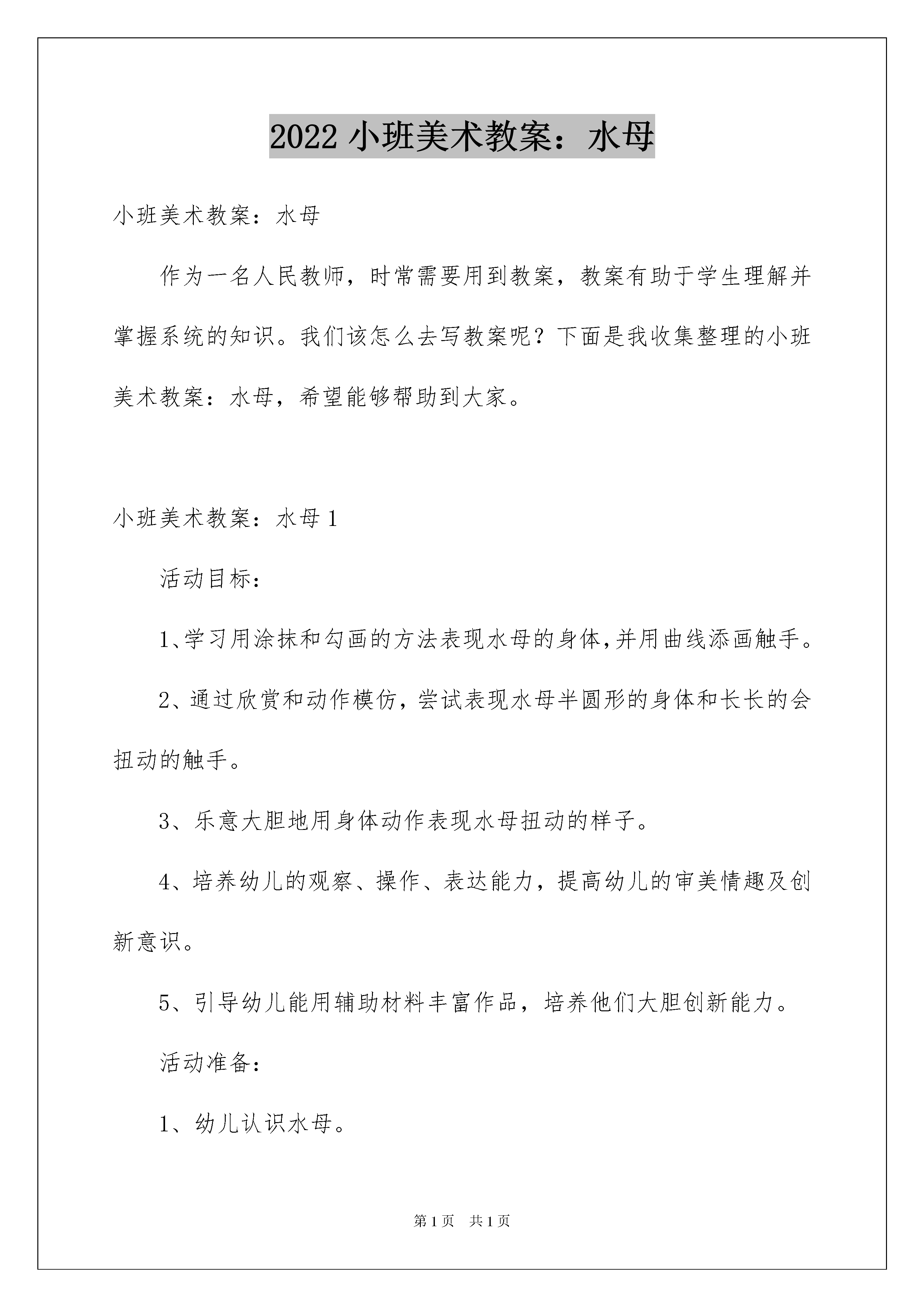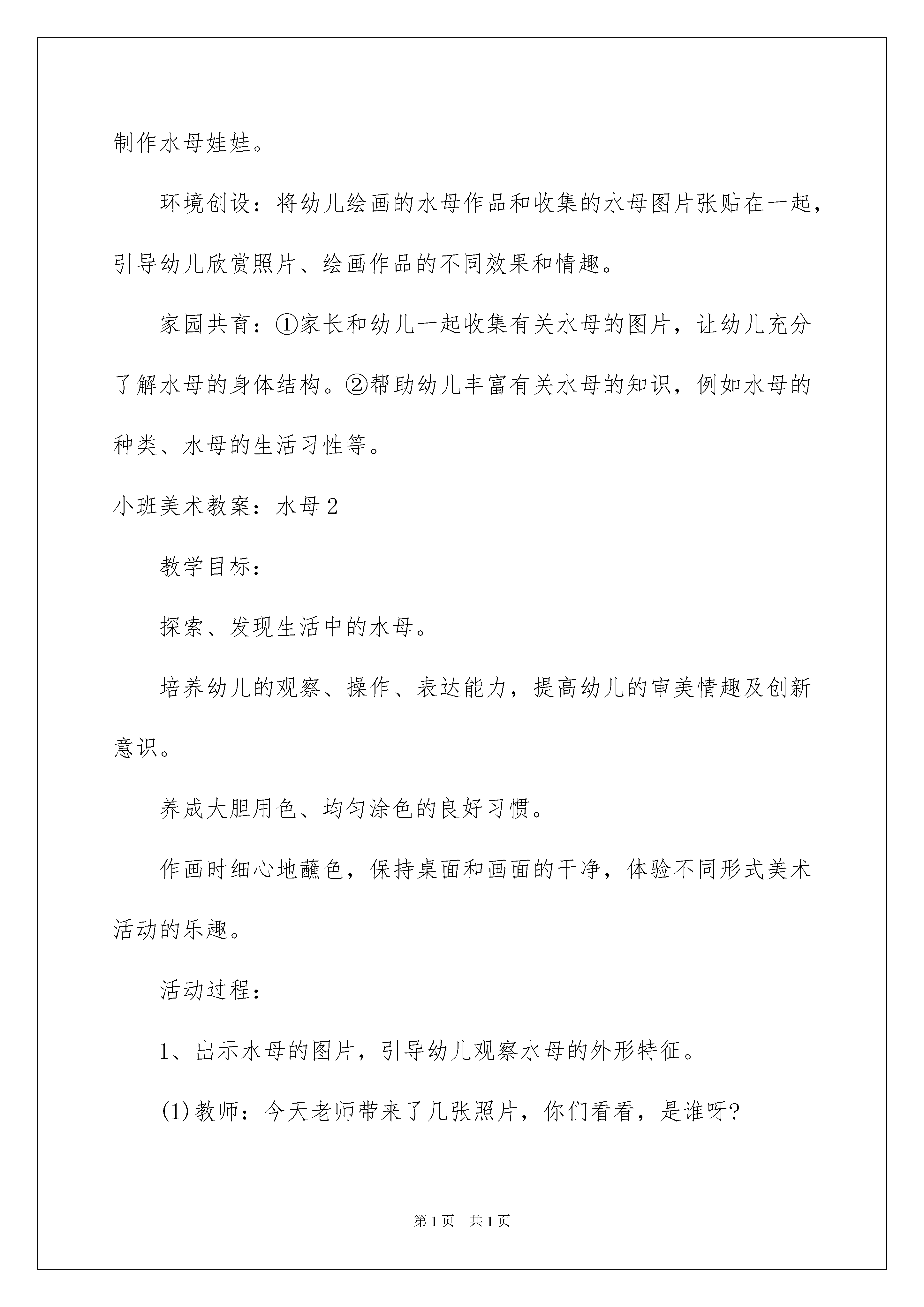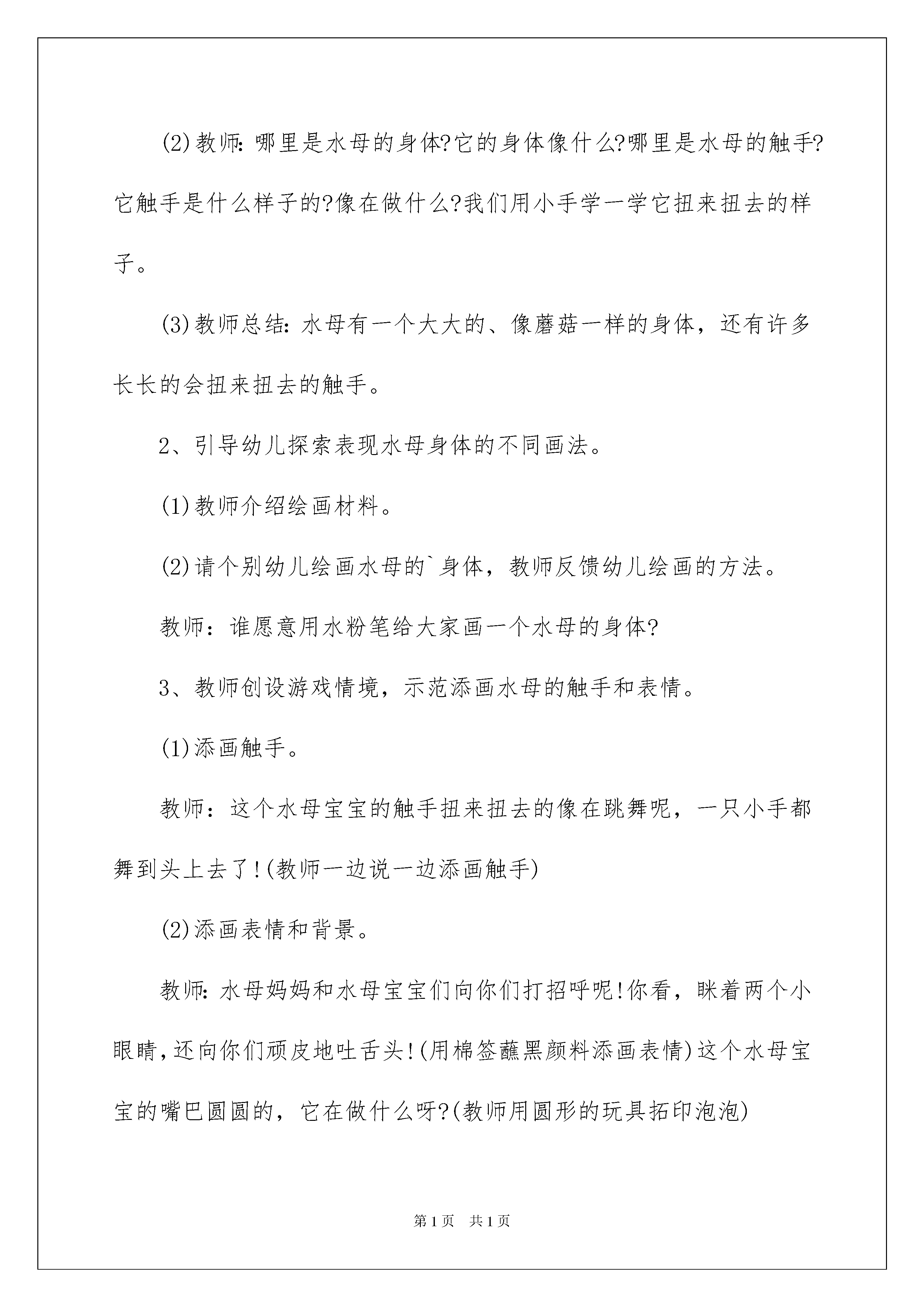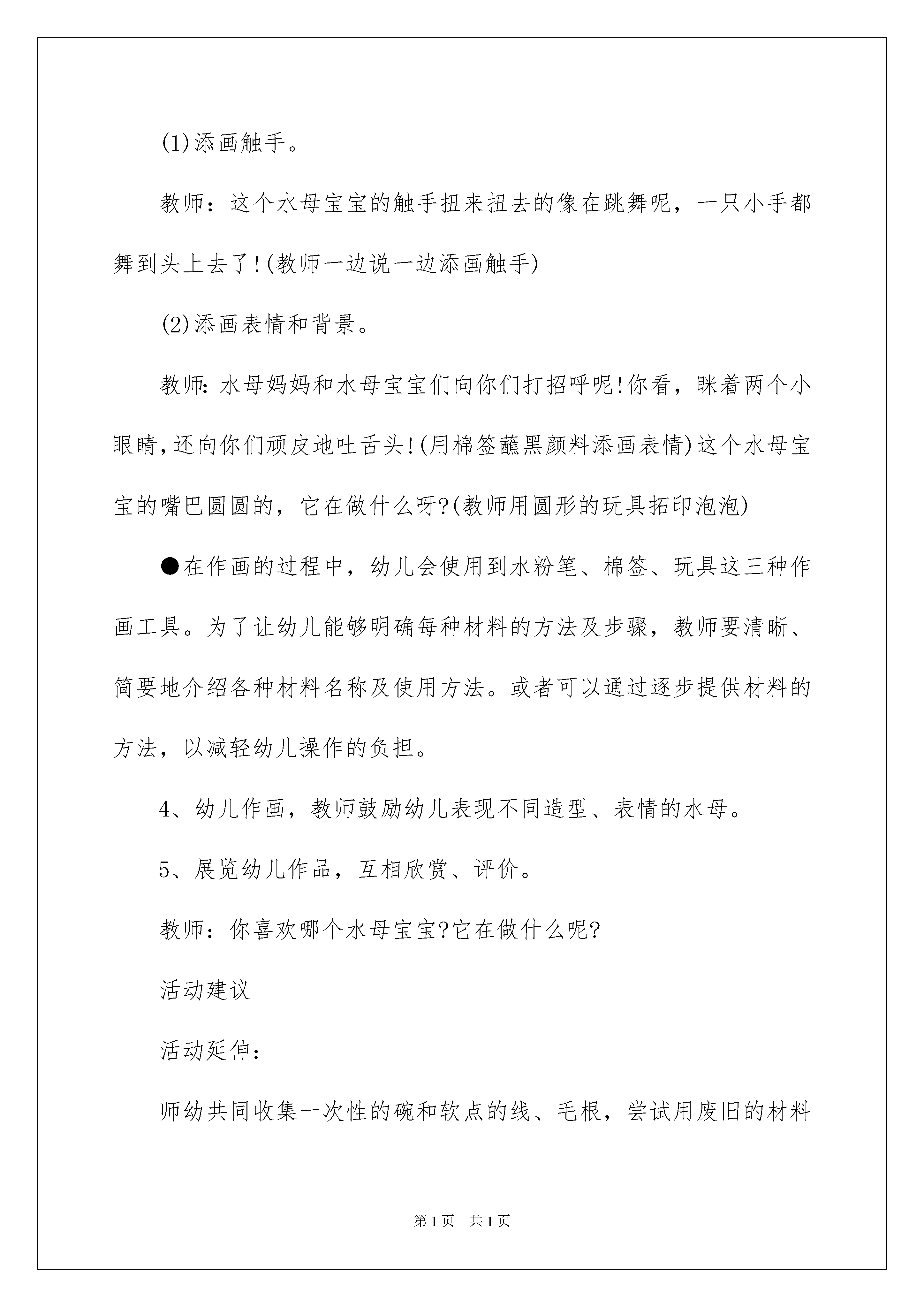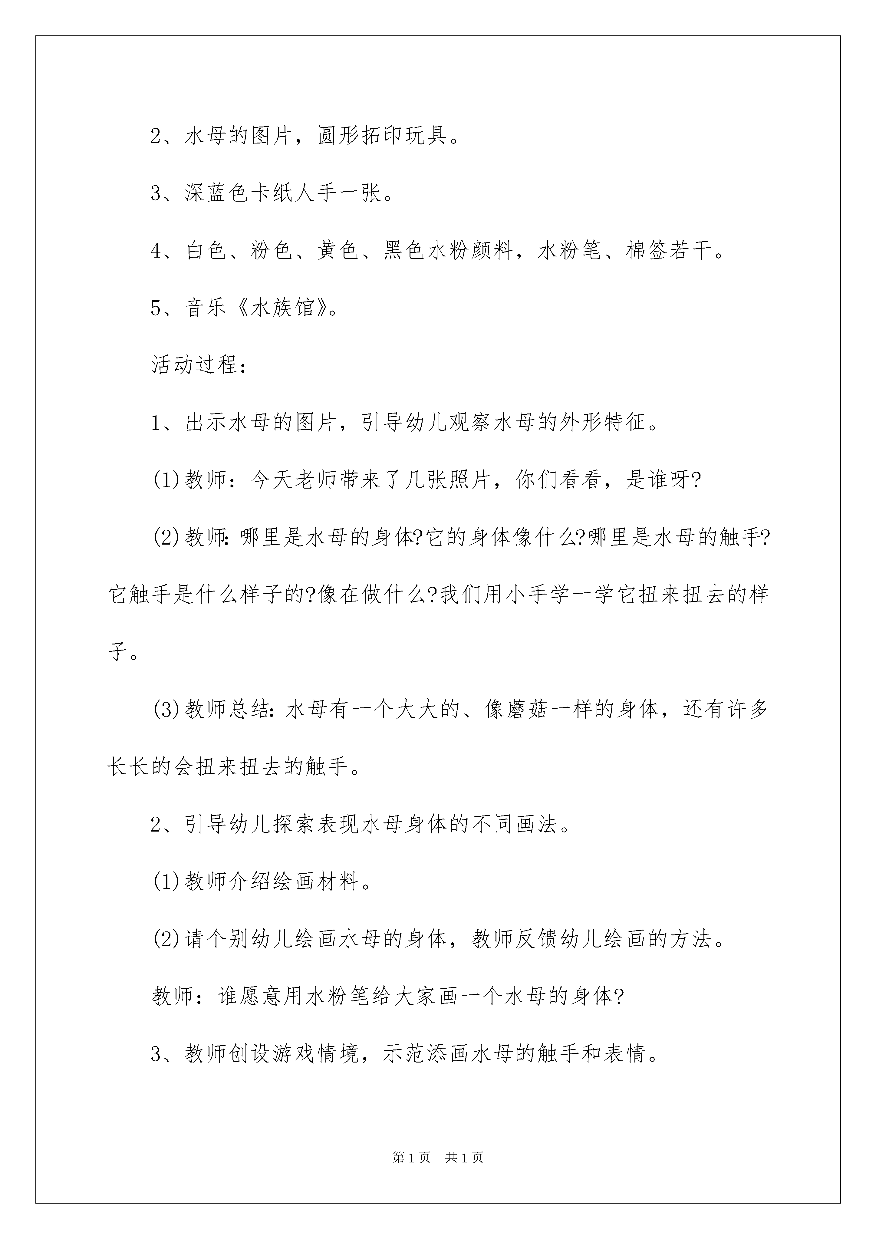 2022小班美术教案:水母小班美术教案:水母作为一名人民教师,时常需要用到教案,教案有助于学生理解并掌握系统的知识。我们该怎么去写教案呢?下面是我收集整理的小班美术教案:水母,希望能够帮助到大家。小班美术教案:水母1活动目标:1、学习用涂抹和勾画的方法表现水母的身体,并用曲线添画触手。2、通过欣赏和动作模仿,尝试表现水母半圆形的身体和长长的会扭动的触手。3、乐意大胆地用身体动作表现水母扭动的样子。4、培养幼儿的观察、操作、表达能力,提高幼儿的审美情趣及创新意识。5、引导幼儿能用辅助材料丰富作品,培养他们大胆创新能力。活动准备:1、幼儿认识水母。2、水母的图片,圆形拓印玩具。3、深蓝色卡纸人手一张。4、白色、粉色、黄色、黑色水粉颜料,水粉笔、棉签若干。5、音乐《水族馆》。活动过程:1、出示水母的图片,引导幼儿观察水母的外形特征。(1)教师:今天老师带来了几张照片,你们看看,是谁呀?(2)教师:哪里是水母的身体?它的身体像什么?哪里是水母的触手?它触手是什么样子的?像在做什么?我们用小手学一学它扭来扭去的样子。(3)教师总结:水母有一个大大的、像蘑菇一样的身体,还有许多长长的会扭来扭去的触手。2、引导幼儿探索表现水母身体的不同画法。(1)教师介绍绘画材料。(2)请个别幼儿绘画水母的身体,教师反馈幼儿绘画的方法。教师:谁愿意用水粉笔给大家画一个水母的身体?3、教师创设游戏情境,示范添画水母的触手和表情。(1)添画触手。教师:这个水母宝宝的触手扭来扭去的像在跳舞呢,一只小手都舞到头上去了!(教师一边说一边添画触手)(2)添画表情和背景。教师:水母妈妈和水母宝宝们向你们打招呼呢!你看,眯着两个小眼睛,还向你们顽皮地吐舌头!(用棉签蘸黑颜料添画表情)这个水母宝宝的嘴巴圆圆的,它在做什么呀?(教师用圆形的玩具拓印泡泡)●在作画的过程中,幼儿会使用到水粉笔、棉签、玩具这三种作画工具。为了让幼儿能够明确每种材料的方法及步骤,教师要清晰、简要地介绍各种材料名称及使用方法。或者可以通过逐步提供材料的方法,以减轻幼儿操作的负担。4、幼儿作画,教师鼓励幼儿表现不同造型、表情的水母。5、展览幼儿作品,互相欣赏、评价。教师:你喜欢哪个水母宝宝?它在做什么呢?活动建议活动延伸:师幼共同收集一次性的碗和软点的线、毛根,尝试用废旧的材料制作水母娃娃。环境创设:将幼儿绘画的水母作品和收集的水母图片张贴在一起,引导幼儿欣赏照片、绘画作品的不同效果和情趣。家园共育:①家长和幼儿一起收集有关水母的图片,让幼儿充分了解水母的身体结构。②帮助幼儿丰富有关水母的知识,例如水母的种类、水母的生活习性等。小班美术教案:水母2教学目标:探索、发现生活中的水母。培养幼儿的观察、操作、表达能力,提高幼儿的审美情趣及创新意识。养成大胆用色、均匀涂色的良好习惯。作画时细心地蘸色,保持桌面和画面的干净,体验不同形式美术活动的乐趣。活动过程:1、出示水母的图片,引导幼儿观察水母的外形特征。(1)教师:今天老师带来了几张照片,你们看看,是谁呀?(2)教师:哪里是水母的身体?它的身体像什么?哪里是水母的触手?它触手是什么样子的?像在做什么?我们用小手学一学它扭来扭去的样子。(3)教师总结:水母有一个大大的、像蘑菇一样的身体,还有许多长长的会扭来扭去的触手。2、引导幼儿探索表现水母身体的不同画法。(1)教师介绍绘画材料。(2)请个别幼儿绘画水母的`身体,教师反馈幼儿绘画的方法。教师:谁愿意用水粉笔给大家画一个水母的身体?3、教师创设游戏情境,示范添画水母的触手和表情。(1)添画触手。教师:这个水母宝宝的触手扭来扭去的像在跳舞呢,一只小手都舞到头上去了!(教师一边说一边添画触手)(2)添画表情和背景。教师:水母妈妈和水母宝宝们向你们打招呼呢!你看,眯着两个小眼睛,还向你们顽皮地吐舌头!(用棉签蘸黑颜料添画表情)这个水母宝宝的嘴巴圆圆的,它在做什么呀?(教师用圆形的玩具拓印泡泡)4、幼儿作画,教师鼓励幼儿表现不同造型、表情的水母。5、展览幼儿作品,互相欣赏、评价。教师:你喜欢哪个水母宝宝?它在做什么呢?活动延伸:师幼共同收集一次性的碗和软点的线、毛根,尝试用废旧的材料制作水母娃娃。环境创设:将幼儿绘画的水母作品和收集的水母图片张贴在一起,引导幼儿欣赏照片、绘画作品的不同效果和情趣。家园共育:①家长和幼儿一起收集有关水母的图片,让幼儿充分了解水母的身体结构。②帮助幼儿丰富有关水母的知识,例如水母的种类、水母的生活习性等。教学反思:在作画的过程中,幼儿会使用到水粉笔、棉签、玩具这三种作画工具。为了让幼儿能够明确每种材料的方法及步骤,教师要清晰、简要地介
