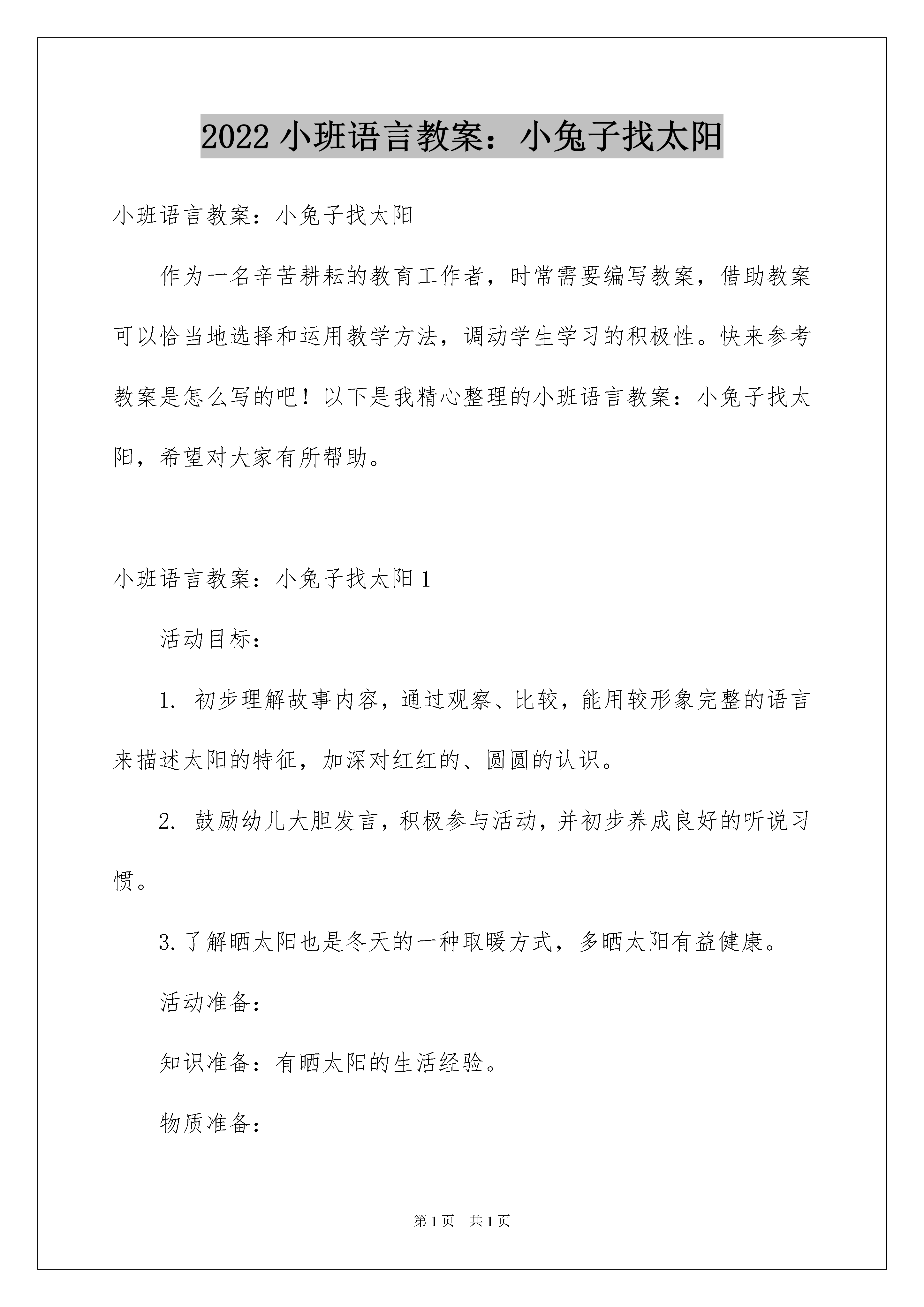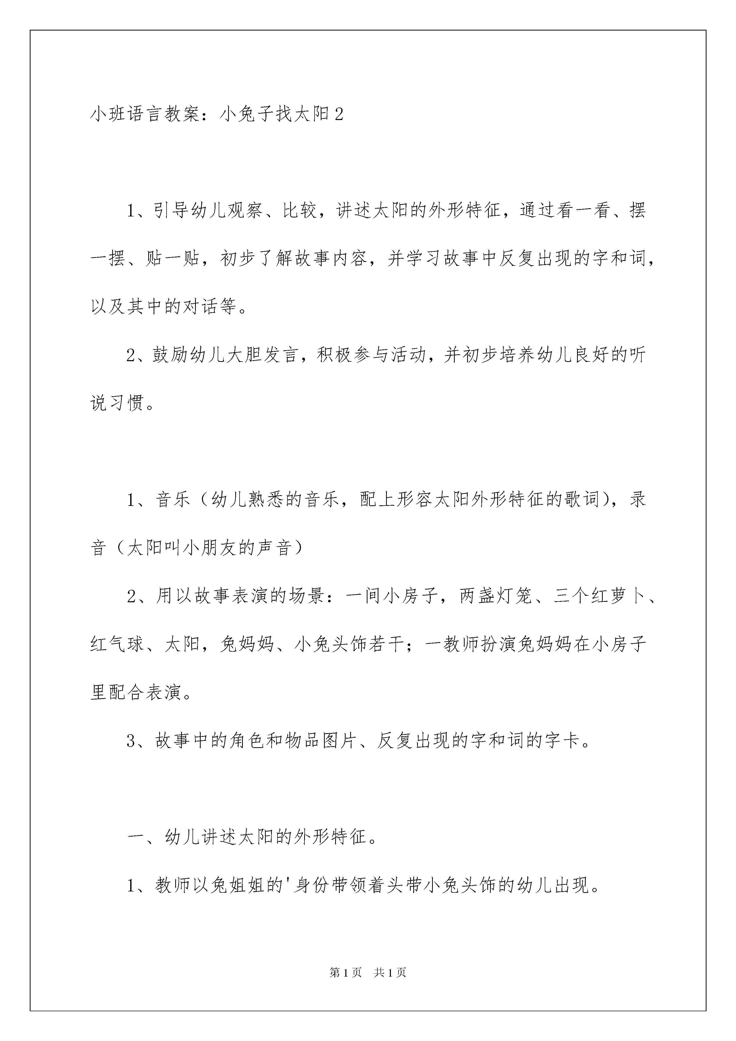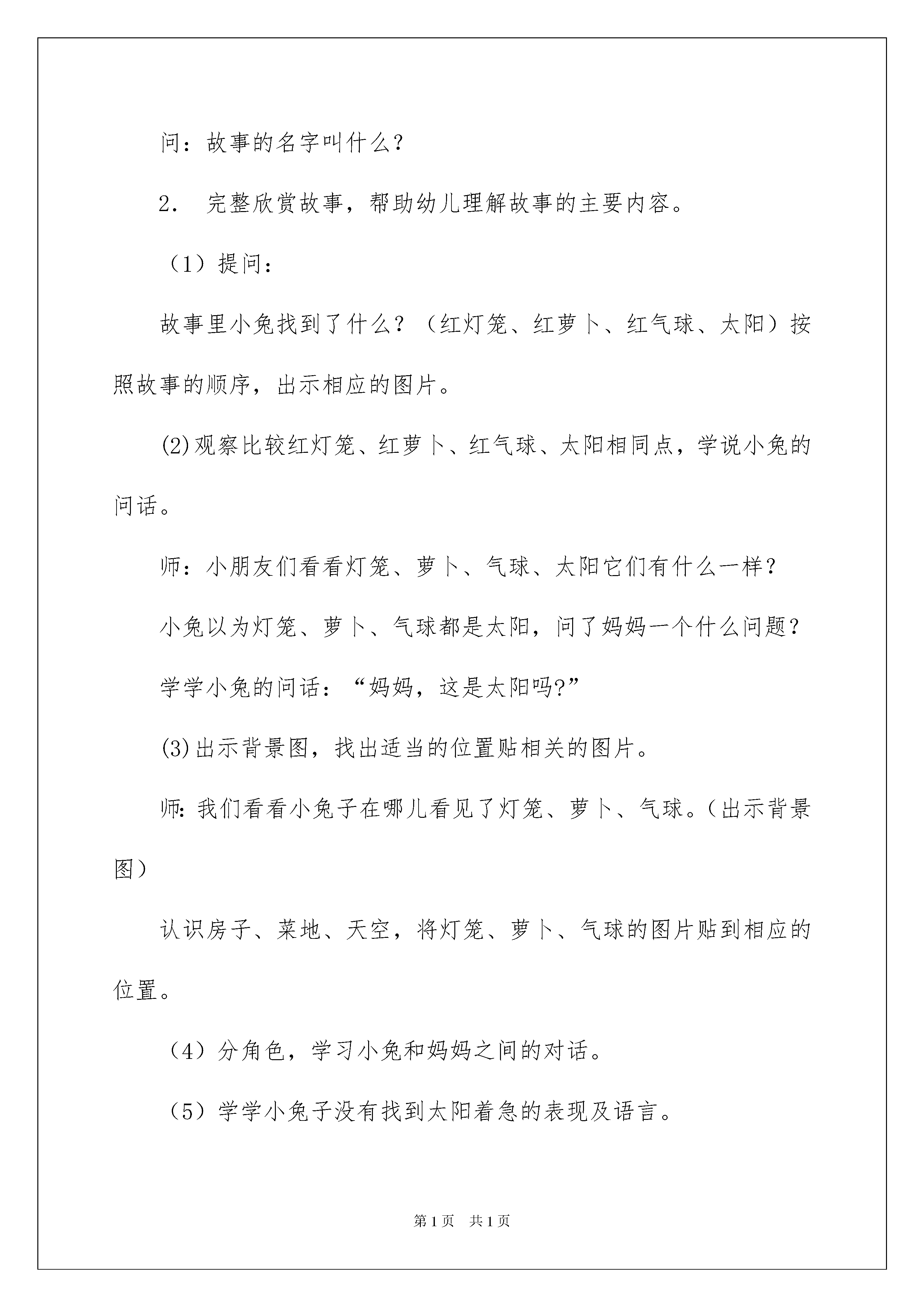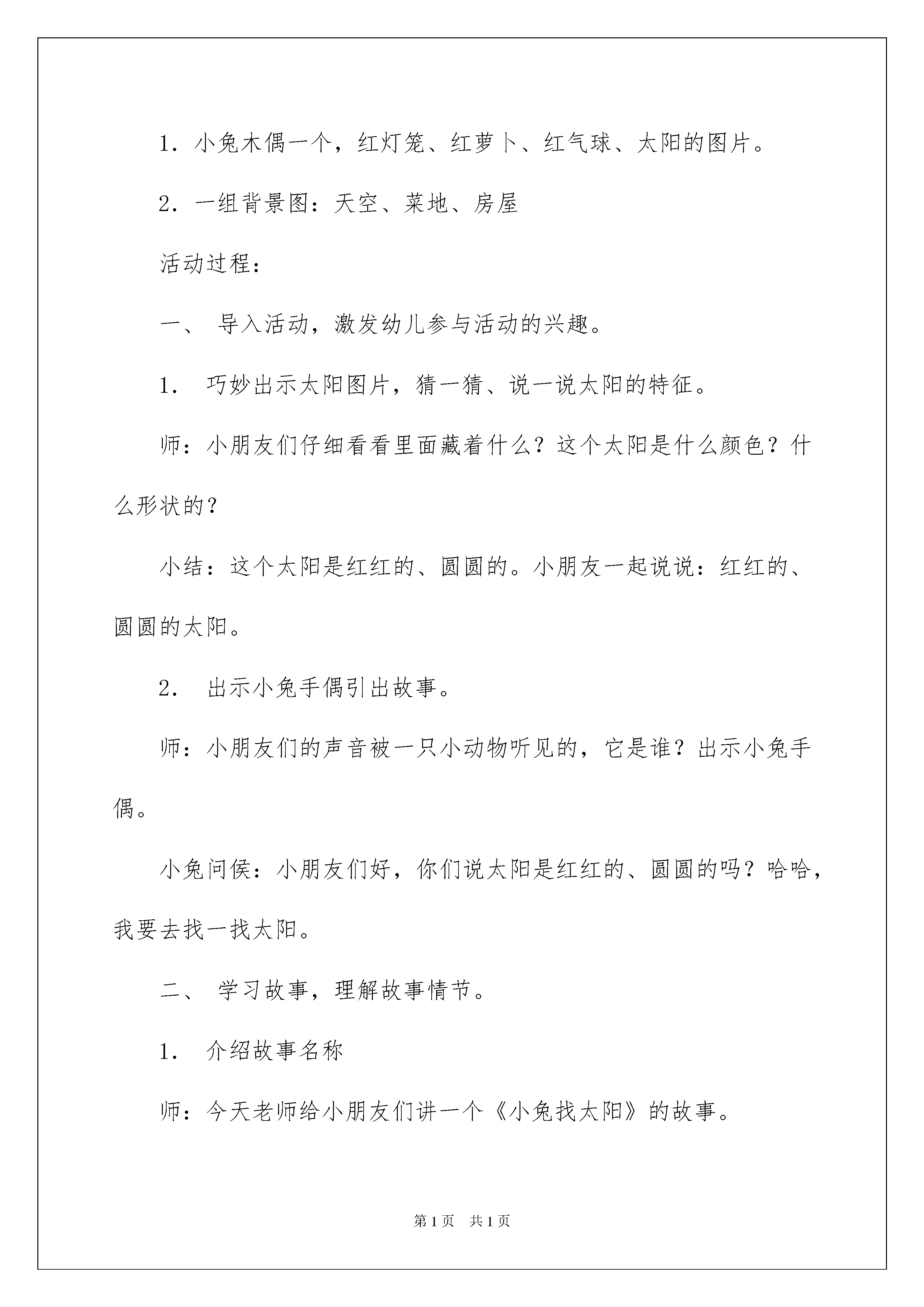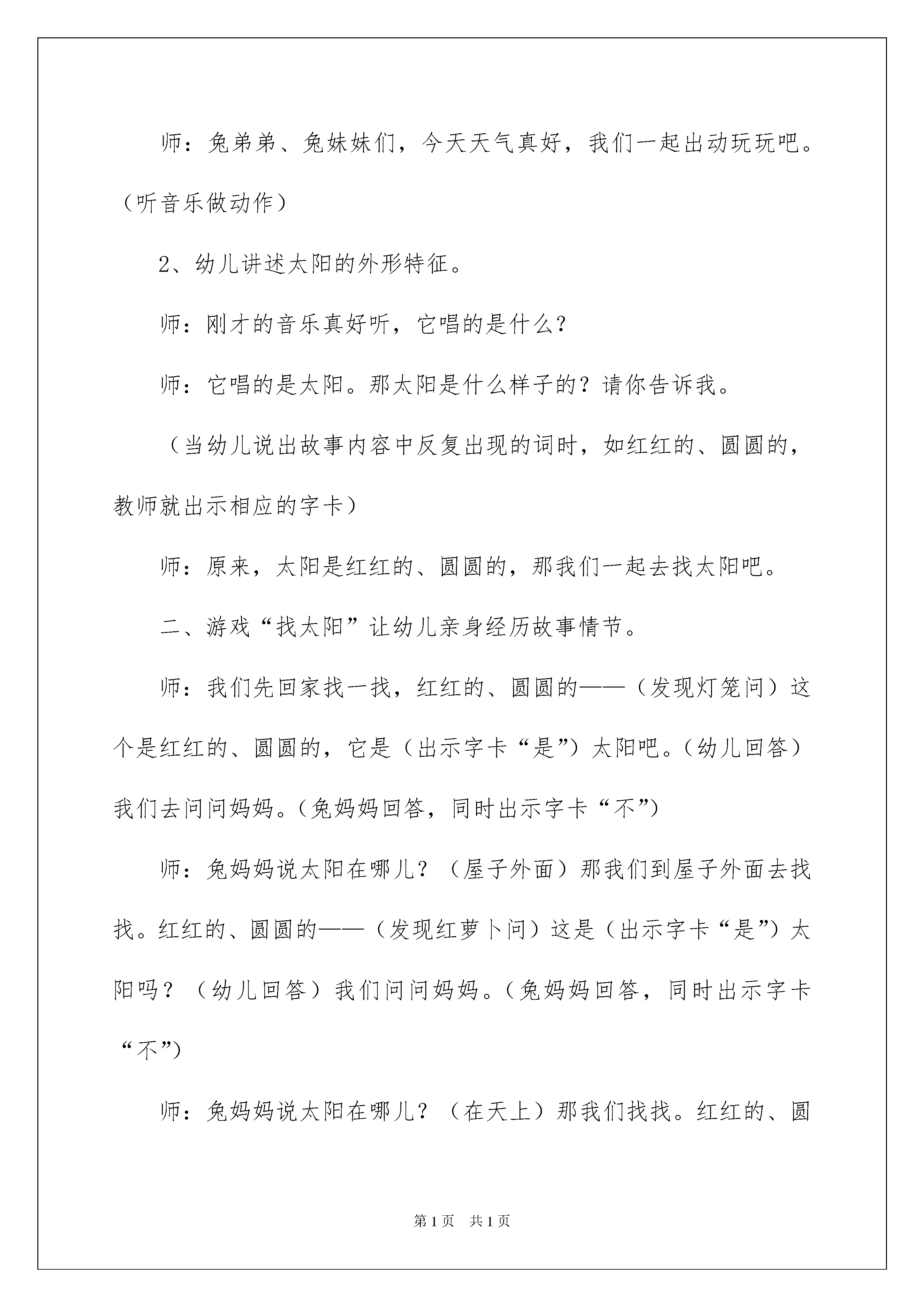 2022小班语言教案:小兔子找太阳小班语言教案:小兔子找太阳作为一名辛苦耕耘的教育工作者,时常需要编写教案,借助教案可以恰当地选择和运用教学方法,调动学生学习的积极性。快来参考教案是怎么写的吧!以下是我精心整理的小班语言教案:小兔子找太阳,希望对大家有所帮助。小班语言教案:小兔子找太阳1活动目标:1.初步理解故事内容,通过观察、比较,能用较形象完整的语言来描述太阳的特征,加深对红红的、圆圆的认识。2.鼓励幼儿大胆发言,积极参与活动,并初步养成良好的听说习惯。3.了解晒太阳也是冬天的一种取暖方式,多晒太阳有益健康。活动准备:知识准备:有晒太阳的生活经验。物质准备:1.小兔木偶一个,红灯笼、红萝卜、红气球、太阳的图片。2.一组背景图:天空、菜地、房屋活动过程:一、导入活动,激发幼儿参与活动的兴趣。1.巧妙出示太阳图片,猜一猜、说一说太阳的特征。师:小朋友们仔细看看里面藏着什么?这个太阳是什么颜色?什么形状的?小结:这个太阳是红红的、圆圆的。小朋友一起说说:红红的、圆圆的太阳。2.出示小兔手偶引出故事。师:小朋友们的声音被一只小动物听见的,它是谁?出示小兔手偶。小兔问侯:小朋友们好,你们说太阳是红红的、圆圆的吗?哈哈,我要去找一找太阳。二、学习故事,理解故事情节。1.介绍故事名称师:今天老师给小朋友们讲一个《小兔找太阳》的故事。问:故事的名字叫什么?2.完整欣赏故事,帮助幼儿理解故事的主要内容。(1)提问:故事里小兔找到了什么?(红灯笼、红萝卜、红气球、太阳)按照故事的顺序,出示相应的图片。(2)观察比较红灯笼、红萝卜、红气球、太阳相同点,学说小兔的问话。师:小朋友们看看灯笼、萝卜、气球、太阳它们有什么一样?小兔以为灯笼、萝卜、气球都是太阳,问了妈妈一个什么问题?学学小兔的问话:“妈妈,这是太阳吗?”(3)出示背景图,找出适当的位置贴相关的图片。师:我们看看小兔子在哪儿看见了灯笼、萝卜、气球。(出示背景图)认识房子、菜地、天空,将灯笼、萝卜、气球的图片贴到相应的位置。(4)分角色,学习小兔和妈妈之间的对话。(5)学学小兔子没有找到太阳着急的表现及语言。小班语言教案:小兔子找太阳21、引导幼儿观察、比较,讲述太阳的外形特征,通过看一看、摆一摆、贴一贴,初步了解故事内容,并学习故事中反复出现的字和词,以及其中的对话等。2、鼓励幼儿大胆发言,积极参与活动,并初步培养幼儿良好的听说习惯。1、音乐(幼儿熟悉的音乐,配上形容太阳外形特征的歌词),录音(太阳叫小朋友的声音)2、用以故事表演的场景:一间小房子,两盏灯笼、三个红萝卜、红气球、太阳,兔妈妈、小兔头饰若干;一教师扮演兔妈妈在小房子里配合表演。3、故事中的角色和物品图片、反复出现的字和词的字卡。一、幼儿讲述太阳的外形特征。1、教师以兔姐姐的'身份带领着头带小兔头饰的幼儿出现。师:兔弟弟、兔妹妹们,今天天气真好,我们一起出动玩玩吧。(听音乐做动作)2、幼儿讲述太阳的外形特征。师:刚才的音乐真好听,它唱的是什么?师:它唱的是太阳。那太阳是什么样子的?请你告诉我。(当幼儿说出故事内容中反复出现的词时,如红红的、圆圆的,教师就出示相应的字卡)师:原来,太阳是红红的、圆圆的,那我们一起去找太阳吧。二、游戏“找太阳”让幼儿亲身经历故事情节。师:我们先回家找一找,红红的、圆圆的——(发现灯笼问)这个是红红的、圆圆的,它是(出示字卡“是”)太阳吧。(幼儿回答)我们去问问妈妈。(兔妈妈回答,同时出示字卡“不”)师:兔妈妈说太阳在哪儿?(屋子外面)那我们到屋子外面去找找。红红的、圆圆的——(发现红萝卜问)这是(出示字卡“是”)太阳吗?(幼儿回答)我们问问妈妈。(兔妈妈回答,同时出示字卡“不”)师:兔妈妈说太阳在哪儿?(在天上)那我们找找。红红的、圆圆的——(发现气球问)这是(出示字卡“是”)太阳吗?(幼儿回答)我们问问妈妈。(兔妈妈回答,同时出示字卡“不”)师:真急人,太阳到底在哪儿呀?(幼儿回答,同时出示大的太阳图片),谁来说说太阳是什么样子的?(幼儿回答后教师总结:太阳是红红的、圆圆的,亮亮的,照在身上暖洋洋的)三、学习摆摆讲讲故事内容。师:我们坐下来,讲一讲刚才我们是怎样找到太阳的。(出示图片,并和幼儿一起找图片和字卡,拼贴成完整的故事内容)四、去室外观察。1、师:兔弟弟、兔妹妹们真聪明、真能干,你们讲得太好了。2、听!是谁在叫我们?(放录音)原来是太阳!它让小朋友带一些朋友和它一起去做游戏呢!它喜欢什么样的朋友呀?(听录音:告诉你们一个秘密,红红的、圆圆的东西我最喜欢,看上去漂亮又健康,小朋友的小脸就是这样子的呀。)3、原来太阳喜欢我们小朋友的小