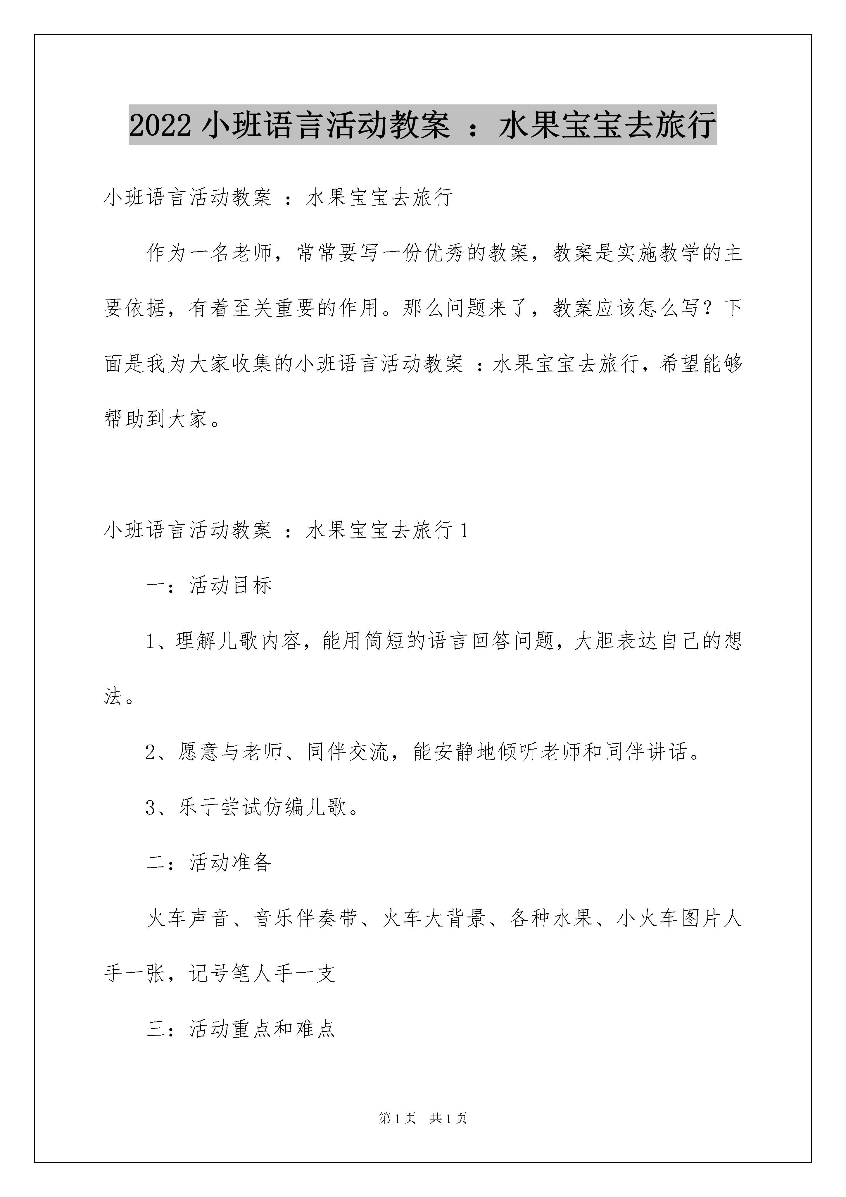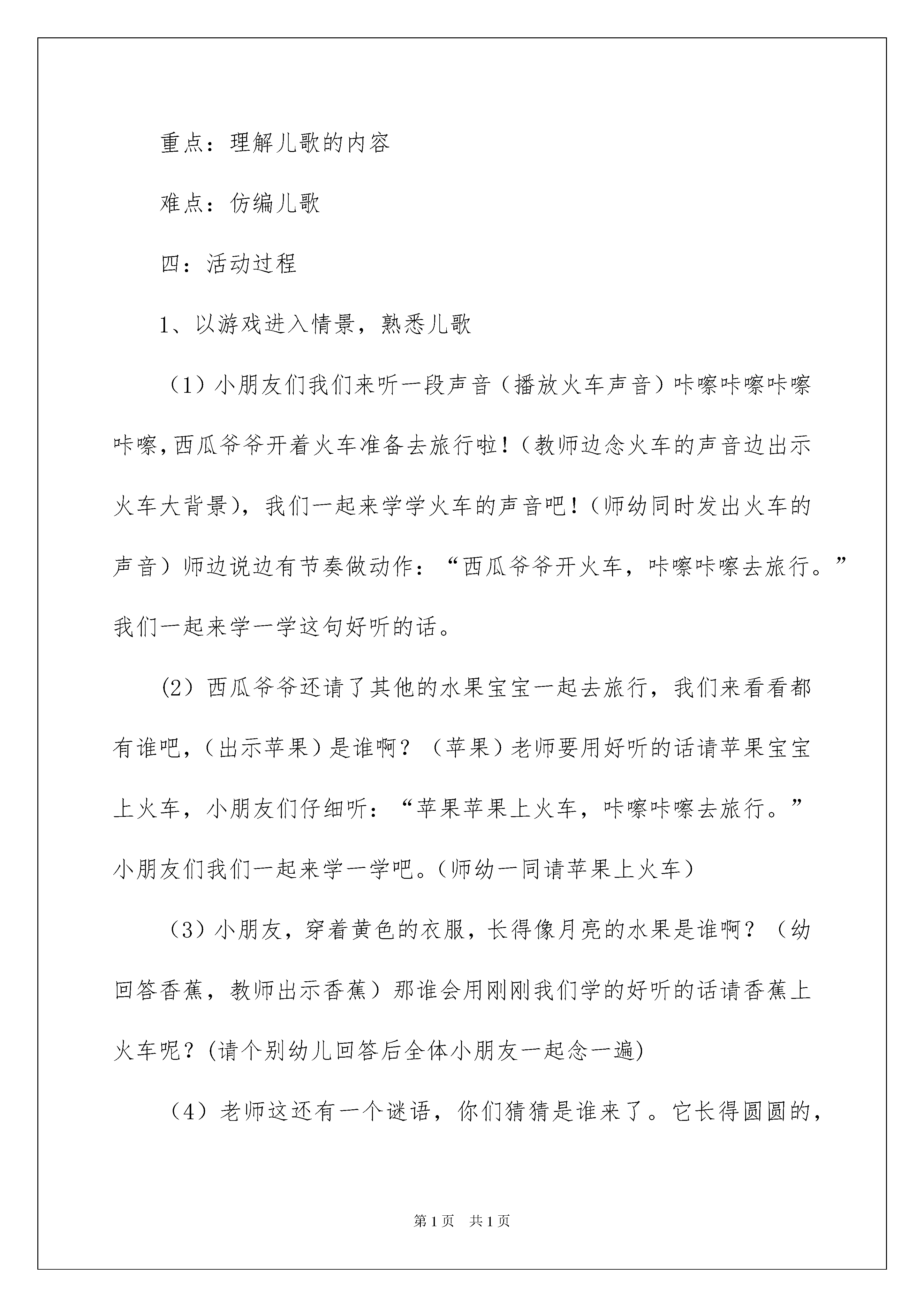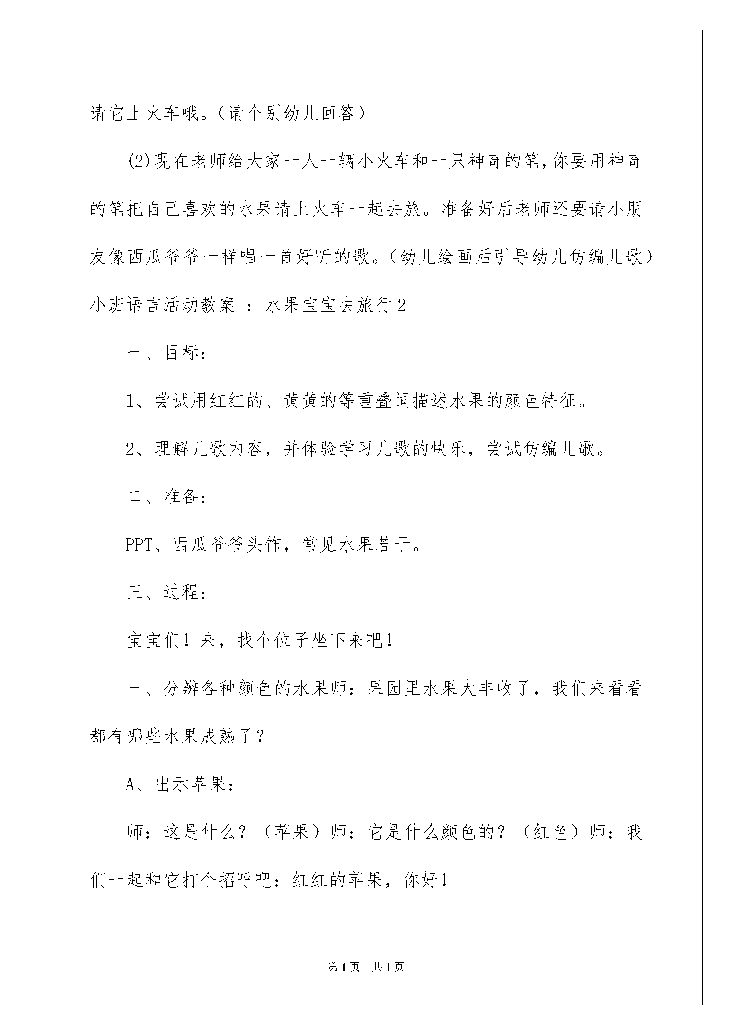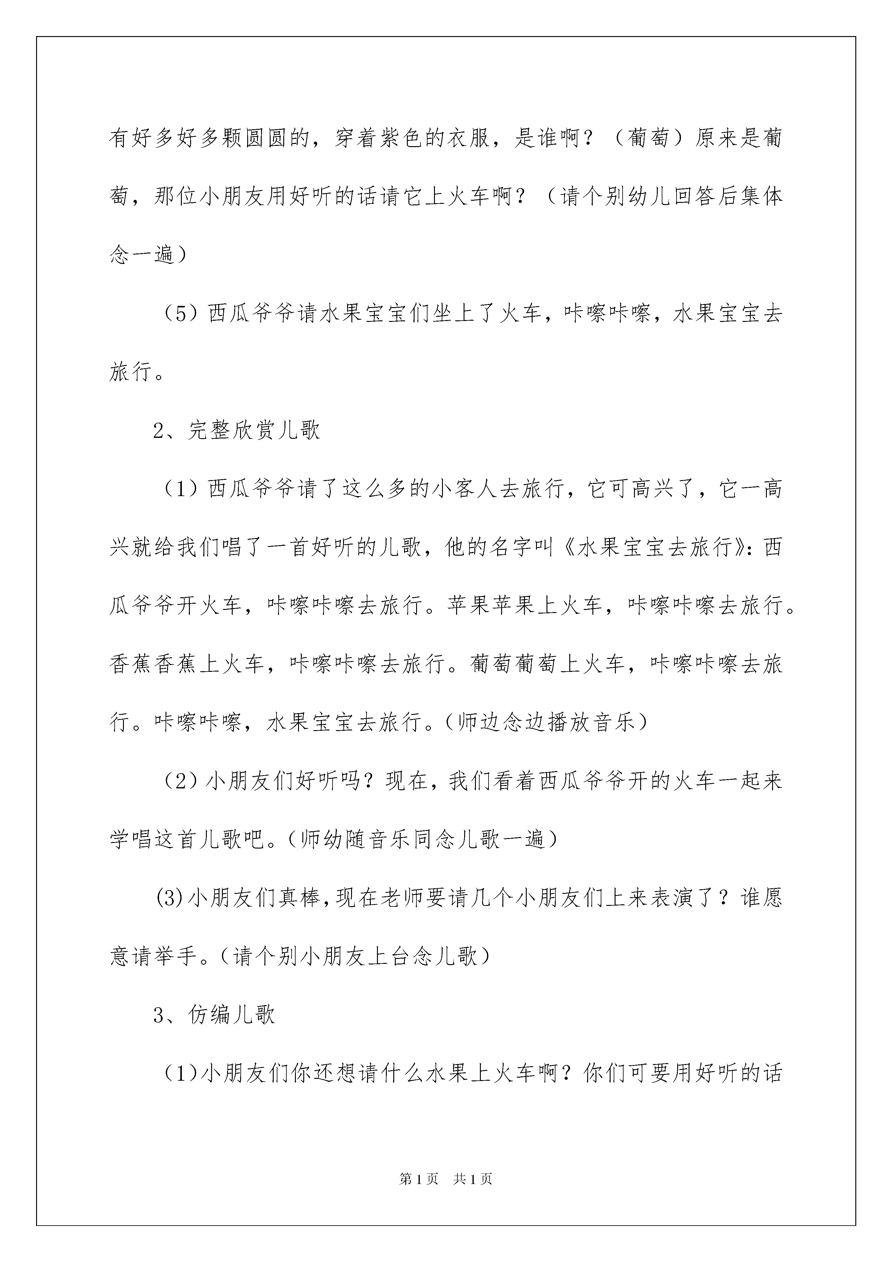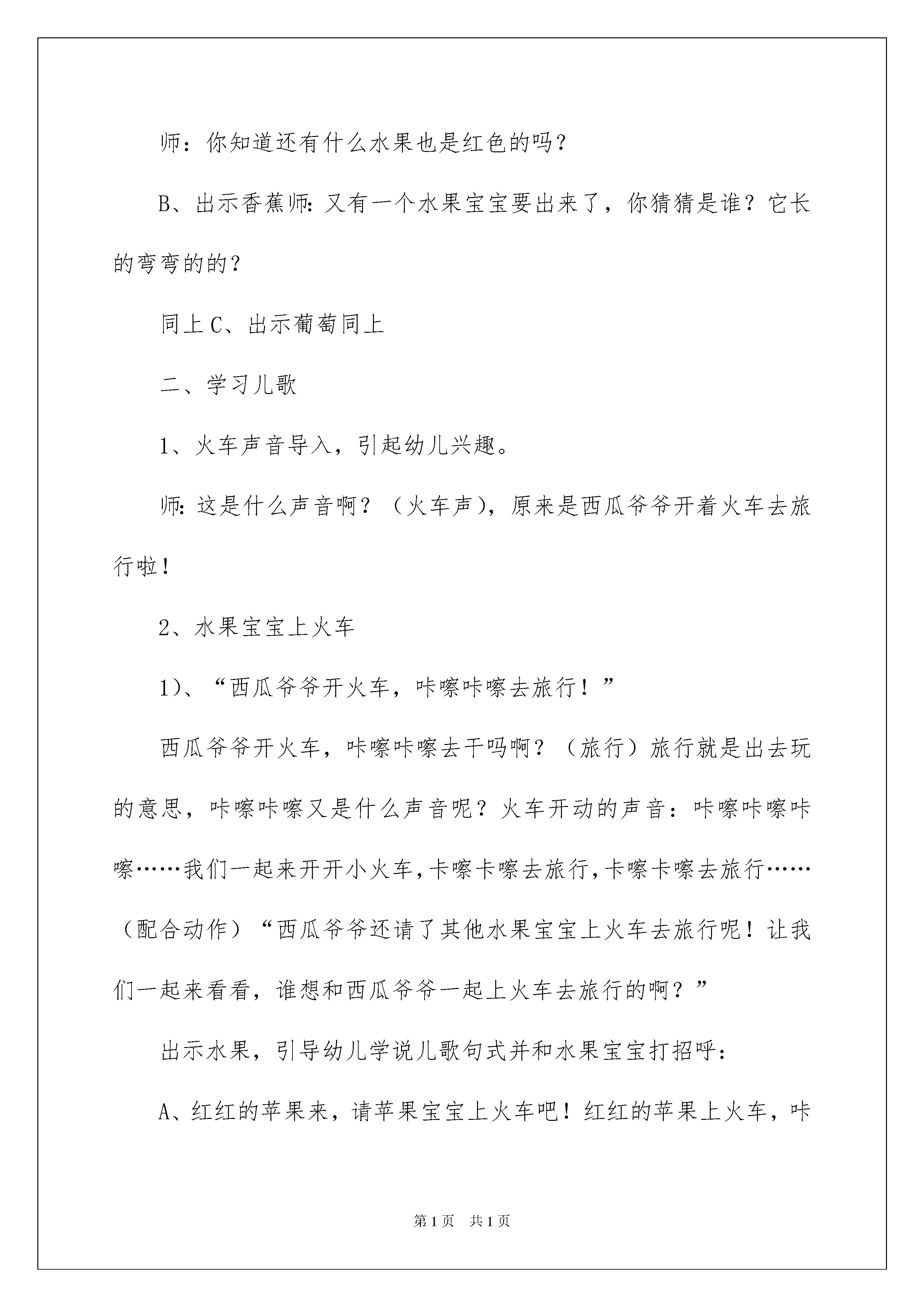 2022小班语言活动教案:水果宝宝去旅行小班语言活动教案:水果宝宝去旅行作为一名老师,常常要写一份优秀的教案,教案是实施教学的主要依据,有着至关重要的作用。那么问题来了,教案应该怎么写?下面是我为大家收集的小班语言活动教案:水果宝宝去旅行,希望能够帮助到大家。小班语言活动教案:水果宝宝去旅行1一:活动目标1、理解儿歌内容,能用简短的语言回答问题,大胆表达自己的想法。2、愿意与老师、同伴交流,能安静地倾听老师和同伴讲话。3、乐于尝试仿编儿歌。二:活动准备火车声音、音乐伴奏带、火车大背景、各种水果、小火车图片人手一张,记号笔人手一支三:活动重点和难点重点:理解儿歌的内容难点:仿编儿歌四:活动过程1、以游戏进入情景,熟悉儿歌(1)小朋友们我们来听一段声音(播放火车声音)咔嚓咔嚓咔嚓咔嚓,西瓜爷爷开着火车准备去旅行啦!(教师边念火车的声音边出示火车大背景),我们一起来学学火车的声音吧!(师幼同时发出火车的声音)师边说边有节奏做动作:“西瓜爷爷开火车,咔嚓咔嚓去旅行。”我们一起来学一学这句好听的话。(2)西瓜爷爷还请了其他的水果宝宝一起去旅行,我们来看看都有谁吧,(出示苹果)是谁啊?(苹果)老师要用好听的话请苹果宝宝上火车,小朋友们仔细听:“苹果苹果上火车,咔嚓咔嚓去旅行。”小朋友们我们一起来学一学吧。(师幼一同请苹果上火车)(3)小朋友,穿着黄色的衣服,长得像月亮的水果是谁啊?(幼回答香蕉,教师出示香蕉)那谁会用刚刚我们学的好听的话请香蕉上火车呢?(请个别幼儿回答后全体小朋友一起念一遍)(4)老师这还有一个谜语,你们猜猜是谁来了。它长得圆圆的,有好多好多颗圆圆的,穿着紫色的衣服,是谁啊?(葡萄)原来是葡萄,那位小朋友用好听的话请它上火车啊?(请个别幼儿回答后集体念一遍)(5)西瓜爷爷请水果宝宝们坐上了火车,咔嚓咔嚓,水果宝宝去旅行。2、完整欣赏儿歌(1)西瓜爷爷请了这么多的小客人去旅行,它可高兴了,它一高兴就给我们唱了一首好听的儿歌,他的名字叫《水果宝宝去旅行》:西瓜爷爷开火车,咔嚓咔嚓去旅行。苹果苹果上火车,咔嚓咔嚓去旅行。香蕉香蕉上火车,咔嚓咔嚓去旅行。葡萄葡萄上火车,咔嚓咔嚓去旅行。咔嚓咔嚓,水果宝宝去旅行。(师边念边播放音乐)(2)小朋友们好听吗?现在,我们看着西瓜爷爷开的火车一起来学唱这首儿歌吧。(师幼随音乐同念儿歌一遍)(3)小朋友们真棒,现在老师要请几个小朋友们上来表演了?谁愿意请举手。(请个别小朋友上台念儿歌)3、仿编儿歌(1)小朋友们你还想请什么水果上火车啊?你们可要用好听的话请它上火车哦。(请个别幼儿回答)(2)现在老师给大家一人一辆小火车和一只神奇的笔,你要用神奇的笔把自己喜欢的水果请上火车一起去旅。准备好后老师还要请小朋友像西瓜爷爷一样唱一首好听的歌。(幼儿绘画后引导幼儿仿编儿歌)小班语言活动教案:水果宝宝去旅行2一、目标:1、尝试用红红的、黄黄的等重叠词描述水果的颜色特征。2、理解儿歌内容,并体验学习儿歌的快乐,尝试仿编儿歌。二、准备:PPT、西瓜爷爷头饰,常见水果若干。三、过程:宝宝们!来,找个位子坐下来吧!一、分辨各种颜色的水果师:果园里水果大丰收了,我们来看看都有哪些水果成熟了?A、出示苹果:师:这是什么?(苹果)师:它是什么颜色的?(红色)师:我们一起和它打个招呼吧:红红的苹果,你好!师:你知道还有什么水果也是红色的吗?B、出示香蕉师:又有一个水果宝宝要出来了,你猜猜是谁?它长的弯弯的的?同上C、出示葡萄同上二、学习儿歌1、火车声音导入,引起幼儿兴趣。师:这是什么声音啊?(火车声),原来是西瓜爷爷开着火车去旅行啦!2、水果宝宝上火车1)、“西瓜爷爷开火车,咔嚓咔嚓去旅行!”西瓜爷爷开火车,咔嚓咔嚓去干吗啊?(旅行)旅行就是出去玩的意思,咔嚓咔嚓又是什么声音呢?火车开动的声音:咔嚓咔嚓咔嚓……我们一起来开开小火车,卡嚓卡嚓去旅行,卡嚓卡嚓去旅行……(配合动作)“西瓜爷爷还请了其他水果宝宝上火车去旅行呢!让我们一起来看看,谁想和西瓜爷爷一起上火车去旅行的啊?”出示水果,引导幼儿学说儿歌句式并和水果宝宝打招呼:A、红红的苹果来,请苹果宝宝上火车吧!红红的苹果上火车,咔嚓喀嚓去旅行。(请个别幼儿学说)宝宝们和老师一起来请红红的苹果上火车吧:红红的苹果上火车,咔嚓喀嚓去旅行。B、黄黄的香蕉让我们一起来请黄黄的香蕉上火车去旅行吧!黄黄的香蕉上火车,咔嚓咔嚓去旅行;猜猜看,还有什么水果宝宝想跟着去旅行的啊?(神秘的)C、葡萄葡萄是什么样子的呢?圆圆的。紫色的。紫紫的葡萄上火车,咔嚓咔嚓去旅行。2)、让我们帮助西瓜爷爷看看,都有谁去旅行了啊。”齐念儿歌《水果宝宝