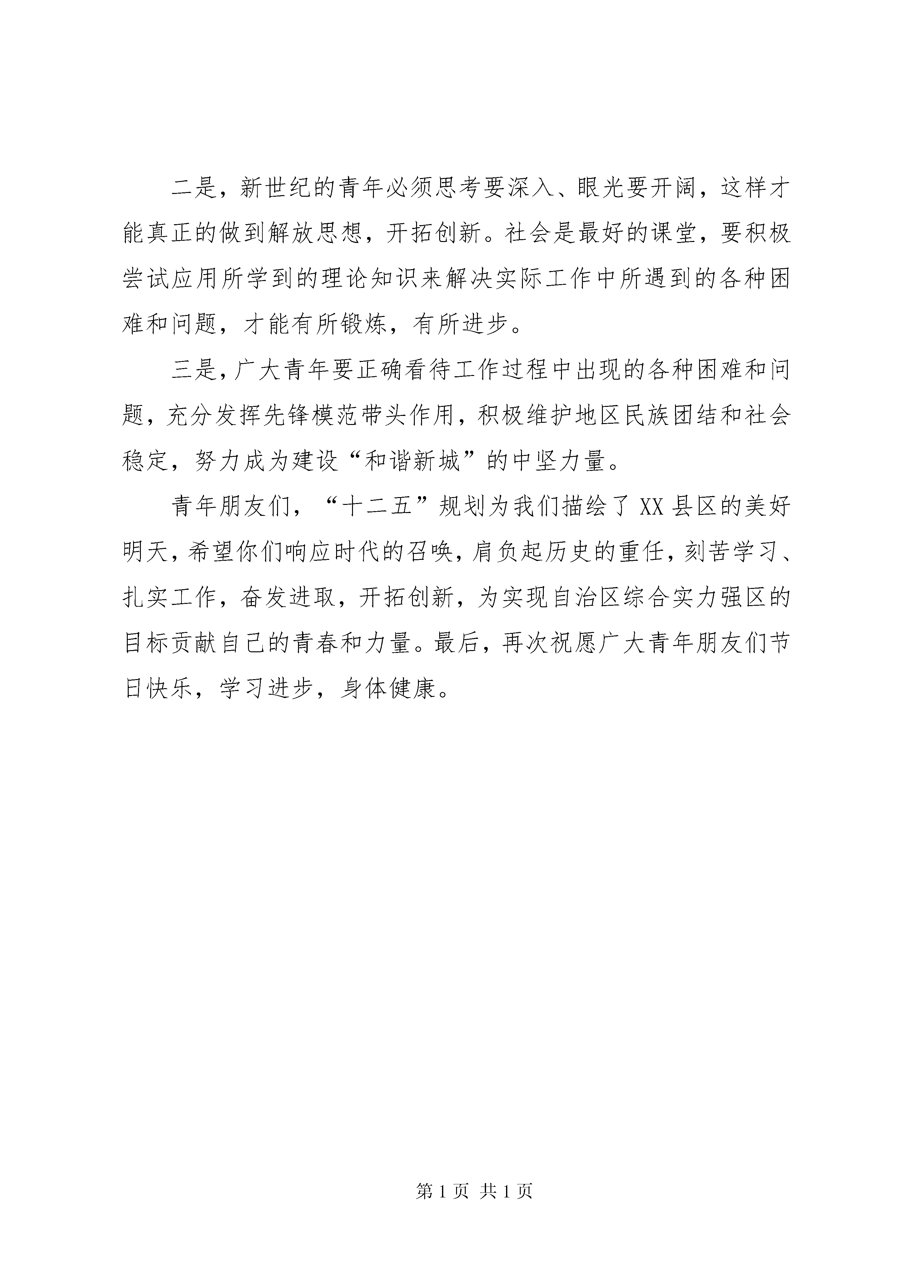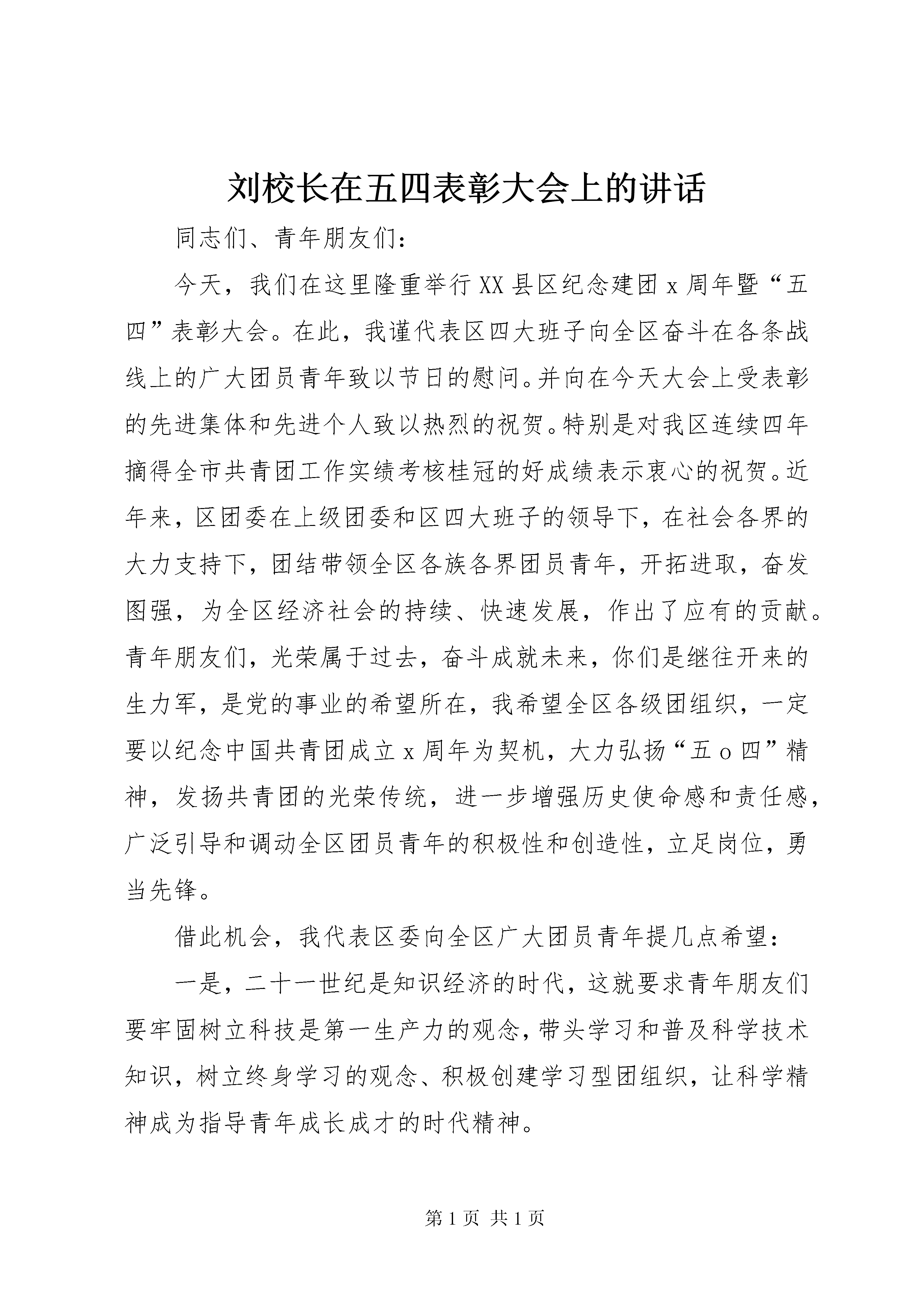 刘校长在五四表彰大会上的讲话同志们、青年朋友们:今天,我们在这里隆重举行XX县区纪念建团x周年暨“五四”表彰大会。在此,我谨代表区四大班子向全区奋斗在各条战线上的广大团员青年致以节日的慰问。并向在今天大会上受表彰的先进集体和先进个人致以热烈的祝贺。特别是对我区连续四年摘得全市共青团工作实绩考核桂冠的好成绩表示衷心的祝贺。近年来,区团委在上级团委和区四大班子的领导下,在社会各界的大力支持下,团结带领全区各族各界团员青年,开拓进取,奋发图强,为全区经济社会的持续、快速发展,作出了应有的贡献。青年朋友们,光荣属于过去,奋斗成就未来,你们是继往开来的生力军,是党的事业的希望所在,我希望全区各级团组织,一定要以纪念中国共青团成立x周年为契机,大力弘扬“五o四”精神,发扬共青团的光荣传统,进一步增强历史使命感和责任感,广泛引导和调动全区团员青年的积极性和创造性,立足岗位,勇当先锋。借此机会,我代表区委向全区广大团员青年提几点希望:一是,二十一世纪是知识经济的时代,这就要求青年朋友们要牢固树立科技是第一生产力的观念,带头学习和普及科学技术知识,树立终身学习的观念、积极创建学习型团组织,让科学精神成为指导青年成长成才的时代精神。二是,新世纪的青年必须思考要深入、眼光要开阔,这样才能真正的做到解放思想,开拓创新。社会是最好的课堂,要积极尝试应用所学到的理论知识来解决实际工作中所遇到的各种困难和问题,才能有所锻炼,有所进步。三是,广大青年要正确看待工作过程中出现的各种困难和问题,充分发挥先锋模范带头作用,积极维护地区民族团结和社会稳定,努力成为建设“和谐新城”的中坚力量。青年朋友们,“十二五”规划为我们描绘了XX县区的美好明天,希望你们响应时代的召唤,肩负起历史的重任,刻苦学习、扎实工作,奋发进取,开拓创新,为实现自治区综合实力强区的目标贡献自己的青春和力量。最后,再次祝愿广大青年朋友们节日快乐,学习进步,身体健康。