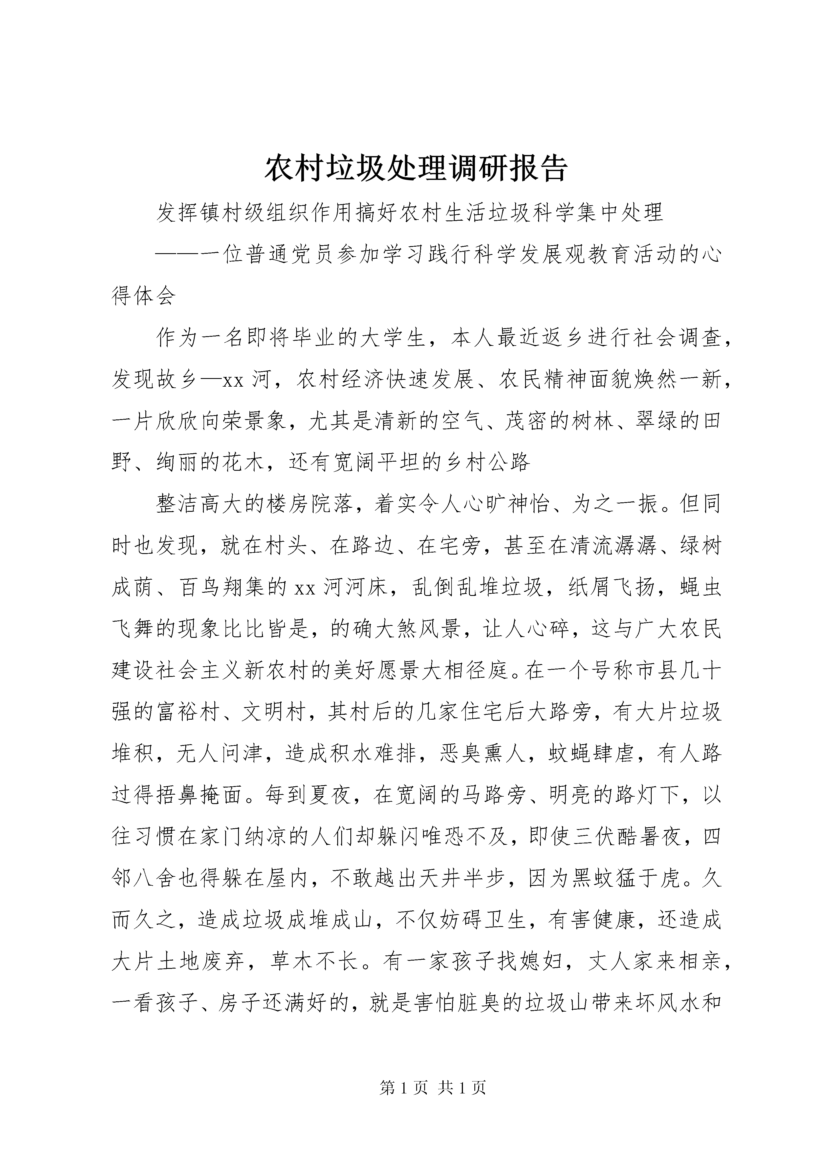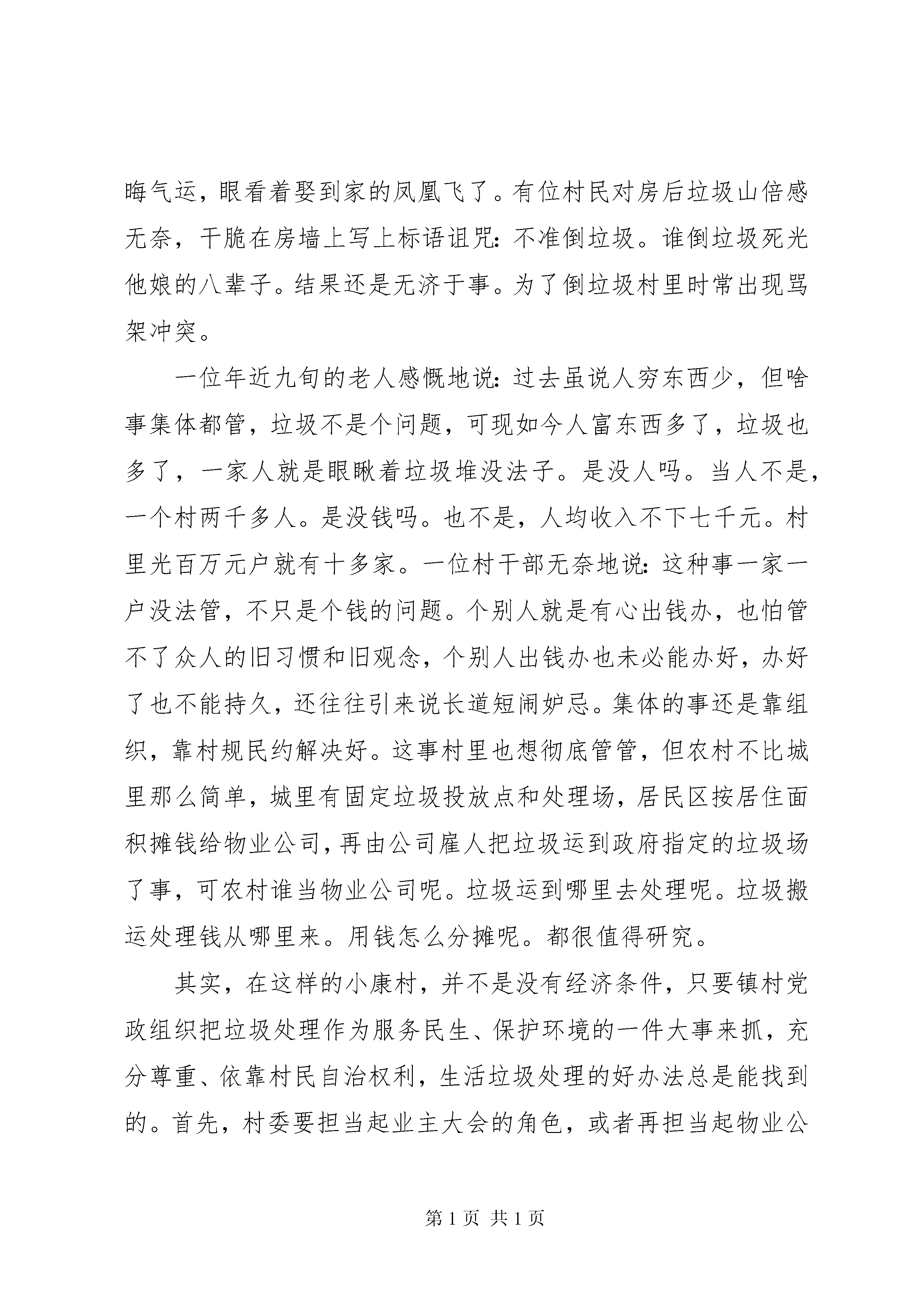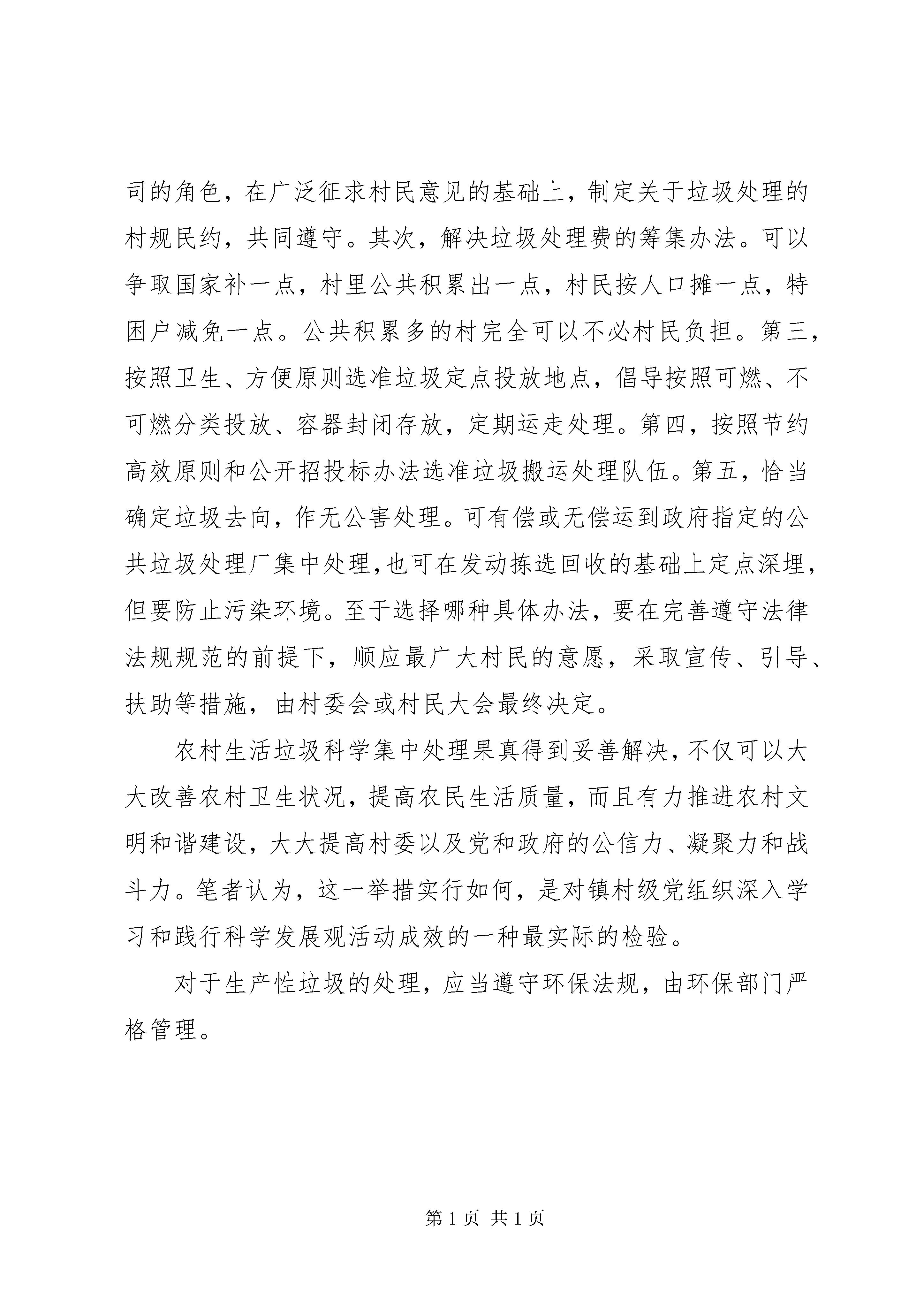 农村垃圾处理调研报告发挥镇村级组织作用搞好农村生活垃圾科学集中处理——一位普通党员参加学习践行科学发展观教育活动的心得体会作为一名即将毕业的大学生,本人最近返乡进行社会调查,发现故乡—xx河,农村经济快速发展、农民精神面貌焕然一新,一片欣欣向荣景象,尤其是清新的空气、茂密的树林、翠绿的田野、绚丽的花木,还有宽阔平坦的乡村公路整洁高大的楼房院落,着实令人心旷神怡、为之一振。但同时也发现,就在村头、在路边、在宅旁,甚至在清流潺潺、绿树成荫、百鸟翔集的xx河河床,乱倒乱堆垃圾,纸屑飞扬,蝇虫飞舞的现象比比皆是,的确大煞风景,让人心碎,这与广大农民建设社会主义新农村的美好愿景大相径庭。在一个号称市县几十强的富裕村、文明村,其村后的几家住宅后大路旁,有大片垃圾堆积,无人问津,造成积水难排,恶臭熏人,蚊蝇肆虐,有人路过得捂鼻掩面。每到夏夜,在宽阔的马路旁、明亮的路灯下,以往习惯在家门纳凉的人们却躲闪唯恐不及,即使三伏酷暑夜,四邻八舍也得躲在屋内,不敢越出天井半步,因为黑蚊猛于虎。久而久之,造成垃圾成堆成山,不仅妨碍卫生,有害健康,还造成大片土地废弃,草木不长。有一家孩子找媳妇,丈人家来相亲,一看孩子、房子还满好的,就是害怕脏臭的垃圾山带来坏风水和晦气运,眼看着娶到家的凤凰飞了。有位村民对房后垃圾山倍感无奈,干脆在房墙上写上标语诅咒:不准倒垃圾。谁倒垃圾死光他娘的八辈子。结果还是无济于事。为了倒垃圾村里时常出现骂架冲突。一位年近九旬的老人感慨地说:过去虽说人穷东西少,但啥事集体都管,垃圾不是个问题,可现如今人富东西多了,垃圾也多了,一家人就是眼瞅着垃圾堆没法子。是没人吗。当人不是,一个村两千多人。是没钱吗。也不是,人均收入不下七千元。村里光百万元户就有十多家。一位村干部无奈地说:这种事一家一户没法管,不只是个钱的问题。个别人就是有心出钱办,也怕管不了众人的旧习惯和旧观念,个别人出钱办也未必能办好,办好了也不能持久,还往往引来说长道短闹妒忌。集体的事还是靠组织,靠村规民约解决好。这事村里也想彻底管管,但农村不比城里那么简单,城里有固定垃圾投放点和处理场,居民区按居住面积摊钱给物业公司,再由公司雇人把垃圾运到政府指定的垃圾场了事,可农村谁当物业公司呢。垃圾运到哪里去处理呢。垃圾搬运处理钱从哪里来。用钱怎么分摊呢。都很值得研究。其实,在这样的小康村,并不是没有经济条件,只要镇村党政组织把垃圾处理作为服务民生、保护环境的一件大事来抓,充分尊重、依靠村民自治权利,生活垃圾处理的好办法总是能找到的。首先,村委要担当起业主大会的角色,或者再担当起物业公司的角色,在广泛征求村民意见的基础上,制定关于垃圾处理的村规民约,共同遵守。其次,解决垃圾处理费的筹集办法。可以争取国家补一点,村里公共积累出一点,村民按人口摊一点,特困户减免一点。公共积累多的村完全可以不必村民负担。第三,按照卫生、方便原则选准垃圾定点投放地点,倡导按照可燃、不可燃分类投放、容器封闭存放,定期运走处理。第四,按照节约高效原则和公开招投标办法选准垃圾搬运处理队伍。第五,恰当确定垃圾去向,作无公害处理。可有偿或无偿运到政府指定的公共垃圾处理厂集中处理,也可在发动拣选回收的基础上定点深埋,但要防止污染环境。至于选择哪种具体办法,要在完善遵守法律法规规范的前提下,顺应最广大村民的意愿,采取宣传、引导、扶助等措施,由村委会或村民大会最终决定。农村生活垃圾科学集中处理果真得到妥善解决,不仅可以大大改善农村卫生状况,提高农民生活质量,而且有力推进农村文明和谐建设,大大提高村委以及党和政府的公信力、凝聚力和战斗力。笔者认为,这一举措实行如何,是对镇村级党组织深入学习和践行科学发展观活动成效的一种最实际的检验。对于生产性垃圾的处理,应当遵守环保法规,由环保部门严格管理。