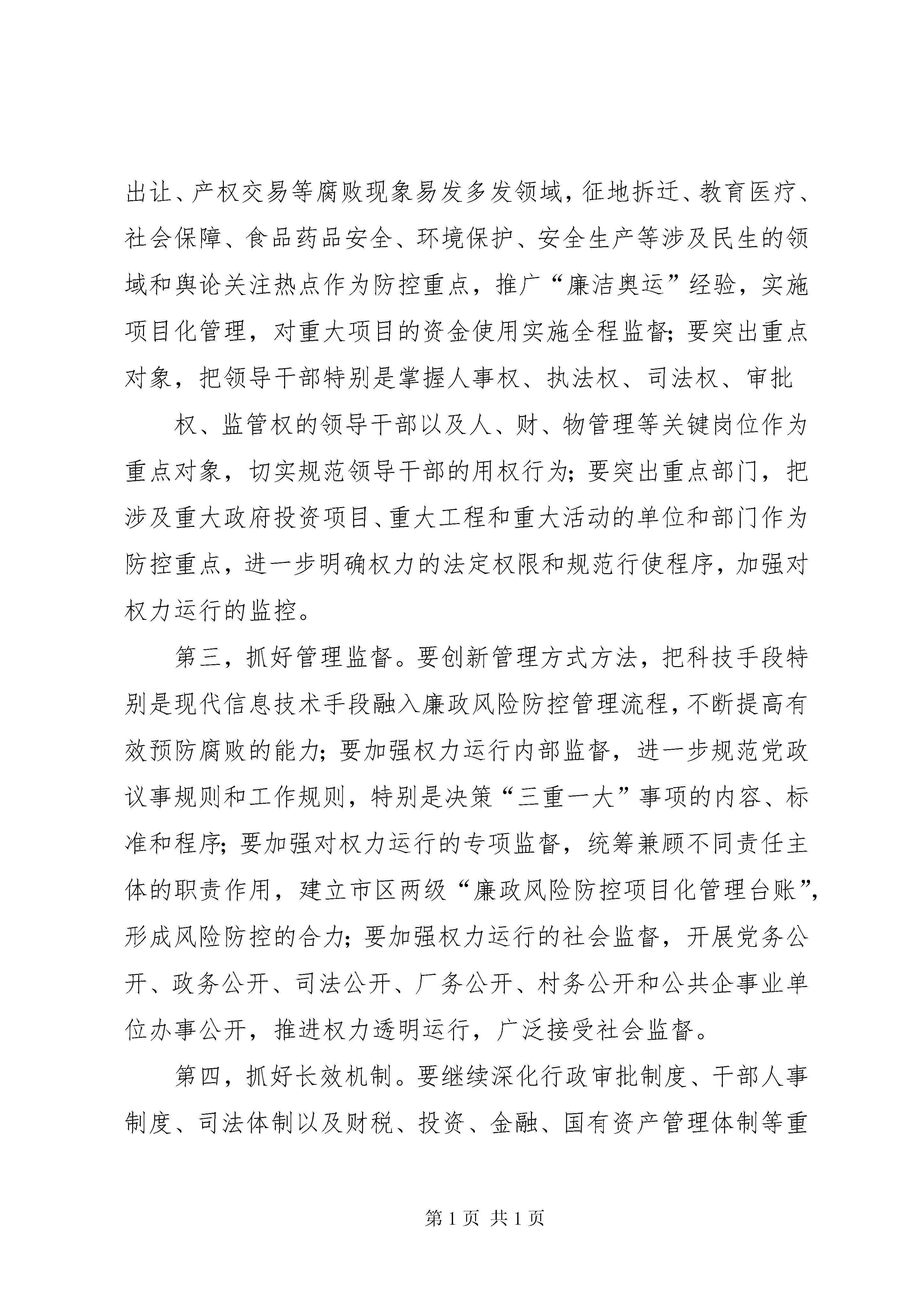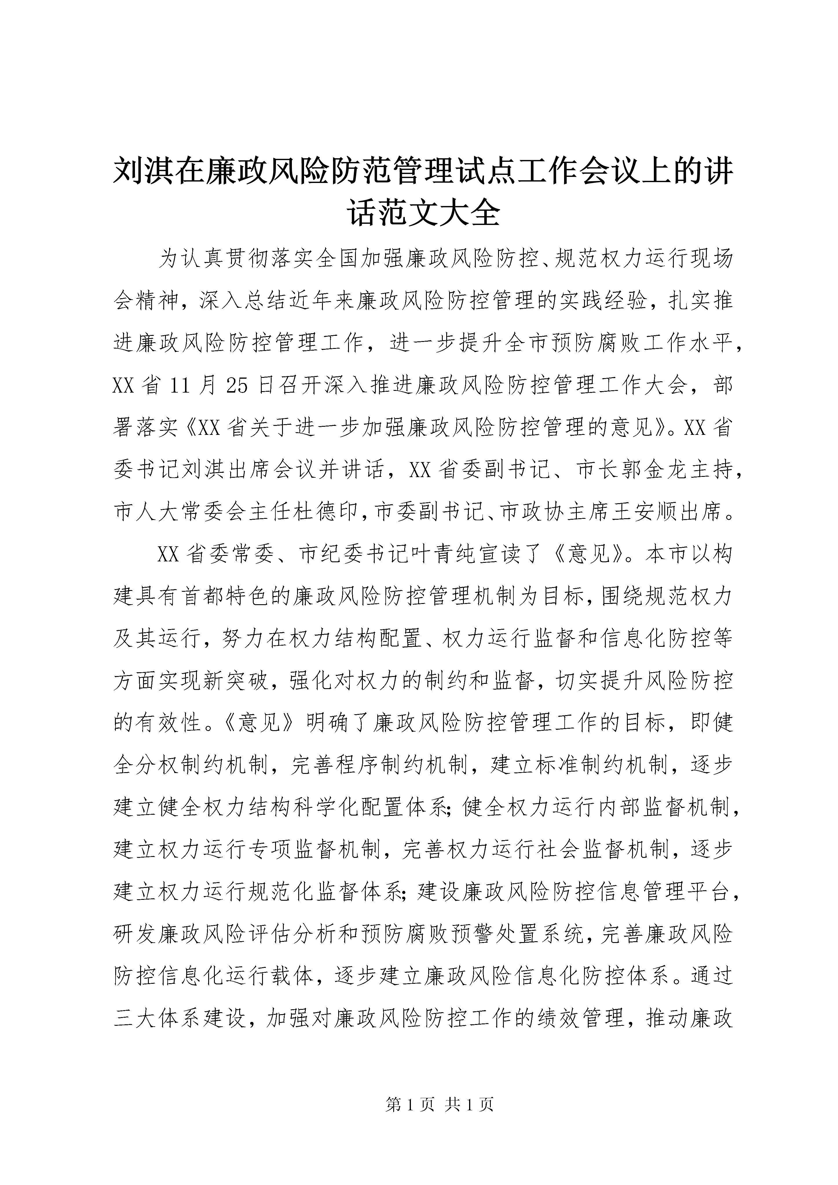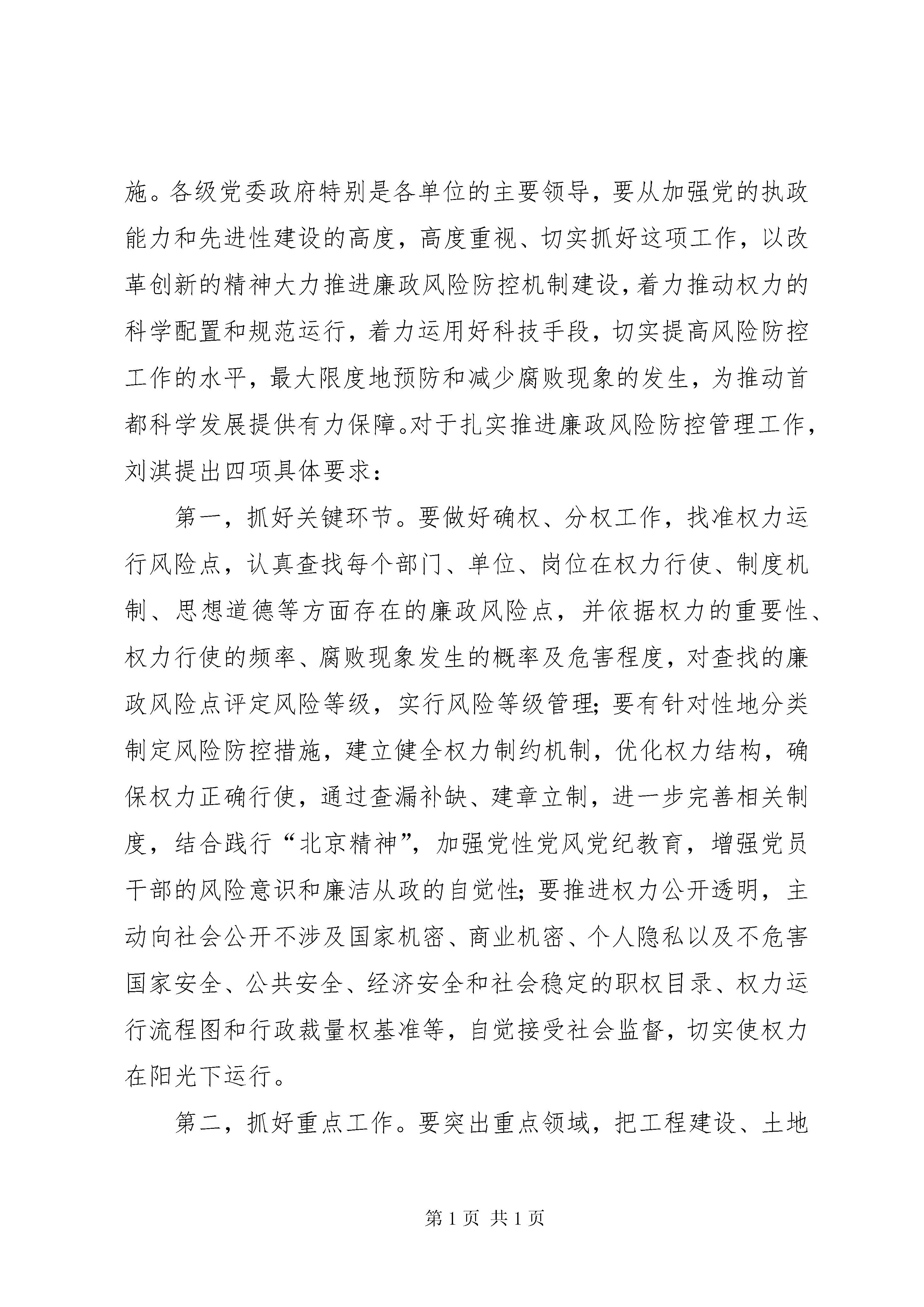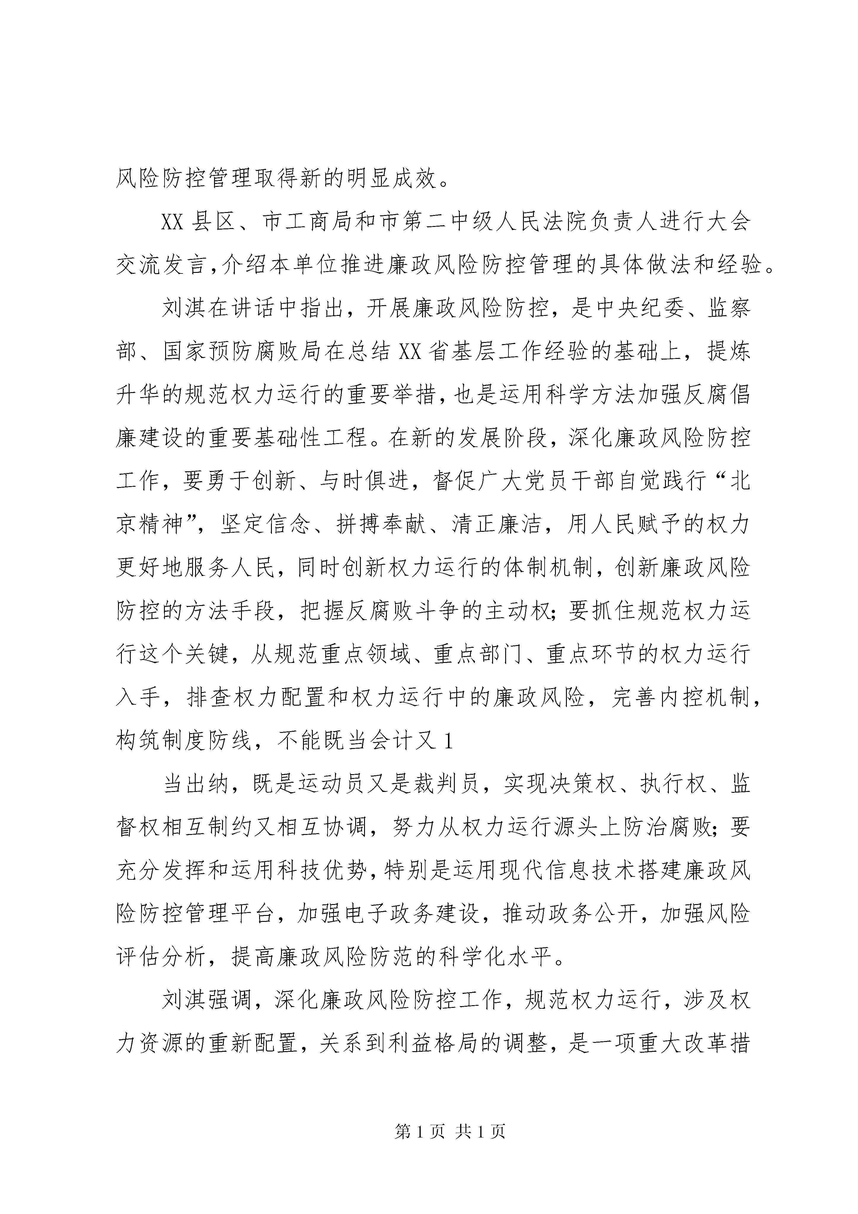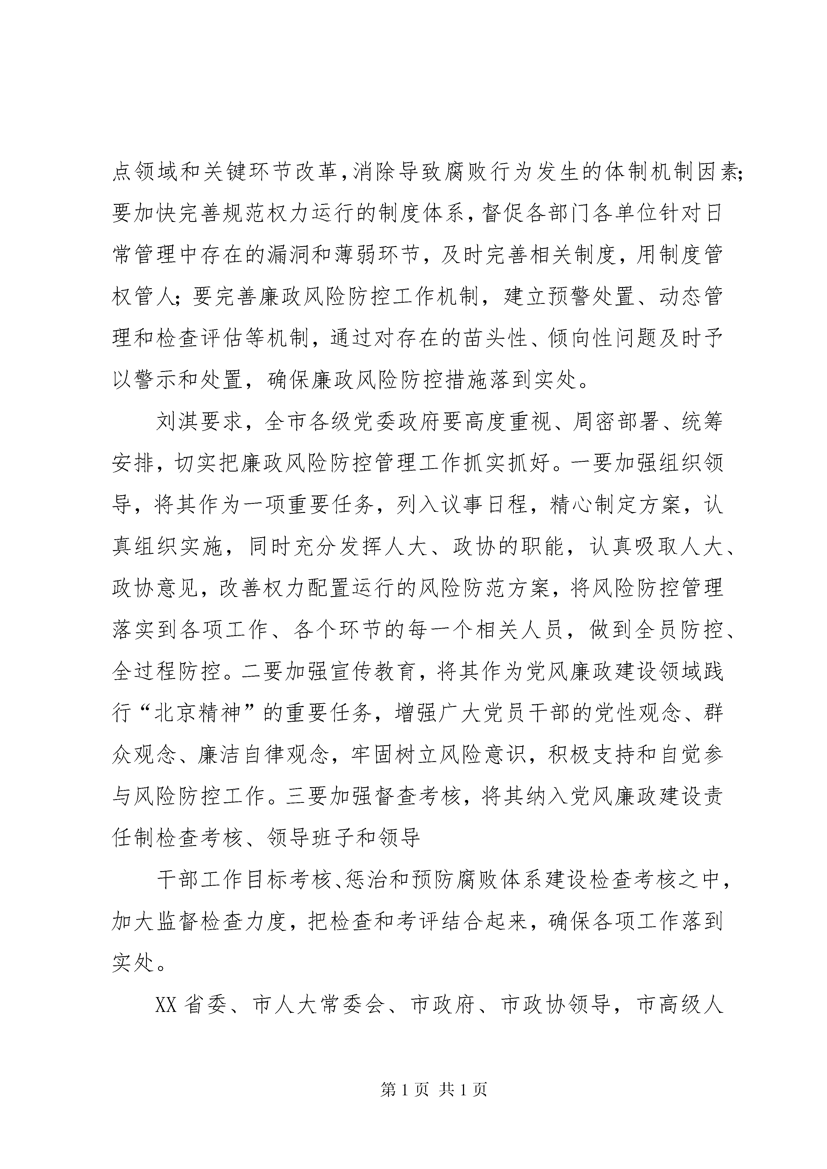 刘淇在廉政风险防范管理试点工作会议上的讲话范文大全为认真贯彻落实全国加强廉政风险防控、规范权力运行现场会精神,深入总结近年来廉政风险防控管理的实践经验,扎实推进廉政风险防控管理工作,进一步提升全市预防腐败工作水平,XX省11月25日召开深入推进廉政风险防控管理工作大会,部署落实《XX省关于进一步加强廉政风险防控管理的意见》。XX省委书记刘淇出席会议并讲话,XX省委副书记、市长郭金龙主持,市人大常委会主任杜德印,市委副书记、市政协主席王安顺出席。XX省委常委、市纪委书记叶青纯宣读了《意见》。本市以构建具有首都特色的廉政风险防控管理机制为目标,围绕规范权力及其运行,努力在权力结构配置、权力运行监督和信息化防控等方面实现新突破,强化对权力的制约和监督,切实提升风险防控的有效性。《意见》明确了廉政风险防控管理工作的目标,即健全分权制约机制,完善程序制约机制,建立标准制约机制,逐步建立健全权力结构科学化配置体系;健全权力运行内部监督机制,建立权力运行专项监督机制,完善权力运行社会监督机制,逐步建立权力运行规范化监督体系;建设廉政风险防控信息管理平台,研发廉政风险评估分析和预防腐败预警处置系统,完善廉政风险防控信息化运行载体,逐步建立廉政风险信息化防控体系。通过三大体系建设,加强对廉政风险防控工作的绩效管理,推动廉政风险防控管理取得新的明显成效。XX县区、市工商局和市第二中级人民法院负责人进行大会交流发言,介绍本单位推进廉政风险防控管理的具体做法和经验。刘淇在讲话中指出,开展廉政风险防控,是中央纪委、监察部、国家预防腐败局在总结XX省基层工作经验的基础上,提炼升华的规范权力运行的重要举措,也是运用科学方法加强反腐倡廉建设的重要基础性工程。在新的发展阶段,深化廉政风险防控工作,要勇于创新、与时俱进,督促广大党员干部自觉践行“北京精神”,坚定信念、拼搏奉献、清正廉洁,用人民赋予的权力更好地服务人民,同时创新权力运行的体制机制,创新廉政风险防控的方法手段,把握反腐败斗争的主动权;要抓住规范权力运行这个关键,从规范重点领域、重点部门、重点环节的权力运行入手,排查权力配置和权力运行中的廉政风险,完善内控机制,构筑制度防线,不能既当会计又1当出纳,既是运动员又是裁判员,实现决策权、执行权、监督权相互制约又相互协调,努力从权力运行源头上防治腐败;要充分发挥和运用科技优势,特别是运用现代信息技术搭建廉政风险防控管理平台,加强电子政务建设,推动政务公开,加强风险评估分析,提高廉政风险防范的科学化水平。刘淇强调,深化廉政风险防控工作,规范权力运行,涉及权力资源的重新配置,关系到利益格局的调整,是一项重大改革措施。各级党委政府特别是各单位的主要领导,要从加强党的执政能力和先进性建设的高度,高度重视、切实抓好这项工作,以改革创新的精神大力推进廉政风险防控机制建设,着力推动权力的科学配置和规范运行,着力运用好科技手段,切实提高风险防控工作的水平,最大限度地预防和减少腐败现象的发生,为推动首都科学发展提供有力保障。对于扎实推进廉政风险防控管理工作,刘淇提出四项具体要求:第一,抓好关键环节。要做好确权、分权工作,找准权力运行风险点,认真查找每个部门、单位、岗位在权力行使、制度机制、思想道德等方面存在的廉政风险点,并依据权力的重要性、权力行使的频率、腐败现象发生的概率及危害程度,对查找的廉政风险点评定风险等级,实行风险等级管理;要有针对性地分类制定风险防控措施,建立健全权力制约机制,优化权力结构,确保权力正确行使,通过查漏补缺、建章立制,进一步完善相关制度,结合践行“北京精神”,加强党性党风党纪教育,增强党员干部的风险意识和廉洁从政的自觉性;要推进权力公开透明,主动向社会公开不涉及国家机密、商业机密、个人隐私以及不危害国家安全、公共安全、经济安全和社会稳定的职权目录、权力运行流程图和行政裁量权基准等,自觉接受社会监督,切实使权力在阳光下运行。第二,抓好重点工作。要突出重点领域,把工程建设、土地出让、产权交易等腐败现象易发多发领域,征地拆迁、教育医疗、社会保障、食品药品安全、环境保护、安全生产等涉及民生的领域和舆论关注热点作为防控重点,推广“廉洁奥运”经验,实施项目化管理,对重大项目的资金使用实施全程监督;要突出重点对象,把领导干部特别是掌握人事权、执法权、司法权、审批权、监管权的领导干部以及人、财、物管理等关键岗位作为重点对象,切实规范领导干部的用权行为;要突出重点部门,把涉及重大政府投资项目、重大工程和重大活动的单位和部门作为防控重点,进一步明确权力的法定权限和规范行使程序,加强对权力运行的监控。第三,抓好管理监督。要创新管理方式方法,把科技手段特别是现代信息技术手段融入廉政风险防控管理流程,不断提高有效预防腐败的能力;要加强权力运行内部监督