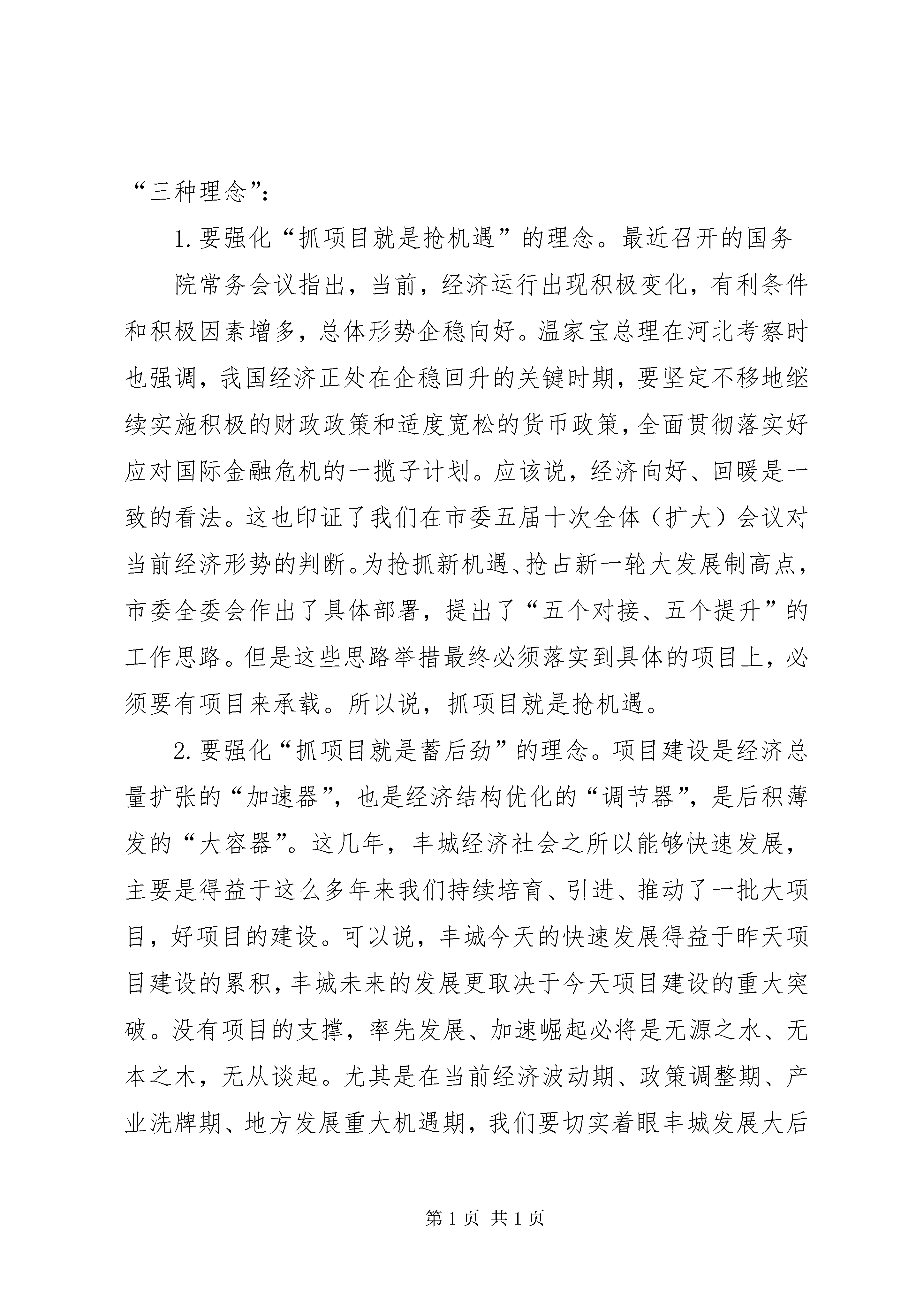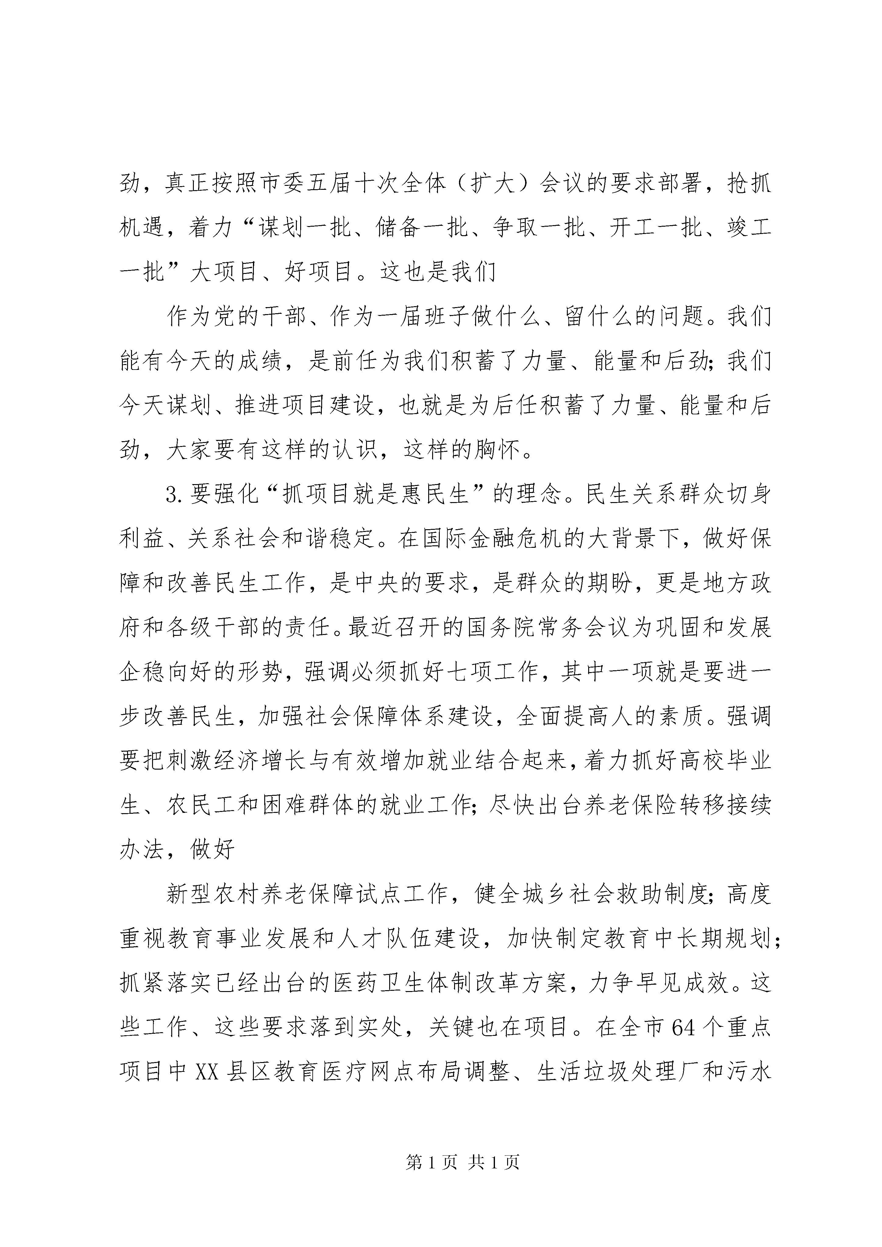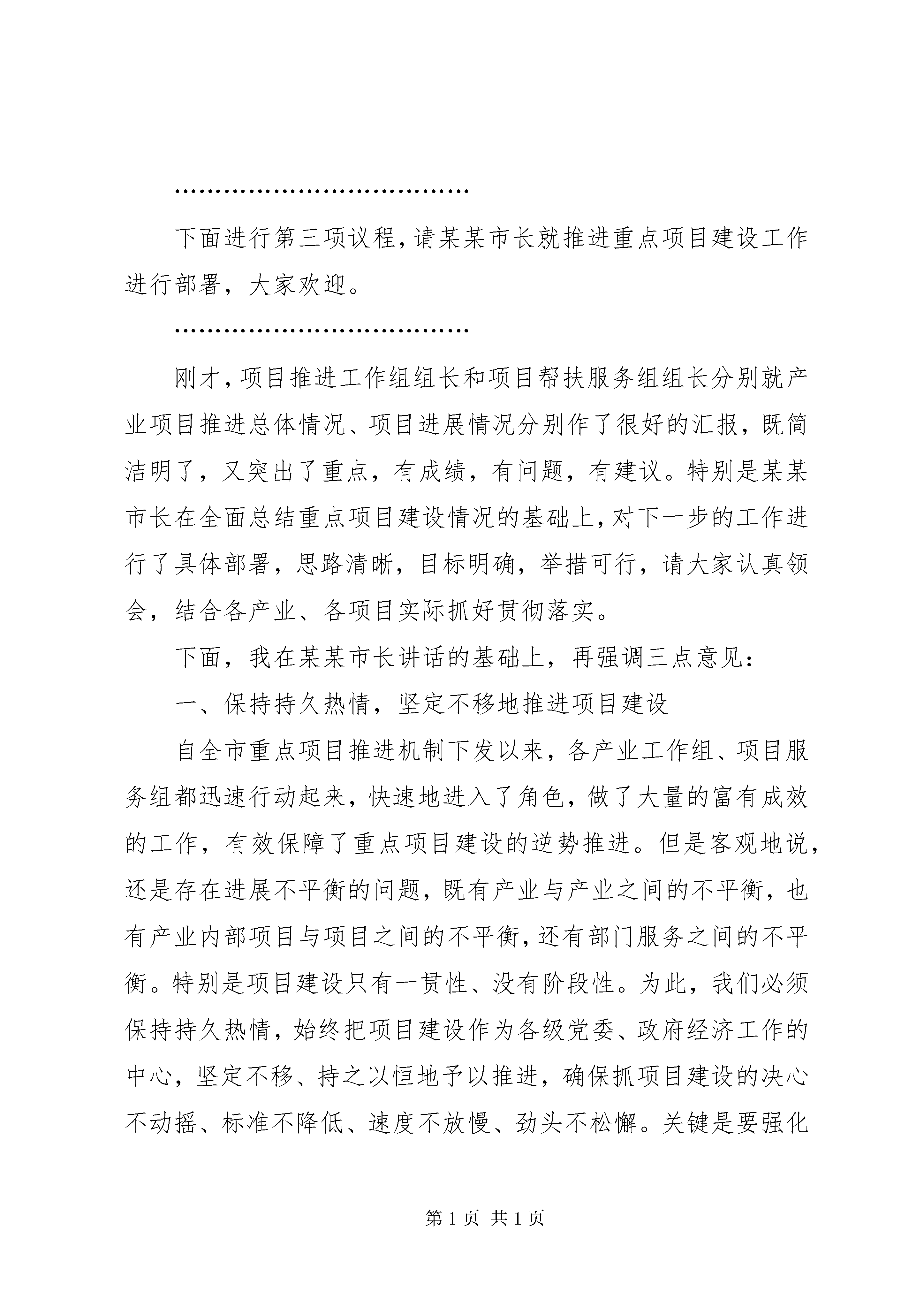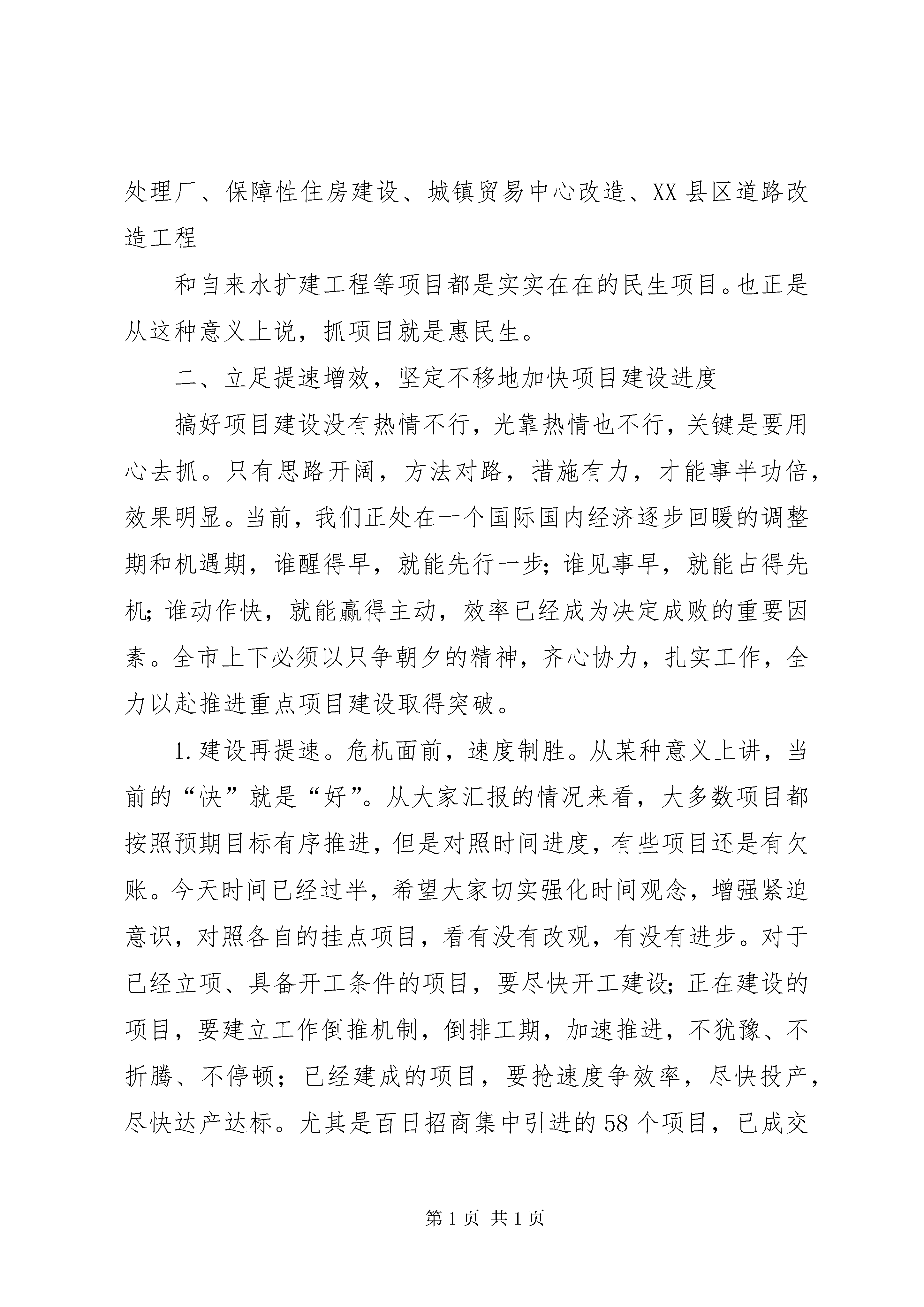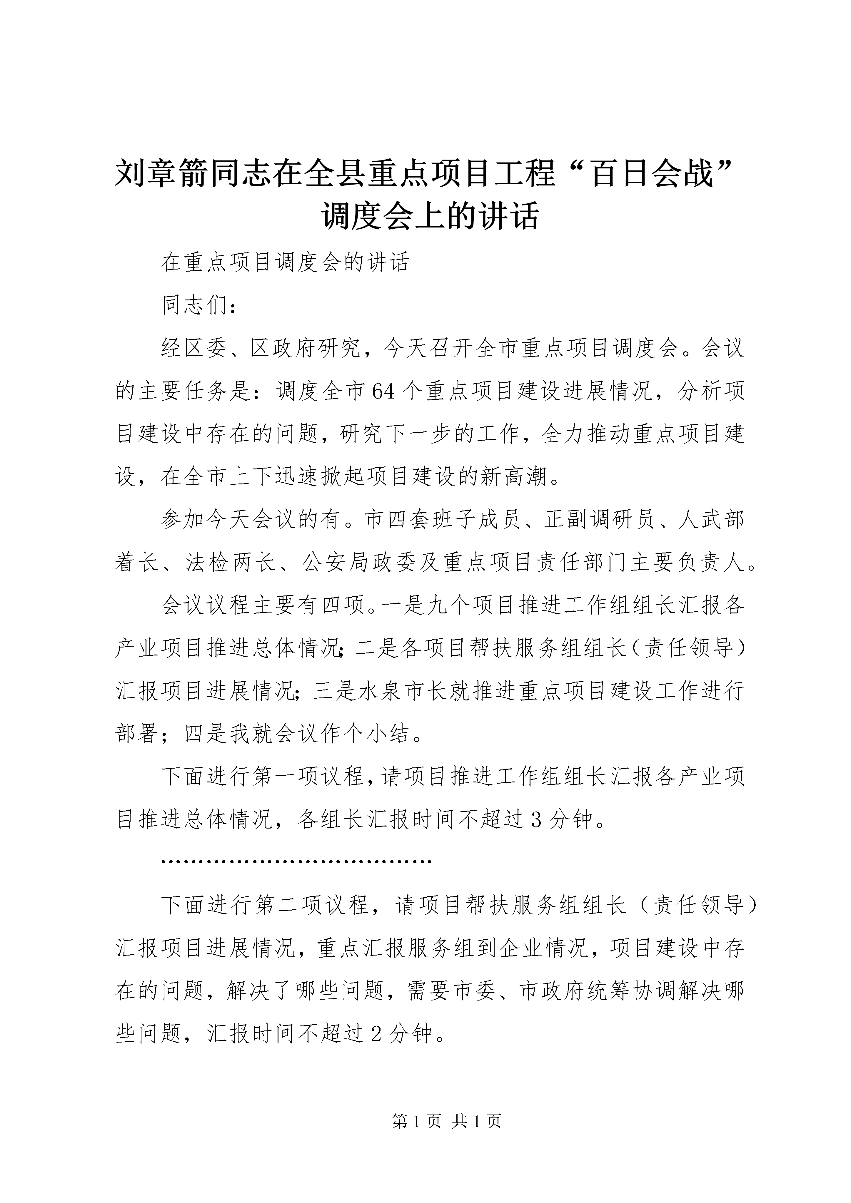 刘章箭同志在全县重点项目工程“百日会战”调度会上的讲话在重点项目调度会的讲话同志们:经区委、区政府研究,今天召开全市重点项目调度会。会议的主要任务是:调度全市64个重点项目建设进展情况,分析项目建设中存在的问题,研究下一步的工作,全力推动重点项目建设,在全市上下迅速掀起项目建设的新高潮。参加今天会议的有。市四套班子成员、正副调研员、人武部着长、法检两长、公安局政委及重点项目责任部门主要负责人。会议议程主要有四项。一是九个项目推进工作组组长汇报各产业项目推进总体情况;二是各项目帮扶服务组组长(责任领导)汇报项目进展情况;三是水泉市长就推进重点项目建设工作进行部署;四是我就会议作个小结。下面进行第一项议程,请项目推进工作组组长汇报各产业项目推进总体情况,各组长汇报时间不超过3分钟。………………………………下面进行第二项议程,请项目帮扶服务组组长(责任领导)汇报项目进展情况,重点汇报服务组到企业情况,项目建设中存在的问题,解决了哪些问题,需要市委、市政府统筹协调解决哪些问题,汇报时间不超过2分钟。………………………………下面进行第三项议程,请某某市长就推进重点项目建设工作进行部署,大家欢迎。………………………………刚才,项目推进工作组组长和项目帮扶服务组组长分别就产业项目推进总体情况、项目进展情况分别作了很好的汇报,既简洁明了,又突出了重点,有成绩,有问题,有建议。特别是某某市长在全面总结重点项目建设情况的基础上,对下一步的工作进行了具体部署,思路清晰,目标明确,举措可行,请大家认真领会,结合各产业、各项目实际抓好贯彻落实。下面,我在某某市长讲话的基础上,再强调三点意见:一、保持持久热情,坚定不移地推进项目建设自全市重点项目推进机制下发以来,各产业工作组、项目服务组都迅速行动起来,快速地进入了角色,做了大量的富有成效的工作,有效保障了重点项目建设的逆势推进。但是客观地说,还是存在进展不平衡的问题,既有产业与产业之间的不平衡,也有产业内部项目与项目之间的不平衡,还有部门服务之间的不平衡。特别是项目建设只有一贯性、没有阶段性。为此,我们必须保持持久热情,始终把项目建设作为各级党委、政府经济工作的中心,坚定不移、持之以恒地予以推进,确保抓项目建设的决心不动摇、标准不降低、速度不放慢、劲头不松懈。关键是要强化“三种理念”:1.要强化“抓项目就是抢机遇”的理念。最近召开的国务院常务会议指出,当前,经济运行出现积极变化,有利条件和积极因素增多,总体形势企稳向好。温家宝总理在河北考察时也强调,我国经济正处在企稳回升的关键时期,要坚定不移地继续实施积极的财政政策和适度宽松的货币政策,全面贯彻落实好应对国际金融危机的一揽子计划。应该说,经济向好、回暖是一致的看法。这也印证了我们在市委五届十次全体(扩大)会议对当前经济形势的判断。为抢抓新机遇、抢占新一轮大发展制高点,市委全委会作出了具体部署,提出了“五个对接、五个提升”的工作思路。但是这些思路举措最终必须落实到具体的项目上,必须要有项目来承载。所以说,抓项目就是抢机遇。2.要强化“抓项目就是蓄后劲”的理念。项目建设是经济总量扩张的“加速器”,也是经济结构优化的“调节器”,是后积薄发的“大容器”。这几年,丰城经济社会之所以能够快速发展,主要是得益于这么多年来我们持续培育、引进、推动了一批大项目,好项目的建设。可以说,丰城今天的快速发展得益于昨天项目建设的累积,丰城未来的发展更取决于今天项目建设的重大突破。没有项目的支撑,率先发展、加速崛起必将是无源之水、无本之木,无从谈起。尤其是在当前经济波动期、政策调整期、产业洗牌期、地方发展重大机遇期,我们要切实着眼丰城发展大后劲,真正按照市委五届十次全体(扩大)会议的要求部署,抢抓机遇,着力“谋划一批、储备一批、争取一批、开工一批、竣工一批”大项目、好项目。这也是我们作为党的干部、作为一届班子做什么、留什么的问题。我们能有今天的成绩,是前任为我们积蓄了力量、能量和后劲;我们今天谋划、推进项目建设,也就是为后任积蓄了力量、能量和后劲,大家要有这样的认识,这样的胸怀。3.要强化“抓项目就是惠民生”的理念。民生关系群众切身利益、关系社会和谐稳定。在国际金融危机的大背景下,做好保障和改善民生工作,是中央的要求,是群众的期盼,更是地方政府和各级干部的责任。最近召开的国务院常务会议为巩固和发展企稳向好的形势,强调必须抓好七项工作,其中一项就是要进一步改善民生,加强社会保障体系建设,全面提高人的素质。强调要把刺激经济增长与有效增加就业结合起来,着力抓好高校毕业生、农民工和困难群体的就业工作;尽快出台养老保险转移接续办法,做好新型农村养老保障试点工作,健全城乡社会救助制度;高度重视教育事业发展和人才队伍建设,加快制定教育中长期规划;抓紧落实已经出台的医药