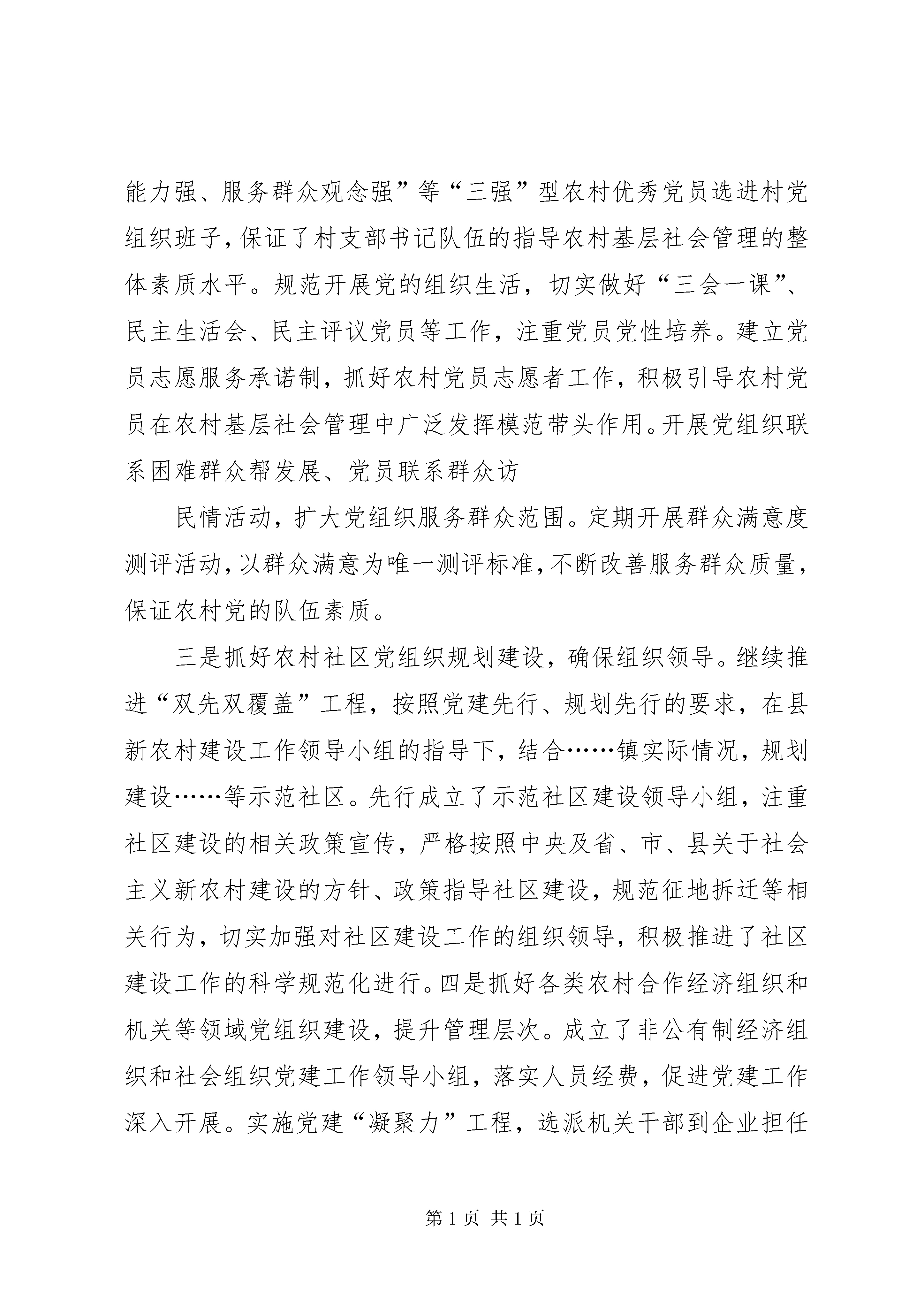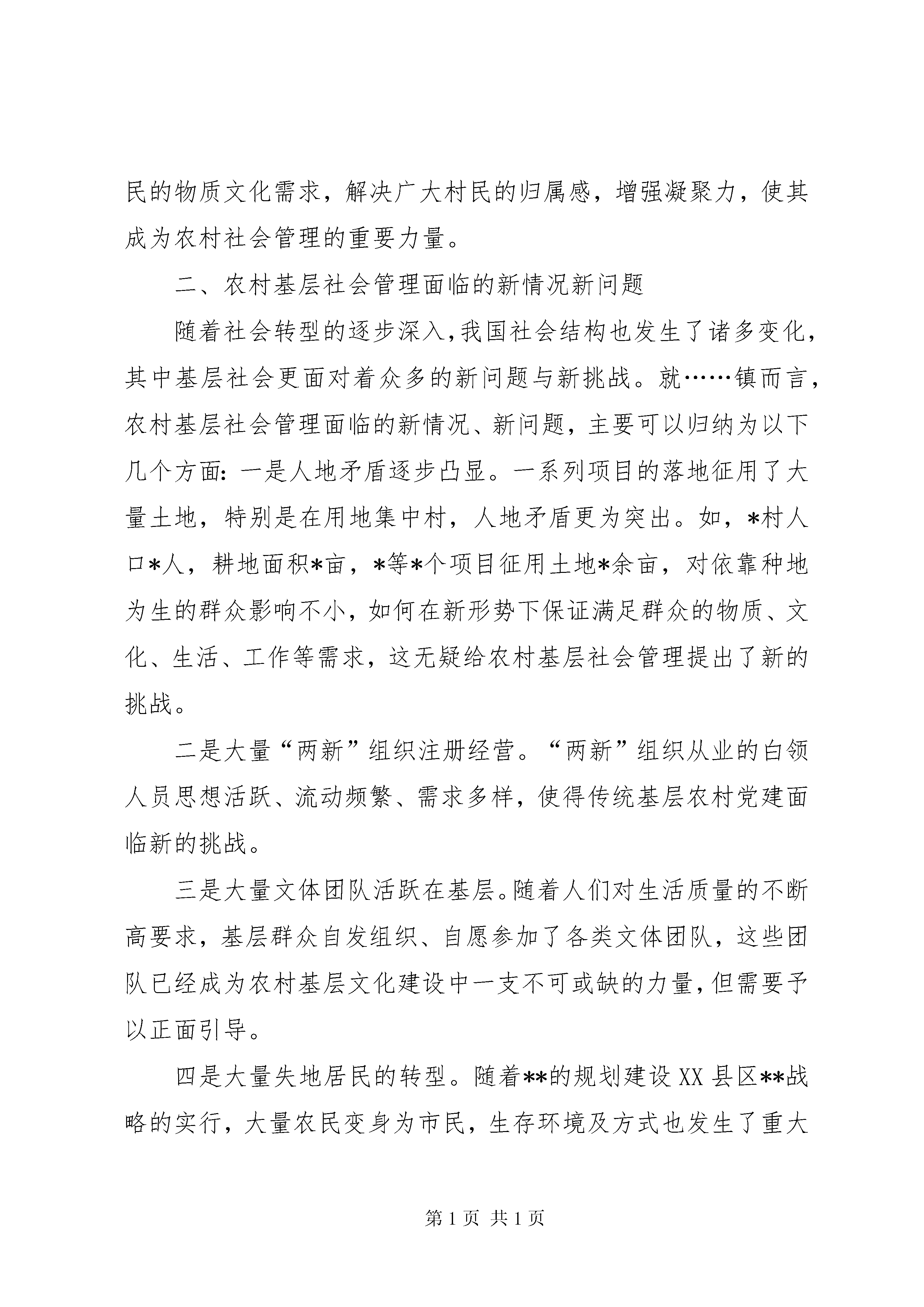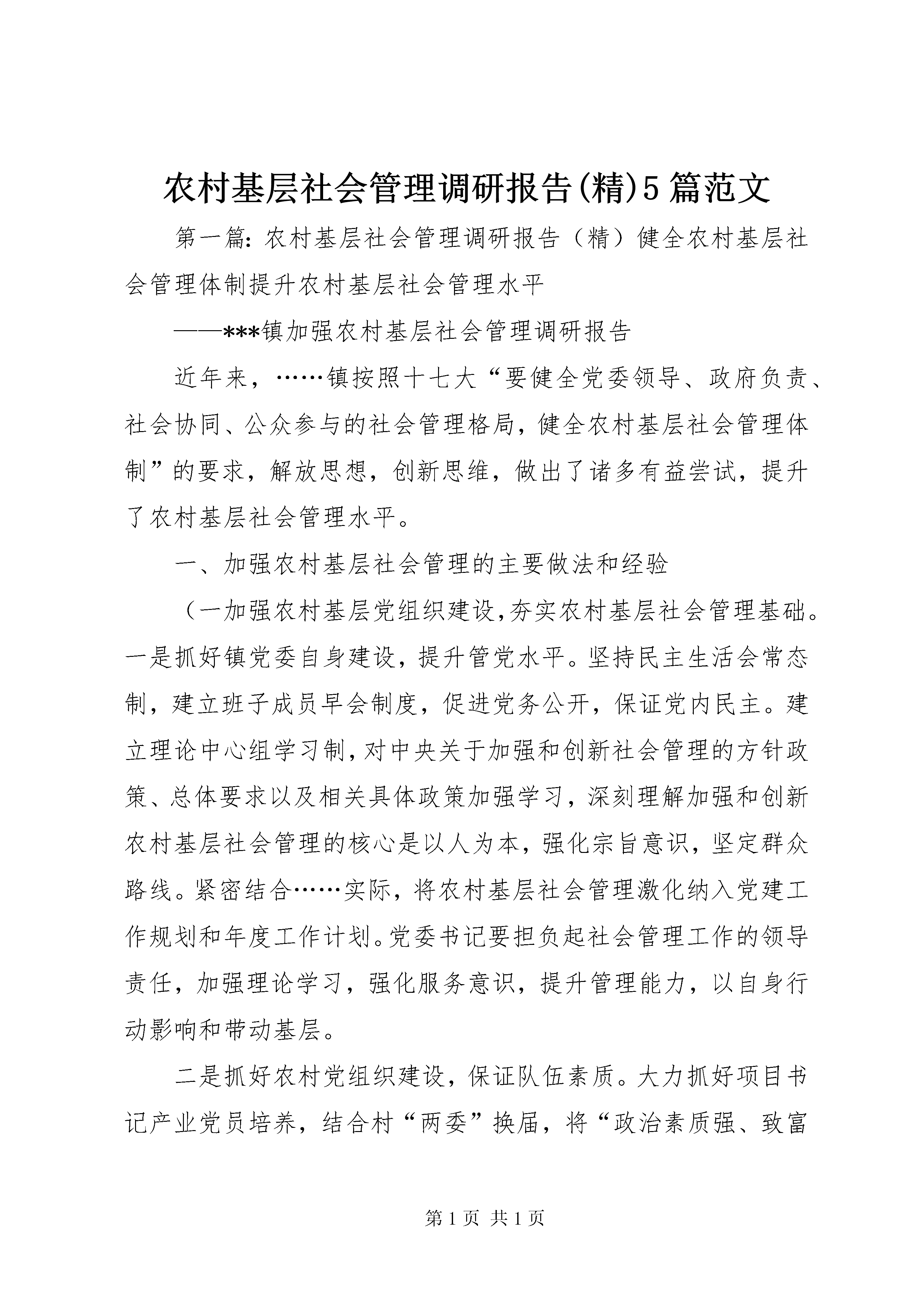 农村基层社会管理调研报告(精)5篇范文第一篇:农村基层社会管理调研报告(精)健全农村基层社会管理体制提升农村基层社会管理水平——***镇加强农村基层社会管理调研报告近年来,……镇按照十七大“要健全党委领导、政府负责、社会协同、公众参与的社会管理格局,健全农村基层社会管理体制”的要求,解放思想,创新思维,做出了诸多有益尝试,提升了农村基层社会管理水平。一、加强农村基层社会管理的主要做法和经验(一加强农村基层党组织建设,夯实农村基层社会管理基础。一是抓好镇党委自身建设,提升管党水平。坚持民主生活会常态制,建立班子成员早会制度,促进党务公开,保证党内民主。建立理论中心组学习制,对中央关于加强和创新社会管理的方针政策、总体要求以及相关具体政策加强学习,深刻理解加强和创新农村基层社会管理的核心是以人为本,强化宗旨意识,坚定群众路线。紧密结合……实际,将农村基层社会管理激化纳入党建工作规划和年度工作计划。党委书记要担负起社会管理工作的领导责任,加强理论学习,强化服务意识,提升管理能力,以自身行动影响和带动基层。二是抓好农村党组织建设,保证队伍素质。大力抓好项目书记产业党员培养,结合村“两委”换届,将“政治素质强、致富能力强、服务群众观念强”等“三强”型农村优秀党员选进村党组织班子,保证了村支部书记队伍的指导农村基层社会管理的整体素质水平。规范开展党的组织生活,切实做好“三会一课”、民主生活会、民主评议党员等工作,注重党员党性培养。建立党员志愿服务承诺制,抓好农村党员志愿者工作,积极引导农村党员在农村基层社会管理中广泛发挥模范带头作用。开展党组织联系困难群众帮发展、党员联系群众访民情活动,扩大党组织服务群众范围。定期开展群众满意度测评活动,以群众满意为唯一测评标准,不断改善服务群众质量,保证农村党的队伍素质。三是抓好农村社区党组织规划建设,确保组织领导。继续推进“双先双覆盖”工程,按照党建先行、规划先行的要求,在县新农村建设工作领导小组的指导下,结合……镇实际情况,规划建设……等示范社区。先行成立了示范社区建设领导小组,注重社区建设的相关政策宣传,严格按照中央及省、市、县关于社会主义新农村建设的方针、政策指导社区建设,规范征地拆迁等相关行为,切实加强对社区建设工作的组织领导,积极推进了社区建设工作的科学规范化进行。四是抓好各类农村合作经济组织和机关等领域党组织建设,提升管理层次。成立了非公有制经济组织和社会组织党建工作领导小组,落实人员经费,促进党建工作深入开展。实施党建“凝聚力”工程,选派机关干部到企业担任党务工作志愿者,广泛开展“七星级”企业党组织创建活动,着力提升企业经营管理层次。大力开展“思想作风纪律建设”活动,改进机关干部作风,提高服务水平,实现机关效能提升。加强站所建设,切实提高各站所服务新农村建设的能力和水平。(二加强农村基层政权组织建设,切实做好农村基层社会管理工作。一是加强镇政府建设,强化公共服务职能。深化实施“三级联创”工程,促进创先争优活动开展,加强机关干部队伍的思想建设、组织建设、作风建设,牢固树立公仆意识、服务意识。镇政府管理重心下移,各部门在各村设立服务代理站,实行为民服务代理制,零距离、无缝隙、主动式和全方位地为群众服务。坚持“不与民争利”,优化、强化公共财政对社会事业发展的投入,积极对上争取资金70万元,全部用于解决教育债务。建立村级动态监测机制,派干部包村落,让领导包管区,将农村社会管理纳入政府职责范围,总体实现了农村基层社会的统筹监管。建立了“村情档案”,及时了解村情民意,方便解决矛盾纠纷,提前掌握信访苗头,早发现、早处理,确保“小事不出村、大事不出镇”,切实维护了基层社会稳定。二是坚持和完善乡镇人民代表大会制度,确保领导监督。注重加强教育培训,提高权力机关工作人员的政治素质、业务能力和法律和政策水平,保证其领导监督权力的高质量行使。坚持和完善选举制度,严格按选举法规定的选举制度办事。政府加大人力、物力、财力支持和帮助,完善人民代表大会会议制度,保证会议高质高效率开展(三加强农村基层群众性自治组织建设一是加强村民委员会建设,提高农村社会管理水平。按照能人治村要求,加强农村干部队伍建设,结合村“两委”换届,实现全镇村“两委”成员交叉任职比例达%,“一身兼”比例%,“三高三强”型人才达到%,有名党员致富能手被成功培养成村干部。实施“递进培养工程”,将农村优秀人才纳入“农村后备干部储备库”,加强后备干部培养,积极培养选拔年轻干部、致富能手和妇女干部。持续深化“能力提升”工程,重视干部队伍的能力建设,深入开展冬季集中整训活动,统一干部思想;明确工作目标,制定科学的考核方式,加强培训,严格考评,使他们尽快提高自身素质,提高社会管理能力。加强大学生村官培养使用,大胆交任务、压担子,帮助成立“