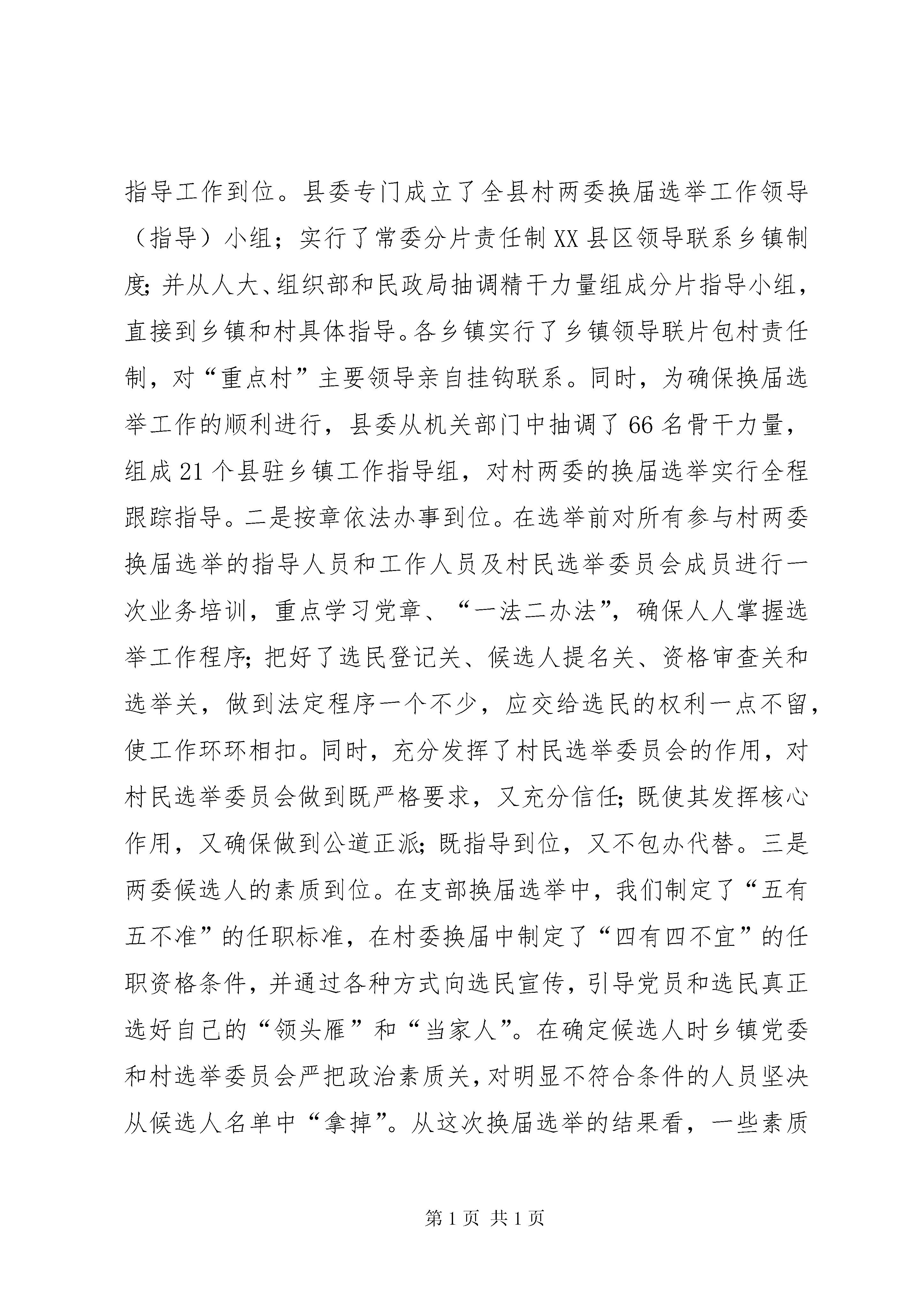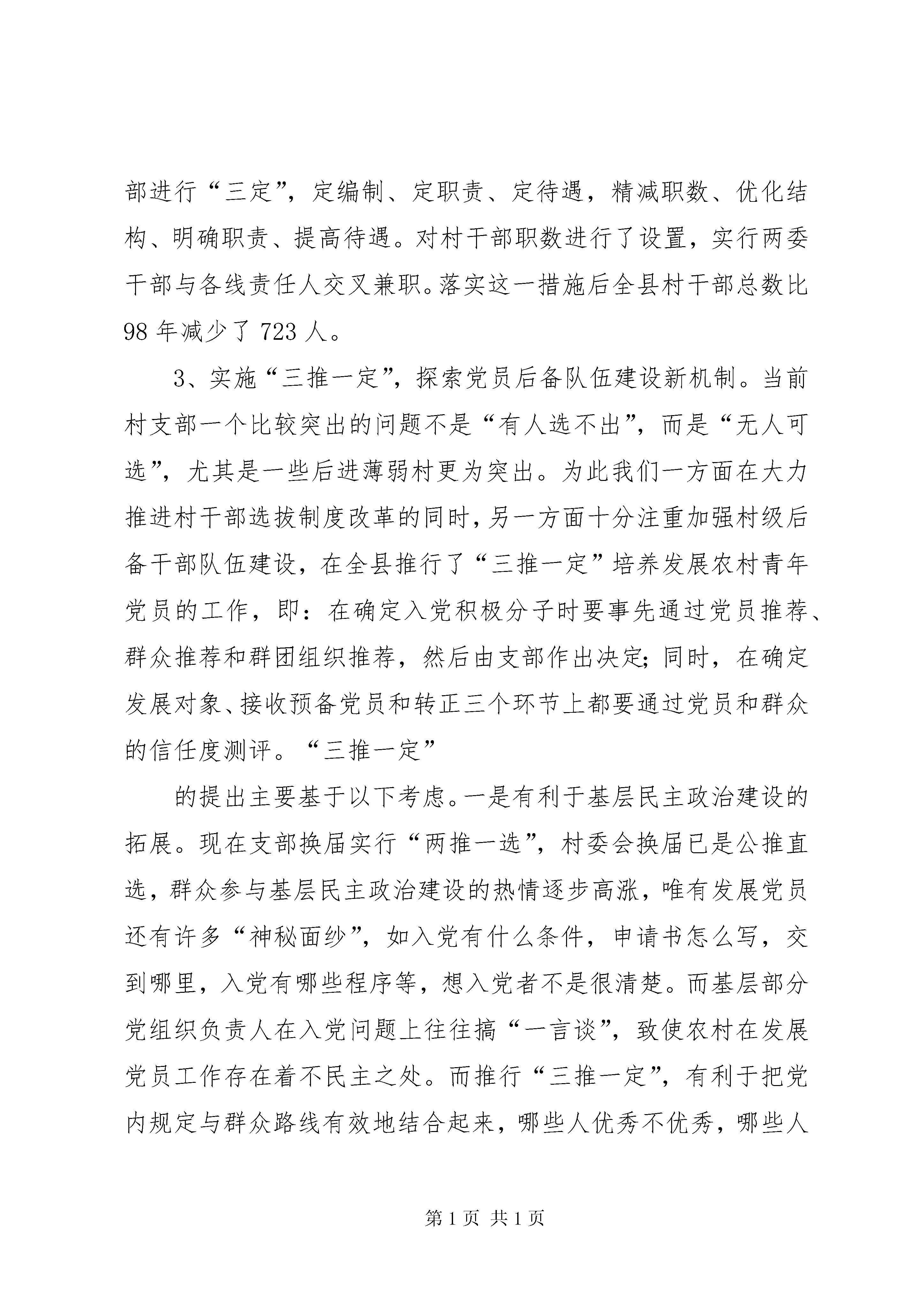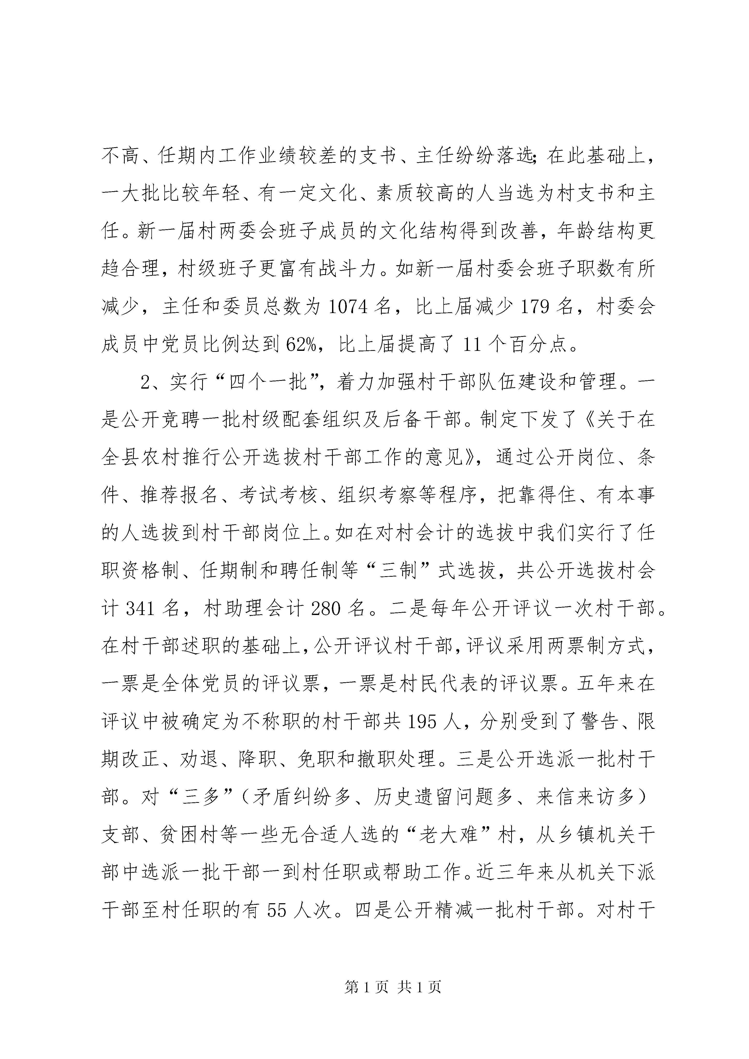 农村基层组织建设情况汇报在市委、县委的正确领导和上级组织部门的精心指导下,紧扣“围绕中心、服务大局、拓宽领域、强化功能”的思路,以“三个代表”重要思想和党的十六大精神为指导,围绕与全省同步提前基本实现现代化的目标,借鉴“学教”活动的成功经验,以“五争五强”(即争创五星级班子强核心,争当创业型干部强素质,争建规范化机制强管理,争学郑培民精神强服务,争创现代化新农村强实力)活动为载体,突出重点,分类建设,整体推进,全面建设“先锋工程”。现将近几年的基层组织建设情况汇报如下:一、实行以“两推一选”为核心的村干部选拔机制,选好配强两委班子1、全面实行“两推一选”和“公推直选”,顺利开展村两委换届选举。“两推一选”是指以党员民主推荐、群众推选测评、党内民主选举为主要内容的村党支部换届选举制度。2001年我们在全县确定了30个支部开展了“两推一选”的试点,在2002年的支部换届时全部推行了“两推一选”。村委会换届我县自新的《村民委员会组织法》颁布以来,于2000年在全市率先实行了公推直选;在去年的村委会换届中又全面实践了公推直选的选举办法。在两委换届选举中有336个村实行了“两推一选”,占99.1%;338个村进行了公推直选。通过换届,一大批年纪轻、有能力的人进入了村两委会班子,提高了村级领导班子的战斗力。在村两委换届选举工作中我们做到了“三个到位”:一是领导和指导工作到位。县委专门成立了全县村两委换届选举工作领导(指导)小组;实行了常委分片责任制XX县区领导联系乡镇制度;并从人大、组织部和民政局抽调精干力量组成分片指导小组,直接到乡镇和村具体指导。各乡镇实行了乡镇领导联片包村责任制,对“重点村”主要领导亲自挂钩联系。同时,为确保换届选举工作的顺利进行,县委从机关部门中抽调了66名骨干力量,组成21个县驻乡镇工作指导组,对村两委的换届选举实行全程跟踪指导。二是按章依法办事到位。在选举前对所有参与村两委换届选举的指导人员和工作人员及村民选举委员会成员进行一次业务培训,重点学习党章、“一法二办法”,确保人人掌握选举工作程序;把好了选民登记关、候选人提名关、资格审查关和选举关,做到法定程序一个不少,应交给选民的权利一点不留,使工作环环相扣。同时,充分发挥了村民选举委员会的作用,对村民选举委员会做到既严格要求,又充分信任;既使其发挥核心作用,又确保做到公道正派;既指导到位,又不包办代替。三是两委候选人的素质到位。在支部换届选举中,我们制定了“五有五不准”的任职标准,在村委换届中制定了“四有四不宜”的任职资格条件,并通过各种方式向选民宣传,引导党员和选民真正选好自己的“领头雁”和“当家人”。在确定候选人时乡镇党委和村选举委员会严把政治素质关,对明显不符合条件的人员坚决从候选人名单中“拿掉”。从这次换届选举的结果看,一些素质不高、任期内工作业绩较差的支书、主任纷纷落选;在此基础上,一大批比较年轻、有一定文化、素质较高的人当选为村支书和主任。新一届村两委会班子成员的文化结构得到改善,年龄结构更趋合理,村级班子更富有战斗力。如新一届村委会班子职数有所减少,主任和委员总数为1074名,比上届减少179名,村委会成员中党员比例达到62%,比上届提高了11个百分点。2、实行“四个一批”,着力加强村干部队伍建设和管理。一是公开竞聘一批村级配套组织及后备干部。制定下发了《关于在全县农村推行公开选拔村干部工作的意见》,通过公开岗位、条件、推荐报名、考试考核、组织考察等程序,把靠得住、有本事的人选拔到村干部岗位上。如在对村会计的选拔中我们实行了任职资格制、任期制和聘任制等“三制”式选拔,共公开选拔村会计341名,村助理会计280名。二是每年公开评议一次村干部。在村干部述职的基础上,公开评议村干部,评议采用两票制方式,一票是全体党员的评议票,一票是村民代表的评议票。五年来在评议中被确定为不称职的村干部共195人,分别受到了警告、限期改正、劝退、降职、免职和撤职处理。三是公开选派一批村干部。对“三多”(矛盾纠纷多、历史遗留问题多、来信来访多)支部、贫困村等一些无合适人选的“老大难”村,从乡镇机关干部中选派一批干部一到村任职或帮助工作。近三年来从机关下派干部至村任职的有55人次。四是公开精减一批村干部。对村干部进行“三定”,定编制、定职责、定待遇,精减职数、优化结构、明确职责、提高待遇。对村干部职数进行了设置,实行两委干部与各线责任人交叉兼职。落实这一措施后全县村干部总数比98年减少了723人。3、实施“三推一定”,探索党员后备队伍建设新机制。当前村支部一个比较突出的问题不是“有人选不出”,而是“无人可选”,尤其是一些后进薄弱村更为突出。为此我们一方面在大力推进村干部选拔制度改革的同时,另一方面十分注重加强村级后备干部队伍建设,在全县推行了“三推一
