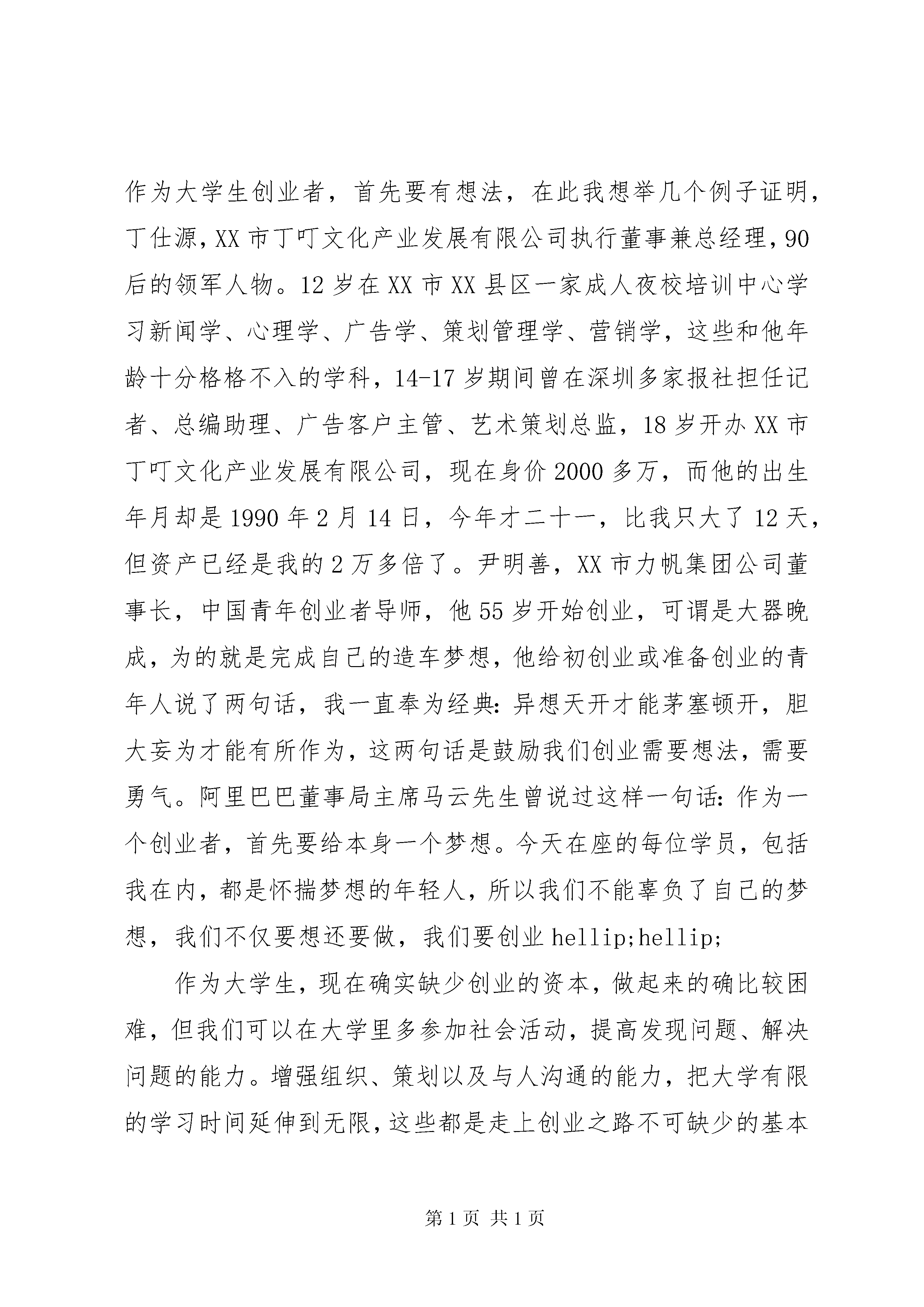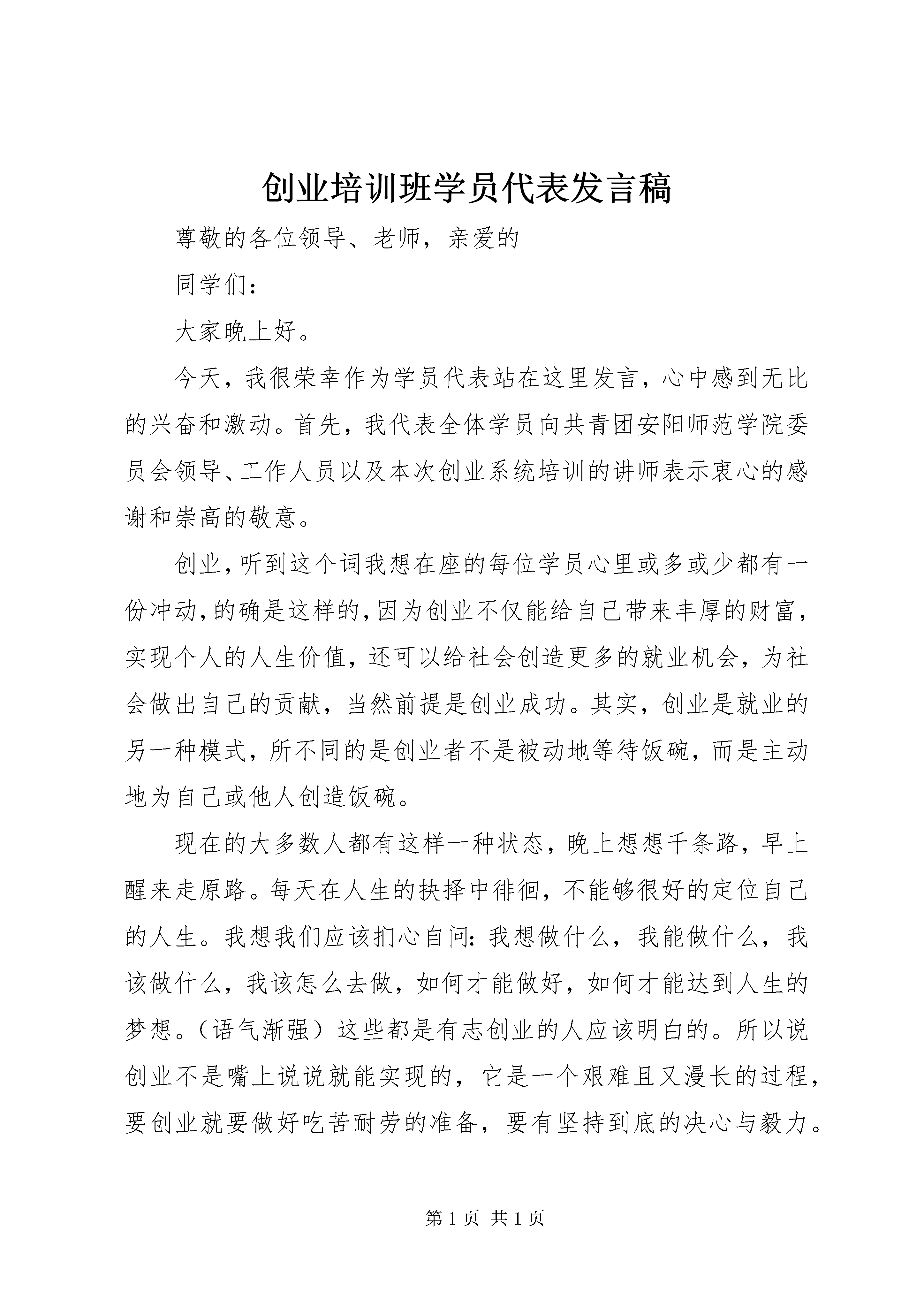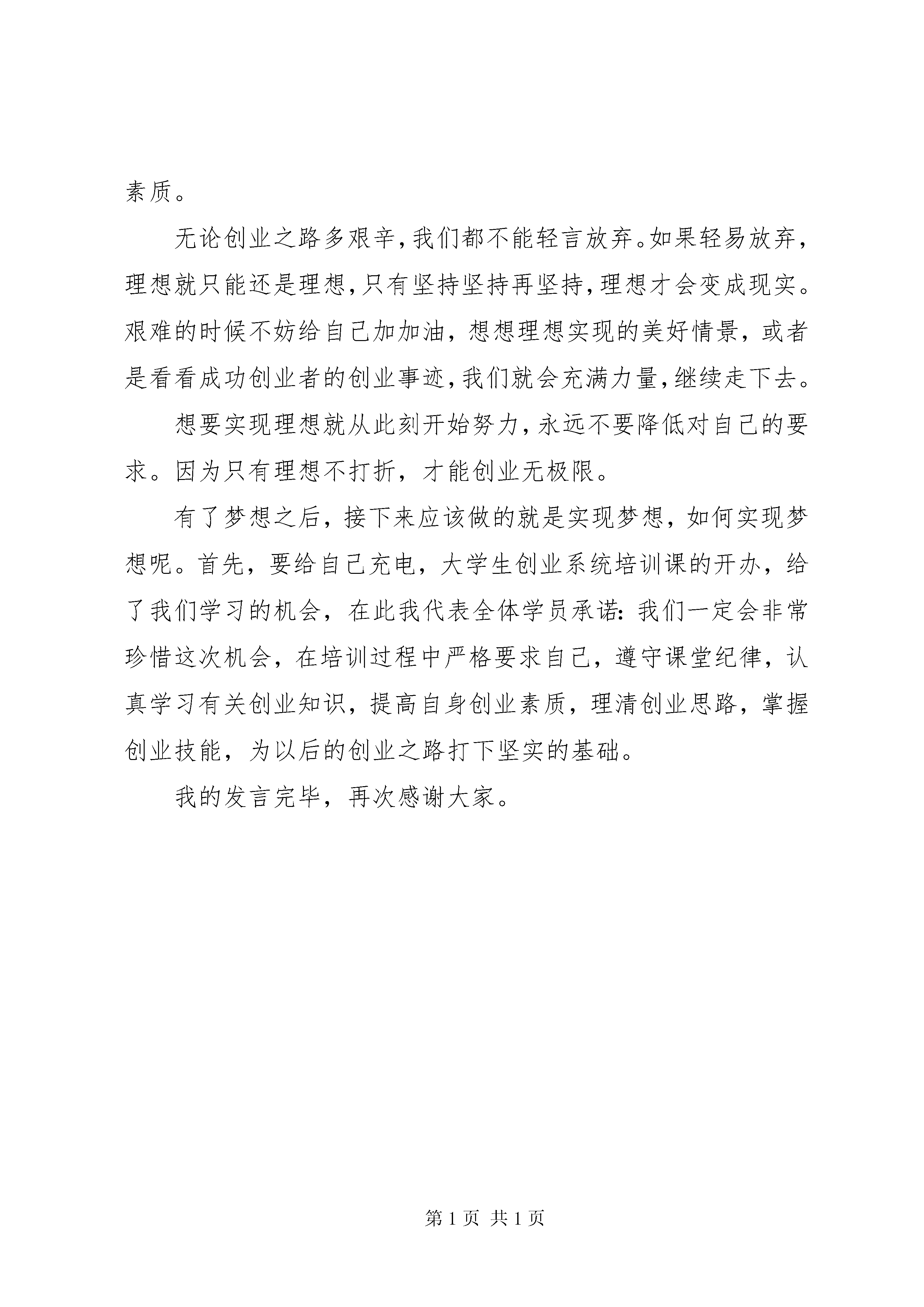 创业培训班学员代表发言稿尊敬的各位领导、老师,亲爱的同学们:大家晚上好。今天,我很荣幸作为学员代表站在这里发言,心中感到无比的兴奋和激动。首先,我代表全体学员向共青团安阳师范学院委员会领导、工作人员以及本次创业系统培训的讲师表示衷心的感谢和崇高的敬意。创业,听到这个词我想在座的每位学员心里或多或少都有一份冲动,的确是这样的,因为创业不仅能给自己带来丰厚的财富,实现个人的人生价值,还可以给社会创造更多的就业机会,为社会做出自己的贡献,当然前提是创业成功。其实,创业是就业的另一种模式,所不同的是创业者不是被动地等待饭碗,而是主动地为自己或他人创造饭碗。现在的大多数人都有这样一种状态,晚上想想千条路,早上醒来走原路。每天在人生的抉择中徘徊,不能够很好的定位自己的人生。我想我们应该扪心自问:我想做什么,我能做什么,我该做什么,我该怎么去做,如何才能做好,如何才能达到人生的梦想。(语气渐强)这些都是有志创业的人应该明白的。所以说创业不是嘴上说说就能实现的,它是一个艰难且又漫长的过程,要创业就要做好吃苦耐劳的准备,要有坚持到底的决心与毅力。作为大学生创业者,首先要有想法,在此我想举几个例子证明,丁仕源,XX市丁叮文化产业发展有限公司执行董事兼总经理,90后的领军人物。12岁在XX市XX县区一家成人夜校培训中心学习新闻学、心理学、广告学、策划管理学、营销学,这些和他年龄十分格格不入的学科,14-17岁期间曾在深圳多家报社担任记者、总编助理、广告客户主管、艺术策划总监,18岁开办XX市丁叮文化产业发展有限公司,现在身价2000多万,而他的出生年月却是1990年2月14日,今年才二十一,比我只大了12天,但资产已经是我的2万多倍了。尹明善,XX市力帆集团公司董事长,中国青年创业者导师,他55岁开始创业,可谓是大器晚成,为的就是完成自己的造车梦想,他给初创业或准备创业的青年人说了两句话,我一直奉为经典:异想天开才能茅塞顿开,胆大妄为才能有所作为,这两句话是鼓励我们创业需要想法,需要勇气。阿里巴巴董事局主席马云先生曾说过这样一句话:作为一个创业者,首先要给本身一个梦想。今天在座的每位学员,包括我在内,都是怀揣梦想的年轻人,所以我们不能辜负了自己的梦想,我们不仅要想还要做,我们要创业hellip;hellip;作为大学生,现在确实缺少创业的资本,做起来的确比较困难,但我们可以在大学里多参加社会活动,提高发现问题、解决问题的能力。增强组织、策划以及与人沟通的能力,把大学有限的学习时间延伸到无限,这些都是走上创业之路不可缺少的基本素质。无论创业之路多艰辛,我们都不能轻言放弃。如果轻易放弃,理想就只能还是理想,只有坚持坚持再坚持,理想才会变成现实。艰难的时候不妨给自己加加油,想想理想实现的美好情景,或者是看看成功创业者的创业事迹,我们就会充满力量,继续走下去。想要实现理想就从此刻开始努力,永远不要降低对自己的要求。因为只有理想不打折,才能创业无极限。有了梦想之后,接下来应该做的就是实现梦想,如何实现梦想呢。首先,要给自己充电,大学生创业系统培训课的开办,给了我们学习的机会,在此我代表全体学员承诺:我们一定会非常珍惜这次机会,在培训过程中严格要求自己,遵守课堂纪律,认真学习有关创业知识,提高自身创业素质,理清创业思路,掌握创业技能,为以后的创业之路打下坚实的基础。我的发言完毕,再次感谢大家。