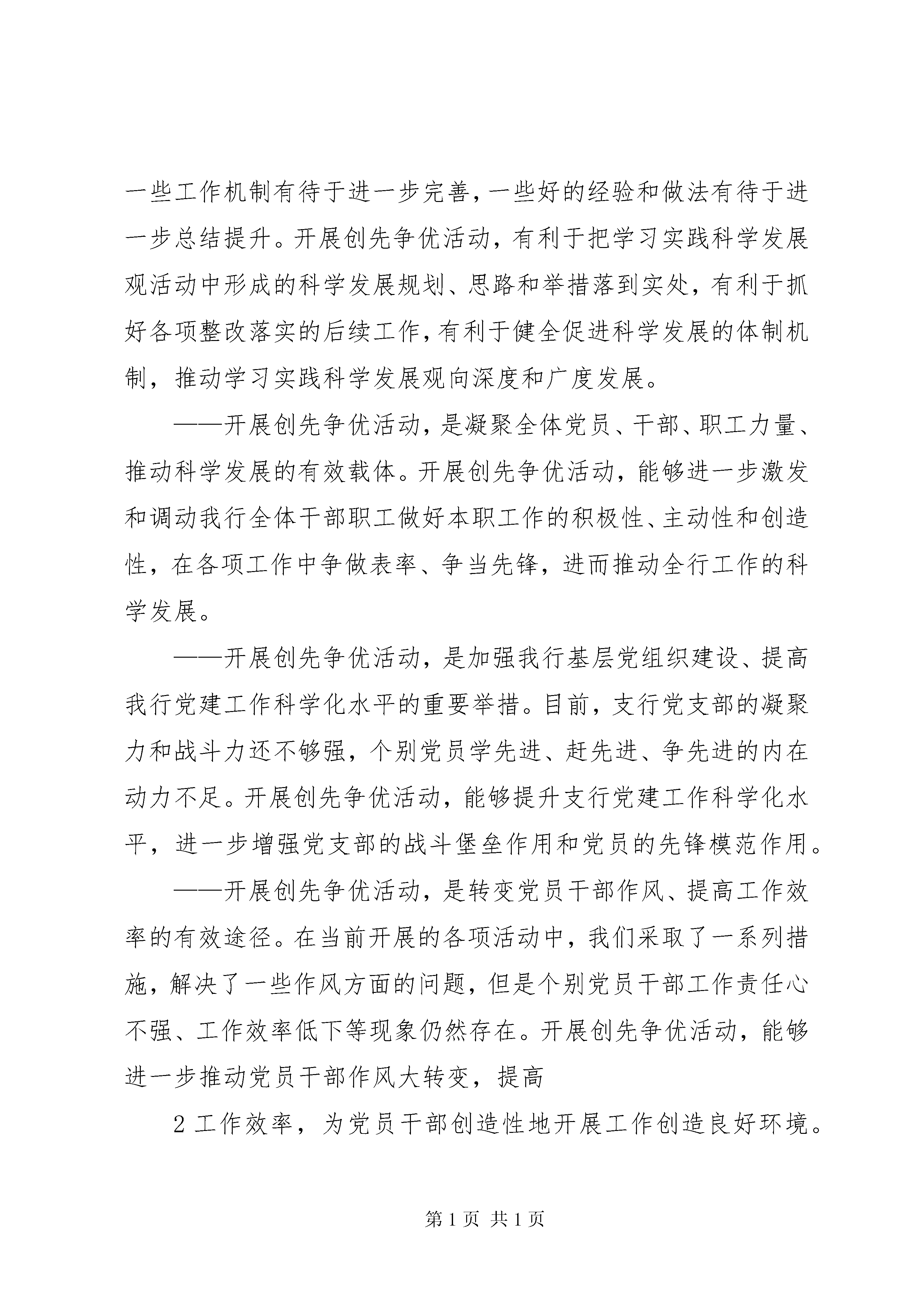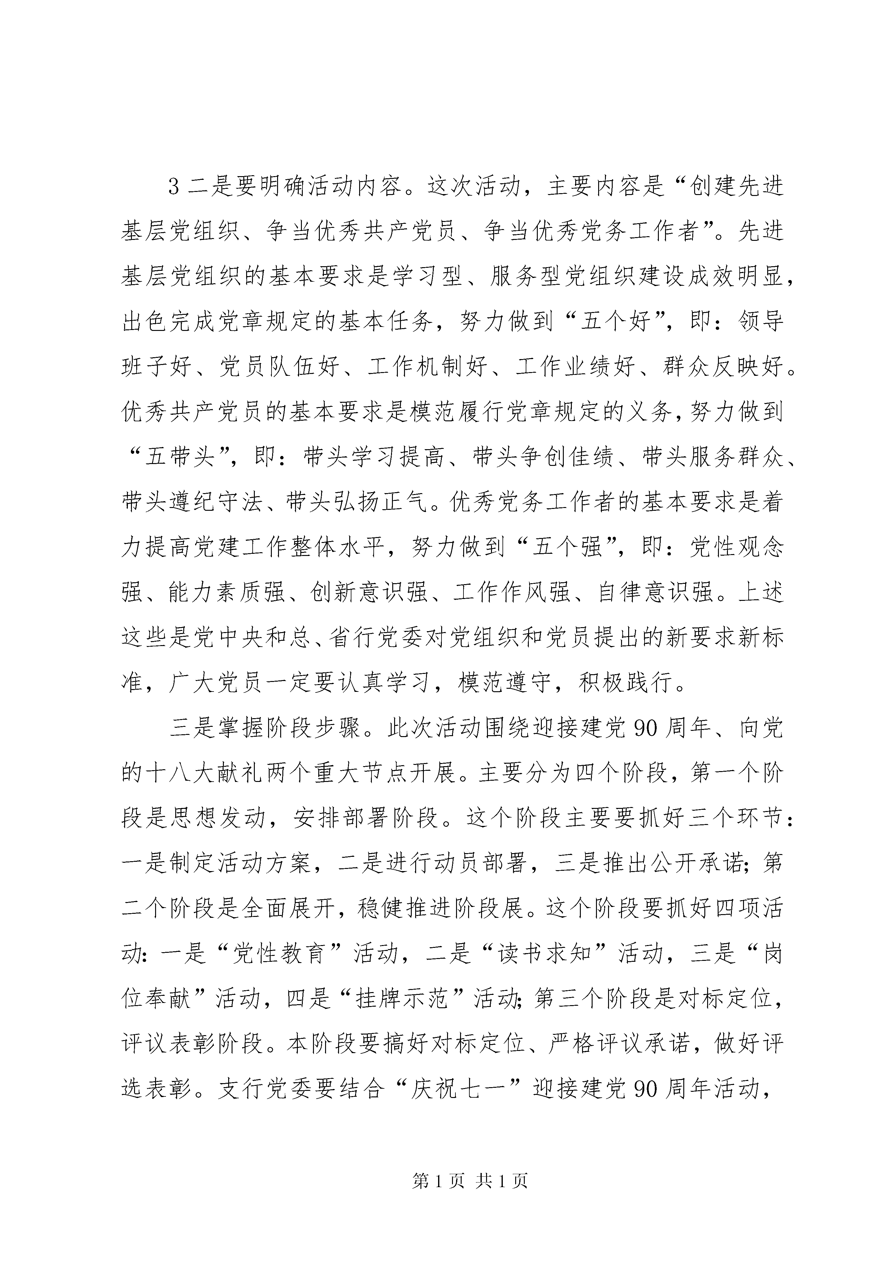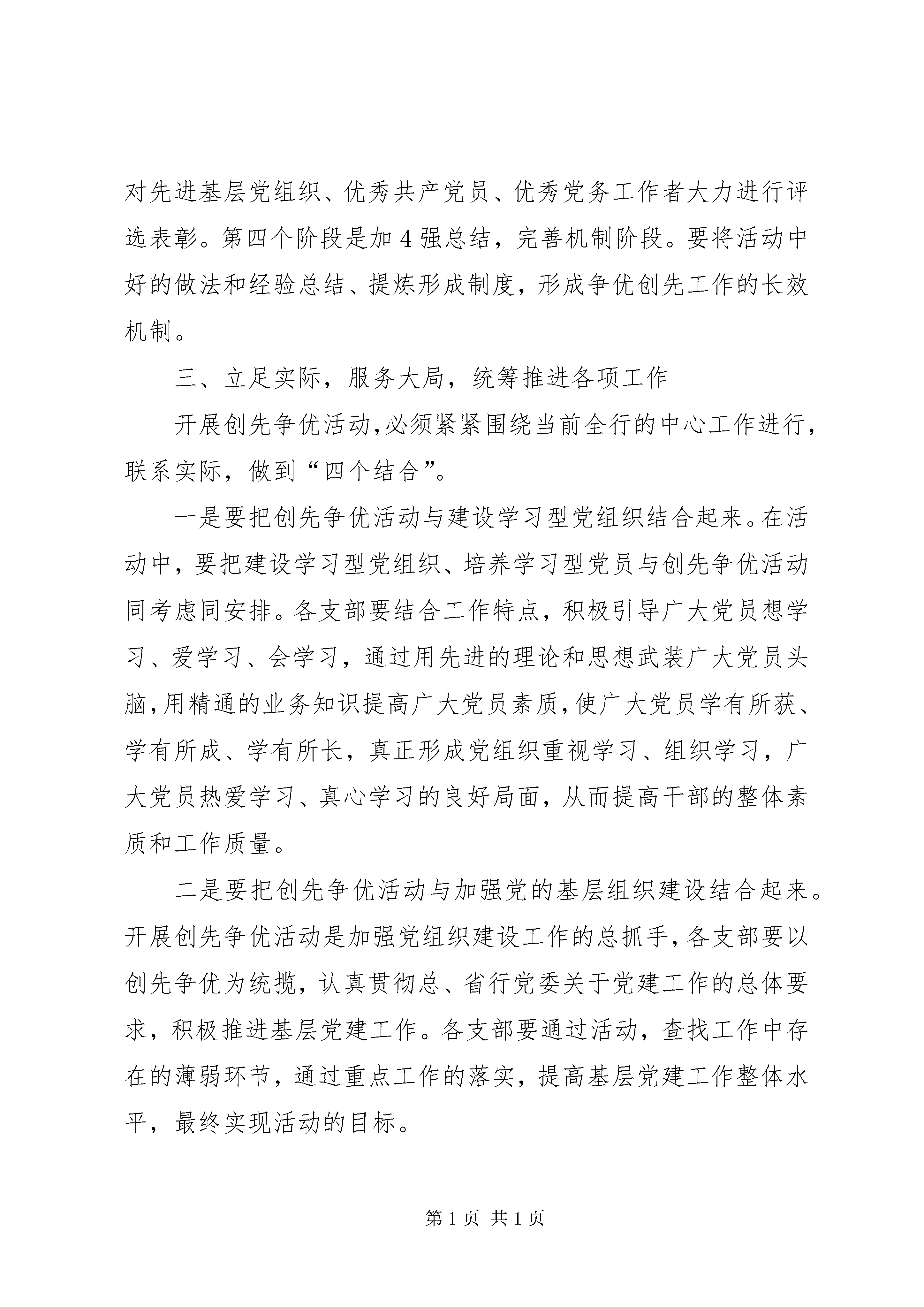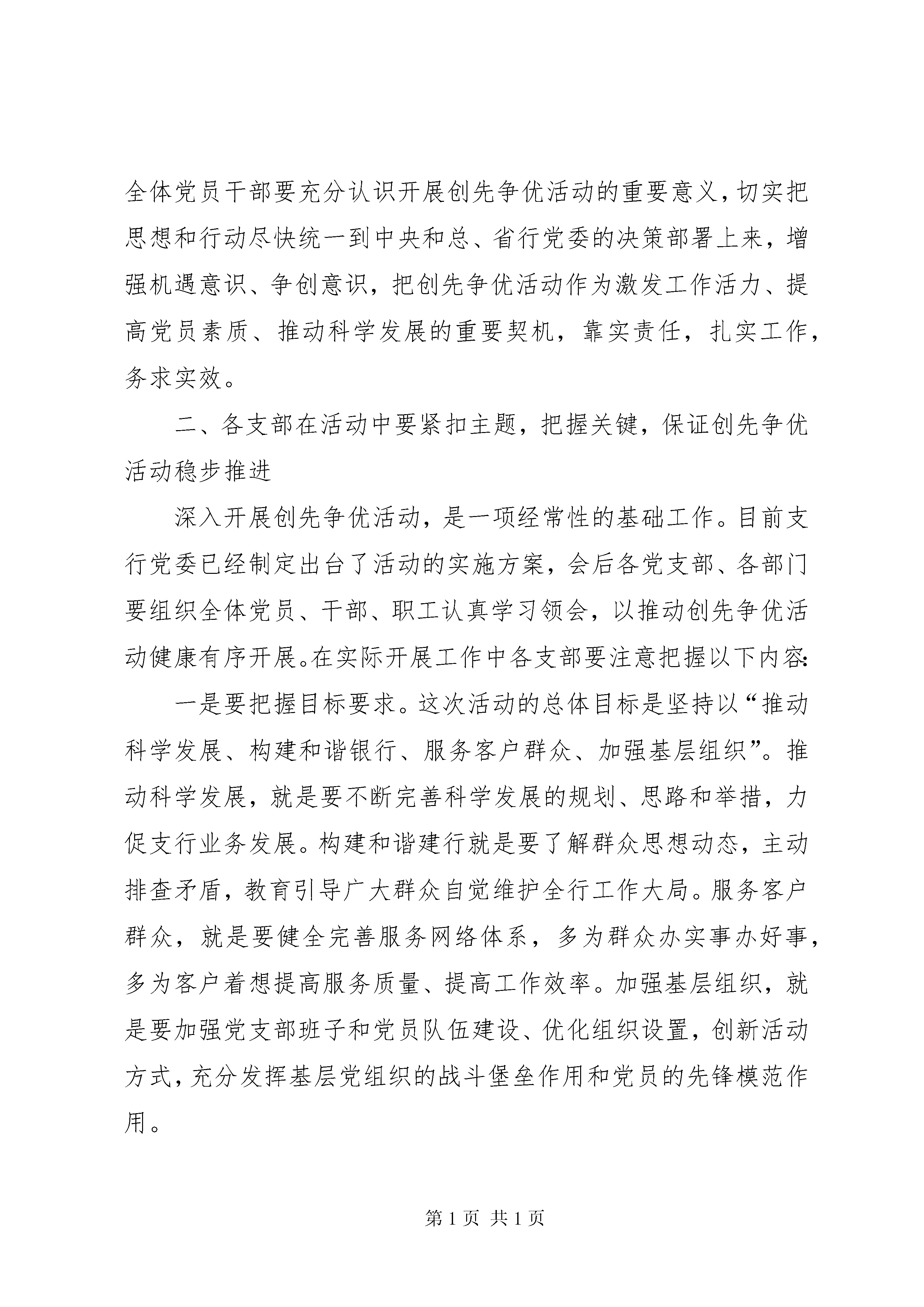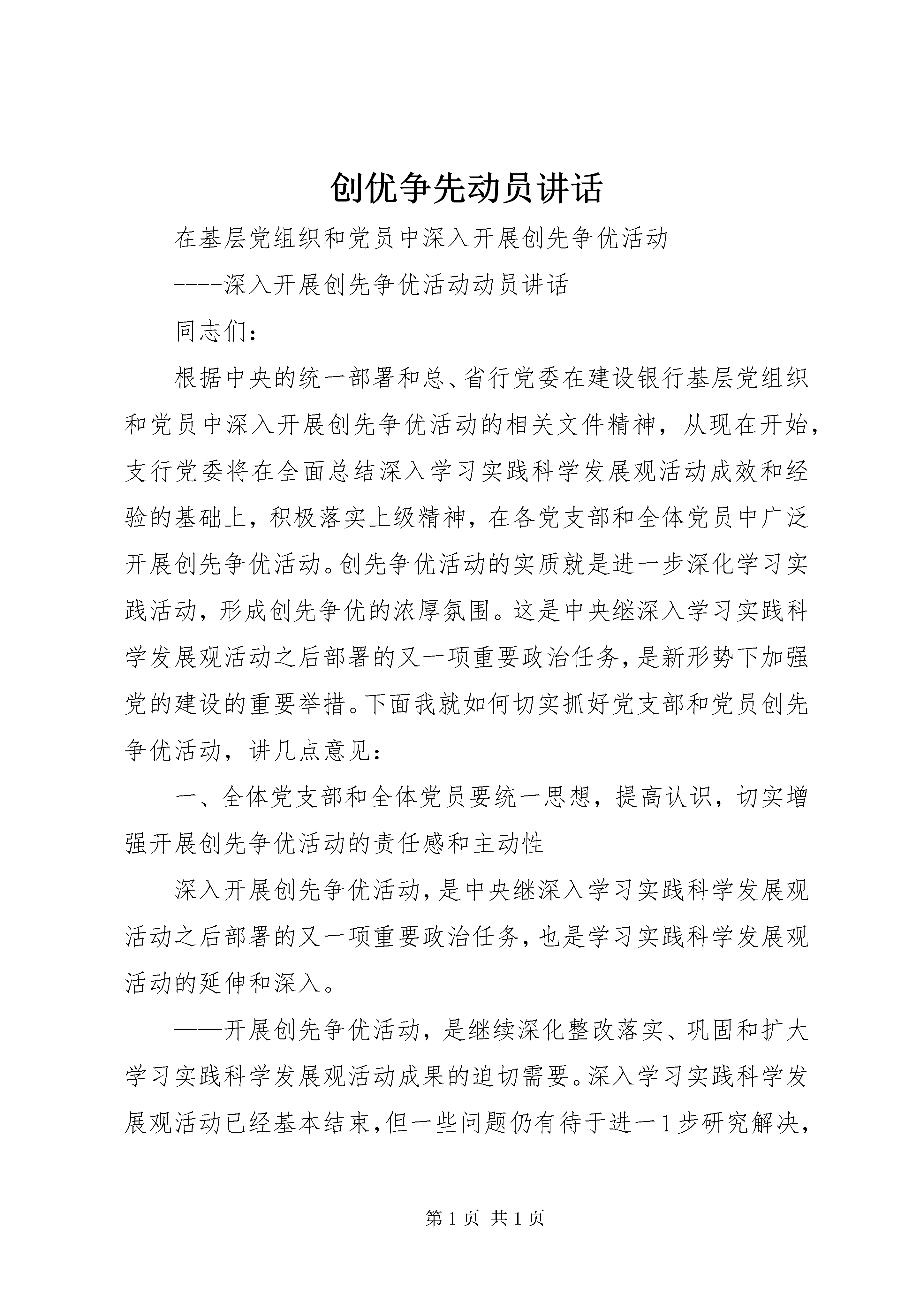 创优争先动员讲话在基层党组织和党员中深入开展创先争优活动----深入开展创先争优活动动员讲话同志们:根据中央的统一部署和总、省行党委在建设银行基层党组织和党员中深入开展创先争优活动的相关文件精神,从现在开始,支行党委将在全面总结深入学习实践科学发展观活动成效和经验的基础上,积极落实上级精神,在各党支部和全体党员中广泛开展创先争优活动。创先争优活动的实质就是进一步深化学习实践活动,形成创先争优的浓厚氛围。这是中央继深入学习实践科学发展观活动之后部署的又一项重要政治任务,是新形势下加强党的建设的重要举措。下面我就如何切实抓好党支部和党员创先争优活动,讲几点意见:一、全体党支部和全体党员要统一思想,提高认识,切实增强开展创先争优活动的责任感和主动性深入开展创先争优活动,是中央继深入学习实践科学发展观活动之后部署的又一项重要政治任务,也是学习实践科学发展观活动的延伸和深入。——开展创先争优活动,是继续深化整改落实、巩固和扩大学习实践科学发展观活动成果的迫切需要。深入学习实践科学发展观活动已经基本结束,但一些问题仍有待于进一1步研究解决,一些工作机制有待于进一步完善,一些好的经验和做法有待于进一步总结提升。开展创先争优活动,有利于把学习实践科学发展观活动中形成的科学发展规划、思路和举措落到实处,有利于抓好各项整改落实的后续工作,有利于健全促进科学发展的体制机制,推动学习实践科学发展观向深度和广度发展。——开展创先争优活动,是凝聚全体党员、干部、职工力量、推动科学发展的有效载体。开展创先争优活动,能够进一步激发和调动我行全体干部职工做好本职工作的积极性、主动性和创造性,在各项工作中争做表率、争当先锋,进而推动全行工作的科学发展。——开展创先争优活动,是加强我行基层党组织建设、提高我行党建工作科学化水平的重要举措。目前,支行党支部的凝聚力和战斗力还不够强,个别党员学先进、赶先进、争先进的内在动力不足。开展创先争优活动,能够提升支行党建工作科学化水平,进一步增强党支部的战斗堡垒作用和党员的先锋模范作用。——开展创先争优活动,是转变党员干部作风、提高工作效率的有效途径。在当前开展的各项活动中,我们采取了一系列措施,解决了一些作风方面的问题,但是个别党员干部工作责任心不强、工作效率低下等现象仍然存在。开展创先争优活动,能够进一步推动党员干部作风大转变,提高2工作效率,为党员干部创造性地开展工作创造良好环境。全体党员干部要充分认识开展创先争优活动的重要意义,切实把思想和行动尽快统一到中央和总、省行党委的决策部署上来,增强机遇意识、争创意识,把创先争优活动作为激发工作活力、提高党员素质、推动科学发展的重要契机,靠实责任,扎实工作,务求实效。二、各支部在活动中要紧扣主题,把握关键,保证创先争优活动稳步推进深入开展创先争优活动,是一项经常性的基础工作。目前支行党委已经制定出台了活动的实施方案,会后各党支部、各部门要组织全体党员、干部、职工认真学习领会,以推动创先争优活动健康有序开展。在实际开展工作中各支部要注意把握以下内容:一是要把握目标要求。这次活动的总体目标是坚持以“推动科学发展、构建和谐银行、服务客户群众、加强基层组织”。推动科学发展,就是要不断完善科学发展的规划、思路和举措,力促支行业务发展。构建和谐建行就是要了解群众思想动态,主动排查矛盾,教育引导广大群众自觉维护全行工作大局。服务客户群众,就是要健全完善服务网络体系,多为群众办实事办好事,多为客户着想提高服务质量、提高工作效率。加强基层组织,就是要加强党支部班子和党员队伍建设、优化组织设置,创新活动方式,充分发挥基层党组织的战斗堡垒作用和党员的先锋模范作用。3二是要明确活动内容。这次活动,主要内容是“创建先进基层党组织、争当优秀共产党员、争当优秀党务工作者”。先进基层党组织的基本要求是学习型、服务型党组织建设成效明显,出色完成党章规定的基本任务,努力做到“五个好”,即:领导班子好、党员队伍好、工作机制好、工作业绩好、群众反映好。优秀共产党员的基本要求是模范履行党章规定的义务,努力做到“五带头”,即:带头学习提高、带头争创佳绩、带头服务群众、带头遵纪守法、带头弘扬正气。优秀党务工作者的基本要求是着力提高党建工作整体水平,努力做到“五个强”,即:党性观念强、能力素质强、创新意识强、工作作风强、自律意识强。上述这些是党中央和总、省行党委对党组织和党员提出的新要求新标准,广大党员一定要认真学习,模范遵守,积极践行。三是掌握阶段步骤。此次活动围绕迎接建党90周年、向党的十八大献礼两个重大节点开展。主要分为四个阶段,第一个阶段是思想发动,安排部署阶段。这个阶段主要要抓好三个环节:一是制定活动方案,二是进行动员部署,三是推出公开承诺;第二个阶段是全面展开,稳健推进阶段展。这个阶段要