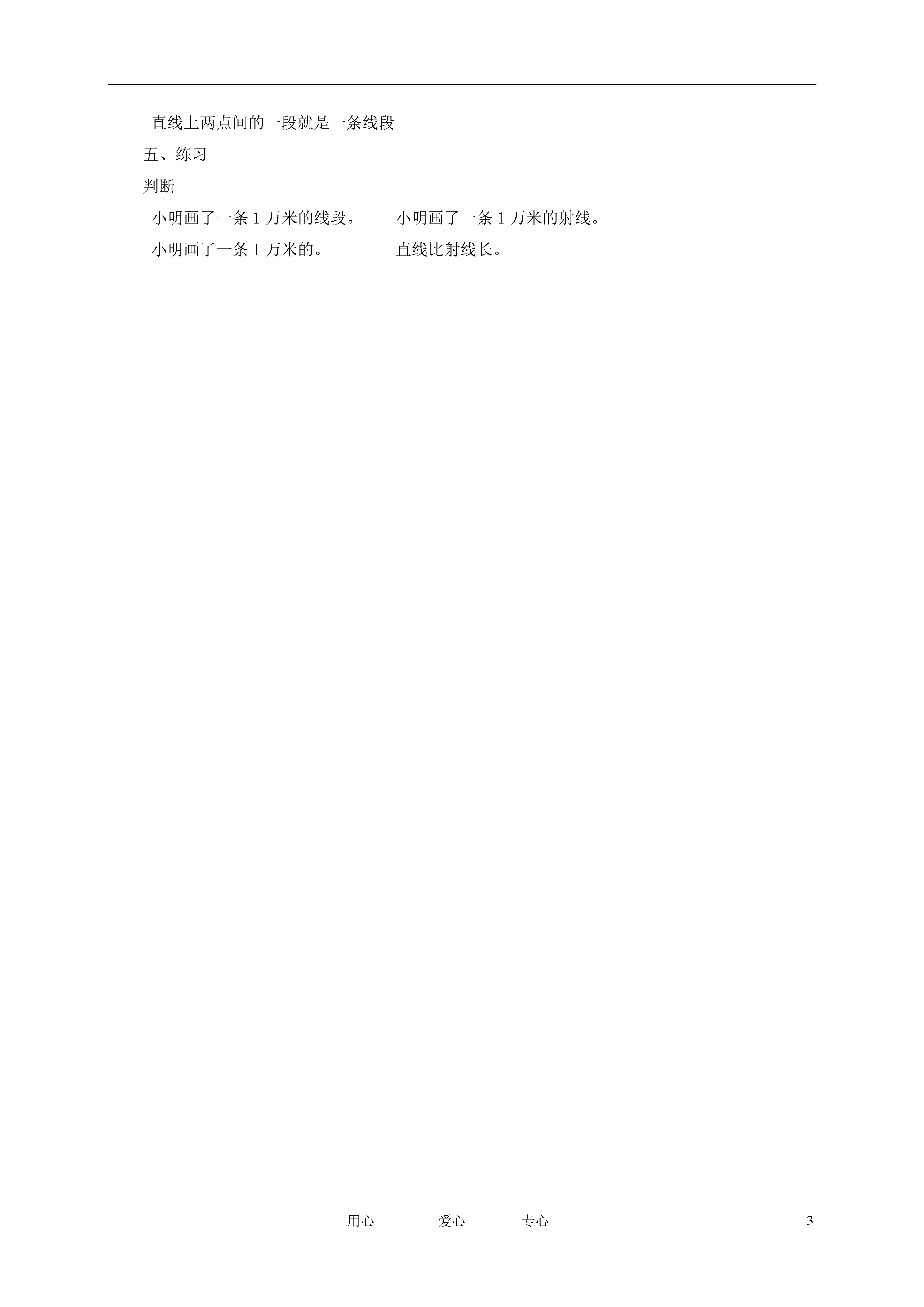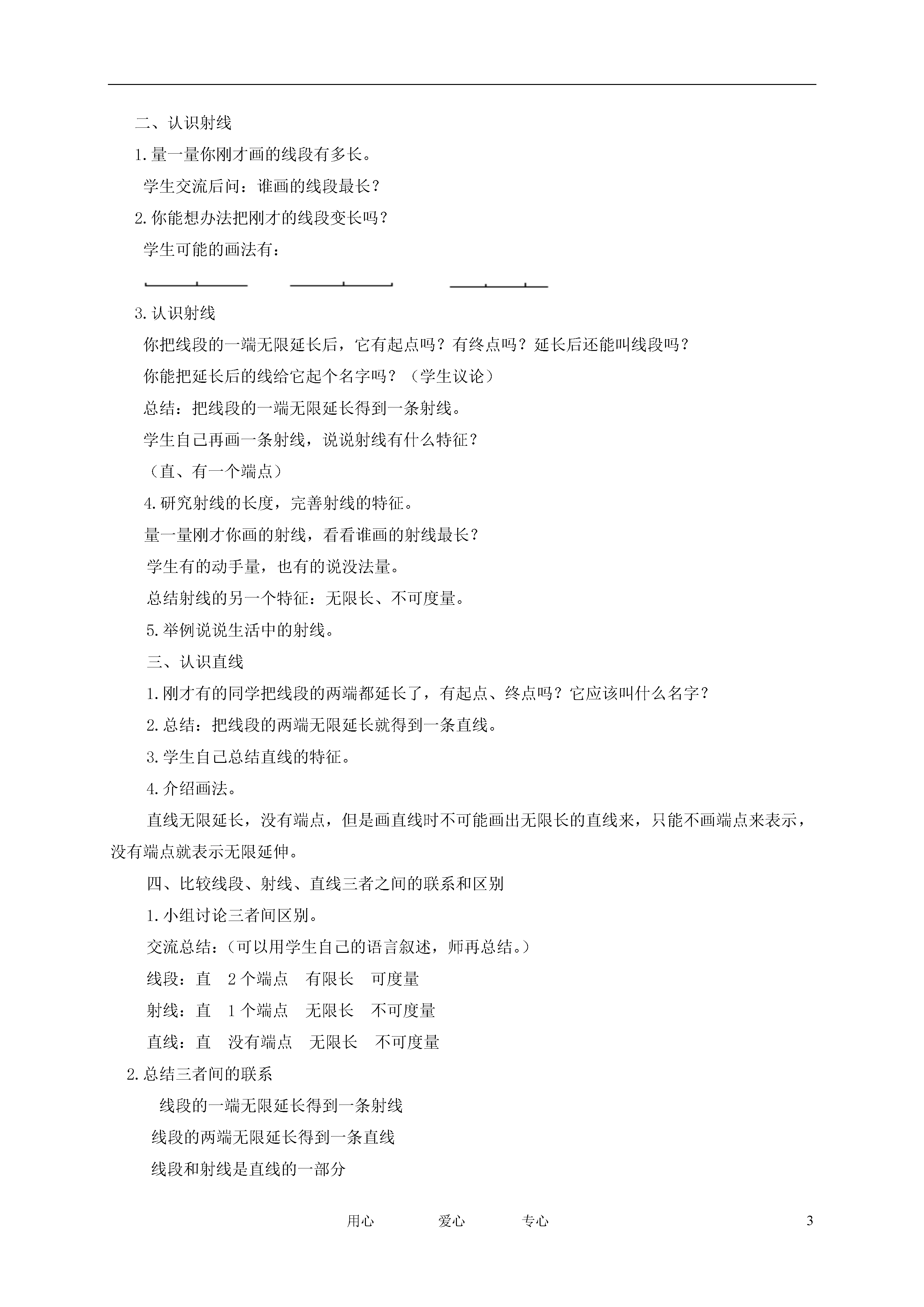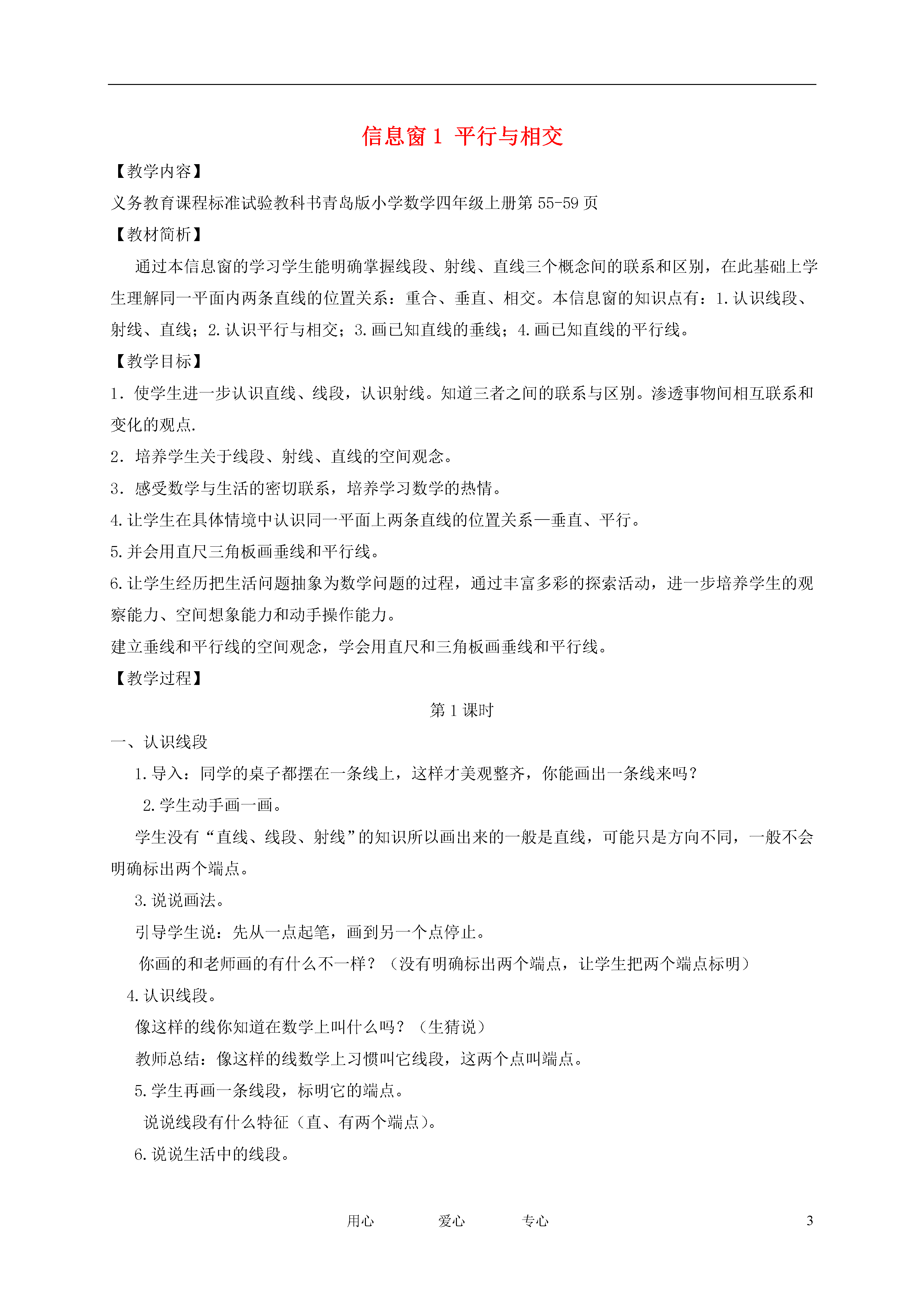 3用心爱心专心信息窗1平行与相交【教学内容】义务教育课程标准试验教科书青岛版小学数学四年级上册第55-59页【教材简析】通过本信息窗的学习学生能明确掌握线段、射线、直线三个概念间的联系和区别,在此基础上学生理解同一平面内两条直线的位置关系:重合、垂直、相交。本信息窗的知识点有:1.认识线段、射线、直线;2.认识平行与相交;3.画已知直线的垂线;4.画已知直线的平行线。【教学目标】1.使学生进一步认识直线、线段,认识射线。知道三者之间的联系与区别。渗透事物间相互联系和变化的观点.2.培养学生关于线段、射线、直线的空间观念。3.感受数学与生活的密切联系,培养学习数学的热情。4.让学生在具体情境中认识同一平面上两条直线的位置关系—垂直、平行。5.并会用直尺三角板画垂线和平行线。6.让学生经历把生活问题抽象为数学问题的过程,通过丰富多彩的探索活动,进一步培养学生的观察能力、空间想象能力和动手操作能力。建立垂线和平行线的空间观念,学会用直尺和三角板画垂线和平行线。【教学过程】第1课时一、认识线段1.导入:同学的桌子都摆在一条线上,这样才美观整齐,你能画出一条线来吗?2.学生动手画一画。学生没有“直线、线段、射线”的知识所以画出来的一般是直线,可能只是方向不同,一般不会明确标出两个端点。3.说说画法。引导学生说:先从一点起笔,画到另一个点停止。你画的和老师画的有什么不一样?(没有明确标出两个端点,让学生把两个端点标明)4.认识线段。像这样的线你知道在数学上叫什么吗?(生猜说)教师总结:像这样的线数学上习惯叫它线段,这两个点叫端点。5.学生再画一条线段,标明它的端点。说说线段有什么特征(直、有两个端点)。6.说说生活中的线段。二、认识射线1.量一量你刚才画的线段有多长。学生交流后问:谁画的线段最长?2.你能想办法把刚才的线段变长吗?学生可能的画法有:3.认识射线你把线段的一端无限延长后,它有起点吗?有终点吗?延长后还能叫线段吗?你能把延长后的线给它起个名字吗?(学生议论)总结:把线段的一端无限延长得到一条射线。学生自己再画一条射线,说说射线有什么特征?(直、有一个端点)4.研究射线的长度,完善射线的特征。量一量刚才你画的射线,看看谁画的射线最长?学生有的动手量,也有的说没法量。总结射线的另一个特征:无限长、不可度量。5.举例说说生活中的射线。三、认识直线1.刚才有的同学把线段的两端都延长了,有起点、终点吗?它应该叫什么名字?2.总结:把线段的两端无限延长就得到一条直线。3.学生自己总结直线的特征。4.介绍画法。直线无限延长,没有端点,但是画直线时不可能画出无限长的直线来,只能不画端点来表示,没有端点就表示无限延伸。四、比较线段、射线、直线三者之间的联系和区别1.小组讨论三者间区别。交流总结:(可以用学生自己的语言叙述,师再总结。)线段:直2个端点有限长可度量射线:直1个端点无限长不可度量直线:直没有端点无限长不可度量2.总结三者间的联系线段的一端无限延长得到一条射线线段的两端无限延长得到一条直线线段和射线是直线的一部分直线上两点间的一段就是一条线段五、练习判断小明画了一条1万米的线段。小明画了一条1万米的射线。小明画了一条1万米的。直线比射线长。