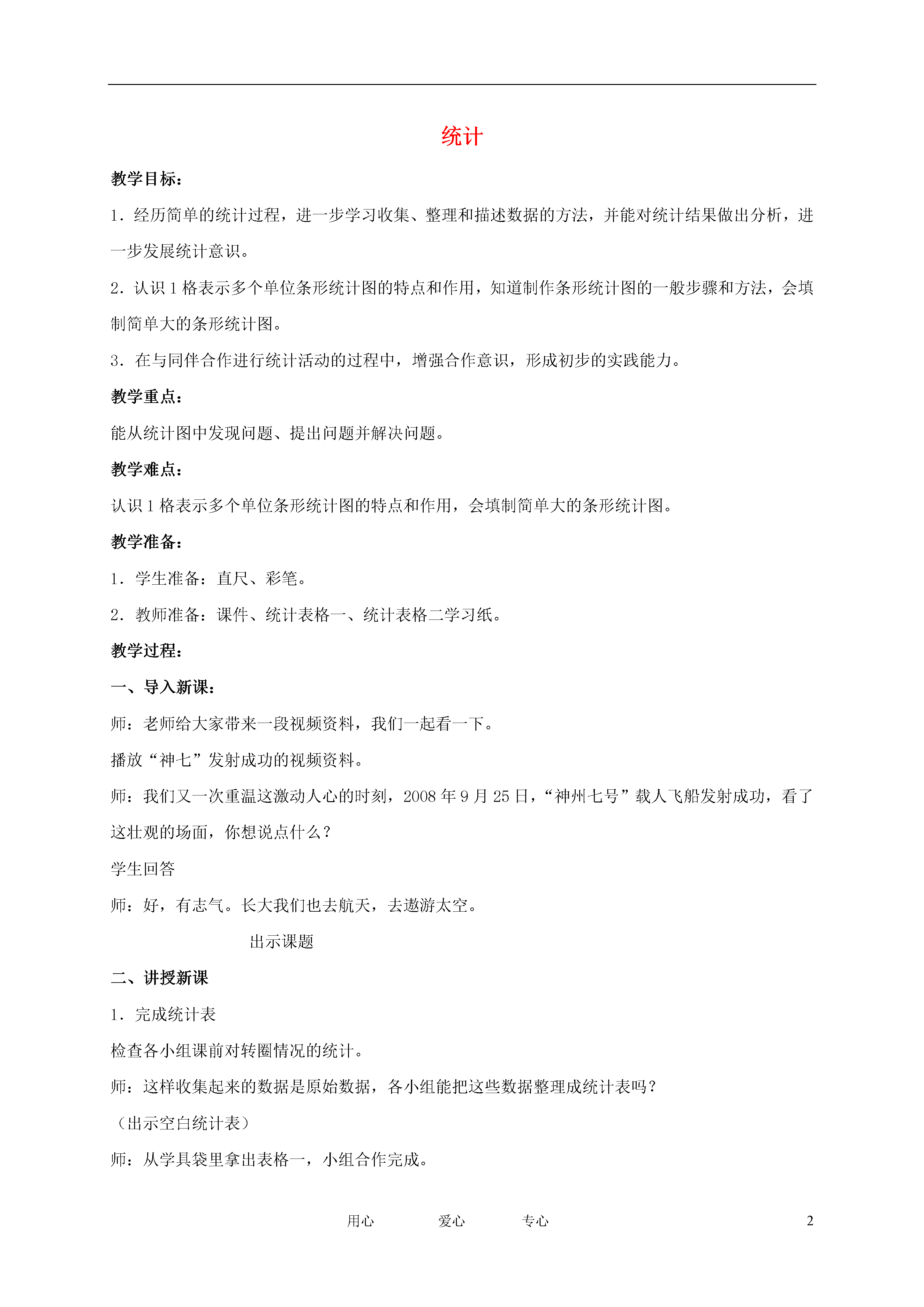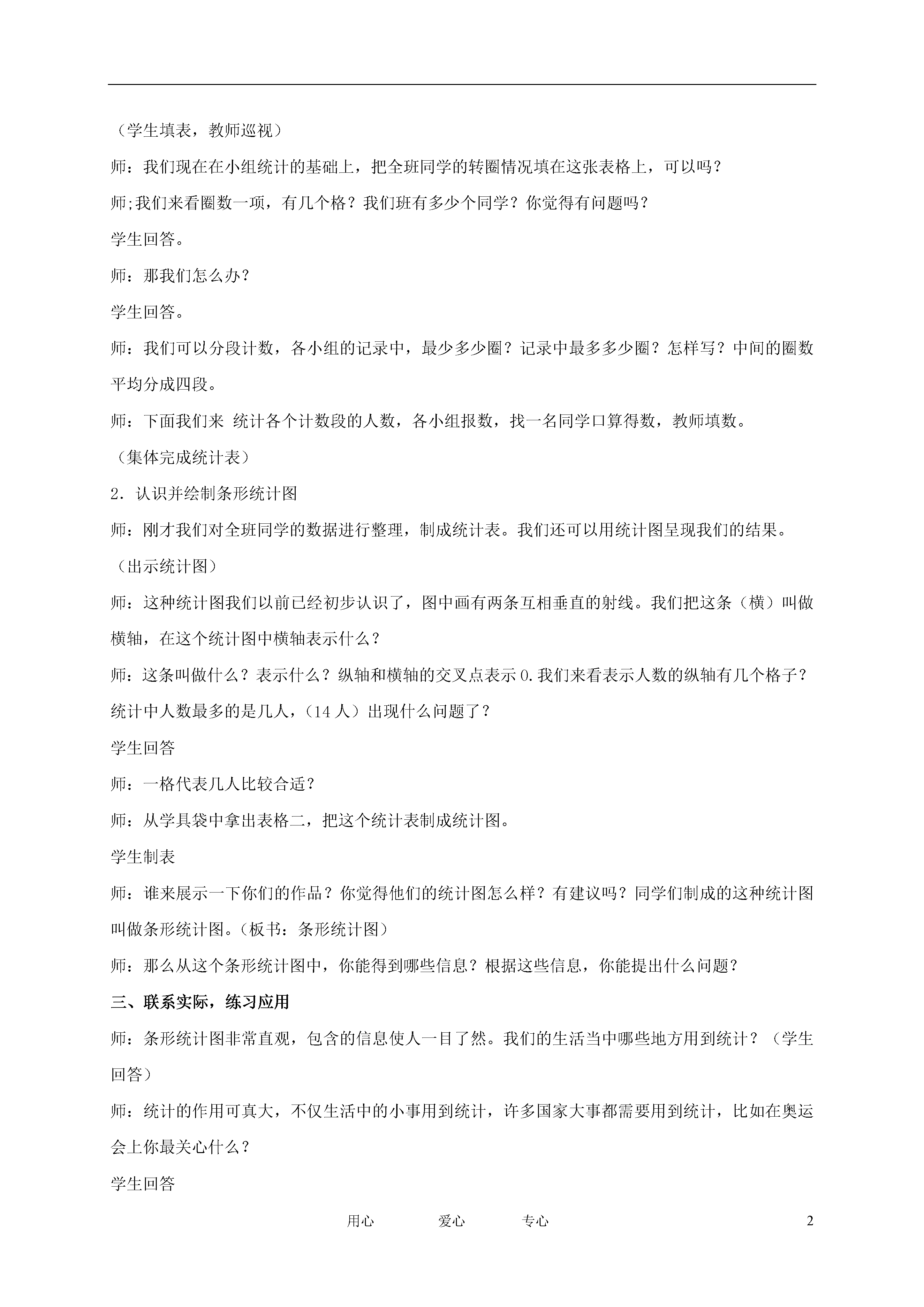 2用心爱心专心统计教学目标:1.经历简单的统计过程,进一步学习收集、整理和描述数据的方法,并能对统计结果做出分析,进一步发展统计意识。2.认识1格表示多个单位条形统计图的特点和作用,知道制作条形统计图的一般步骤和方法,会填制简单大的条形统计图。3.在与同伴合作进行统计活动的过程中,增强合作意识,形成初步的实践能力。教学重点:能从统计图中发现问题、提出问题并解决问题。教学难点:认识1格表示多个单位条形统计图的特点和作用,会填制简单大的条形统计图。教学准备:1.学生准备:直尺、彩笔。2.教师准备:课件、统计表格一、统计表格二学习纸。教学过程:一、导入新课:师:老师给大家带来一段视频资料,我们一起看一下。播放“神七”发射成功的视频资料。师:我们又一次重温这激动人心的时刻,2008年9月25日,“神州七号”载人飞船发射成功,看了这壮观的场面,你想说点什么?学生回答师:好,有志气。长大我们也去航天,去遨游太空。出示课题二、讲授新课1.完成统计表检查各小组课前对转圈情况的统计。师:这样收集起来的数据是原始数据,各小组能把这些数据整理成统计表吗?(出示空白统计表)师:从学具袋里拿出表格一,小组合作完成。(学生填表,教师巡视)师:我们现在在小组统计的基础上,把全班同学的转圈情况填在这张表格上,可以吗?师;我们来看圈数一项,有几个格?我们班有多少个同学?你觉得有问题吗?学生回答。师:那我们怎么办?学生回答。师:我们可以分段计数,各小组的记录中,最少多少圈?记录中最多多少圈?怎样写?中间的圈数平均分成四段。师:下面我们来统计各个计数段的人数,各小组报数,找一名同学口算得数,教师填数。(集体完成统计表)2.认识并绘制条形统计图师:刚才我们对全班同学的数据进行整理,制成统计表。我们还可以用统计图呈现我们的结果。(出示统计图)师:这种统计图我们以前已经初步认识了,图中画有两条互相垂直的射线。我们把这条(横)叫做横轴,在这个统计图中横轴表示什么?师:这条叫做什么?表示什么?纵轴和横轴的交叉点表示0.我们来看表示人数的纵轴有几个格子?统计中人数最多的是几人,(14人)出现什么问题了?学生回答师:一格代表几人比较合适?师:从学具袋中拿出表格二,把这个统计表制成统计图。学生制表师:谁来展示一下你们的作品?你觉得他们的统计图怎么样?有建议吗?同学们制成的这种统计图叫做条形统计图。(板书:条形统计图)师:那么从这个条形统计图中,你能得到哪些信息?根据这些信息,你能提出什么问题?三、联系实际,练习应用师:条形统计图非常直观,包含的信息使人一目了然。我们的生活当中哪些地方用到统计?(学生回答)师:统计的作用可真大,不仅生活中的小事用到统计,许多国家大事都需要用到统计,比如在奥运会上你最关心什么?学生回答师:老师这儿有一个历届奥运会上中国金牌总数的统计表,横轴表示什么?纵轴表示什么?一格代表多少?师:现代社会越来越多的人以车代步,我们看这一副图片,这是公路上车水马龙的情景,(出示自主练习第二题)师:课下对全班同学做一次球类项目的调查,完成下面的统计表,做在课本的102页。四、总结收获,快乐评价师:通过这节课的学习,你有什么收获?做一名宇航员,除了有健康的体魄,还需要具备很多优秀的品质,及很多专业知识,像天文学、力学、机械学、外语以及数学等等。需要我们从现在做起用努力来实现自己的理想。