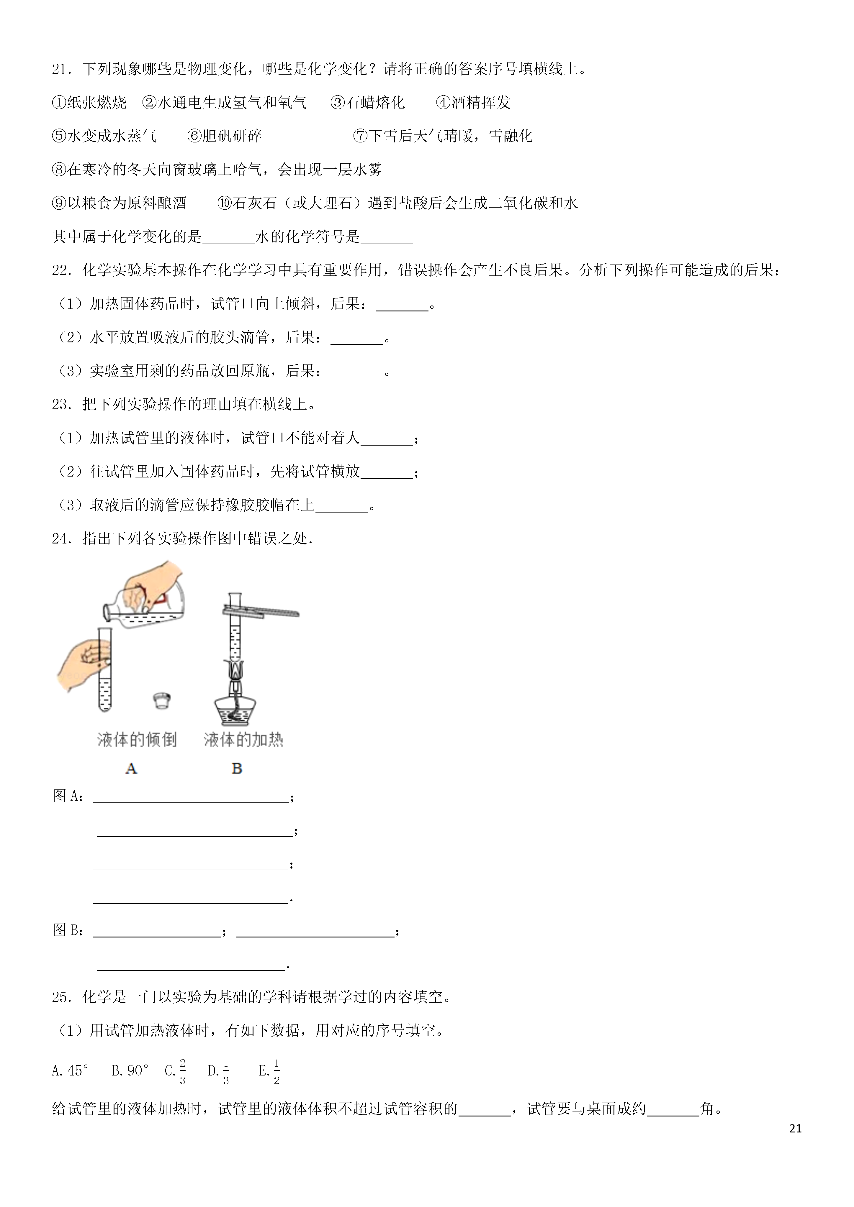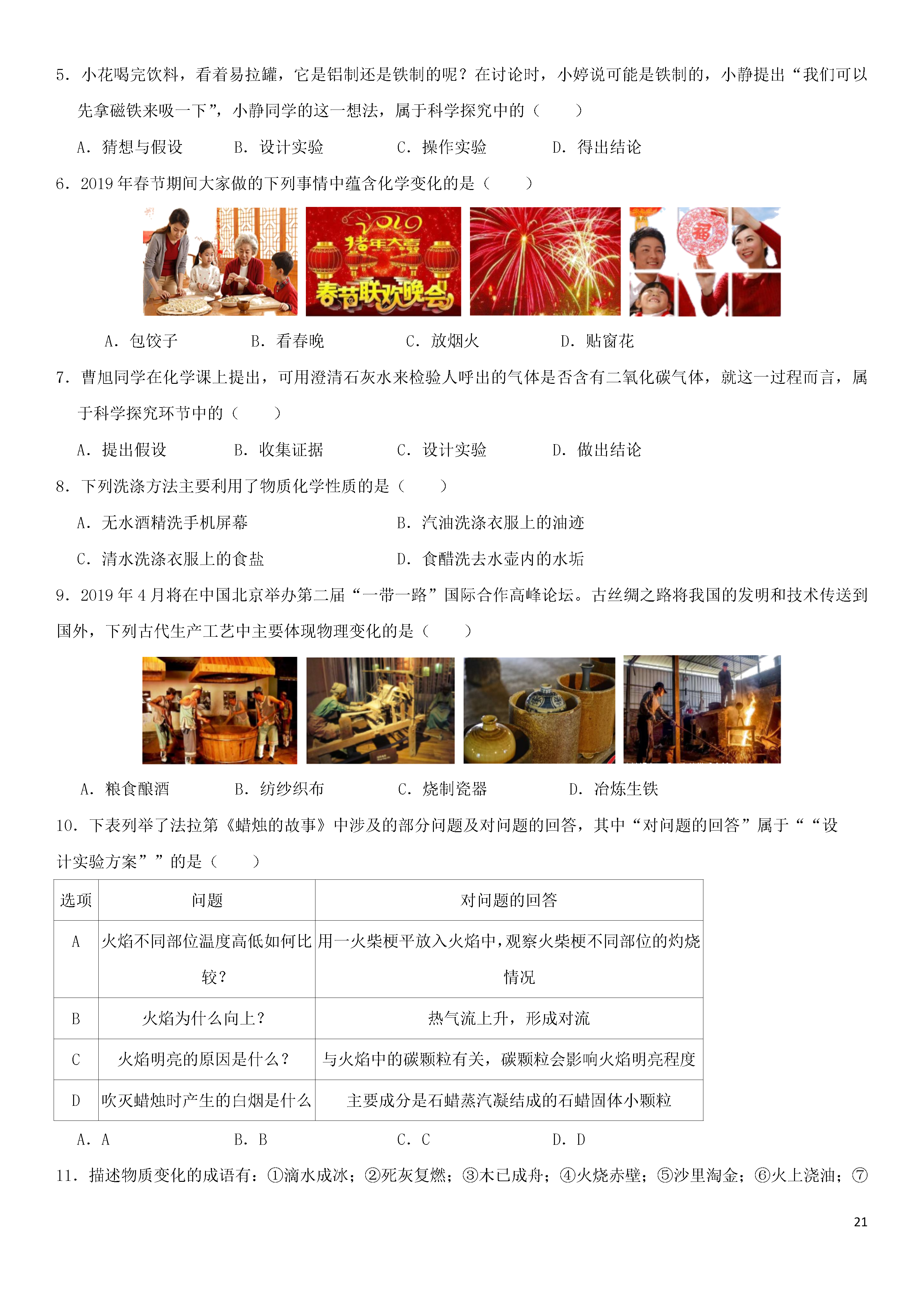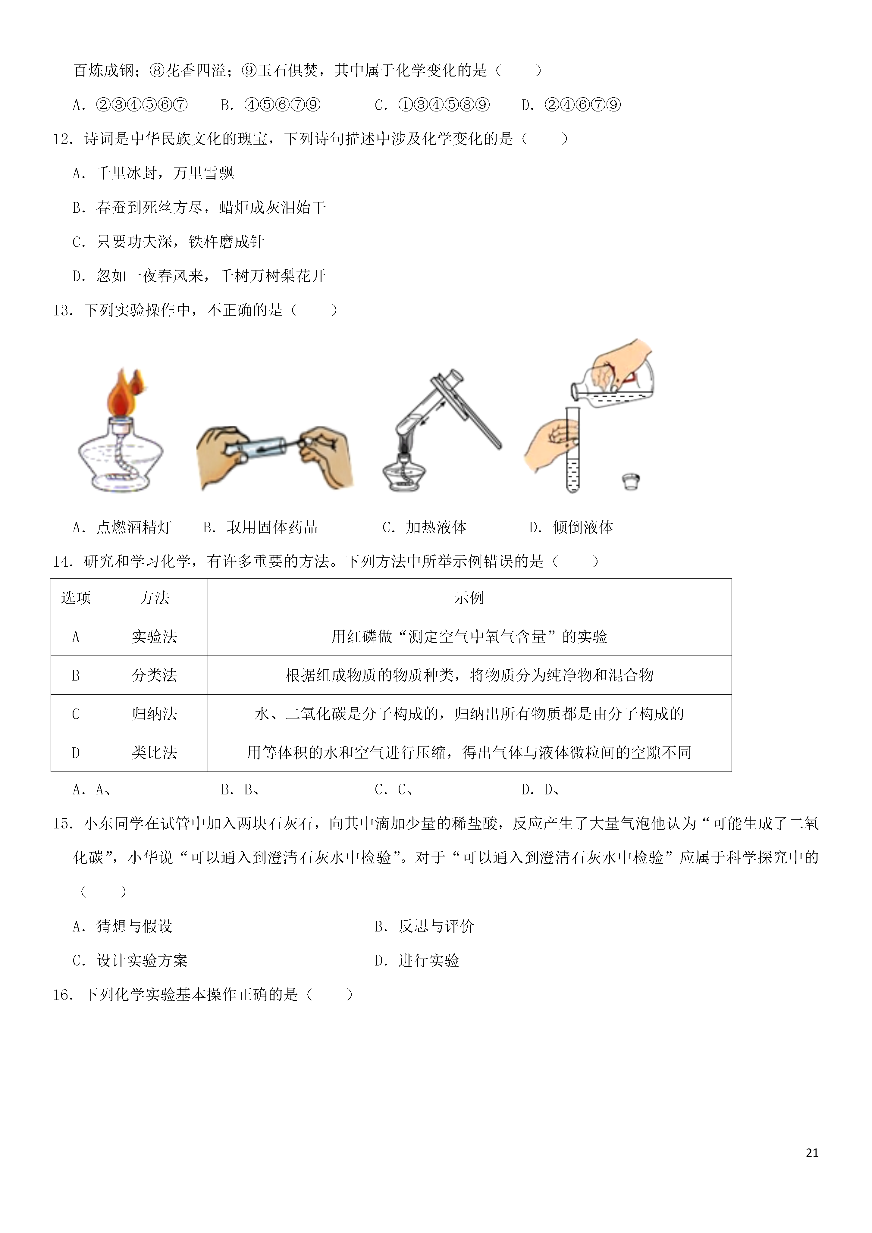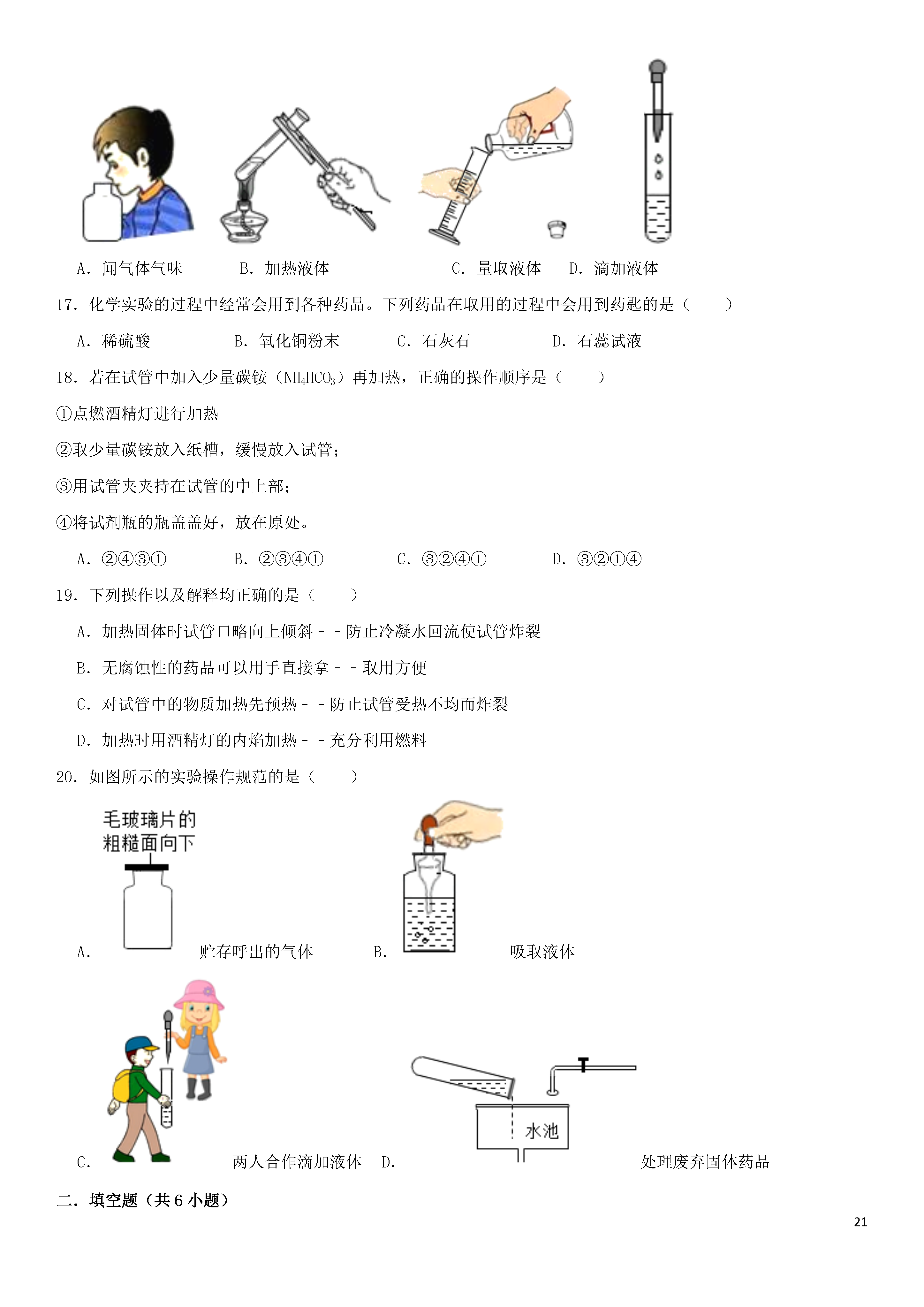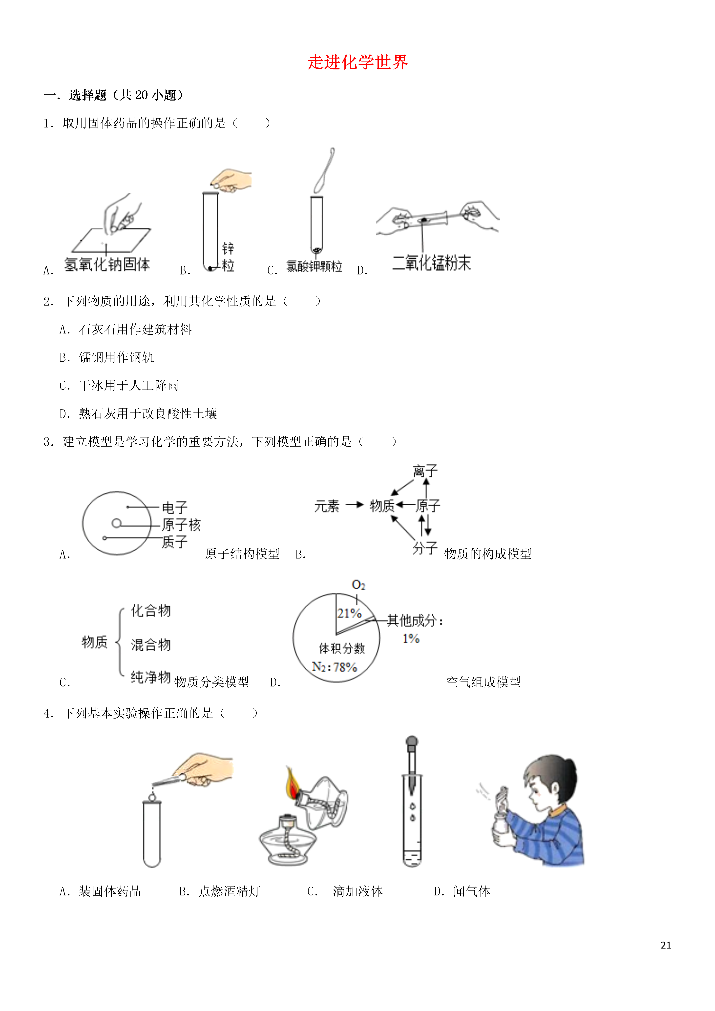 21走进化学世界一.选择题(共20小题)1.取用固体药品的操作正确的是()A.B.C.D.2.下列物质的用途,利用其化学性质的是()A.石灰石用作建筑材料B.锰钢用作钢轨C.干冰用于人工降雨D.熟石灰用于改良酸性土壤3.建立模型是学习化学的重要方法,下列模型正确的是()A.原子结构模型B.物质的构成模型C.物质分类模型D.空气组成模型4.下列基本实验操作正确的是()A.装固体药品B.点燃酒精灯C.滴加液体D.闻气体5.小花喝完饮料,看着易拉罐,它是铝制还是铁制的呢?在讨论时,小婷说可能是铁制的,小静提出“我们可以先拿磁铁来吸一下”,小静同学的这一想法,属于科学探究中的()A.猜想与假设B.设计实验C.操作实验D.得出结论6.2019年春节期间大家做的下列事情中蕴含化学变化的是()包饺子B.看春晚C.放烟火D.贴窗花7.曹旭同学在化学课上提出,可用澄清石灰水来检验人呼出的气体是否含有二氧化碳气体,就这一过程而言,属于科学探究环节中的()A.提出假设B.收集证据C.设计实验D.做出结论8.下列洗涤方法主要利用了物质化学性质的是()A.无水酒精洗手机屏幕B.汽油洗涤衣服上的油迹C.清水洗涤衣服上的食盐D.食醋洗去水壶内的水垢9.2019年4月将在中国北京举办第二届“一带一路”国际合作高峰论坛。古丝绸之路将我国的发明和技术传送到国外,下列古代生产工艺中主要体现物理变化的是()A.粮食酿酒B.纺纱织布C.烧制瓷器D.冶炼生铁10.下表列举了法拉第《蜡烛的故事》中涉及的部分问题及对问题的回答,其中“对问题的回答”属于““设计实验方案””的是()选项问题对问题的回答A火焰不同部位温度高低如何比较?用一火柴梗平放入火焰中,观察火柴梗不同部位的灼烧情况B火焰为什么向上?热气流上升,形成对流C火焰明亮的原因是什么?与火焰中的碳颗粒有关,碳颗粒会影响火焰明亮程度D吹灭蜡烛时产生的白烟是什么主要成分是石蜡蒸汽凝结成的石蜡固体小颗粒A.AB.BC.CD.D11.描述物质变化的成语有:①滴水成冰;②死灰复燃;③木已成舟;④火烧赤壁;⑤沙里淘金;⑥火上浇油;⑦百炼成钢;⑧花香四溢;⑨玉石俱焚,其中属于化学变化的是()A.②③④⑤⑥⑦B.④⑤⑥⑦⑨C.①③④⑤⑧⑨D.②④⑥⑦⑨12.诗词是中华民族文化的瑰宝,下列诗句描述中涉及化学变化的是()A.千里冰封,万里雪飘B.春蚕到死丝方尽,蜡炬成灰泪始干C.只要功夫深,铁杵磨成针D.忽如一夜春风来,千树万树梨花开13.下列实验操作中,不正确的是()A.点燃酒精灯B.取用固体药品C.加热液体D.倾倒液体14.研究和学习化学,有许多重要的方法。下列方法中所举示例错误的是()选项方法示例A实验法用红磷做“测定空气中氧气含量”的实验B分类法根据组成物质的物质种类,将物质分为纯净物和混合物C归纳法水、二氧化碳是分子构成的,归纳出所有物质都是由分子构成的D类比法用等体积的水和空气进行压缩,得出气体与液体微粒间的空隙不同A.A、B.B、C.C、D.D、15.小东同学在试管中加入两块石灰石,向其中滴加少量的稀盐酸,反应产生了大量气泡他认为“可能生成了二氧化碳”,小华说“可以通入到澄清石灰水中检验”。对于“可以通入到澄清石灰水中检验”应属于科学探究中的()A.猜想与假设B.反思与评价C.设计实验方案D.进行实验16.下列化学实验基本操作正确的是()A.闻气体气味B.加热液体C.量取液体D.滴加液体17.化学实验的过程中经常会用到各种药品。下列药品在取用的过程中会用到药匙的是()A.稀硫酸B.氧化铜粉末C.石灰石D.石蕊试液18.若在试管中加入少量碳铵(NH4HCO3)再加热,正确的操作顺序是()①点燃酒精灯进行加热②取少量碳铵放入纸槽,缓慢放入试管;③用试管夹夹持在试管的中上部;④将试剂瓶的瓶盖盖好,放在原处。A.②④③①B.②③④①C.③②④①D.③②①④19.下列操作以及解释均正确的是()A.加热固体时试管口略向上倾斜﹣﹣防止冷凝水回流使试管炸裂B.无腐蚀性的药品可以用手直接拿﹣﹣取用方便C.对试管中的物质加热先预热﹣﹣防止试管受热不均而炸裂D.加热时用酒精灯的内焰加热﹣﹣充分利用燃料20.如图所示的实验操作规范的是()A.贮存呼出的气体B.吸取液体C.两人合作滴加液体D.处理废弃固体药品二.填空题(共6小题)21.下列现象哪些是物理变化,哪些是化学变化?请将正确的答案序号填横线上。①纸张燃烧②水通电生成氢气和氧气③石蜡熔化④酒精挥发⑤水变成水蒸气⑥胆矾研碎⑦下雪后天气晴暖,雪融化⑧在寒冷的冬天向窗玻璃上哈气,会出现一层水雾⑨以粮食为原料酿酒⑩石灰石(或大理石)遇到盐酸后会生成二氧