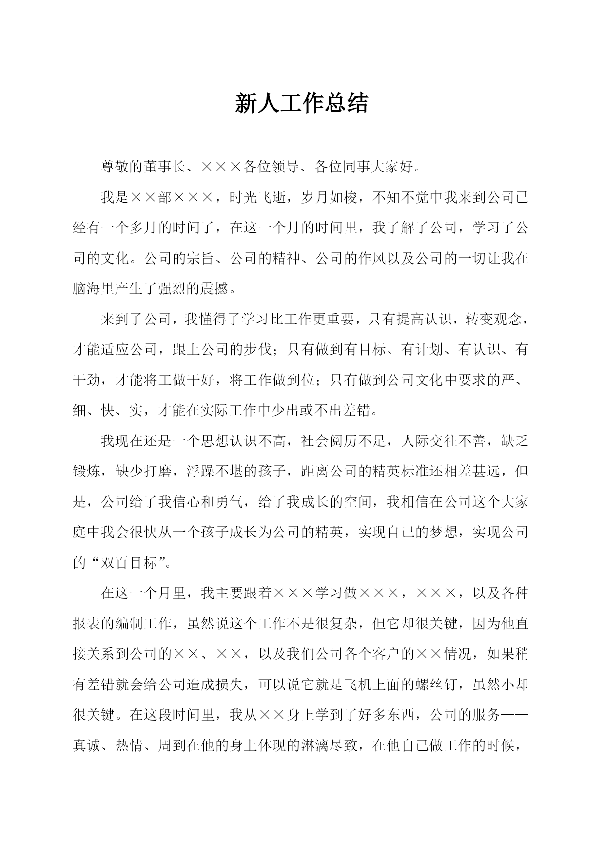新人工作总结尊敬的董事长、×××各位领导、各位同事大家好。我是××部×××,时光飞逝,岁月如梭,不知不觉中我来到公司已经有一个多月的时间了,在这一个月的时间里,我了解了公司,学习了公司的文化。公司的宗旨、公司的精神、公司的作风以及公司的一切让我在脑海里产生了强烈的震撼。来到了公司,我懂得了学习比工作更重要,只有提高认识,转变观念,才能适应公司,跟上公司的步伐;只有做到有目标、有计划、有认识、有干劲,才能将工做干好,将工作做到位;只有做到公司文化中要求的严、细、快、实,才能在实际工作中少出或不出差错。我现在还是一个思想认识不高,社会阅历不足,人际交往不善,缺乏锻炼,缺少打磨,浮躁不堪的孩子,距离公司的精英标准还相差甚远,但是,公司给了我信心和勇气,给了我成长的空间,我相信在公司这个大家庭中我会很快从一个孩子成长为公司的精英,实现自己的梦想,实现公司的“双百目标”。在这一个月里,我主要跟着×××学习做×××,×××,以及各种报表的编制工作,虽然说这个工作不是很复杂,但它却很关键,因为他直接关系到公司的××、××,以及我们公司各个客户的××情况,如果稍有差错就会给公司造成损失,可以说它就是飞机上面的螺丝钉,虽然小却很关键。在这段时间里,我从××身上学到了好多东西,公司的服务——真诚、热情、周到在他的身上体现的淋漓尽致,在他自己做工作的时候,他会一边做一边解释给我听,在我自己做工作时他会继续耐心的指导我,一遍一遍的,不厌其烦的教导我。在每次做完工作后他都会再次检查一到两遍,甚至更多遍,以防会有错误的发生,特别是在这次月末做报表的时候,就一份报表,他前后核对不止十次,大到数字,小到日期格式,充分体现了公司严、细、快、实的作风,让我受益匪浅。在以后的工作中,我会扎扎实实的做好本职工作,认真学习公司文化,提高认识,转变思想观念,多向同事领导请教,把精力投入到工作中去,要求自己所做的每件事都要事实求是,和同事做好团结互助,相互学习,把工作做好。培养良好的习惯,提高自己的本领,用实际行动做到勤奋、严谨、求实,求精,以公司的精神、公司的作风、公司的服务来严格要求自己,认真、细心、及时、准确的完成领导交代的各项工作。作为公司的一员,我会融入到公司的大家庭中,认真学习,树立正确的社会观、人生观和价值观,在生活和工作中严格要求自己,维护公司的形象,在工作中不辜负领导的期望,增强工作观念,自觉维护公司的正常秩序和工作秩序,投入到工作和学习中去。我一定会坚定信念、积极进取、诚实守信、刻苦学习,以更加良好的精神状态,更加高涨的热情投入到工作之中,为公司发展贡献自己的一份力量,争取早日成为真正的公司人!!!×××二○一×年×月×日