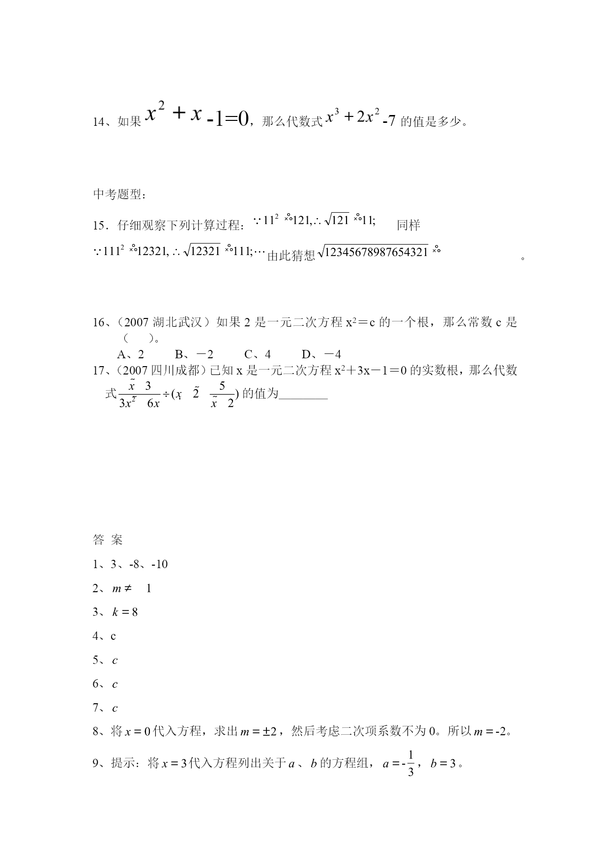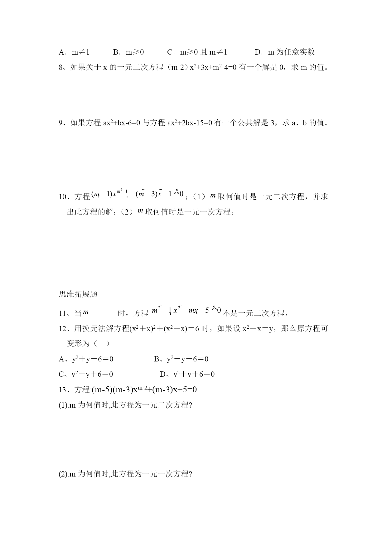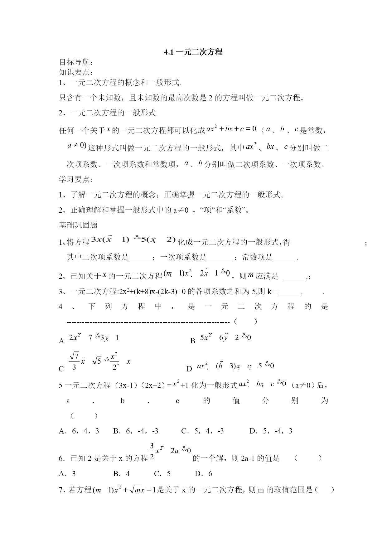 4.1一元二次方程目标导航:知识要点:1、一元二次方程的概念和一般形式.只含有一个未知数,且未知数的最高次数是2的方程叫做一元二次方程。2、一元二次方程的一般形式.任何一个关于的一元二次方程都可以化成(、、是常数,这种形式叫做一元二次方程的一般形式,其中、、分别叫做二次项系数、一次项系数和常数项,、分别叫做二次项系数、一次项系数。学习要点:1、了解一元二次方程的概念;正确掌握一元二次方程的一般形式。2、正确理解和掌握一般形式中的a≠0,“项”和“系数”。基础巩固题1、将方程化成一元二次方程的一般形式,得;其中二次项系数是;一次项系数是;常数项是.2、已知关于的一元二次方程,则应满足.;3、一元二次方程:2x2+(k+8)x-(2k-3)=0的各项系数之和为5,则k=..4、下列方程中,是一元二次方程的是---------------------------------------------------------------()ABCD5一元二次方程(3x-1)(2x+2)=+1化为一般形式(a≠0)后,a、b、c的值分别为()A.6,4,3B.6,-4,-3C.5,4,-3D.5,-4,36.已知2是关于x的方程的一个解,则2a-1的值是()A.3B.4C.5D.67、若方程是关于x的一元二次方程,则m的取值范围是()A.m≠1B.m≥0C.m≥0且m≠1D.m为任意实数8、如果关于x的一元二次方程(m-2)x2+3x+m2-4=0有一个解是0,求m的值。9、如果方程ax2+bx-6=0与方程ax2+2bx-15=0有一个公共解是3,求a、b的值。10、方程;(1)取何值时是一元二次方程,并求出此方程的解;(2)取何值时是一元一次方程;思维拓展题11、当时,方程不是一元二次方程。12、用换元法解方程(x2+x)2+(x2+x)=6时,如果设x2+x=y,那么原方程可变形为()A、y2+y-6=0B、y2-y-6=0C、y2-y+6=0D、y2+y+6=013、方程:(m-5)(m-3)xm-2+(m-3)x+5=0(1).m为何值时,此方程为一元二次方程?(2).m为何值时,此方程为一元一次方程?14、如果-1=0,那么代数式-7的值是多少。中考题型:15.仔细观察下列计算过程:同样由此猜想。16、(2007湖北武汉)如果2是一元二次方程x2=c的一个根,那么常数c是()。A、2B、-2C、4D、-417、(2007四川成都)已知x是一元二次方程x2+3x-1=0的实数根,那么代数式的值为____答案1、3、-8、-102、3、4、c5、6、7、8、将代入方程,求出,然后考虑二次项系数不为0。所以-2。9、提示:将代入方程列出关于、的方程组,-,。10、时是一元二次方程,-1取何值时是一元一次方程。11、12、A13、,14、-615、11111111116、C17、