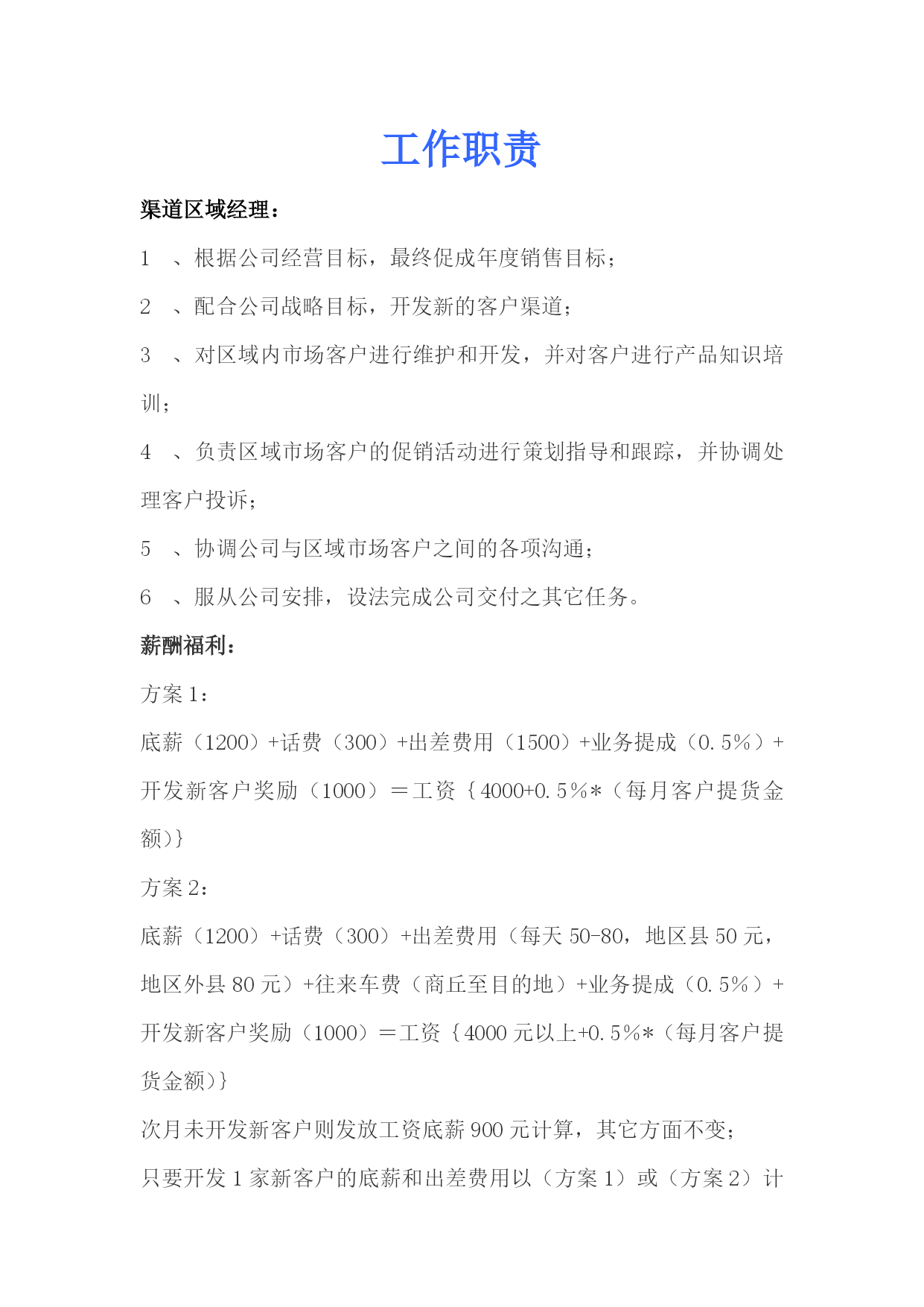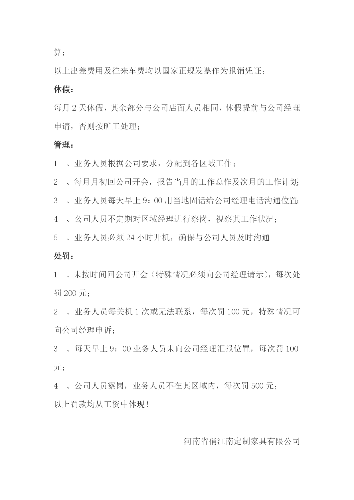 工作职责渠道区域经理:1、根据公司经营目标,最终促成年度销售目标;2、配合公司战略目标,开发新的客户渠道;3、对区域内市场客户进行维护和开发,并对客户进行产品知识培训;4、负责区域市场客户的促销活动进行策划指导和跟踪,并协调处理客户投诉;5、协调公司与区域市场客户之间的各项沟通;6、服从公司安排,设法完成公司交付之其它任务。薪酬福利:方案1:底薪(1200)+话费(300)+出差费用(1500)+业务提成(0.5%)+开发新客户奖励(1000)=工资{4000+0.5%*(每月客户提货金额)}方案2:底薪(1200)+话费(300)+出差费用(每天50-80,地区县50元,地区外县80元)+往来车费(商丘至目的地)+业务提成(0.5%)+开发新客户奖励(1000)=工资{4000元以上+0.5%*(每月客户提货金额)}次月未开发新客户则发放工资底薪900元计算,其它方面不变;只要开发1家新客户的底薪和出差费用以(方案1)或(方案2)计算;以上出差费用及往来车费均以国家正规发票作为报销凭证;休假:每月2天休假,其余部分与公司店面人员相同,休假提前与公司经理申请,否则按旷工处理;管理:1、业务人员根据公司要求,分配到各区域工作;2、每月月初回公司开会,报告当月的工作总作及次月的工作计划;3、业务人员每天早上9:00用当地固话给公司经理电话沟通位置;4、公司人员不定期对区域经理进行察岗,视察其工作状况;5、业务人员必须24小时开机,确保与公司人员及时沟通处罚:1、未按时间回公司开会(特殊情况必须向公司经理请示),每次处罚200元;2、业务人员每关机1次或无法联系,每次罚100元,特殊情况可向公司经理申诉;3、每天早上9:00业务人员未向公司经理汇报位置,每次罚100元;4、公司人员察岗,业务人员不在其区域内,每次罚500元;以上罚款均从工资中体现!河南省俏江南定制家具有限公司
