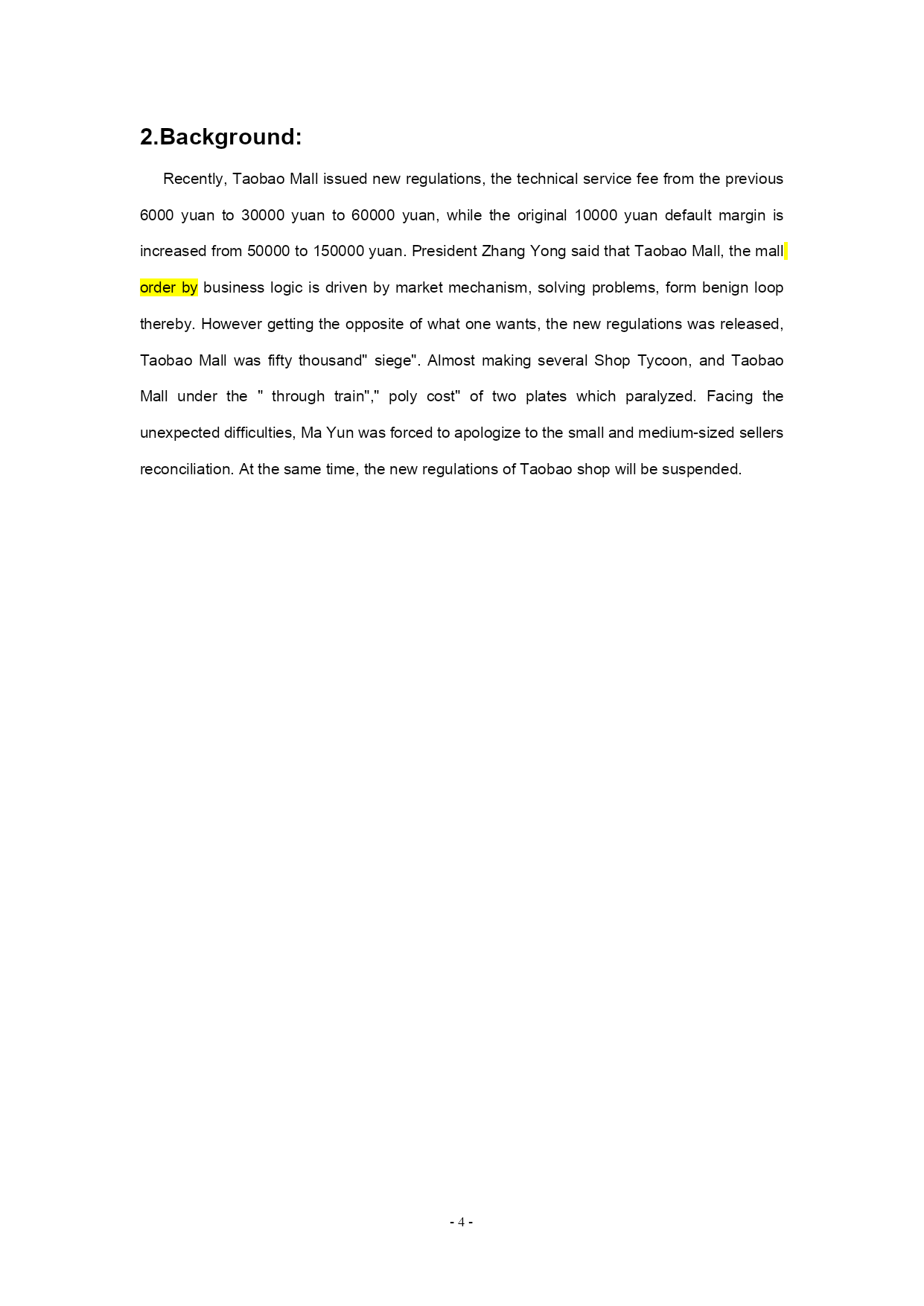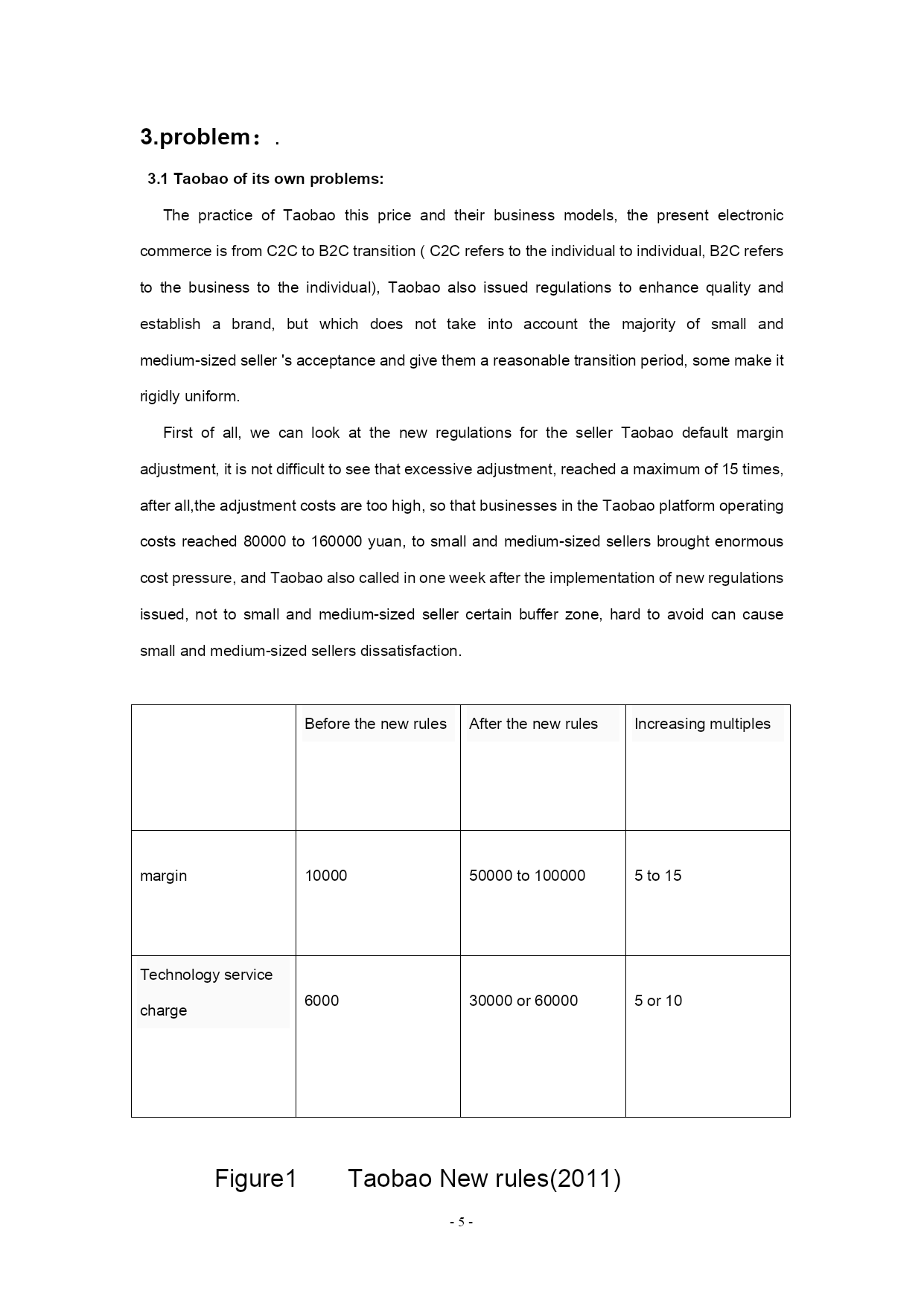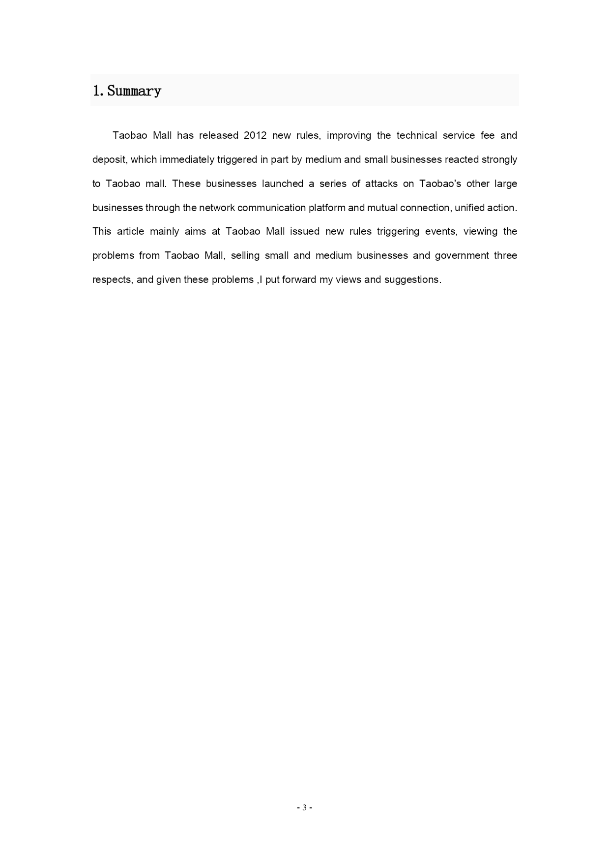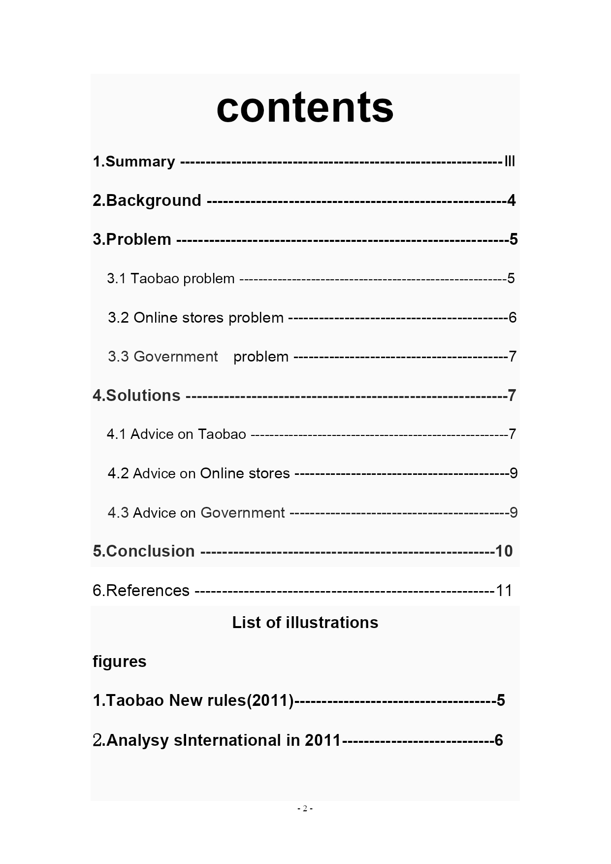PAGE-12-HENANUNIVERSITYOFTECHNOLOGY河南工业大学BachelorofBusinessAdministrationAssignmentCover工商管理学士学位课程作业封面MODULECODEANDNAME科目代码及名称ModuleCode科目代码:_____B3__________ModuleName科目名称:_____BC__Lecturer讲师:____LiNa_SectionCode专业班级:__会计F1009____StudentID学生证号码:__201048990705StudentName学生姓名:_____陈磊________Announcement:IdeclarethatthisassignmentisENTIRELYmyindependentworkexceptwherereferenced.IhavemarkedanyReferencesourcesandamawareofprogrammeregulationsconcerningplagiarismandreferencing.声明:除了标明出处的引用资料之外,此作业是我独立调查完成的。文内所有引用的资料已经详细标明出处,并且我了解课程中有关抄袭及引用方面的规定。Signature签名:LecturerComments讲师评语Score分数:ReceiveDateYear/Month/Day收到日期:contents1.Summary---------------------------------------------------------------Ⅲ2.Background-------------------------------------------------------43.Problem-------------------------------------------------------------53.1Taobaoproblem--------------------------------------------------------53.2Onlinestoresproblem-------------------------------------------63.3Governmentproblem------------------------------------------74.Solutions-----------------------------------------------------------74.1AdviceonTaobao------------------------------------------------------74.2AdviceonOnlinestores------------------------------------------94.3AdviceonGovernment-------------------------------------------95.Conclusion------------------------------------------------------106.References-------------------------------------------------------11Listofillustrationsfigures1.TaobaoNewrules(2011)-------------------------------------52.AnalysysInternationalin2011----------------------------61.SummaryTaobaoMallhasreleased2012newrules,improvingthetechnicalservicefeeanddeposit,whichimmediatelytriggeredinpartbymediumandsmallbusinessesreactedstronglytoTaobaomall.ThesebusinesseslaunchedaseriesofattacksonTaobao'sotherlargebusinessesthroughthenetworkcommunicationplatformandmutualconnection,unifiedaction.ThisarticlemainlyaimsatTaobaoMallissuednewrulestriggeringevents,viewingtheproblemsfromT